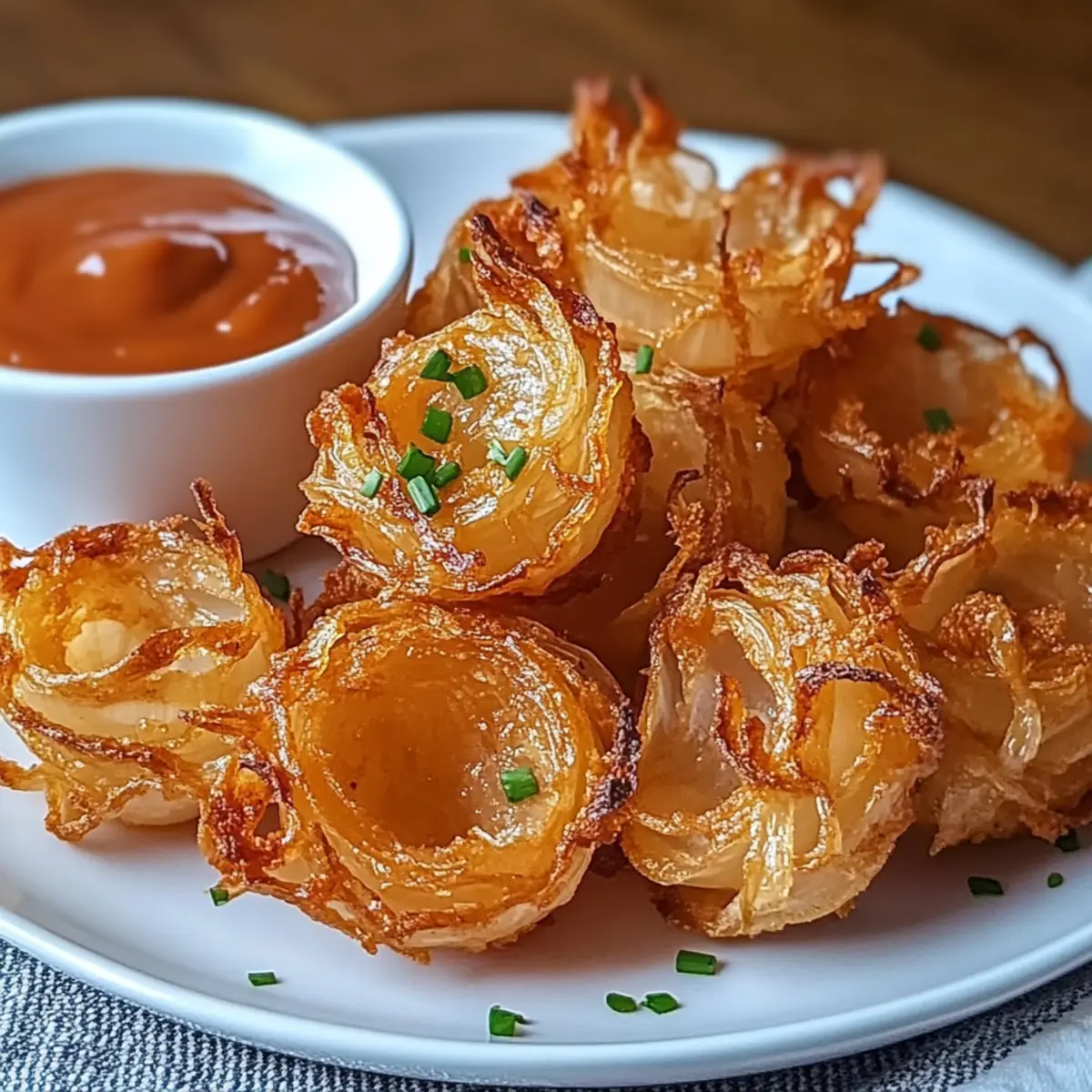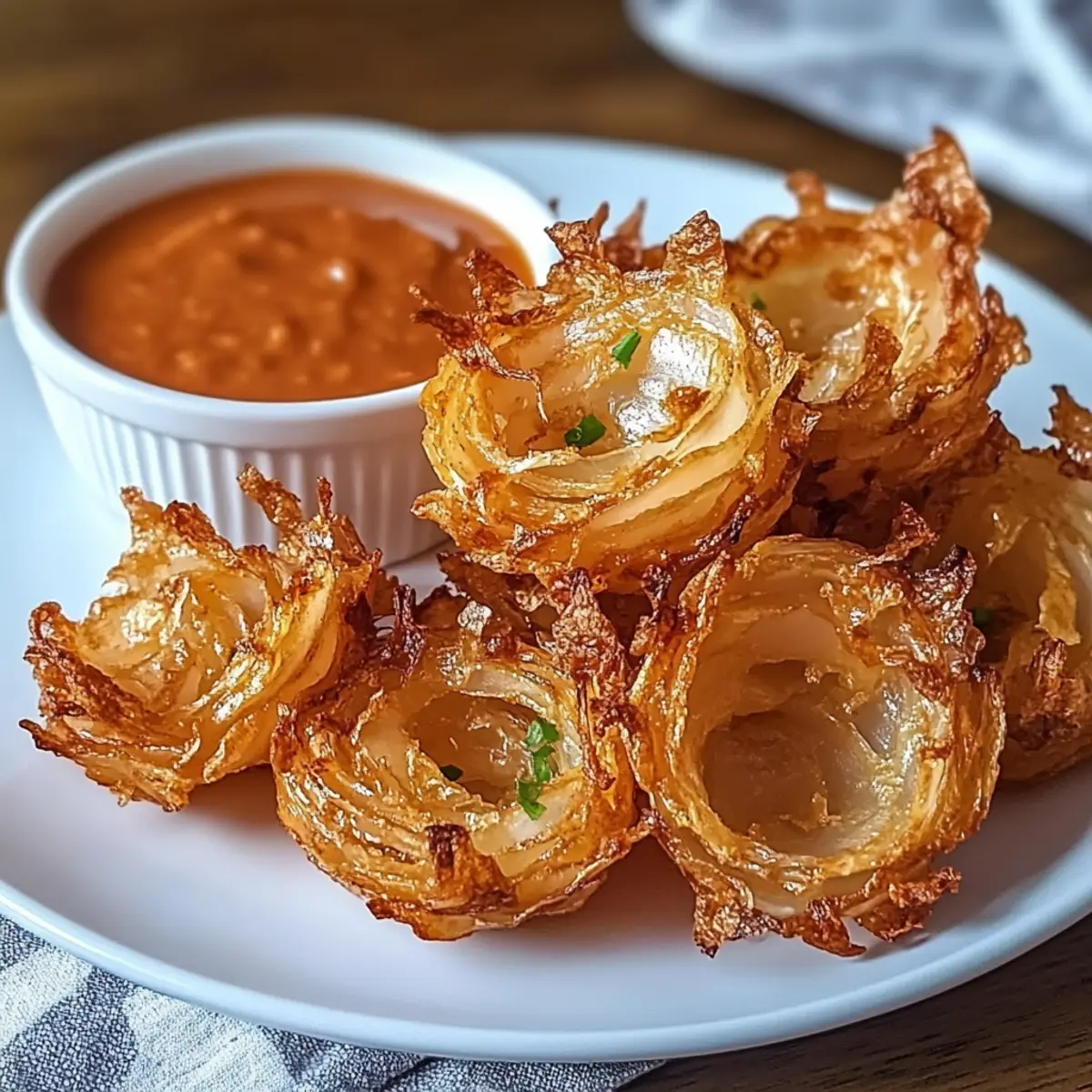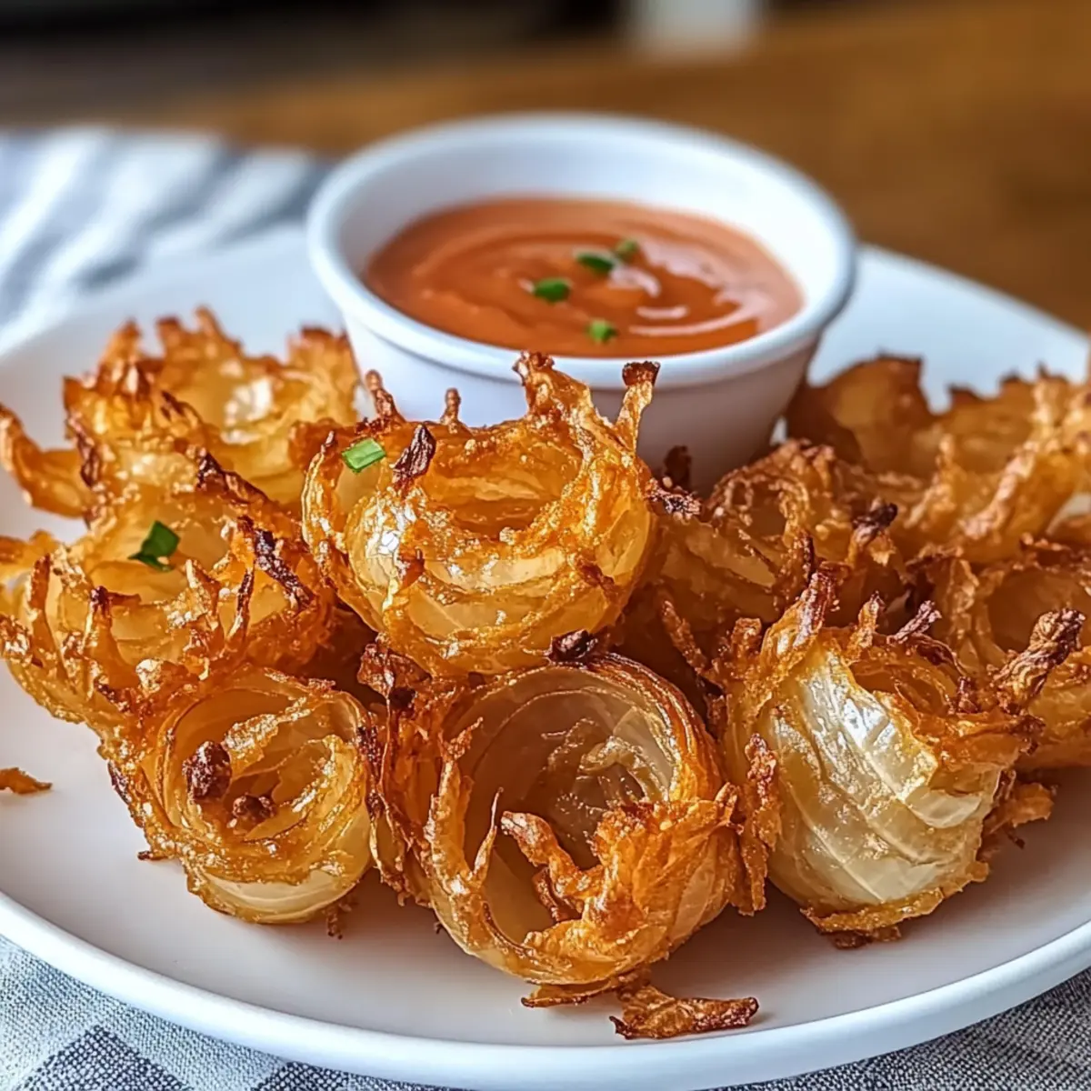 In just under 15 minutes, I found myself whipping up a sensational snack that took me straight back to my favorite pub days—Air Fryer Crispy Mini Blooming Onions! Imagine that delightful crunch as you bite into these bite-sized beauties, all while savoring a lighter, guilt-free alternative to the classic deep-fried version. Whether you’re hosting a casual get-together or want a unique appetizer for your next dinner, these crispy onion treats serve up a satisfying crunch and endless customizable options, including gluten-free adaptations. So, what dipping sauce will you choose to elevate your blooming onion experience? Why choose Air Fryer Blooming Onions? Quick and Easy: Prepare these delicious mini blooms in under 15 minutes with minimal fuss! Whether you’re a novice or a seasoned chef, this recipe is a breeze. Customizable Flavors: From adding smoked paprika for a BBQ twist to infusing fresh herbs, the flavor possibilities are endless. Guilt-Free Indulgence: Enjoy the same crispy texture and savory goodness of traditional onion rings without the excess oil—perfect for health-conscious snacking. Crowd-Pleaser: Serve these at your next gathering, and watch them disappear! Pair them with a variety of dipping sauces like ranch or BBQ for an irresistible treat. Elevate your next meal by trying these along with our delicious Air Fryer Parmesan or Chick Fil Delights for a complete menu. Air Fryer Crispy Mini Blooming Onions Ingredients For the Batter Buttermilk – For coating and moisture; substitutable with milk mixed with lemon juice (sit for 5 minutes). Flour – Binds the ingredients and adds structure; use gluten-free flour for a gluten-free version. Paprika – Adds color and mild flavor; for extra flavor, consider smoked paprika. Garlic Powder – Provides savory notes; no substitutions needed. Onion Powder – Enhances onion flavors; no substitutions needed. Cayenne Pepper – Adds heat, adjustable to taste; can omit for a milder flavor. Salt – Enhances overall flavor; essential for seasoning. Pepper – Adds a subtle kick; freshly ground is best. For the Onions Sweet Onions – Main ingredient for the blooming effect; Vidalia or Walla Walla recommended. Cooking Spray/Oil – For creating a crispy exterior; lightly spray or brush on before cooking. Step‑by‑Step Instructions for Air Fryer Crispy Mini Blooming Onions Step 1: Prepare Buttermilk Begin by mixing your buttermilk or milk with lemon juice in a bowl. Allow the mixture to sit for about 5 minutes, so it thickens slightly. This creamy coating is essential for ensuring the crispy breading adheres beautifully to your sweet onions, enhancing the flavor of your Air Fryer Crispy Mini Blooming Onions. Step 2: Prep Onions While the buttermilk is resting, peel the sweet onions and trim off the ends. Carefully make vertical cuts into each onion, about three-quarters of the way down, creating a blooming effect without cutting all the way through. This step is crucial for the classic presentation and delicious texture of your Air Fryer Crispy Mini Blooming Onions, so take your time. Step 3: Combine Dry Ingredients In a separate mixing bowl, combine the flour, paprika, garlic powder, onion powder, cayenne pepper, salt, and freshly ground pepper. Whisk these ingredients until they are well mixed. This seasoned flour will coat your onions and provide that tempting crispy layer we love in Air Fryer Crispy Mini Blooming Onions, so make sure it’s well blended! Step 4: Coat Onions Take each prepared onion and dip it into the buttermilk mixture, allowing the excess liquid to drip off. Then, coat the onion thoroughly in the seasoned flour mixture, ensuring every petal is covered. This step is vital as the buttermilk helps the flour stick, leading to the perfect crispy texture you expect from Air Fryer Crispy Mini Blooming Onions. Step 5: Preheat Air Fryer Preheat your air fryer to 380°F (190°C) for about 5 minutes. This ensures the cooking environment is hot and ready to create that golden, crispy exterior. Preheating is key when making Air Fryer Crispy Mini Blooming Onions, as it helps them cook evenly and achieve maximum crunchiness. Step 6: Arrange and Spray Place the coated onions gently into the fryer basket, making sure there is some space between them to allow for proper air circulation. Lightly spray the tops of the onions with cooking spray or a drizzle of oil. This will enhance the browning process, helping to achieve that deliciously crispy finish we all desire in Air Fryer Crispy Mini Blooming Onions. Step 7: Air Fry Cook the onions in the air fryer for 10-12 minutes, shaking the basket halfway through to ensure even cooking. Keep an eye on them, and look for a golden brown color to indicate they are perfectly crispy. The aroma will be irresistible, signaling that your Air Fryer Crispy Mini Blooming Onions are almost ready! Step 8: Prepare Dipping Sauce While the onions are air frying, you can whip up a delicious dipping sauce. In a small bowl, mix together mayonnaise, ketchup, horseradish, and lemon juice, adjusting the flavors to your taste. This tangy dip will perfectly complement the savory crunch of your Air Fryer Crispy Mini Blooming Onions, making the snack even more delightful. Step 9: Serve Once the onions are beautifully golden and crispy, carefully remove them from the air fryer and serve warm. Pair them with your prepared dipping sauce for a scrumptious appetizer that will impress family and friends. These Air Fryer Crispy Mini Blooming Onions are a fun, guilt-free treat you won’t want to miss! Expert Tips for Air Fryer Crispy Mini Blooming Onions Thorough Coating: Ensure a good soak in buttermilk before the flour mixture; this helps the coating adhere better for crispy Air Fryer Crispy Mini Blooming Onions. Avoid Overcrowding: Place onions with space in the air fryer basket to prevent steaming. Proper airflow is key to achieving that satisfying crunch. Adjust Seasoning: Tweak cayenne pepper based on your