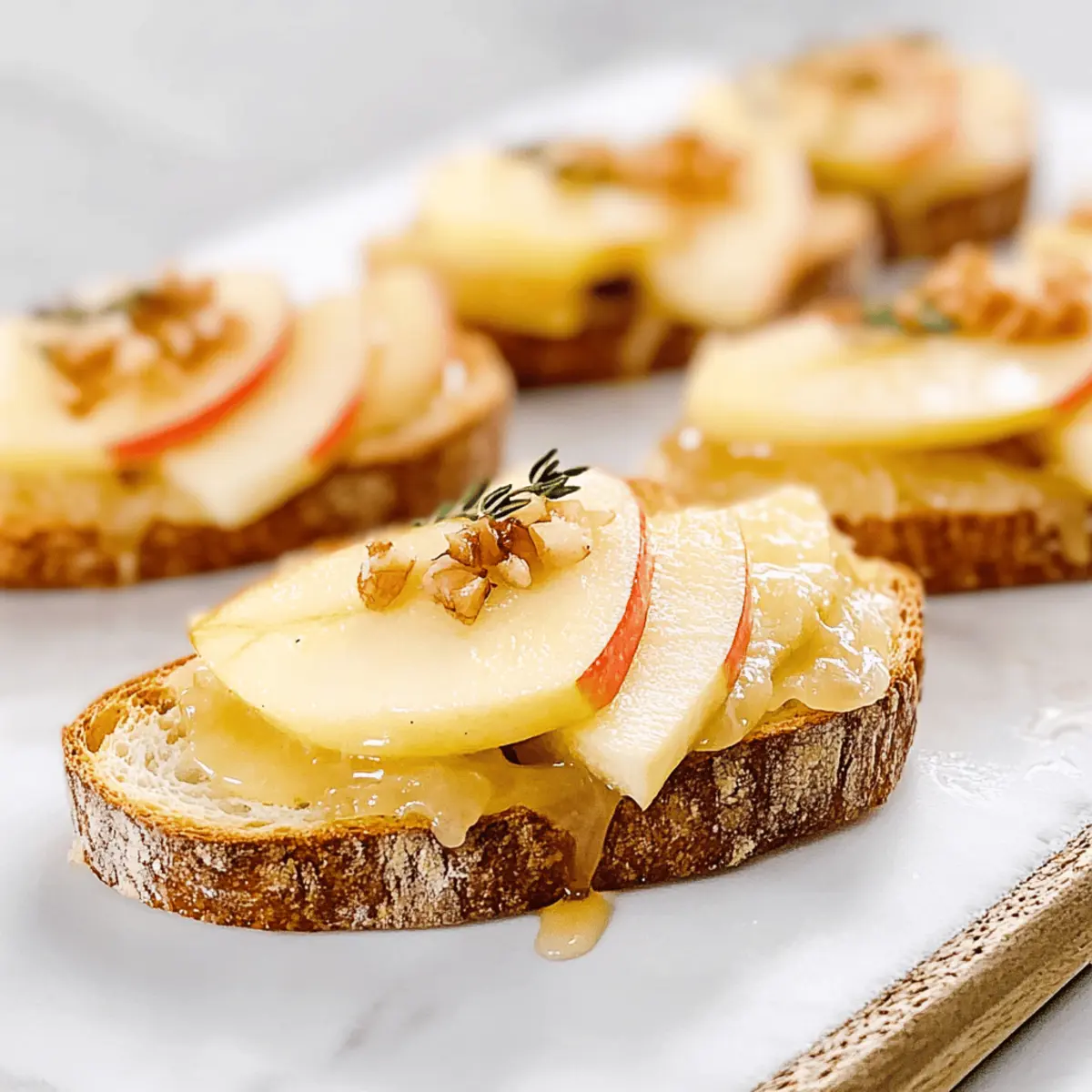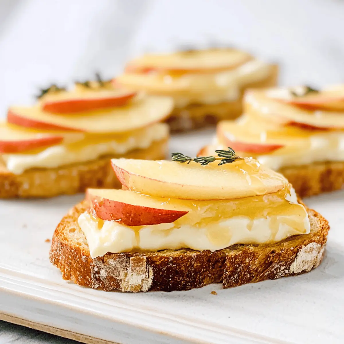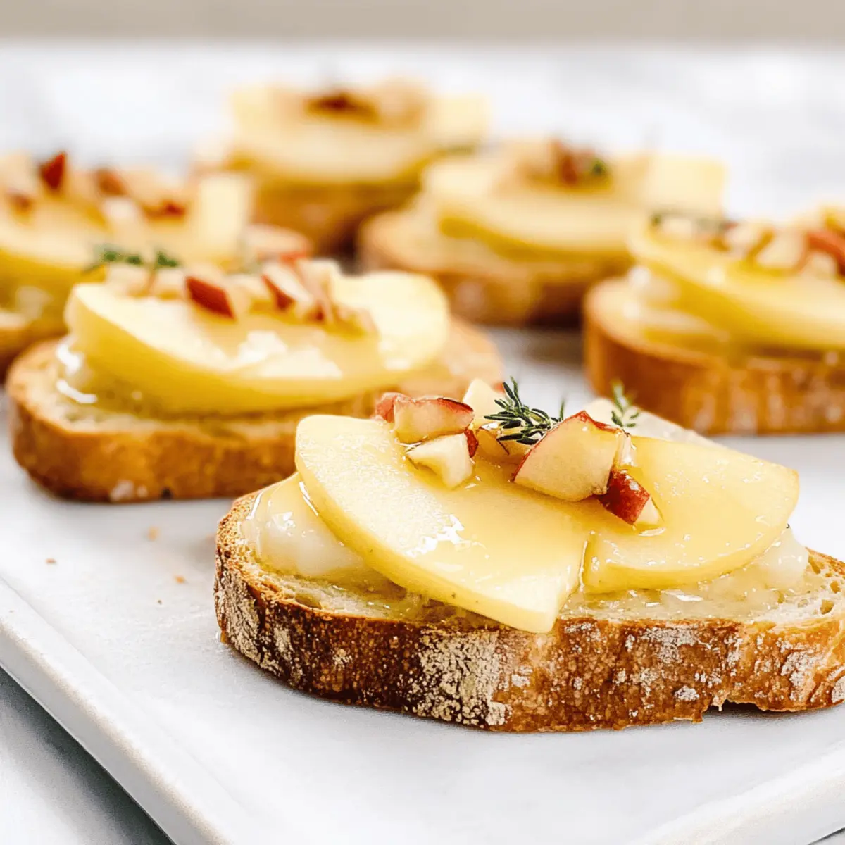As I stood in the kitchen, the aroma of melting brie mingling with the crispness of freshly sliced apples transported me to a cozy bistro on a quiet street in Paris. That’s when I knew I had to share this elegant Apple Brie Crostini recipe with you. Perfect for any gathering, this simple yet sophisticated appetizer combines creamy brie, sweet apples, and a hint of honey drizzled over crunchy baguette slices. Not only is it quick to prepare, but it’s also a surefire crowd-pleaser that showcases seasonal flavors beautifully. Whether you’re planning a festive brunch or an intimate dinner, these crostinis add a touch of gourmet flair that will impress your guests. Ready to wow your friends with this delightful bite-sized creation? Let’s dive into the details! Why Is This Crostini So Special? Simplicity, Perfectly elegant yet straightforward to prepare, these crostinis are a breeze for any home cook. Flavorful, The delightful pairing of creamy brie with sweet apples and honey creates a taste sensation that will make your taste buds dance. Versatile, You can easily tweak this recipe with different fruits like pears or figs, or even swap the brie for tangy goat cheese. Impressive Presentation, Plated beautifully, they serve as an impressive appetizer at any gathering, from chic dinner parties to casual brunches. Looking for more variations? Check out my Apple Crumble Cheesecake for a delicious sweet twist! Crowd-Pleasing, Trust me, these little bites will disappear in no time, leaving your guests raving about your culinary skills! Apple Brie Crostini Ingredients • Prepare to create a delightful appetizer that’s sure to impress! For the Crostini Base Baguette – Sliced into ½ inch pieces, this forms the crunchy foundation for our crostini. Tip: Ciabatta can serve as a wonderful alternative if you desire a slightly different texture. For the Topping Brie Cheese – This soft, creamy cheese melts beautifully, adding rich flavor. Substitution: Camembert is a lovely alternative with a similar creamy texture. Apple – Thinly sliced to provide a crisp, sweet contrast that balances the richness of the brie. Note: Pear can be used, offering comparable sweetness and a lovely texture. Honey – A drizzle of this golden nectar brings sweetness that binds the flavors together. Tip: For an exciting twist, you can substitute maple syrup for a unique taste. Fresh Thyme – Chopped and sprinkled on top, it adds an aromatic touch that elevates the dish. Alternative: Fresh rosemary can be used for a similar herbal note with a slightly different profile. Step‑by‑Step Instructions for Apple Brie Crostini Step 1: Preheat the Oven Begin by preheating your oven to 375°F (190°C). This temperature will ensure that your Apple Brie Crostini gets perfectly toasted and the cheese melts beautifully. While the oven heats up, gather your ingredients and baking sheet to streamline your cooking process. Step 2: Toast the Baguette Arrange the sliced baguette pieces on a baking sheet in a single layer, ensuring there’s space between them. Toast these in the preheated oven for about 5 minutes until they are lightly browned and crisp. The delightful aroma of warm bread will start to fill your kitchen, signaling it’s time for the next step. Step 3: Prepare the Toppings Once the baguette slices are toasted, remove them from the oven and let them cool slightly. Place a slice of creamy brie cheese atop each piece of toasted baguette, followed by a thin slice of crisp apple. The combination of warm, crunchy bread and melty cheese will create a delicious base for your Apple Brie Crostini. Step 4: Drizzle with Honey and Thyme Next, take your honey and gently drizzle it over the topped crostini. This will add just the right amount of sweetness to complement the richness of the brie and the crispness of the apple. Finish off by sprinkling fresh thyme over the crostinis, infusing them with an aromatic touch that elevates the dish. Step 5: Bake Until Melty Return the assembled Apple Brie Crostini to the oven and bake for an additional 5 minutes. Keep an eye on them as they bake; you want the brie to melt beautifully and become gooey. The crostinis should emerge golden and mouthwatering, just begging to be enjoyed. Step 6: Serve Warm Once the cheese is melty and the edges of the bread are golden, remove your Apple Brie Crostini from the oven. Allow them to cool for a moment before transferring them to a serving platter. Serve these delightful bites warm, letting your guests revel in the delectable combination of flavors and textures. How to Store and Freeze Apple Brie Crostini Room Temperature: These crostinis are best enjoyed warm, but if left out, they’ll stay fresh for about 1 hour. After that, the texture may change as the bread softens. Fridge: Store any leftovers in an airtight container in the fridge for up to 3 days. When ready to enjoy, reheat to restore that delightful texture. Freezer: If you want to prepare them ahead, freeze the assembled but unbaked crostinis. Wrap them tightly in plastic wrap and foil for up to 1 month. Bake from frozen, adding a few extra minutes to the cooking time. Reheating: When reheating, use the oven or an air fryer for optimal results. This will ensure the cheese gets melty while the bread stays crisp, keeping the essence of the Apple Brie Crostini alive! Expert Tips for Apple Brie Crostini Serrated Knife: Use a serrated knife to slice your baguette. This will ensure clean cuts, keeping your crostini from becoming uneven or squished. Room Temperature Brie: Allow your brie cheese to come to room temperature before assembling the crostini. This ensures a perfectly melty consistency that complements the crunch of the baguette. Toasting Tips: Watch your baguette closely while toasting; a few minutes can turn from lightly golden to overly crisp. We want that perfect crunch without losing taste! Reheating Method: For the best texture when reheating leftovers, use an oven or air fryer.