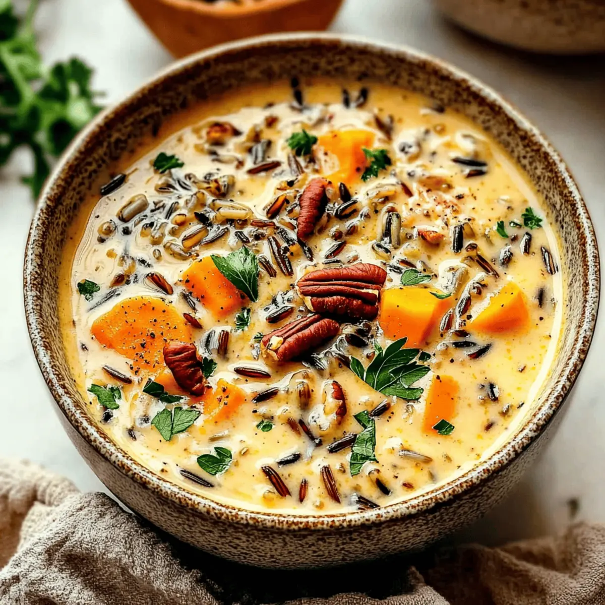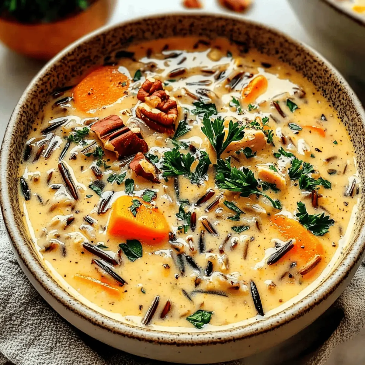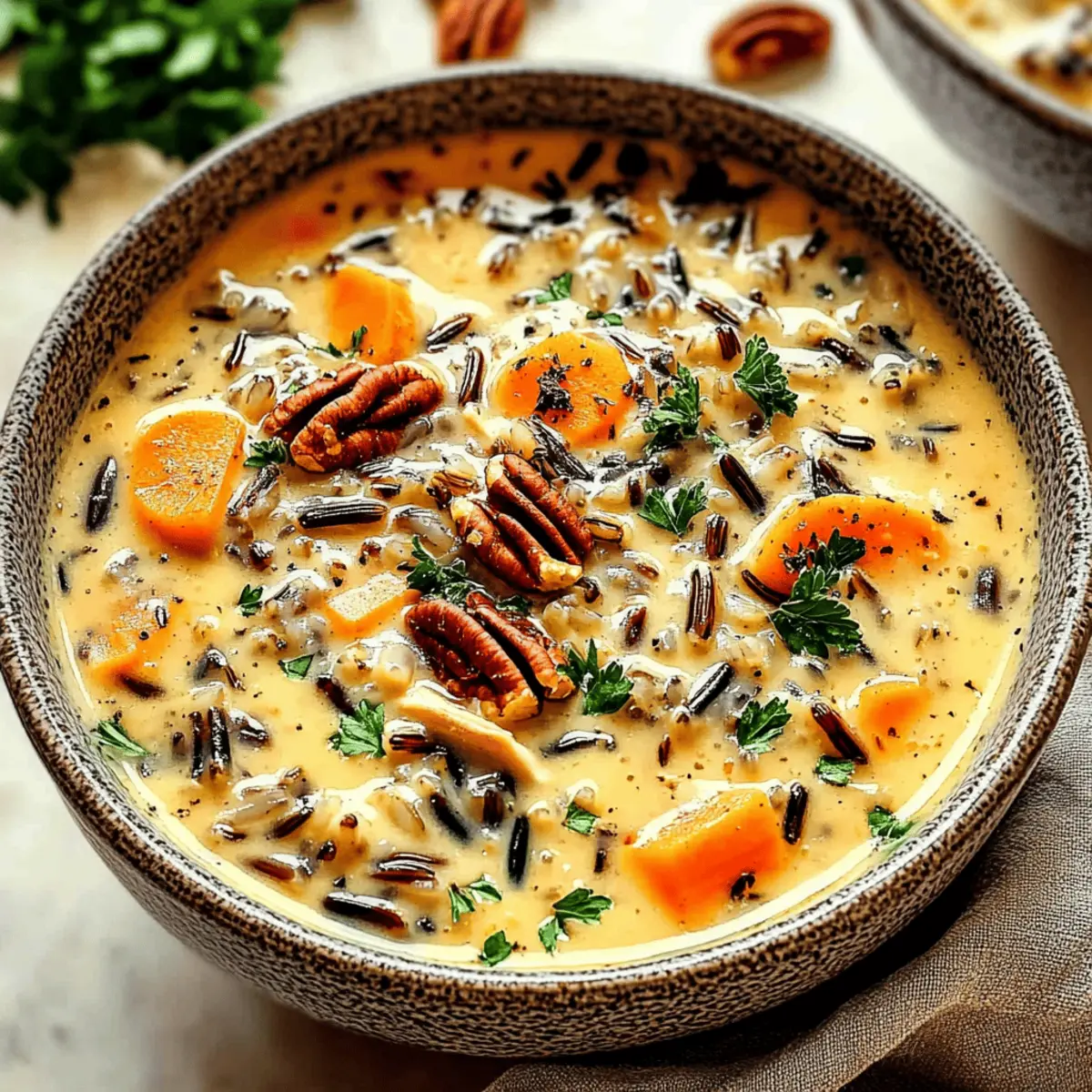 As the leaves crunch underfoot and the air turns crisp, my kitchen transforms into a sanctuary of warmth and comfort, all thanks to the creamy Autumn Wild Rice Soup. This hearty dish combines the nutty essence of wild rice with tender vegetables, crafting a cozy feast that feels like a hug on a chilly evening. Not only is this soup incredibly versatile—perfect for using leftover chicken or accommodating vegetarian preferences—but it also boasts a creamy texture that makes it irresistibly satisfying. As the aroma envelops the room, I can’t help but wonder: what warm memories or savory experiments will this bowl inspire in your home? Why is Autumn Wild Rice Soup so comforting? Comforting as a warm hug: This Autumn Wild Rice Soup wraps you in a blanket of creamy goodness, making it the ideal dish for chilly nights. Nutty flavor from wild rice gives depth, while tender vegetables add essential nutrients. Easily customizable, you can adjust ingredients to suit your dietary needs, whether you prefer chicken or a vegetarian twist. Plus, it’s a fantastic way to use up leftovers, giving you a delicious meal without any waste! Serve it with a crusty loaf of bread or alongside a fresh green salad for a complete experience that’ll leave you craving more. Autumn Wild Rice Soup Ingredients For the Soup Base Wild Rice – Adds nutty flavor and chewy texture; rinse before cooking to avoid excess starch. Chicken Broth – Provides a savory base; low sodium is preferred for better control over saltiness. Olive Oil – Used for sautéing vegetables, enhancing flavors beautifully. Onion – Builds an aromatic foundation essential for sweetness and depth. Carrots – Introduces natural sweetness and vibrant color. Celery – Adds a lovely crunch and flavor contrast. Cremini Mushrooms – Contribute umami richness and texture; can substitute with other mushrooms if desired. Garlic – Enhances overall flavor; fresh is best for maximum potency. For the Seasoning Dried Thyme, Sage, Rosemary – These herbs deepen the herbaceous profile; fresh herbs may be substituted but adjust quantities accordingly. Red Pepper Flakes (optional) – Adds a hint of spice for those who enjoy a little heat. For the Protein and Creaminess Cooked Chicken (shredded) – Provides protein and heartiness; rotisserie chicken is perfect for convenience. Heavy Cream (or coconut milk) – Brings richness and creaminess to the soup; coconut milk makes it dairy-free. For Garnishing Fresh Parsley – Brightens the soup’s flavors and adds a fresh touch as a garnish. Salt and Pepper – Essential for balancing seasoning to taste. Dry Sherry (optional) – Enhances flavor depth; can be omitted if preferred. Toasted Pecans or Walnuts – Adds delightful crunch and additional flavor as a garnish. This comforting Autumn Wild Rice Soup is not just a dish; it’s a heartfelt experience waiting to be shared around your family table! Step‑by‑Step Instructions for Autumn Wild Rice Soup Step 1: Cook the Wild Rice In a medium-sized pot, combine 1 cup of rinsed wild rice with 4 cups of chicken broth. Bring to a gentle boil over medium-high heat, then reduce the heat and cover, letting it simmer for 45-50 minutes. The wild rice should be tender and chewy; drain any excess liquid and set it aside while you prepare the soup base. Step 2: Sauté the Vegetables In a large stockpot, heat 2 tablespoons of olive oil over medium heat. Add 1 diced onion, 2 chopped carrots, and 2 chopped celery stalks, sautéing for about 5-7 minutes until the vegetables are softened and fragrant. Next, stir in 8 ounces of sliced cremini mushrooms and continue cooking until they’re tender, about 3-4 minutes. Finish this step by adding 3 minced garlic cloves along with 1 teaspoon each of dried thyme, sage, and rosemary for an aromatic boost. Step 3: Simmer the Soup Pour in the remaining 4 cups of chicken broth along with the cooked wild rice and 2 cups of shredded cooked chicken to the sautéed vegetables in the pot. Increase the heat to bring the mixture to a gentle simmer, then cover and let it cook for 30-60 minutes, stirring occasionally. This allows all the flavors to meld beautifully, creating a comforting Autumn Wild Rice Soup. Step 4: Finishing Touches After the soup has simmered, stir in 1 cup of heavy cream (or coconut milk for a dairy-free option) and ½ cup of dry sherry if desired. Gently mix in ¼ cup of chopped fresh parsley and season with salt and pepper to taste. Allow the soup to heat through on low for about 5-7 minutes, ensuring it doesn’t boil, while blending the creamy richness into the soup. Step 5: Serving Ladle the warm, comforting Autumn Wild Rice Soup into bowls, garnishing each serving with toasted pecans or walnuts for an added crunch. For an extra touch of flavor, sprinkle with Parmesan cheese if using. Serve immediately to enjoy this nourishing dish that’s perfect for chilly evenings! What to Serve with Creamy Autumn Wild Rice Soup As the aroma of warmth and comfort wafts through your kitchen, consider these delicious pairings to make your meal even more delightful. Crusty Bread: Perfect for dipping, a warm baguette adds texture and heartiness, soaking up the creamy soup beautifully. Simple Green Salad: A light salad with tangy vinaigrette balances the richness of the soup, refreshing your palate with every bite. Roasted Brussels Sprouts: Their crispy edges and earthy flavor create a delightful contrast against the creamy base of the soup, enhancing each mouthful. Apple Cider: A warm spiced apple cider will complement the flavors perfectly, bringing a touch of seasonal sweetness to your meal. Garlic Herb Breadsticks: Soft and flavorful, these breadsticks are ideal for sopping up every last bit of the Autumn Wild Rice Soup. Stuffed Acorn Squash: This dish layers fall flavors, adding a sweetness that pairs well with the earthy tones of the soup. Pumpkin Pie: For dessert, a slice of pumpkin pie rounds off the meal with a hint of sweet