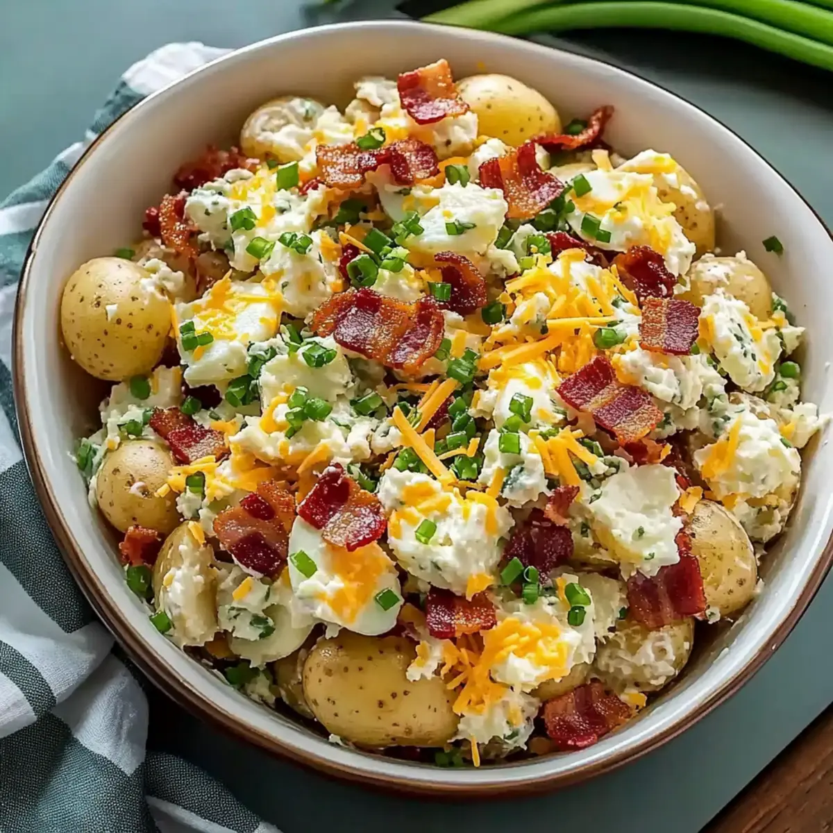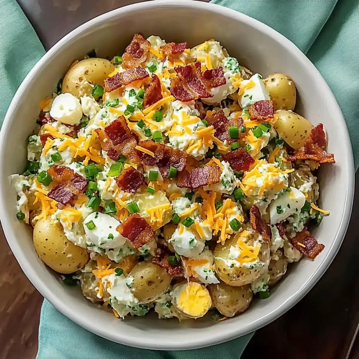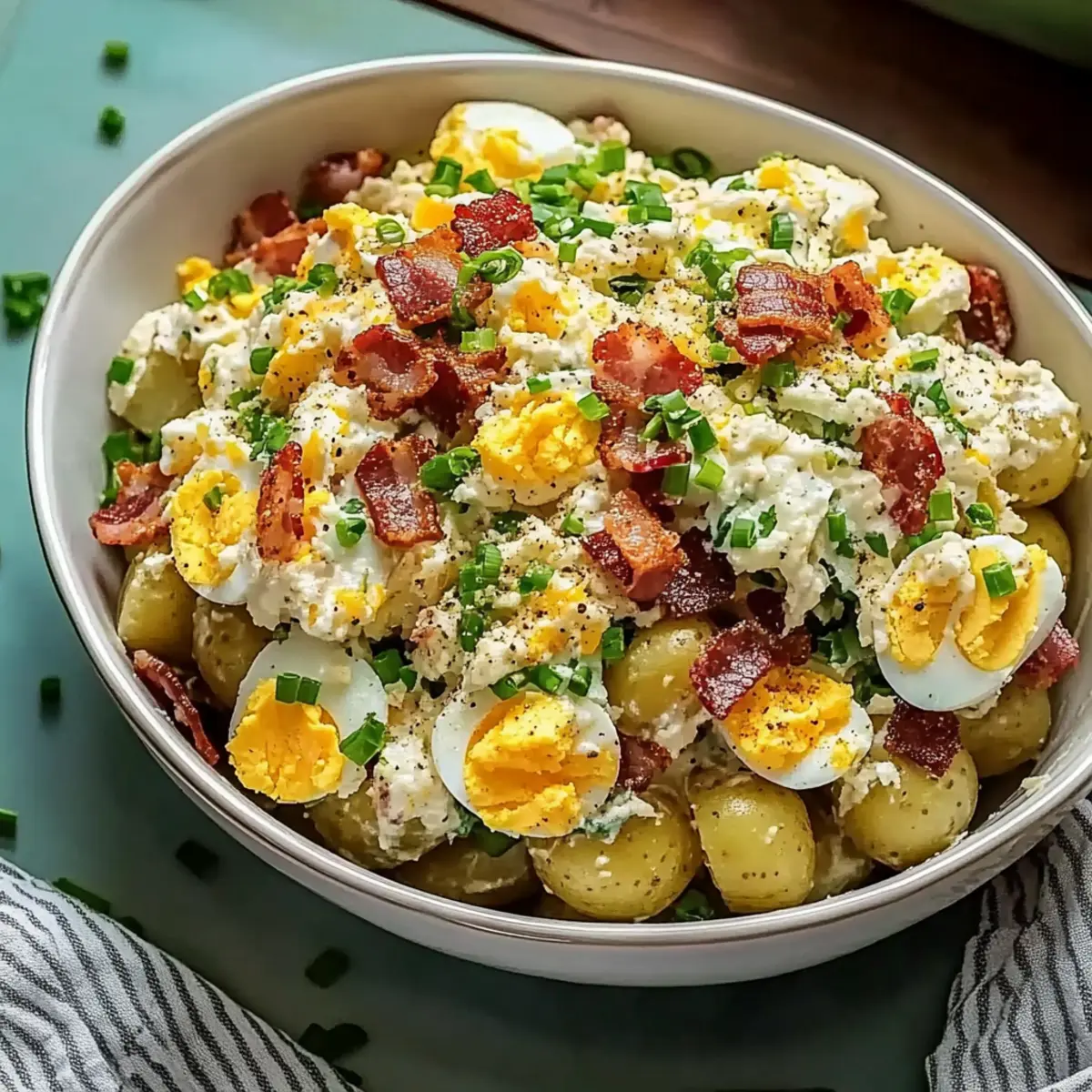 The delicious smell of crispy bacon sizzling in the pan instantly transports me to sunny backyard barbecues and lazy summer afternoons. This Bacon Loaded Potato Salad is the ultimate side dish, combining tender potatoes, smoky bacon, and creamy goodness that’s guaranteed to please a crowd. With minimal prep time, it’s perfect for those busy afternoons when you need a standout dish without the fuss. Plus, the best part is its versatility—feel free to swap in your favorite cheese or add a tangy twist with pickles if you’re feeling adventurous! Are you ready to elevate your potluck game? Let’s dive into this irresistible recipe! Why is Potato Salad Everyone’s Favorite? Crowd-Pleasing Delight: This Bacon Loaded Potato Salad is sure to be a hit at any gathering—it combines flavors and textures that everyone loves! Versatile Base: Feel free to customize it with your preferred cheese, or add a dash of pickles for a zesty kick! Quick Prep Time: With just a few basic steps, you can whip this up in no time, leaving you with more hours for family and fun. Hearty Comfort: The combination of smoky bacon and creamy dressing creates a satisfying side that pairs perfectly with grilled meats, just like our Tomato Bacon Pasta. Make Ahead Option: Prepare it a day in advance to deepen the flavors, ensuring it’s ready when you are! Bacon Loaded Potato Salad Ingredients For the Salad • Potatoes – Waxy varieties like Yukon Gold or red potatoes maintain their shape well; russets work in a pinch! • Bacon – Crispy, salty goodness that brings incredible flavor; cook until perfectly crisp before crumbling. • Eggs – Hard-boiled and diced for that extra richness; feel free to use an egg substitute if preferred. • Cheddar Cheese – Sharp cheddar enhances the flavor; switch it with your favorite cheese to make it your own. • Spring Onions – Offers a fresh, mild onion taste; use both the white and green parts for more flavor. For the Dressing • Mayonnaise – Forms the creamy base of this dressing; swap with Greek yogurt for a lighter twist. • Sour Cream – Adds extra creaminess; feel free to replace it with additional mayonnaise or yogurt. • Dijon Mustard – Provides a nice tang; any mustard variety can also do the trick. • Apple Cider Vinegar – Balances flavors with acidity; lemon juice works as an alternative if needed. • Garlic Powder and Paprika – These spices enhance the overall flavor profile; mix in your favorites too! • Salt and Black Pepper – Essential for seasoning; adjust to your taste to ensure full flavor in your Bacon Loaded Potato Salad. Step‑by‑Step Instructions for Bacon Loaded Potato Salad Step 1: Boil the Potatoes Begin by bringing a large pot of salted water to a rolling boil over high heat. Cut your waxy potatoes into evenly sized cubes for consistent cooking, then carefully add them to the boiling water. Cook for 18-20 minutes until they are tender but still firm; they should easily pierce with a fork without falling apart. Once done, drain the potatoes and set them aside to cool slightly. Step 2: Cook the Bacon In a skillet over medium heat, cook the bacon strips until they’re perfectly crispy, which usually takes about 8-10 minutes. Keep an eye on them to avoid burning. Once crispy, transfer the bacon to a paper towel-lined plate to drain excess grease. Allow it to cool before crumbling it into bite-sized pieces, adding a savory touch to your Bacon Loaded Potato Salad. Step 3: Prepare the Eggs While the potatoes and bacon are cooking, place eggs in a separate saucepan and cover them with water. Bring the water to a boil, then reduce the heat and let it simmer for 9-12 minutes for hard-boiled eggs. Once cooked, transfer the eggs to an ice bath to cool down quickly; this helps with peeling. After they’re cool, dice the eggs into small pieces to add richness to your salad. Step 4: Make the Dressing In a mixing bowl, whisk together mayonnaise, sour cream, Dijon mustard, apple cider vinegar, garlic powder, paprika, salt, and black pepper until smooth and creamy. This flavorful dressing is the heart of your Bacon Loaded Potato Salad, so taste it and adjust the seasoning as necessary to match your preferences. Set this dressing aside while you combine the salad ingredients. Step 5: Combine the Ingredients In a large mixing bowl, gently combine the warm potato cubes with crumbled bacon, diced hard-boiled eggs, sharp cheddar cheese, and the white parts of the spring onions. The warmth of the potatoes will help meld the flavors together beautifully. Be careful to fold gently to avoid breaking up the potatoes as you mix. Step 6: Add the Dressing Pour the prepared dressing over the potato mixture and carefully fold it in until everything is well combined. Ensure that each piece of potato is coated without mashing them. The creamy dressing will bring all the components of the Bacon Loaded Potato Salad together, creating a delightful blend of flavors and textures. Step 7: Chill and Serve Allow the salad to sit at room temperature for about 15 minutes to let the flavors meld. If possible, cover and refrigerate the Bacon Loaded Potato Salad for at least 2 hours before serving; this enhances the flavor and allows for better consistency. When ready to serve, garnish with the green tops of the spring onions for a colorful touch and extra freshness. What to Serve with Bacon Loaded Potato Salad? The perfect side dish is just the beginning of your next family gathering, inviting everyone to indulge in the flavors of summer. Grilled BBQ Chicken: Juicy, smoky grilled chicken brings a delightful contrast to the creamy potato salad, making it a classic pairing. Coleslaw: The crunchy freshness of coleslaw adds a lightness that balances the richness of the loaded potato salad. Corn on the Cob: Sweet, buttery corn complements the savory notes of the bacon, enhancing the whole meal experience. Sliced Tomatoes: Fresh, ripe tomatoes topped with a drizzle of olive o