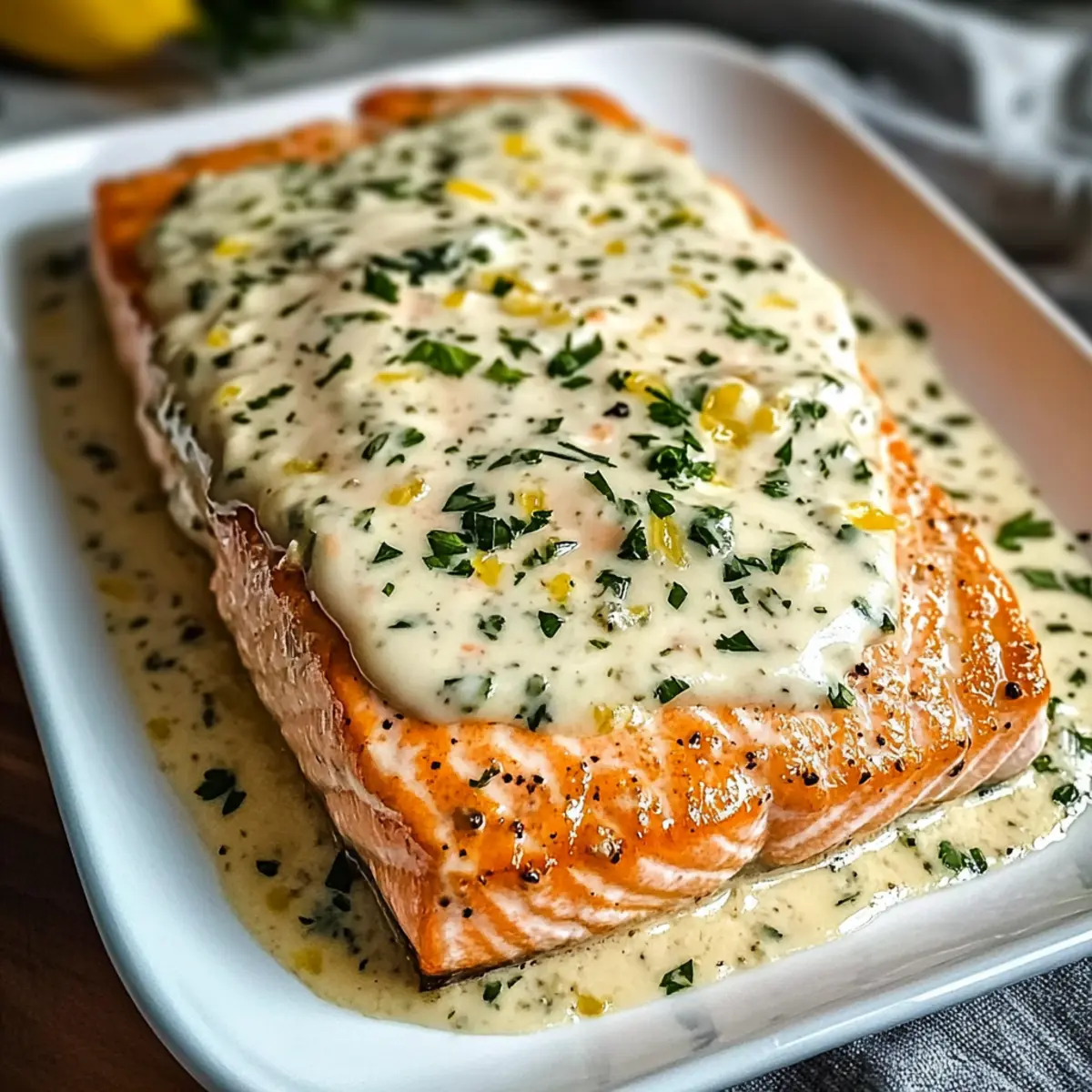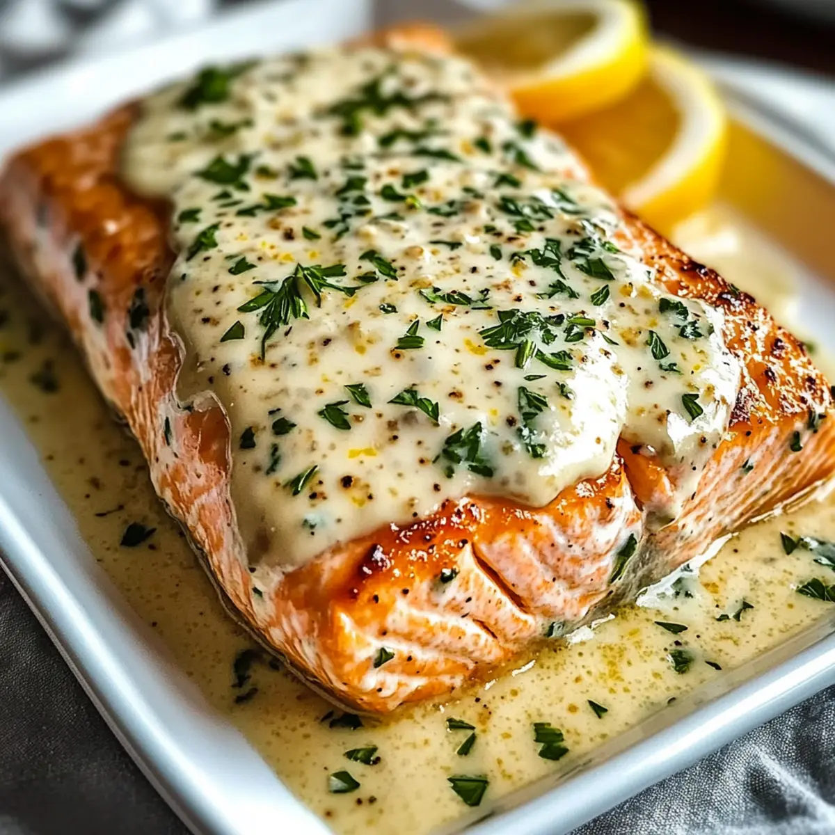 The aroma of garlic and lemon zest fills the kitchen, transporting me to a cozy coastal bistro where fresh seafood reigns supreme. That’s the kind of magic you can create at home with this Baked Boursin Salmon recipe. This dish harmoniously marries the creamy richness of Boursin cheese with the tender, flaky texture of salmon, making it a delightful option for both weekday dinners and elegant gatherings. One of the best parts? It requires minimal prep and cooks in just 20 minutes—perfect for those busy evenings when you crave gourmet flavors without the fuss. And if you’re feeling adventurous, feel free to customize with different cheeses or herbs to suit your taste. Curious how you can elevate your dinner table with this simple yet impressive meal? Let’s dive into the details! Why Is Baked Boursin Salmon a Must-Try? Effortless Preparation: You won’t believe how easy it is to whip up this gourmet dish! With just a few simple steps, you can have a restaurant-quality meal on your table in 20 minutes. Decadent Flavor: The rich, creamy Boursin cheese pairs perfectly with salmon, delivering an irresistible taste that will impress your family and friends. Versatile Customization: Feel free to switch things up! Swap out Boursin for cream cheese or goat cheese, and add your favorite herbs to make it uniquely yours. Great Pairings: Elevate your meal! Serve this salmon alongside creamy mashed potatoes or roasted asparagus for a well-rounded dinner experience. You can even enjoy it with a glass of chilled Chardonnay. Recipe for Any Occasion: Whether it’s a casual weeknight or a festive gathering, the Baked Boursin Salmon is sure to be a crowd-pleaser. It’s that delicious! Baked Boursin Salmon Ingredients For the Salmon • Salmon Fillets – The star of the dish; opt for skin-on for added flavor and moisture. • Olive Oil or Melted Butter – Keeps the salmon moist and adds richness; use butter for a more indulgent taste. • Salt and Black Pepper – Essential seasonings that enhance the overall taste; adjust to your preference. For the Boursin Mixture • Boursin Cheese – Provides a creamy richness; can substitute with cream cheese or goat cheese for a different flavor profile. • Minced Garlic – Adds aromatic depth; increase or decrease as desired. • Lemon Zest and Juice – Freshens up the dish and complements the richness of the cheese; fresh is preferred for the best flavor. For Garnish • Chopped Parsley – For garnish that brings freshness and color; you can use dill or basil for variation. This Baked Boursin Salmon is not just a meal; it’s a culinary experience waiting to happen! Step‑by‑Step Instructions for Baked Boursin Salmon Step 1: Preheat the Oven Begin your culinary journey by preheating your oven to 400°F (200°C). This ensures the proper cooking temperature for our Baked Boursin Salmon, allowing it to cook evenly and thoroughly. While the oven warms up, gather your ingredients and baking dish to keep everything organized and streamline your preparation. Step 2: Prepare the Baking Dish Next, take a baking dish and lightly grease it with olive oil or line it with parchment paper for easy cleanup. This step is essential as it prevents the salmon from sticking to the dish, ensuring your meal comes out perfectly intact. Keep the dish nearby as we move to the next step of preparing the creamy filling. Step 3: Mix the Boursin Filling In a medium mixing bowl, combine the creamy Boursin cheese with minced garlic, fresh lemon zest, and lemon juice. Add half of your olive oil or melted butter to this mixture. Stir until the ingredients are well blended and smooth, creating a rich paste that will act as a flavorful topping for the salmon fillets. Step 4: Prepare the Salmon Fillets Pat your salmon fillets dry using paper towels to remove any excess moisture. This will help achieve that perfect flaky texture. Drizzle the remaining olive oil or melted butter over the fillets, and season them generously with salt and black pepper. This simple seasoning enhances the overall flavor of your Baked Boursin Salmon. Step 5: Assemble the Dish Now it’s time to bring it all together! Place the seasoned salmon fillets in the prepared baking dish, skin side down. Use a spatula to spread the Boursin cheese mixture evenly over the top of each fillet, ensuring every bite is packed with creamy goodness. This is where your Baked Boursin Salmon begins to take shape. Step 6: Bake the Salmon Slide the baking dish into the preheated oven and let the salmon bake for about 15–20 minutes. Keep an eye on it, and check for visual cues such as the flesh turning opaque and flaking easily with a fork. For perfect doneness, the internal temperature should reach 145°F (63°C), ensuring your salmon is cooked to mouthwatering perfection. Step 7: Rest and Garnish Once baked, carefully remove the dish from the oven and let the salmon rest for about 2 minutes. This brief resting period allows the juices to redistribute throughout the fish. Finally, garnish your Baked Boursin Salmon with freshly chopped parsley for a pop of color and vibrant flavor before serving it to your eagerly awaiting guests. Expert Tips for Baked Boursin Salmon Even Fillet Thickness: Ensure your salmon fillets are of even thickness. This guarantees consistent cooking, preventing one end from being overdone while the other remains undercooked. Watch the Clock: Avoid the common mistake of overbaking. Start checking for doneness around the 15-minute mark to achieve perfectly flaky Baked Boursin Salmon. Dairy-Free Option: If you’re looking for dairy-free alternatives, substitute Boursin with a dairy-free cream cheese. Just as flavorful, it will ensure everyone can enjoy this dish. Smooth Cheese Mixture: If your Boursin mixture is too thick, simply thin it out with a splash of olive oil or water until it’s spreadable, making it easy to apply onto the salmon. Fresh Ingredients Matter: Using fresh lemon juice and zest elevate