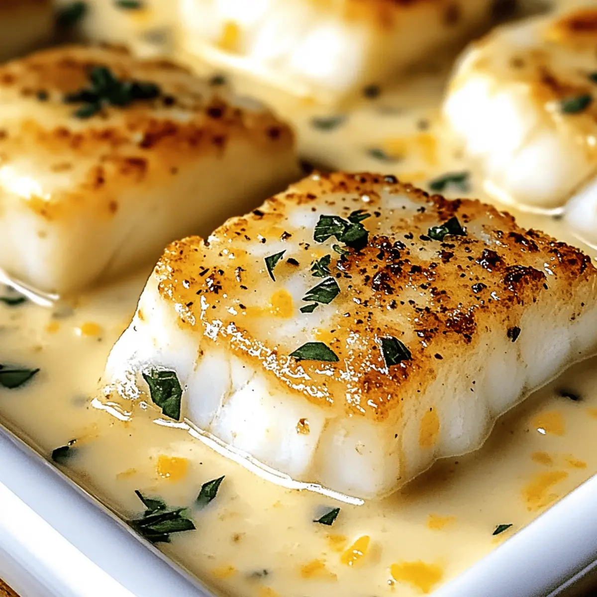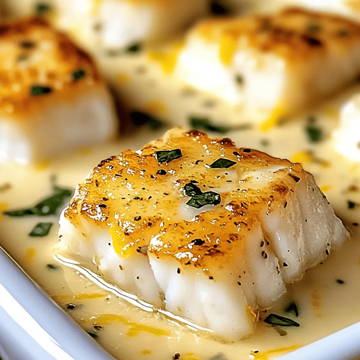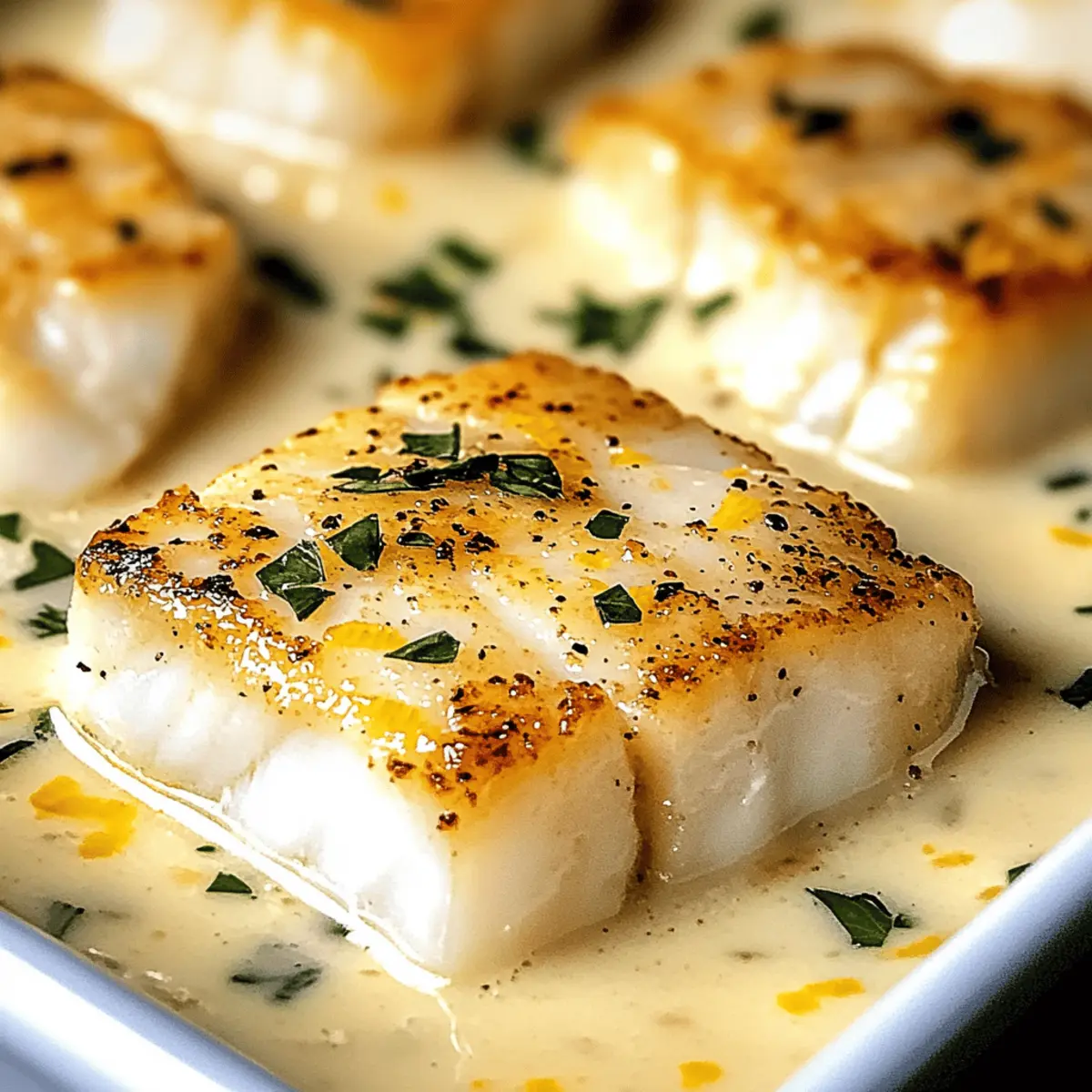 As the sun sets and the kitchen fills with comforting aromas, I find myself craving a dish that combines simplicity and richness. Enter my Baked Cod in Coconut Lemon Cream Sauce—a quick and easy weeknight dinner that effortlessly transforms dinner from mundane to memorable. The creamy coconut milk melds beautifully with zesty lemon, creating a sauce that’s not only indulgent but also refreshingly light. This recipe is a true crowd-pleaser, allowing you to whip up a restaurant-quality meal in under 30 minutes. Plus, it’s packed with nutrients, making it a guilt-free indulgence that even the pickiest eaters will adore. Ready to elevate your dinner routine with this delightful dish? Let’s dive into the creamy goodness! Why Is This Recipe a Game Changer? Quick Preparation: Get this delightful dish on the table in under 30 minutes, perfect for busy weeknights! Unique Flavor Fusion: The combination of creamy coconut and zesty lemon brings an extraordinary taste that will impress your family and guests. Healthy Indulgence: Packed with protein and nutrients, this dish lets you enjoy a satisfying meal without the guilt. Versatile Pairing: Serve it alongside fluffy rice or grilled veggies for a complete dinner experience that everyone will love! Simple Ingredients: With common pantry staples like cod, olive oil, and ginger, you can create a restaurant-quality dish without breaking the bank. Elevate your cooking game with this Baked Cod in Coconut Lemon Cream Sauce! Baked Cod in Coconut Lemon Cream Sauce Ingredients For the Cod • Cod Fillets – Look for thick, firm, glossy fillets; both Pacific and Atlantic varieties work well. For the Sauce • Salt and Pepper – Enhances overall flavor; adjust amounts to taste. • Olive Oil – Used for sautéing aromatics; substitute with coconut oil for a richer taste. • Onion – Provides a base flavor for the sauce; yellow or white varieties are best. • Fresh Ginger – Adds warmth and depth; ground ginger can be a suitable substitute (use less). • Garlic – Introduces aromatic richness; fresh minced garlic works best, but pre-minced or powder will do in a pinch. • Coconut Milk – Forms the creamy, luscious sauce; light coconut milk can be used for a lower-fat version. • Lemon Juice and Zest – Brings brightness and acidity; always use fresh lemons for the best flavor. Elevate your weeknight meals with these ingredients to create the delicious Baked Cod in Coconut Lemon Cream Sauce! Step‑by‑Step Instructions for Baked Cod in Coconut Lemon Cream Sauce Step 1: Preheat the Oven Set your oven to 180°C (350°F) to ensure even baking as you prepare your ingredients. This temperature is perfect for achieving that tender, flaky cod while allowing the coconut lemon cream sauce to meld beautifully. Step 2: Season the Cod Lightly season each cod fillet with salt and pepper, ensuring you coat both sides for enhanced flavor. This simple step is essential for bringing out the fish’s natural taste and helps the sauce cling neatly when baked. Step 3: Prepare the Coconut-Lemon Cream Sauce In a skillet over medium heat, pour in a drizzle of olive oil and let it warm up. Sauté the chopped onion for about 3-4 minutes until it turns translucent, then add the minced ginger and garlic. Stir for another minute until fragrant, releasing the lovely aromatics that will form the base of your coconut lemon cream sauce. Step 4: Incorporate Coconut Milk Now, pour in the creamy coconut milk and bring the mixture to a gentle simmer, stirring occasionally. This will take about 2-3 minutes. Next, add the lemon juice and zest, stirring well to combine. The rich, creamy sauce will thicken slightly, enveloping the aromatic ingredients for a delicious finish. Step 5: Assemble and Bake Transfer the seasoned cod fillets into a baking dish, and pour the luscious coconut lemon cream sauce evenly over the fish. Bake in the preheated oven for 20-25 minutes. The cod is done when it easily flakes apart with a fork and is opaque throughout, indicated by its tender texture. Step 6: Serve and Enjoy Once baked, carefully remove the dish from the oven and serve your Baked Cod in Coconut Lemon Cream Sauce while hot. The creamy sauce pairs wonderfully with fluffy rice or grilled vegetables, creating a well-rounded meal that will surely impress your family and friends. What to Serve with Baked Cod in Coconut Lemon Cream Sauce As you savor the comforting embrace of the creamy coconut lemon sauce, think of delightful sides that bring your meal to the next level. Fluffy Jasmine Rice: The gentle, fragrant rice complements the sauce perfectly, soaking up every flavorful drop for a truly satisfying bite. Grilled Asparagus: This lightly charred veggie adds a delicious crunch and fresh, earthy flavor that balances the richness of the dish. Crispy Garlic Bread: Serve warm, crusty slices to scoop up the luscious sauce, providing a delightful contrast in texture and flavor. Mediterranean Salad: Toss together fresh greens, cherry tomatoes, and olives for a vibrant, refreshing contrast—the acidity cuts through the creaminess beautifully. Roasted Sweet Potatoes: The caramelization from roasting brings a natural sweetness that pairs wonderfully with the zesty notes of lemon and coconut. Chilled White Wine: A crisp Sauvignon Blanc or a fruity Pinot Grigio enhances the meal’s bright flavors, making every sip a refreshing delight. Embrace these pairings, and elevate your dining experience with a full symphony of flavors and sensations! Variations & Substitutions for Baked Cod in Coconut Lemon Cream Sauce Feel free to tailor this delightful recipe to your taste with these fun and creative twists! Other Fish: Substitute cod with haddock, tilapia, or halibut for a different flavor profile. Each alternative offers its own unique texture, allowing for lovely variations in the dish. Dairy-Free: Use coconut cream instead of coconut milk for an ultra-rich sauce. This will provide an even creamier, dre