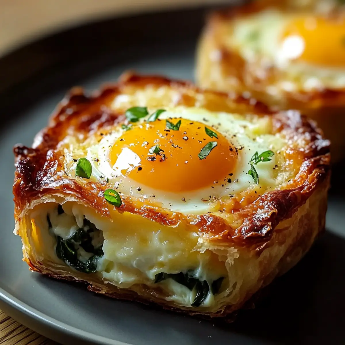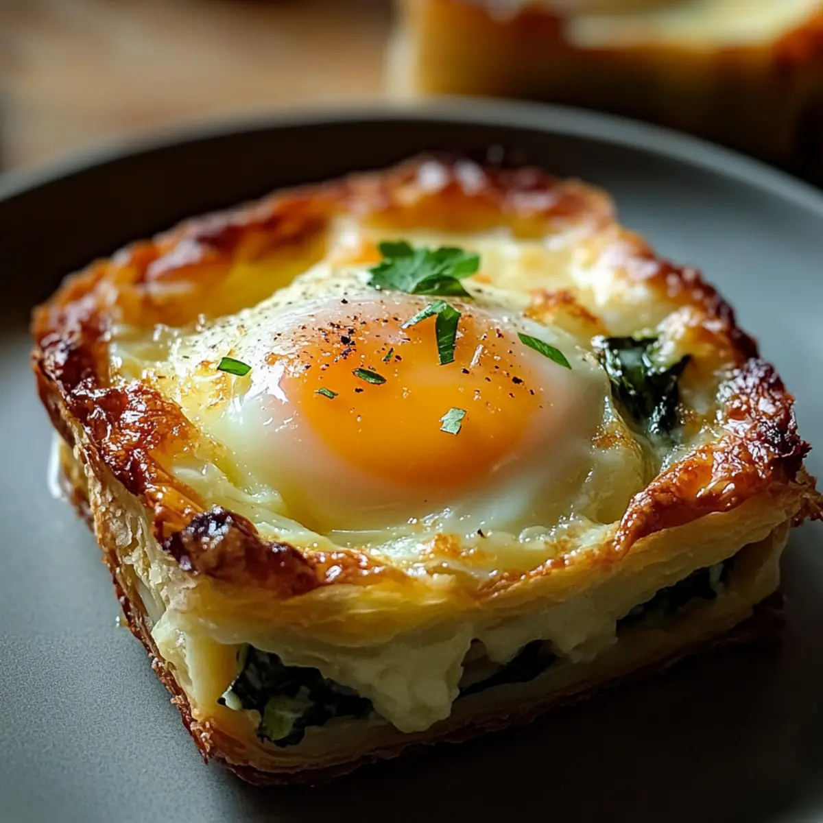 As I stood in my kitchen with the scent of buttery, flaky pastry wafting through the air, the thought of indulging in a delicious Baked Eggs Napoleon danced through my mind. This elegant brunch recipe transforms simple ingredients into an impressive dish that’s sure to impress family and friends alike. Nestled within crispy puff pastry cups, you’ll discover a creamy, spinach filling topped with perfectly runny yolks—comfort food at its finest! With quick prep and versatile fillings, this delightful offering is not only a celebration of flavors but also a stress-free way to elevate your dining experience. Whether you’re hosting a brunch gathering or just treating yourself to something special, this dish is designed to bring joy to any occasion. What creative twists will you add to make it your own? Why Is Baked Eggs Napoleon Special? Indulgent flavors unite in this recipe, blending rich eggs with creamy spinach and flaky pastry. Versatile for various diets, swapping ingredients means it can cater to vegetarians or those craving a meaty kick! Effortless to prepare, it requires minimal cooking skill, making you look like a chef effortlessly. Crowd-Pleasing goodness, perfect for impressing guests at brunch! Serve it alongside a light salad or some artisanal bread for an unforgettable experience! For an extra treat, pair it with Baked Mac Cheese or Oven Baked Chicken. Baked Eggs Napoleon Ingredients For the Pastry Shells • Puff Pastry – This flaky pastry forms the delightful shell for your eggs; keep it cold for easy handling. For the Filling • Fresh Spinach – Adds nutritious greens; make sure it’s well-wilted to prevent a soggy base. • Eggs – The star of the dish, providing richness; choose the freshest eggs for perfect runny yolks. • Gruyere Cheese – Enhances creaminess and flavor depth; can be swapped for cheddar or goat cheese. • Heavy Cream – Contributes to a rich, creamy egg texture; don’t skimp on the cream for best results. For Additional Flavor • Prosciutto or Ham – Offers savory richness; substitute with crispy bacon or skip for a vegetarian option. • Seasonings – Salt, pepper, and a hint of nutmeg enhance the flavors beautifully; feel free to experiment with herbs. Just imagine the beauty of Baked Eggs Napoleon gracing your breakfast table, inviting everyone to dig in! Step‑by‑Step Instructions for Baked Eggs Napoleon Step 1: Prepare Puff Pastry & Oven Start by thawing your puff pastry in the refrigerator for several hours or overnight for optimal flakiness. Preheat your oven to 400°F (200°C) and generously grease four 4-inch ramekins. The goal is to create a non-stick surface for the pastry, which will puff and rise beautifully during baking. Step 2: Form Pastry Shells Once your pastry is thawed, roll it out to about 1/8 inch thickness on a lightly floured surface. Use a round cutter to cut circles slightly larger than your ramekins, then gently press them into the greased dishes, allowing some overhang. This will create an elegant cup for the creamy filling of your Baked Eggs Napoleon. Step 3: Blind Bake Pastry Pre-bake these pastry shells to ensure they become crisp. Line each shell with parchment paper and fill with pie weights or dried beans. Bake for 12-15 minutes until the edges are golden brown. Remove the weights and parchment, then return to the oven for an additional 3-5 minutes until the bottom is lightly browned. Step 4: Prepare Creamy Spinach Filling While the pastry bakes, prepare the filling. In a skillet over medium heat, sauté finely chopped shallots and garlic in a splash of olive oil until soft and fragrant, about 2 minutes. Add fresh spinach, cooking until wilted, then remove from heat. Mix in cream cheese, heavy cream, grated Parmesan, and seasonings until smooth and creamy. Step 5: Assemble Napoleon Once your shells are baked and your filling is ready, spoon the creamy spinach mixture generously into each puff pastry cup. Carefully crack an egg on top of the filling in each ramekin, ensuring the yolk sits nicely on the mixture to create a stunning Baked Eggs Napoleon. Step 6: Egg Wash & Season Using a pastry brush, lightly coat the exposed edges of the pastry with a beaten egg wash to give your dish a golden hue. Then, season each egg delicately with salt, pepper, and a sprinkle of nutmeg for added flavor. Step 7: Final Bake Pop the assembled Baked Eggs Napoleon back into the oven and bake for about 12-18 minutes, depending on how runny you prefer your eggs. Keep an eye on them; when the egg whites are set and the yolks are still slightly jiggly, they are perfectly done. Step 8: Garnish & Serve Carefully remove your Baked Eggs Napoleon from the oven, allowing them to cool for a few minutes. Garnish each ramekin with fresh chives for a pop of color and flavor. Serve warm, either directly in the ramekins or slide them onto plates for a beautiful presentation. What to Serve with Baked Eggs Napoleon? Imagine a table set for a leisurely brunch, where the aroma of freshly baked eggs and flaky pastry invites everyone to indulge. Light Green Salad: Refreshing greens tossed in a zesty vinaigrette help lift the rich flavors of the Baked Eggs Napoleon. Toasted Artisanal Bread: Crunchy, warm slices are perfect for dipping into the runny yolks, adding a delightful texture. Roasted Cherry Tomatoes: Their sweetness contrasts beautifully with the savory elements, bringing a burst of color and flavor to your plate. Savory Scones: Flaky, rich scones make a delightful addition, offering a comforting and buttery companion to the egg dish. Fresh Fruit Platter: A mix of seasonal fruits provides a sweet counterbalance and brightens the overall meal. Sparkling Mimosa: This bubbly drink adds a festive touch, perfectly complementing the elegance of the brunch experience. Herbed Cream Cheese Spread: Serve this alongside crackers or bread for an extra layer of taste that pairs wonderfully with the pastry. Coffee or Herbal Tea: A warm bevera