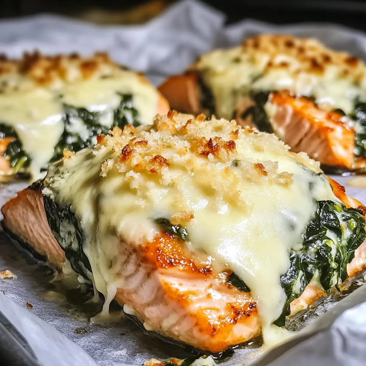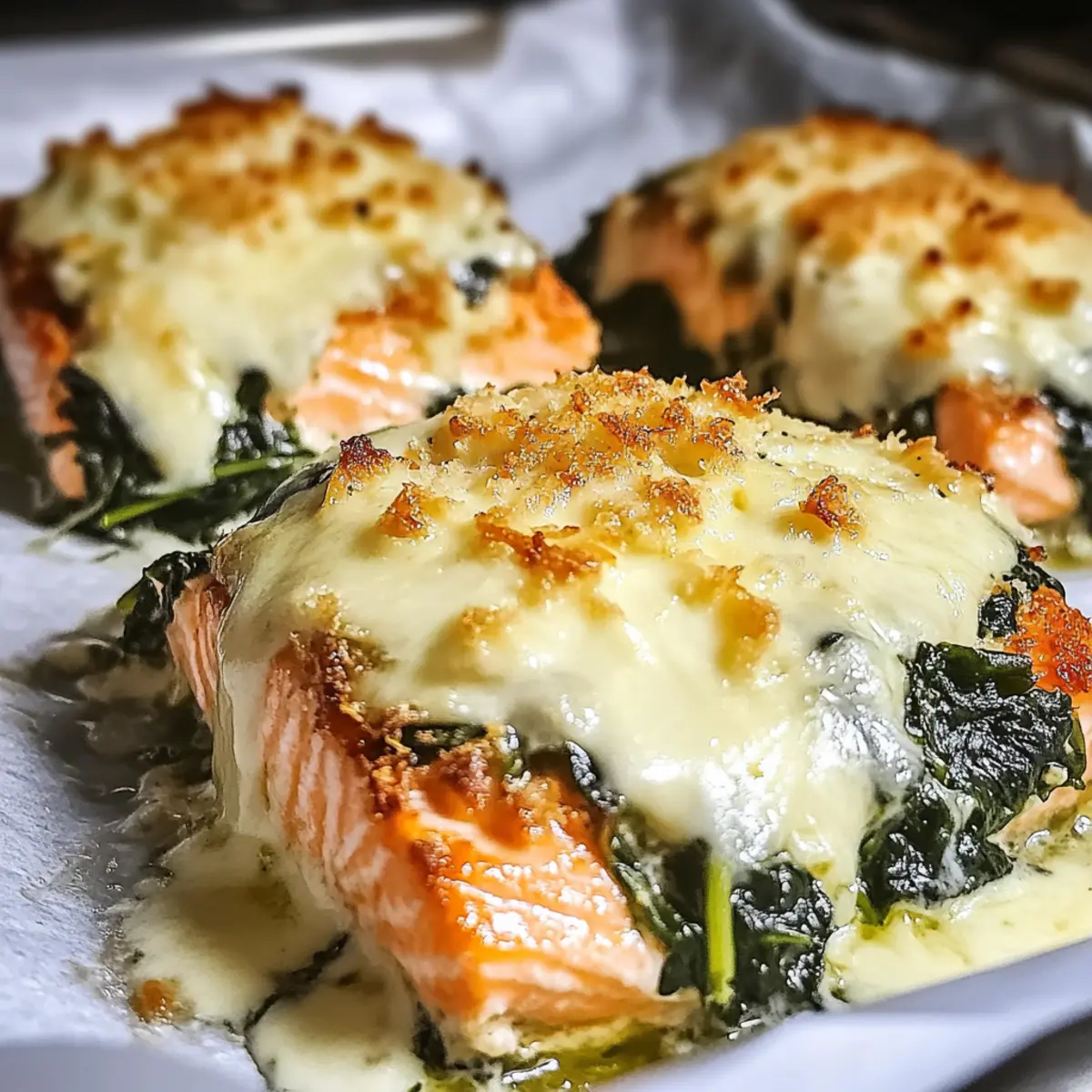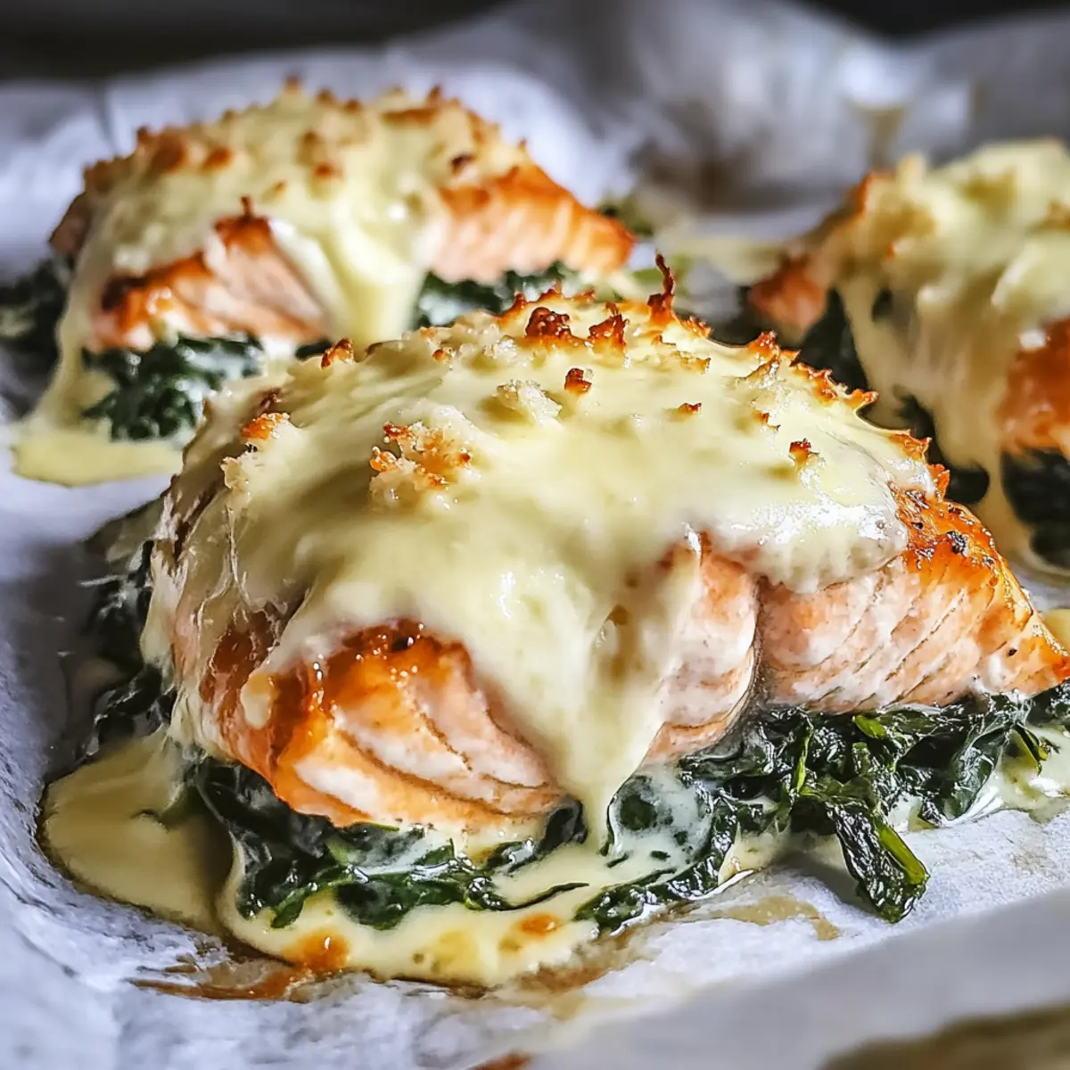 The aroma of sizzling garlic and onions fills the kitchen as I prepare to share my favorite weeknight meal: Baked Salmon with Spinach and Mozzarella Bliss. It’s fascinating how just one dish can transform a busy evening into a delightful dining experience in under 40 minutes! This heart-healthy recipe is not only low-carb—making it perfect for meal prep—but it also delivers a comforting, creamy topping of spinach and bubbling mozzarella that’ll have your family asking for seconds. With a perfectly flaky salmon base rich in omega-3s, this meal is a winner for both taste and health. But wait, what’s your secret twist to making salmon truly shine? Let’s find out! Why Is This Salmon Dish Unique? Quick Preparation: With just 40 minutes from start to finish, this dish is ideal for busy weeknights, allowing you to enjoy a home-cooked meal without spending hours in the kitchen. Health Benefits: Loaded with omega-3 fatty acids, this baked salmon not only tastes fantastic but is also a heart-healthy choice that you’ll feel good about serving to your loved ones. Irresistible Flavor: The combination of creamy spinach and gooey mozzarella brings a delightful twist to the classic salmon dish, making it a flavorful hit that will keep your family asking for more. Versatile Base: Feel free to swap out spinach for kale or your favorite herbs like basil to customize the dish to your taste; it’s all about making it your own! Meal Prep Friendly: You can whip up the creamy spinach mixture ahead of time, making it a perfect solution for easy meal prep. Once you try this vibrant dish, you might just want to pair it with a side of Creamy Mashed Potatoes or a Crisp Garden Salad to complete your delightful meal. Baked Salmon with Spinach and Mozzarella Ingredients To bring this delicious dish to life, gather these essential ingredients! For the Salmon Salmon Fillet – Select a vibrant, pink fillet for the best flavor and texture. Salt and Pepper – Season generously to enhance the natural taste of the salmon. For the Spinach Mixture Spinach – Fresh or thawed frozen spinach adds moisture and nutrition to the dish. Onion – Sautéed onion adds depth; feel free to use yellow or white varieties. Garlic – Fresh garlic packs a flavorful punch; dried garlic can be a quick substitute. Sour Cream – This ingredient adds creaminess, but Greek yogurt is a tangy, lower-fat alternative. For the Topping Mozzarella – A gooey, satisfying cheese option; consider Gouda for a twist. Olive Oil – Perfect for sautéing; canola or grapeseed oil are great substitutes. With these ingredients, you’re not just preparing a meal; you’re crafting a delicious experience of Baked Salmon with Spinach and Mozzarella Bliss that your family will love! Step‑by‑Step Instructions for Baked Salmon with Spinach and Mozzarella Bliss Step 1: Sauté Aromatics In a large skillet over medium heat, warm 1 tablespoon of olive oil. Add the sliced onions and sauté for 3-4 minutes until they turn translucent and aromatic. Stir in 2 minced garlic cloves and sauté for another 30 seconds, allowing the garlic to release its fragrant flavor. This process lays a flavorful base for your creamy spinach mixture. Step 2: Add Spinach Next, incorporate 2 cups of thawed and well-drained spinach into the skillet. Cook for an additional 2-3 minutes, stirring frequently until the spinach is heated through. Season generously with salt and pepper, then mix in ½ cup of sour cream until well combined. The creamy spinach mixture brings delightful richness to the baked salmon with spinach and mozzarella bliss. Step 3: Prepare Salmon While the spinach mixture cools, preheat your oven to 175°C (347°F). Season 4 salmon fillets with salt and pepper on both sides. In a separate skillet over medium-high heat, add a bit more olive oil and sear the salmon for about 2 minutes on each side until golden brown. This initial sear enhances the flavor and texture of the salmon prior to baking. Step 4: Assemble Grease a baking dish with a light coating of olive oil and place the seared salmon fillets inside. Evenly distribute the creamy spinach mixture over each fillet, ensuring they are well covered. Finally, sprinkle 1 cup of shredded mozzarella cheese generously atop the spinach, setting the stage for that delectable cheesy crust on the baked salmon with spinach and mozzarella bliss. Step 5: Bake Transfer the assembled dish to the preheated oven and bake for 15-20 minutes. Keep an eye on the salmon; it should be opaque and flake easily with a fork when done. The mozzarella cheese will turn golden and bubbly, creating an enticing visual perfect for any weeknight dinner. Step 6: Serve Once baked, remove the dish from the oven and allow it to rest for a couple of minutes. This resting phase helps to maintain moisture in the salmon. Serve your baked salmon with spinach and mozzarella bliss alongside vibrant sides like a fresh salad or creamy mashed potatoes to complete your heart-healthy meal. Baked Salmon with Spinach and Mozzarella Variations Feel free to get creative with this delicious recipe and customize it to suit your taste buds! Kale Swap: Use kale instead of spinach for a robust flavor and an extra nutrient boost. Kale adds a delightful chewiness that pairs beautifully with the creamy topping. Cheesy Twist: Mix in aged Gouda or provolone cheese for an entirely different flavor profile. The nuttiness of Gouda will elevate the dish to new heights! Herb-Infused: Add fresh herbs like basil or parsley to the spinach mixture for a pop of freshness. This will brighten the entire dish and is a great way to showcase seasonal ingredients. Spicy Kick: Stir in a pinch of red pepper flakes or use pepper jack cheese for a little heat. A touch of spice can turn this comforting meal into an exciting experience! Citrus Zing: Squeeze some lemon juice over the baked salmon just before serving for a refreshing brightness. The acidity truly enhances the rich flavors and ba