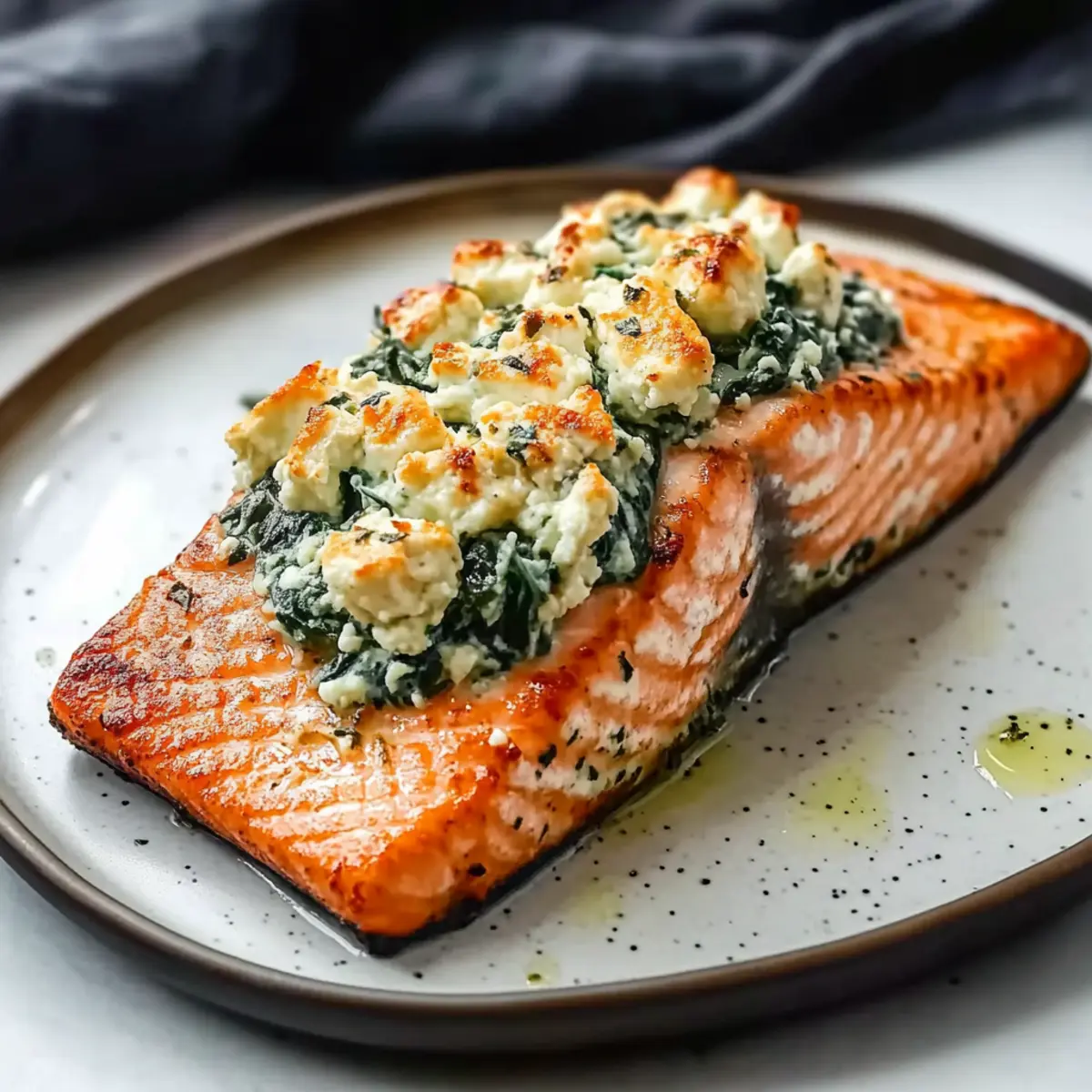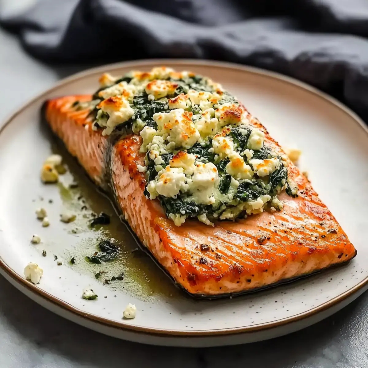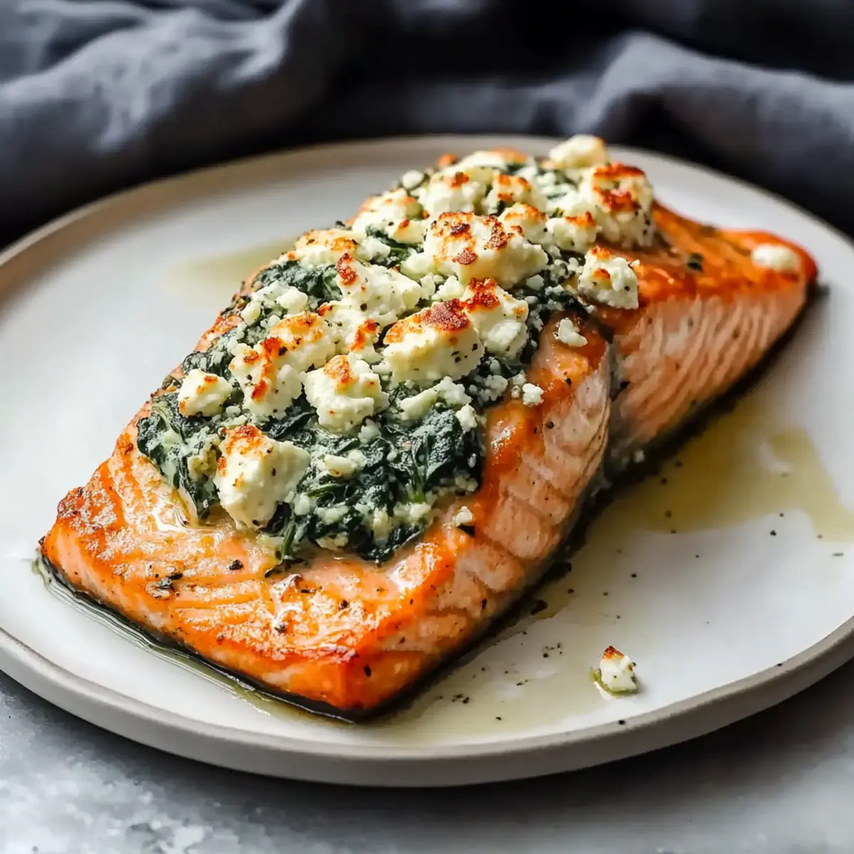 The aroma of savory salmon sizzling in the oven has a way of whisking me back to my Sunday family dinners. This Easy Baked Stuffed Salmon with Spinach and Feta not only delights the senses but also brings a touch of elegance to your weekday meals without the stress. It’s perfect for those hectic nights when you crave something nutritious and satisfying yet quick to pull together. With tender fish enveloping a creamy blend of spinach, feta, and roasted red peppers, you’ll have a delightful dish that’s sure to impress. Plus, the leftovers are a treat on their own—who doesn’t love a satisfying meal that tastes even better the next day? Ready to elevate your dinner game? Let’s dive into this delicious recipe! Why is This Salmon Recipe a Must-Try? Ease of Preparation: This recipe requires minimal effort, making it ideal for busy weeknights. Flavorful Filling: The creamy blend of spinach and feta packs a punch, while roasted red peppers add a delightful touch of sweetness. Healthy & Nutritious: Packed with omega-3 fatty acids, this dish isn’t just delicious but also good for you—perfect for health-conscious eaters! Versatile Substitutions: Feel free to swap spinach for kale or change up the cheese—this recipe is as flexible as it is tasty! Appeal to All: Impress your family or guests with gourmet flavors that don’t require a culinary degree; it’s as approachable as making Oven Baked Chicken! Meal Prep Friendly: Leftovers can be enjoyed cold or reheated, making this dish a smart choice for meal prep enthusiasts. Baked Stuffed Salmon with Spinach and Feta Ingredients For the Salmon Salmon fillets – Main protein and source of omega-3 fatty acids; use skin-on or skinless fillets for easier serving. Olive oil – Provides moisture and enhances flavor; can substitute with melted butter for a richer taste. For the Filling Fresh or frozen spinach – Adds nutrition and texture; ensure it is thoroughly squeezed dry to prevent a soggy filling. Italian seasoning – Adds a classic herb blend for flavor; can substitute with a mix of dried basil, oregano, and thyme. Paprika – Contributes a mild sweetness and color. Cayenne pepper – Adds heat; adjust to taste or omit for a milder option. Feta cheese – Adds a tangy, creamy element; substitute with goat cheese for a different flavor profile. Parmesan cheese – Provides a salty, nutty taste. Roasted red peppers – Adds sweetness and depth of flavor. Garlic powder – Enhances overall flavor profile. This Baked Stuffed Salmon with Spinach and Feta is your gateway to quick weeknight elegance and nutritious dining! Step‑by‑Step Instructions for Baked Stuffed Salmon with Spinach and Feta Step 1: Preheat the Oven Begin by preheating your oven to 400°F (200°C). While the oven heats up, prepare a baking sheet by lining it with parchment paper or spraying it lightly with non-stick cooking spray. This will ensure your Baked Stuffed Salmon with Spinach and Feta doesn’t stick and is easy to clean afterward. Step 2: Prepare the Salmon Pat the salmon fillets dry with paper towels and place them skin-side down on the prepared baking sheet. Carefully slice a pocket into each fillet, cutting three-quarters of the way through without splitting it. This step allows for a generous filling of the delightful mixture later, creating the perfect vessel for our creamy stuffing. Step 3: Sauté the Spinach In a skillet over medium heat, drizzle some olive oil and let it warm. Add the spinach and a pinch of Italian seasoning, sautéing for about 3-4 minutes until wilted. Make sure to squeeze out any excess moisture from the spinach before moving on, as a dry filling will create the best texture in your Baked Stuffed Salmon with Spinach and Feta. Step 4: Mix the Filling Remove the sautéed spinach from the heat and transfer it to a mixing bowl. Stir in the feta cheese, Parmesan, roasted red peppers, paprika, and garlic powder. Combine everything thoroughly until the filling is rich and creamy. This savory mixture will bring an explosion of flavors to each bite of your salmon. Step 5: Stuff the Salmon Brush the tops of the salmon fillets with olive oil and sprinkle with salt and pepper for an extra layer of taste. Now, generously stuff the pockets you created with the spinach and feta mixture, ensuring each fillet is packed to perfection. Each salmon pocket should be filled with the vibrant filling, ready to be baked. Step 6: Bake the Salmon Place the stuffed salmon in your preheated oven and bake for 12 to 17 minutes. You’ll know it’s done when the salmon flakes easily at an internal temperature of 145°F (63°C). The tops should be golden and slightly crispy, signaling a beautifully cooked Baked Stuffed Salmon with Spinach and Feta that’s ready to delight your family or guests. Make Ahead Options These Easy Baked Stuffed Salmon with Spinach and Feta are perfect for busy home cooks looking to streamline their meal prep! You can prepare the filling (spinach, feta, roasted red peppers, and seasonings) up to 48 hours in advance. Simply mix everything together and store it in an airtight container in the refrigerator. You can also stuff the salmon fillets a day before cooking—just keep them covered in the fridge to maintain freshness. When you’re ready to bake, let the salmon sit at room temperature for about 15 minutes before popping it in the oven. This way, you’ll enjoy a delicious, gourmet meal with minimal last-minute effort! Expert Tips for Baked Stuffed Salmon Perfect Pocket Cut: Avoid cutting too deep into the salmon. A shallow pocket keeps the fillet intact while providing enough space for the tasty filling. Watch the Temperature: Overcooking salmon can make it dry. Aim for an internal temperature of 140°F, then remove from the oven when it’s nearly done, as it will continue to cook. Room Temperature Trick: Let salmon sit at room temperature for about 15 minutes before baking. This helps ensure even cooking throughout your Baked