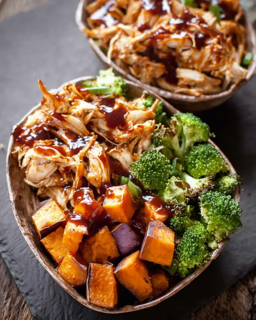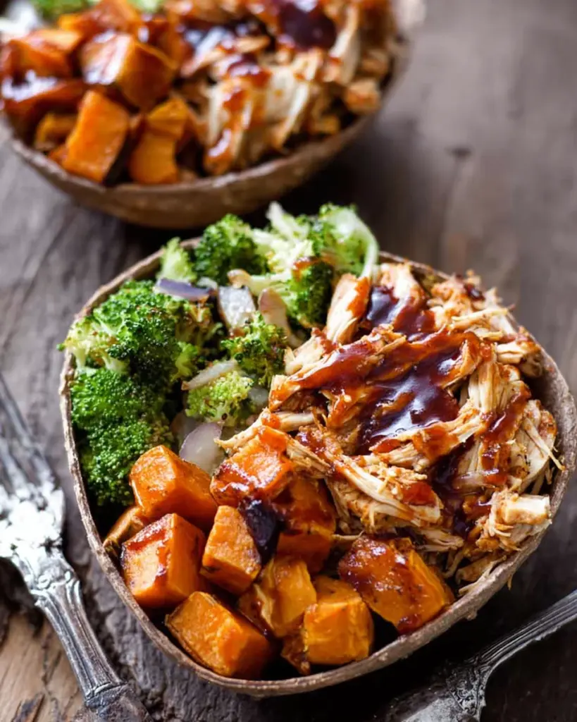 Introduction to BBQ Chicken & Roasted Sweet Potato Bowls Experience the perfect harmony of smoky, tangy BBQ chicken paired with the natural sweetness of roasted sweet potatoes in this vibrant bowl that’s both hearty and wholesome. Each bite brings together tender, juicy chicken glazed with rich barbecue sauce alongside caramelized sweet potato cubes, fresh veggies, and a bed of your favorite grains or greens. Whether you’re fueling a busy day or craving a comforting meal, this bowl delivers bold flavors and satisfying textures that make every meal feel like a celebration. Why You’ll Love This BBQ Chicken & Roasted Sweet Potato Bowls Bold & Balanced: The smoky BBQ chicken contrasts beautifully with the sweet, roasted potatoes for a crave-worthy combo. Nutritious & Filling: Packed with protein, fiber, and vitamins, it’s a well-rounded meal that keeps you energized. Easy to Prepare: Simple roasting and quick cooking make it perfect for busy weeknights or meal prepping. Customizable: Add your favorite toppings like avocado, fresh herbs, or a drizzle of dressing to personalize. Family-Friendly: A delicious, crowd-pleasing dish that appeals to all ages and tastes. Ingredients for BBQ Chicken & Roasted Sweet Potato Bowls Tender BBQ chicken meets caramelized roasted sweet potatoes in a bowl that’s pure comfort and flavor harmony. Here’s what you’ll need: Boneless, skinless chicken breasts: The star of the show! They grill beautifully and soak up that BBQ flavor. BBQ sauce: Choose your favorite brand. This adds that smoky, tangy goodness that makes the dish pop. Sweet potatoes: These provide a natural sweetness and a hearty texture. You can swap them for butternut squash or regular potatoes if you prefer. Olive oil: A must for roasting! It helps the sweet potatoes caramelize and adds healthy fats. Garlic powder: This brings a savory depth to the dish. Fresh garlic works too if you have it on hand. Paprika: Adds a hint of smokiness and a beautiful color to the sweet potatoes. Salt and pepper: Essential for seasoning. Don’t skip these; they enhance all the flavors. Cooked brown rice or quinoa: These serve as a nutritious base for your bowls, providing fiber and protein. Corn: Whether canned or frozen, corn adds a sweet crunch that complements the other ingredients. Avocado: Sliced for creaminess. It’s a great source of healthy fats and adds a fresh touch. Fresh cilantro (optional): A sprinkle of this herb brightens up the dish and adds a burst of flavor. Lime wedges: For a zesty finish! A squeeze of lime elevates the flavors and adds brightness. For exact measurements, check the bottom of the article where you can find everything listed for easy printing. Happy cooking! How to Make BBQ Chicken & Roasted Sweet Potato Bowls Creating these BBQ Chicken & Roasted Sweet Potato Bowls is a breeze. Follow these simple steps, and you’ll have a delicious meal ready in no time. Let’s get cooking! Step 1: Preheat the Oven First things first, preheat your oven to 425°F (220°C). This ensures your sweet potatoes roast perfectly. While the oven heats up, line a baking sheet with parchment paper. This makes cleanup a snap! Step 2: Prepare the Sweet Potatoes Next, grab those diced sweet potatoes. Toss them in a large bowl with olive oil, garlic powder, paprika, salt, and pepper. Make sure they’re evenly coated; this is where the flavor starts! Spread them out on the prepared baking sheet in a single layer. Step 3: Roast the Sweet Potatoes Now, it’s time to roast! Place the baking sheet in the preheated oven and roast the sweet potatoes for 25-30 minutes. Stir them halfway through to ensure they caramelize evenly. You want them tender and slightly golden—trust me, the aroma will be irresistible! Step 4: Grill the Chicken While the sweet potatoes are roasting, season your chicken breasts with salt and pepper. Heat a grill pan or outdoor grill over medium-high heat. Grill the chicken for about 6-7 minutes per side. Brush on that BBQ sauce during the last few minutes of cooking for a sticky, flavorful finish. Step 5: Slice the Chicken Once the chicken is cooked through, remove it from the grill and let it rest for 5 minutes. This step is crucial; it keeps the juices locked in. After resting, slice the chicken into strips. You’ll want to show off those grill marks! Step 6: Assemble the Bowls Finally, it’s assembly time! Divide the cooked brown rice or quinoa among four bowls. Top each bowl with the roasted sweet potatoes, grilled chicken, corn, and sliced avocado. Drizzle with extra BBQ sauce if you like, and don’t forget a sprinkle of fresh cilantro. Serve with lime wedges on the side for that zesty kick! Tips for Success Marinate the chicken in BBQ sauce for at least 30 minutes for extra flavor. Use a meat thermometer to ensure the chicken reaches 165°F (75°C) for perfect doneness. Don’t overcrowd the baking sheet; give the sweet potatoes space to caramelize. Feel free to mix in your favorite veggies for added nutrition and color. Store leftovers in airtight containers for easy meal prep throughout the week. Equipment Needed Grill pan or outdoor grill: Essential for that perfect char. A stovetop skillet works too! Baking sheet: A must for roasting sweet potatoes. Use any flat oven-safe dish if needed. Parchment paper: Helps with easy cleanup. Aluminum foil is a good alternative. Mixing bowl: For tossing sweet potatoes. Any large bowl will do. Meat thermometer: Ensures chicken is cooked perfectly. A simple knife can check doneness too. Variations Spicy BBQ Chicken: Add a dash of cayenne pepper or use a spicy BBQ sauce for a kick. Vegetarian Option: Substitute the chicken with grilled portobello mushrooms or chickpeas for a hearty plant-based meal. Sweet Potato Alternatives: Try using butternut squash or even cauliflower for a different flavor profile. Grain Swap: Replace brown rice or quinoa with farro or couscous for a unique texture. Extra Veggies: Toss in bell peppers, zucchini,