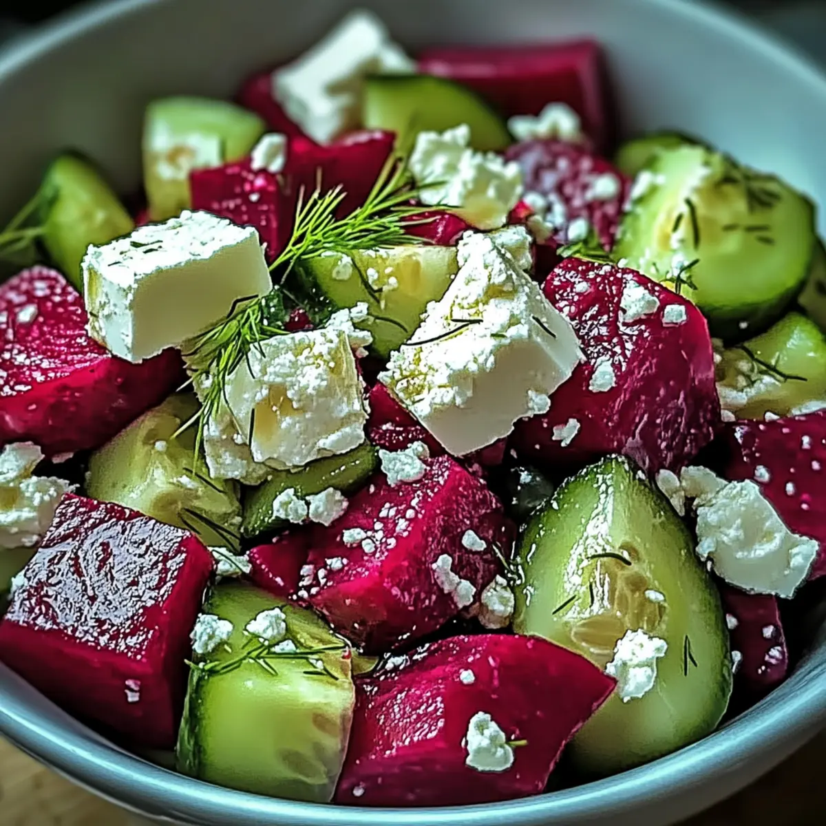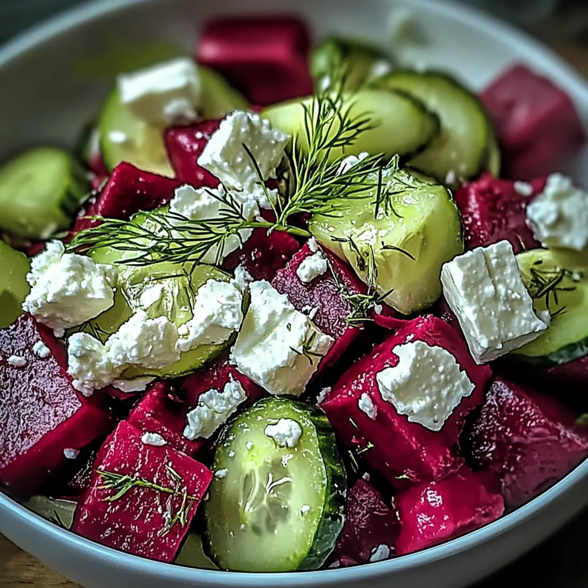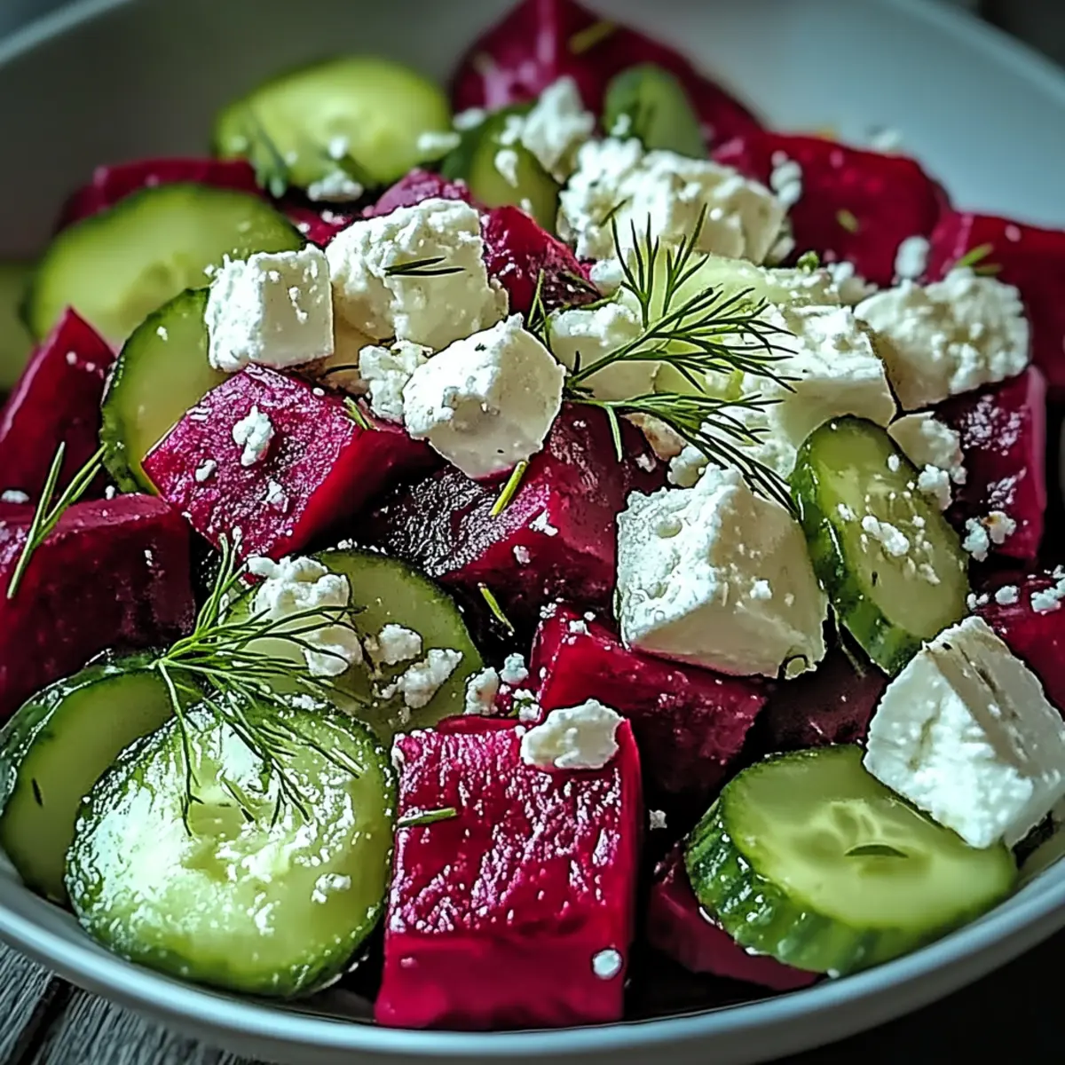 As I tossed the bright, vivid beets into the oven, their sweet, earthy aroma filled my kitchen, instantly lifting my spirits. This Vibrant Beet Salad with Feta and Cucumbers is not just about nutrition—it’s a feast for the eyes that’s remarkably easy to whip up, even on the busiest weeknights. What I love most about this salad is how its colorful layers invite conversation at any gathering. Plus, it’s fully customizable, perfect for gluten-free and vegetarian diets, with vegan options that ensure no guest feels left out. Imagine serving up a bowl of fresh, crunchy cucumbers, creamy feta, and tender roasted beets, all drizzled with a tangy dressing. This dish is bound to become a go-to staple in your recipe repertoire! So, are you ready to elevate your salad game? Why is This Beet Salad So Special? Vibrant colors: The blend of roasted beets and fresh cucumbers makes for a stunning presentation that brightens any table. Quick preparation: With minimal hands-on time, this salad is perfect for busy weeknights or spontaneous gatherings. Nutrient-packed: Loaded with vitamins, fiber, and healthy fats, it’s not just delicious but also a powerhouse of nutrition. Customizable: Whether you’re craving a vegan twist or want to add protein with chickpeas, this salad adapts to your needs. Crowd-pleasing: Its delightful combination of sweet, tangy, and creamy flavors ensures it’s a hit with everyone—perfect alongside Baked Mac and Cheese or served with Chicken Salad Light. Beet Salad with Feta and Cucumbers Ingredients In this section, you’ll find everything you need to create your delicious Beet Salad with Feta and Cucumbers. For the Salad Beets – Sweet and earthy, roast them until tender for optimal flavor. Cucumber – Fresh and crunchy; use seedless English or Persian varieties for the best texture. Feta Cheese – Creamy and tangy, crumbled feta adds richness—substitute with tofu for a vegan option. Fresh Dill – Aromatic and fresh, dill enhances the flavor; feel free to replace it with mint or parsley. For the Dressing Red Wine Vinegar or Lemon Juice – Provides a necessary tang; orange juice can be a sweeter alternative. Olive Oil – Adds richness to the dressing; you can also try a different oil if you like. Salt and Pepper – Essential for flavor enhancement—use freshly cracked pepper for extra zing. Honey or Maple Syrup (optional) – Introduces a touch of sweetness to balance the salad’s acidity. With these simple ingredients, you’re on your way to a colorful and delectable Beet Salad with Feta and Cucumbers that everyone will love! Step‑by‑Step Instructions for Beet Salad with Feta and Cucumbers Step 1: Roast the Beets Preheat your oven to 400°F (200°C). Wrap the beets individually in aluminum foil to retain their moisture and place them on a baking sheet. Roast for about 60 minutes, or until they are tender when pierced with a fork. Once roasted, allow the beets to cool, then peel off the skin and dice them into bite-sized pieces. Step 2: Prepare the Cucumbers While the beets are roasting, wash and slice the cucumbers into bite-sized pieces. Using seedless English or Persian cucumbers will provide the best crunch without the need for peeling. Set the sliced cucumbers aside in a bowl, ready to combine with the roasted beets later in your vibrant Beet Salad with Feta and Cucumbers. Step 3: Make the Dressing In a small bowl, whisk together the red wine vinegar or lemon juice, olive oil, salt, pepper, and honey or maple syrup if you choose to add a hint of sweetness to your dressing. This step takes around 2-3 minutes, and it’s essential to combine these ingredients thoroughly to ensure an even flavor throughout the salad. Step 4: Combine the Ingredients In a large mixing bowl, gently combine the diced beets, sliced cucumbers, crumbled feta cheese, and chopped fresh dill. Drizzle the prepared dressing over the salad, and toss everything gently to coat. A light hand is key here to avoid breaking up the feta too much while ensuring even distribution of flavors in your Beet Salad with Feta and Cucumbers. Step 5: Serve or Store If desired, garnish your salad with additional sprigs of dill for a fresh touch. Serve the beet salad immediately for optimal crispness or refrigerate for about 30 minutes to let the flavors meld. Just remember to keep the dressing separate until you’re ready to serve to maintain the crunch of the cucumbers! Beet Salad with Feta and Cucumbers Variations Feel free to explore these delightful twists that customize your salad experience and tantalize your taste buds. Vegan Option: Substitute feta with crumbled tofu or vegan cheese for a plant-based delight. It’s a creamy alternative that retains the essence of the salad. Protein Addition: Mix in rinsed chickpeas for a hearty boost of protein. These legumes add a satisfying texture while keeping the dish lightweight and fresh. Fruity Addition: Add pomegranate seeds or diced apples for extra sweetness. The fruity pops create wonderful flavor contrasts that elevate each bite and add a festive touch. Herb Swap: Experiment with different herbs, like basil or parsley. Each herb offers a unique flavor profile, allowing you to personalize this salad to your liking. Spicy Kick: Incorporate red pepper flakes or diced jalapeños for added heat. This twist brings a delightful warmth that pairs beautifully with the sweetness of the beets. Nutty Texture: Sprinkle with toasted walnuts or pecans for crunch. Not only do they enhance texture, but they also introduce a rich, nutty flavor perfect for accentuating the salad. For more inspiration, try serving this colorful salad alongside my signature Cookies and Cream Ice Cream for a sweet ending to your meal! Make Ahead Options Enjoy the ease of meal prep with this vibrant Beet Salad with Feta and Cucumbers! You can roast the beets and store them in the refrigerator for up to 3 days ahead of time, ensuring they’re tender and flavorful when you’re rea