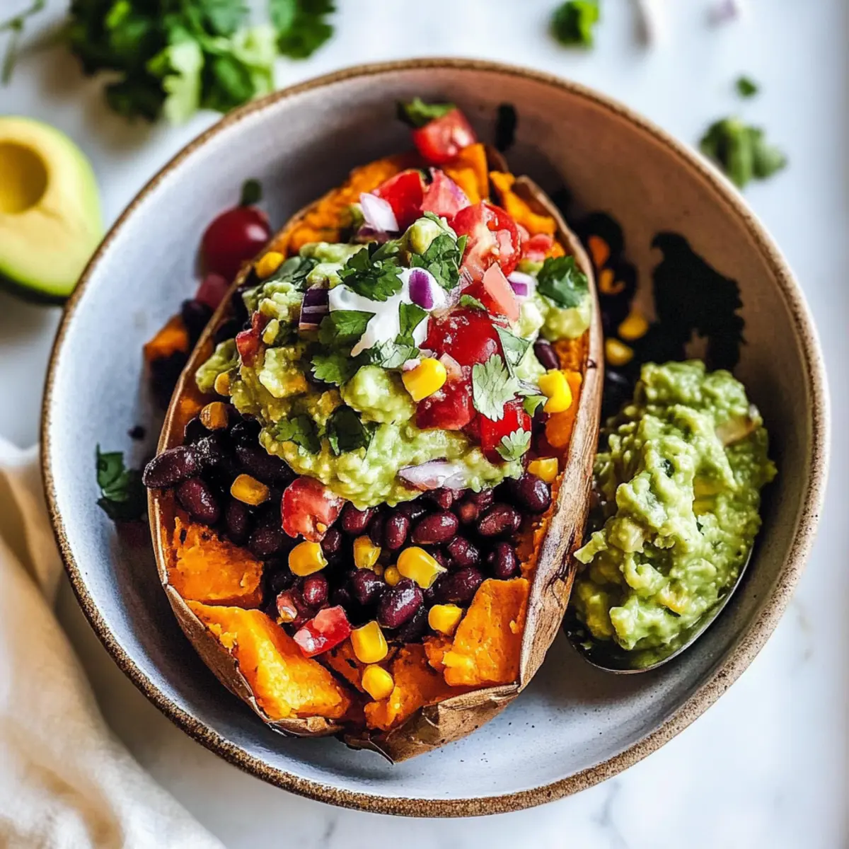 Poke holes in sweet potatoes before baking. Prepare guacamole just before serving to keep its vibrant color. Adjust cooking time based on sweet potato size. Rinse canned beans to reduce sodium. Season well for flavor.