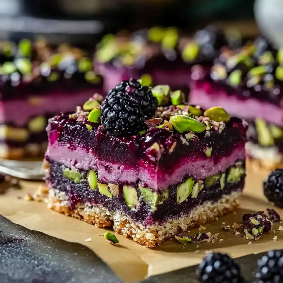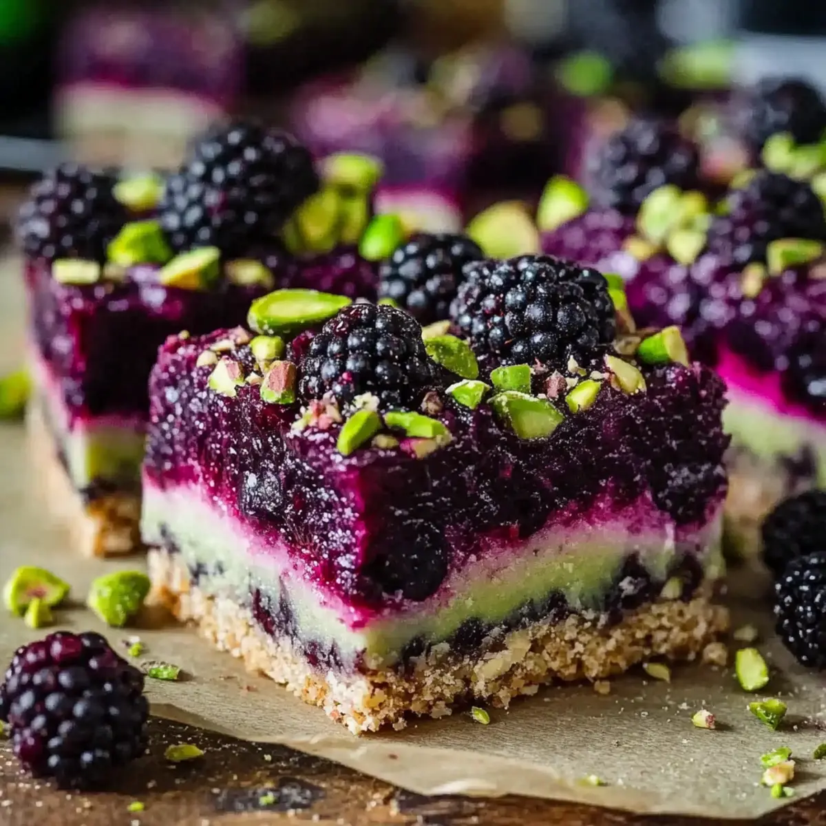 As I stood in my kitchen, the sweet-tart aroma of fresh blackberries began to mingle with the nutty scent of finely ground pistachios—a tempting invitation I couldn’t resist. These Blackberry Pistachio Dream Bars are a no-bake marvel that combines rich, creamy layers with a crunchy biscuit base, making them a delightful addition to any gathering. This simple yet stunning dessert not only impresses guests but also frees up your time for more important moments with loved ones. Whether you’re looking for a crowd-pleaser or a quick sweet fix, these bars are sure to satisfy. Who can say no to a treat that feels elegant yet is incredibly easy to whip up? Ready to discover how to create these little gems? Let’s dive in! Why are these bars so irresistible? Simplicity: This no-bake recipe is quick and requires minimal effort, making it an excellent choice for busy home cooks. Perfectly Balanced Flavors: The tartness of blackberries marries beautifully with the rich, creamy pistachios, creating a well-rounded taste that delights every palate. Versatile Variations: Don’t hesitate to customize! Substitute blackberries with raspberries for a zesty twist or try a dairy-free option to cater to different dietary needs. Crowd-Pleaser: These bars are a guaranteed hit at any gathering, showcasing elegance without the fuss. Pair them with a scoop of vanilla ice cream for an extra special treat! Make-Ahead Magic: Ideal for preparing a day in advance, allowing flavors to meld while giving you more time to enjoy with family. Ready to impress? Let’s get started on your Blackberry Pistachio Dream Bars! Blackberry Pistachio Dream Bars Ingredients For the Crust Digestive Biscuits – A sturdy base that adds crunch; substitute with graham crackers for a sweeter twist. Unsalted Butter – Binds the crust together; ensure it’s melted for smooth integration. For the Pistachio Filling Pistachios (finely ground) – Creates a creamy texture; grind gently to avoid over-processing. Powdered Sugar – Sweetens the pistachio layer while maintaining its silky consistency. Heavy Cream – Encourages binding; cold cream helps achieve a fluffy texture. Cream Cheese – Essential for the filling; allow to soften to avoid lumps. For the Blackberry Topping Granulated Sugar – Sweetens the topping; adjust to your taste preference. Fresh Blackberries – Adds tartness and vibrant color; be sure to rinse and dry thoroughly. Fresh Lemon Juice – Brightens the blackberry flavor and balances sweetness. Cornstarch – Thickens the topping; mixing with sugar first prevents clumps. For Garnishing Chopped Pistachios – Adds texture and a delightful crunch on top of the bars; sprinkle generously for visual appeal. These Blackberry Pistachio Dream Bars are a glorious blend of flavors just waiting to be enjoyed! Step‑by‑Step Instructions for Blackberry Pistachio Dream Bars Step 1: Prepare the Pan Start by lining an 8×8 inch square baking pan with parchment paper, allowing some overhang for easy removal later. This step not only helps in preventing sticking but also makes cutting the bars simpler. Set the lined pan aside, ready for the delicious layers of your Blackberry Pistachio Dream Bars. Step 2: Crust Preparation In a mixing bowl, crush the digestive biscuits into fine crumbs using a food processor or a rolling pin. Transfer the crumbs to a bowl and mix in the melted unsalted butter until well combined. Press the crumb mixture firmly into the bottom of the prepared pan, creating an even layer. Aim for a dense, compact crust that will hold up under the creamy filling. Step 3: Pistachio Layer In a clean bowl, blend finely ground pistachios with powdered sugar and heavy cream using an electric mixer on medium speed until smooth and creamy. This should take about 2-3 minutes, and the mixture should hold its shape without being too dry. Spread the pistachio mixture evenly over the crust layer, smoothing it down with a spatula, and chill in the refrigerator for at least 20 minutes to set. Step 4: Cream Cheese Layer In another mixing bowl, beat softened cream cheese and additional powdered sugar until fluffy, adding a splash of vanilla extract for flavor enhancement. This process should take about 3-5 minutes; the mixture should be light and airy. Gently spread the cream cheese filling over the chilled pistachio layer, ensuring an even distribution. Chill again for 15-20 minutes to allow the layers to firm up nicely. Step 5: Blackberry Topping In a small saucepan over medium heat, combine fresh blackberries, granulated sugar, fresh lemon juice, and cornstarch, stirring gently. Cook for about 5-7 minutes until the mixture becomes thick and jam-like, bubbling slightly. Pour the warm blackberry topping over the cream cheese layer, smoothing it to cover adequately. This vibrant layer adds a delightful tartness that complements the creamy layers beautifully. Step 6: Chill and Serve Cover the pan with plastic wrap and refrigerate the assembled Blackberry Pistachio Dream Bars for at least 4 hours, or ideally overnight. This allows the flavors to meld and the bars to set completely. When ready to serve, lift the bars out using the parchment overhang, cut into squares, and garnish with chopped pistachios for an extra crunch before enjoying with friends and family. What to Serve with Blackberry Pistachio Dream Bars Bring your dessert game to a whole new level by complementing these delightful bars with perfectly paired accompaniments. Vanilla Bean Ice Cream: The creamy, smooth texture of vanilla bean ice cream contrasts beautifully with the crunchy pistachio notes, enhancing the overall indulgence. This classic pairing elevates your dessert experience to a whole new level, offering a delightful temperature and texture juxtaposition. Fresh Mint Leaves: These fragrant leaves add a refreshing burst of flavor that brightens each bite, enhancing the tartness of the blackberries. Simply garnish your bars with a sprig of mint for an elegant 