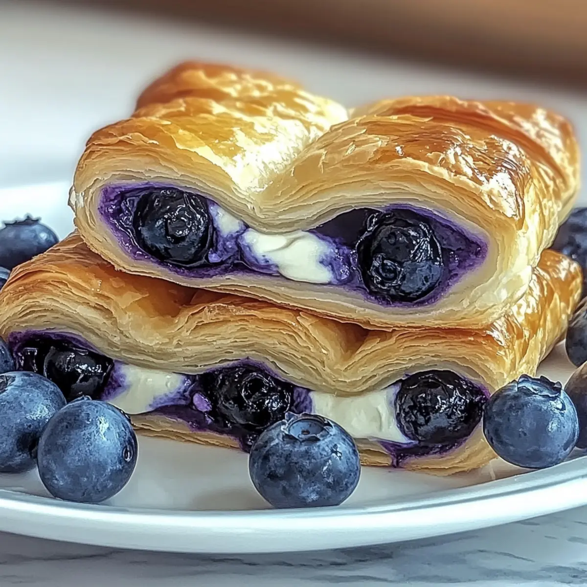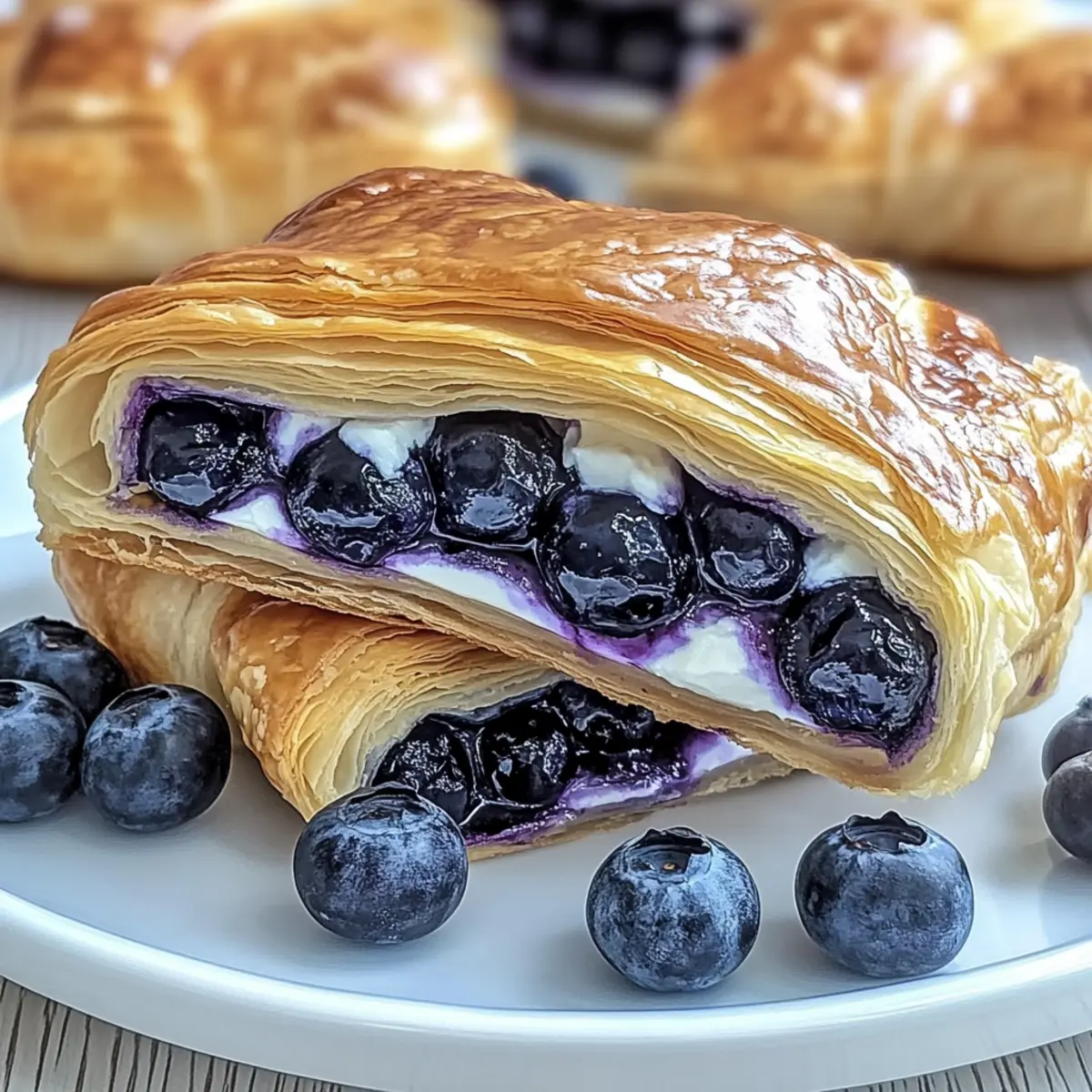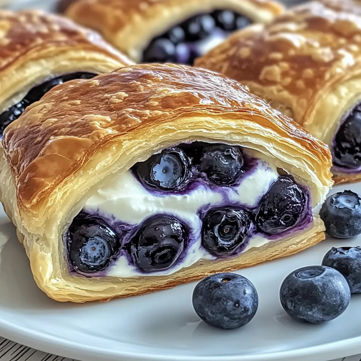 As I pulled my freshly baked Blueberry Cream Cheese Puff Pastry from the oven, the heavenly aroma swept through the kitchen, instantly transforming my home into a cozy café. This delightful pastry combines smooth, sweetened cream cheese with juicy blueberries, all wrapped in a flaky, golden crust that’s nothing short of magic. What I love most is how quick and easy it is to whip these up for breakfast, brunch, or even dessert. With minimal fuss and substantial flavor, they become a go-to whenever I want to impress friends or simply enjoy a special treat at home. Are you ready to create a moment of pure bliss in your kitchen? Let’s dive into the details of this irresistible recipe! Why is this pastry so irresistible? Delightful aroma: As it bakes, the warm scent of buttery pastry and sweet blueberries fills your kitchen, enticing everyone around. Quick and easy: With simple ingredients and a straightforward process, you can whip these up in no time, making it ideal for a spontaneous breakfast or brunch treat. Versatile indulgence: Perfect for any occasion, whether served warm with coffee on a lazy Sunday or as an impressive dessert to wow your guests. Creamy, fruity goodness: The combination of smooth cream cheese and juicy blueberries creates a luscious filling that’s simply hard to resist. Crowd-pleaser: Everyone loves a pastry! This Blueberry Cream Cheese Puff Pastry is bound to receive rave reviews from family and friends, just like my Baked Mac Cheese and Cheesecake Ice Cream. Blueberry Cream Cheese Puff Pastry Ingredients For the Pastry Puff Pastry – Use a high-quality, butter-based puff pastry for that ultimate flaky texture. For the Filling Cream Cheese (8 oz) – Soften the cream cheese to make blending easy and achieve a smooth consistency. Granulated Sugar (1/4 cup) – Add sweetness to balance the tanginess; feel free to adjust for your taste. Vanilla Extract (1 tsp) – Enhances the overall flavor profile; opt for pure vanilla for the best results. Fresh Blueberries (1 cup) – Load in those juicy bursts of flavor; if using frozen, drain excess moisture beforehand. Embrace the joy of baking with this lovely Blueberry Cream Cheese Puff Pastry, perfect for any occasion! Step‑by‑Step Instructions for Blueberry Cream Cheese Puff Pastry Step 1: Preheat Oven Preheat your oven to 400°F (200°C) and prepare a baking sheet by lining it with parchment paper. This will ensure that your pastries bake evenly and don’t stick. While the oven heats up, gather all your ingredients and equipment so you’re ready to create your delicious Blueberry Cream Cheese Puff Pastry. Step 2: Prepare Filling In a mixing bowl, combine softened cream cheese, granulated sugar, and vanilla extract, and stir until smooth and creamy. Gently fold in the fresh blueberries, ensuring they stay mostly intact for bursts of flavor in every bite. Avoid overmixing, as you want to keep the filling slightly chunky for added texture. Step 3: Roll Out Pastry On a lightly floured surface, roll out the thawed puff pastry sheets to about 1/8 inch thick. Using a sharp knife or a pastry cutter, cut the dough into 4-inch squares. Keep the cut squares separate to make assembly easier. You should be able to create several squares from your puff pastry, perfect for encasing the blueberry filling. Step 4: Assemble Pastries Place a generous spoonful of the cream cheese and blueberry filling in the center of each pastry square. Carefully fold the corners of each square towards the center, creating a sealed pocket. Press the edges firmly to seal, making sure no filling escapes during baking, and give them a little pinch for a decorative touch. Step 5: Bake Transfer the assembled Blueberry Cream Cheese Puff Pastries to the prepared baking sheet, ensuring they are spaced apart for even baking. Place them in the preheated oven and bake for 15-20 minutes, or until they are golden brown and puffed up beautifully. Keep an eye on them as they bake to achieve that perfect golden color. Step 6: Cool and Serve Once your pastries are out of the oven, let them cool on the baking sheet for about 5 minutes. This will allow the filling to settle slightly while still being warm and delicious. Serve these delightful Blueberry Cream Cheese Puff Pastries warm, and watch as everyone enjoys the creamy filling and flaky crust! How to Store and Freeze Blueberry Cream Cheese Puff Pastry Room Temperature: Store cooled pastries in an airtight container at room temperature for up to 2 days to maintain their delightful flakiness. Fridge: If you prefer a longer shelf life, refrigerate the pastries in an airtight container for up to 1 week. Reheat in the oven for a few minutes to revive their crispy texture. Freezer: For longer storage, wrap unbaked pastries tightly in plastic wrap and freeze for up to 3 months. Bake from frozen, adjusting the baking time for best results. Reheating: To enjoy leftovers, reheat the pastries in a preheated oven at 350°F (175°C) for about 10 minutes until warmed through while preserving that flaky exterior. Expert Tips for Blueberry Cream Cheese Puff Pastry Filling Consistency: Avoid overmixing the cream cheese mixture; it should remain chunky to enhance the filling’s texture and prevent it from becoming runny. Choose Quality Pastry: Invest in high-quality, butter-based puff pastry for the flakiest and most flavorful results. Cheaper varieties may not puff up as nicely. Egg Wash Advantage: Brush the tops of your pastries with an egg wash (whisked egg with water) before baking to achieve a beautiful golden color and glossy finish. Heat the Oven: Always preheat your oven fully. A hot oven is crucial for the pastries to rise correctly and achieve that signature flaky texture. Storage Tips: To maintain freshness, let your Blueberry Cream Cheese Puff Pastry cool completely before storing in an airtight container. Enjoy them within 2 days, or freeze unbaked pastries for later use. Blueberry Cream Cheese Puff Pastry Variat