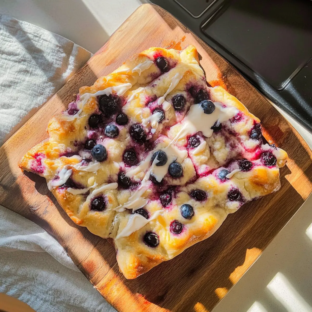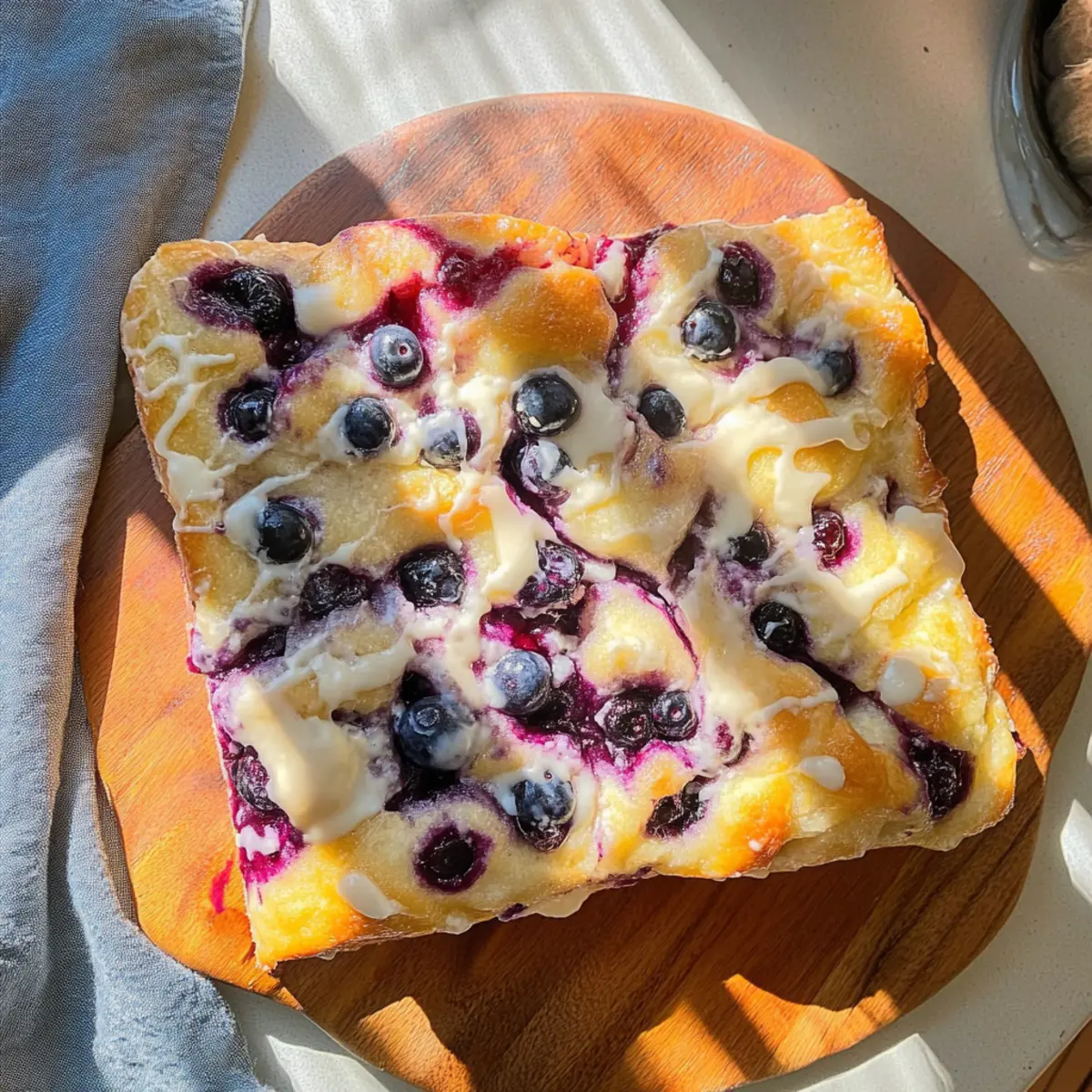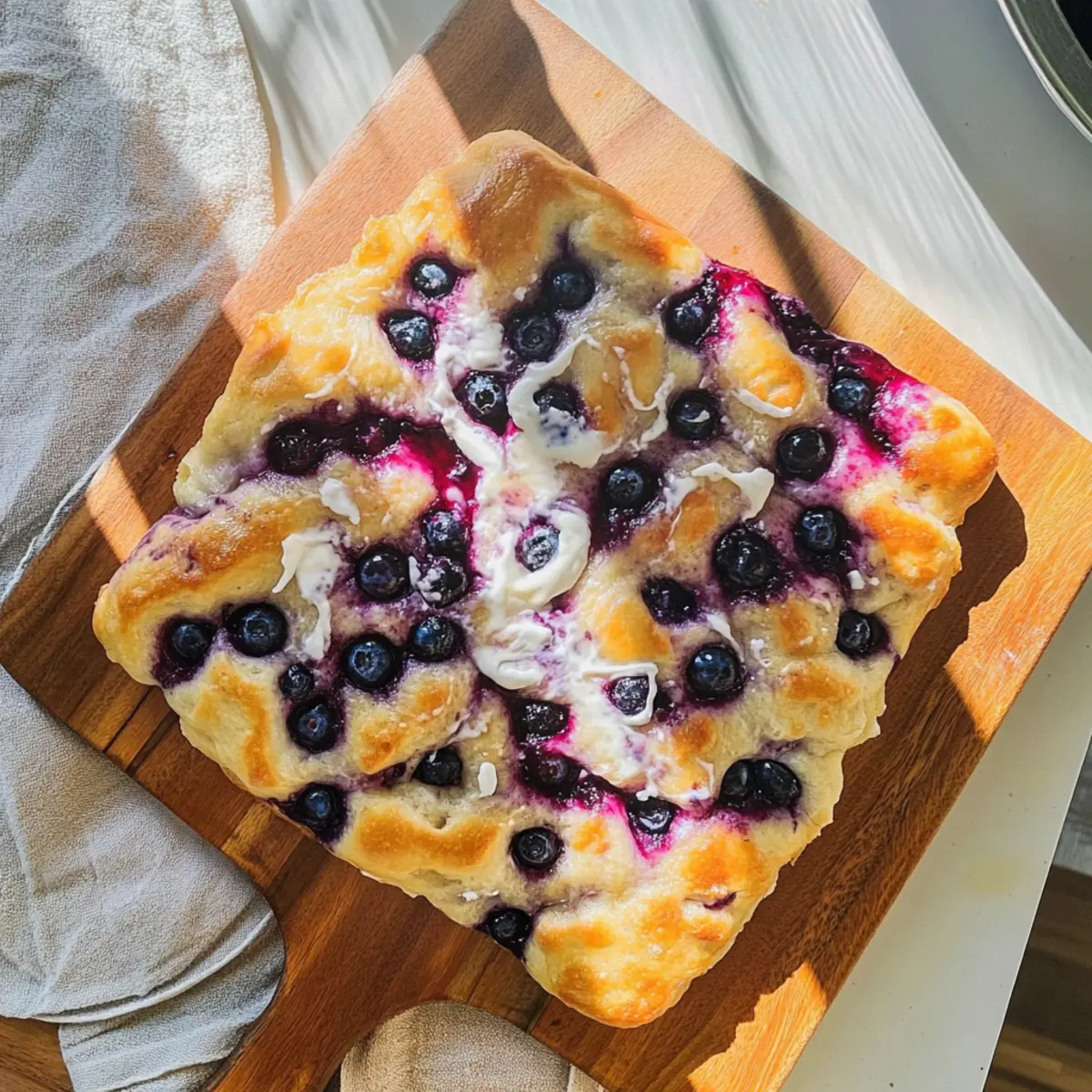 As the aroma of freshly baked bread wafts through my kitchen, memories of sunny brunches come flooding back. Today, I’m thrilled to share my recipe for Blueberry Focaccia Bread, a delightful twist on the classic Italian favorite that’s perfect for any occasion. This easy recipe combines fluffy dough with juicy blueberries, creating a sweet bread that’s not only a showstopper but also a beginner-friendly project that can be made in just one bowl. With minimal rising time and a luscious cream cheese drizzle to top it off, this Blueberry Focaccia Bread is ideal for those looking to sweeten their day without spending hours in the kitchen. Whether you serve it for breakfast, a picnic, or dessert, this delightful treat is sure to impress your friends and family. Curious about how to create this heavenly loaf? Let’s dive in! Why is Blueberry Focaccia Bread so amazing? Beginner-Friendly: This recipe is designed for effortless baking, even if you’re just starting your culinary journey. Fresh & Flavorful: Each bite bursts with juicy blueberries, bringing a delightful sweetness that rivals any pastry. Versatile Delight: Perfect for brunch, dessert, or a cozy snack, this focaccia fits seamlessly into any meal of the day. Quick to Make: Ready in under 1.5 hours, you won’t have to wait long to indulge in this irresistible bread. Cream Cheese Drizzle: The luscious drizzle adds an extra layer of richness, taking your taste experience to an entirely new level. If you love quick and delicious treats, you’ll adore pairing this with a cup of coffee or enjoying it alongside a scoop of ice cream, just like in my Homemade Blueberry Muffins recipe. And if you’re also in the mood for something classic, try making Banana Bread Old for another easy sweet bread! Blueberry Focaccia Bread Ingredients • Perfect for sweet bread lovers! For the Dough Warm Water – Activates the yeast; use tepid water for best results. Olive Oil – Adds moisture and flavor; substitute with melted butter if desired. Active Dry Yeast – Leavens the dough; ensure it’s fresh for the best rise. All-Purpose Flour – Provides structure; whole wheat or gluten-free blends may alter texture. Blueberries – Adds sweetness and moisture; both fresh and frozen can be used without thawing. For the Cream Cheese Drizzle Powdered Sugar – Sweetens the frosting; granulated sugar can be used, but the texture will differ. Butter – Enriches the frosting; use vegan butter for a dairy-free version. Cream Cheese – Forms the base of the frosting; vegan cream cheese is a good alternative. For the Blueberry Reduction Agave – Sweetens the blueberry syrup; honey or maple syrup can also be used. Enjoy crafting this delightful Blueberry Focaccia Bread that takes your traditional baking to another level! Step‑by‑Step Instructions for Blueberry Focaccia Bread Step 1: Prepare the Dough In a mixing bowl, combine 1 cup of warm water, 2 tablespoons of olive oil, and 2 teaspoons of active dry yeast. Stir gently until well mixed, then allow the mixture to sit for 5 minutes until it becomes foamy, indicating that the yeast is active. This key step ensures your Blueberry Focaccia Bread rises beautifully. Step 2: Mix the Ingredients Add 3 cups of all-purpose flour to the yeast mixture, mixing until a thick dough forms. Use a wooden spoon or your hands to combine the ingredients fully. Once incorporated, cover the bowl with a clean cloth, and let the dough rise in a warm place for about 1 hour, until it has doubled in size and appears fluffy and airy. Step 3: Shape the Focaccia After the dough has risen, gently transfer it to a greased 9×9-inch baking pan. Using your fingers, spread the dough out evenly in the pan, taking care not to deflate it too much. Cover the pan with a cloth again, allowing the dough to rise for an additional 15 to 30 minutes, during which it should puff up slightly. Step 4: Add Blueberries With the dough ready, press your fingers into it to create divots across the surface. Carefully fold in a cup of fresh or frozen blueberries, ensuring an even distribution without breaking them. This step infuses your Blueberry Focaccia Bread with pockets of juicy flavor, setting the stage for a delightful texture. Step 5: Bake the Focaccia Preheat your oven to 350°F (175°C). Once heated, place the pan in the oven and bake for about 30 minutes, or until the top is golden brown and the edges are lightly crisp. Keep an eye on the bread, as it will fill your kitchen with a heavenly aroma, signaling it’s almost ready to enjoy! Step 6: Make the Cream Cheese Drizzle While the focaccia bakes, prepare the cream cheese drizzle by mixing 4 ounces of cream cheese, 1/4 cup of powdered sugar, and 2 tablespoons of softened butter in a separate bowl. Beat the mixture with a hand mixer until it is smooth and creamy, forming a rich topping that will enhance your Blueberry Focaccia Bread beautifully. Step 7: Prepare the Blueberry Reduction To create a blueberry reduction, simmer 1 cup of blueberries with 1/4 cup of agave syrup in a small saucepan over medium heat. Cook for about 5 minutes, gently mashing the berries as they soften. Strain the mixture through a fine sieve to extract the juice, discarding the solids. Let this vibrant syrup cool while you finish your focaccia. Step 8: Drizzle and Serve Once the Blueberry Focaccia Bread is baked, remove it from the oven and allow it to cool slightly in the pan. Drizzle the cream cheese frosting generously over the warm bread, followed by a splash of blueberry reduction for an extra burst of sweetness. Cut into squares and serve warm to savor the delightful flavors packed into this charming bread! How to Store and Freeze Blueberry Focaccia Bread Room Temperature: Store leftovers in an airtight container at room temperature for up to 1 day to maintain freshness. Fridge: If you need to keep it longer, you can refrigerate it for up to 3 days. Wrap it well to prevent it from drying out. Freezer: For longer s