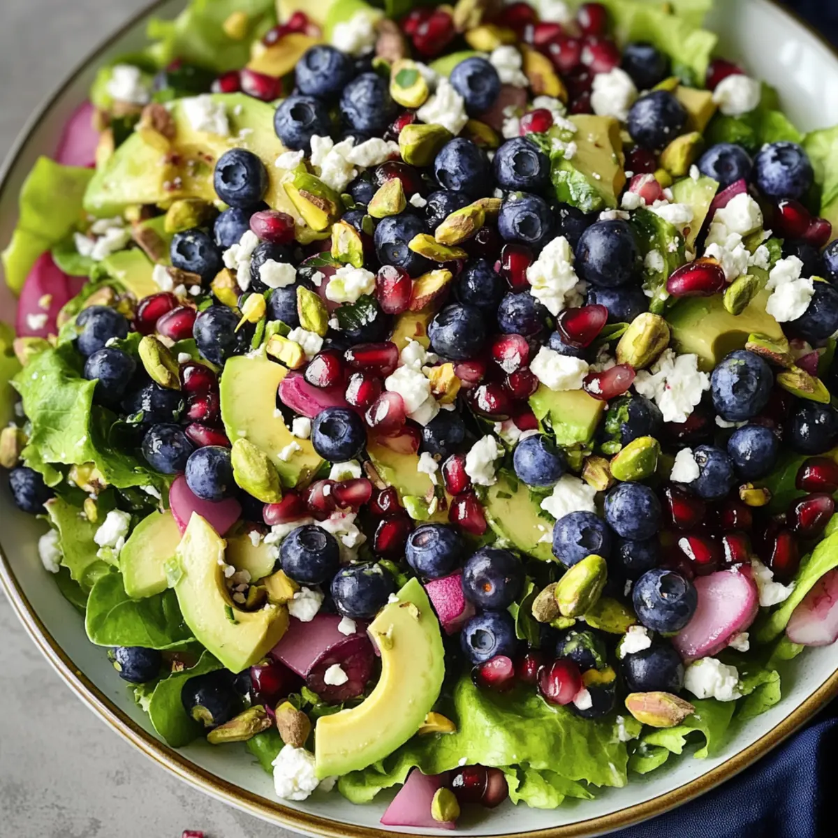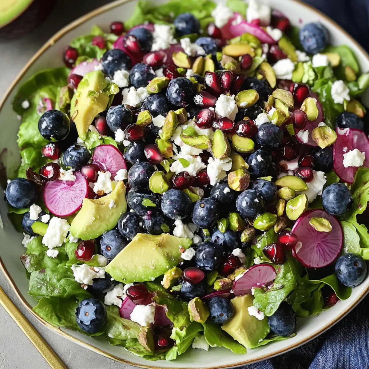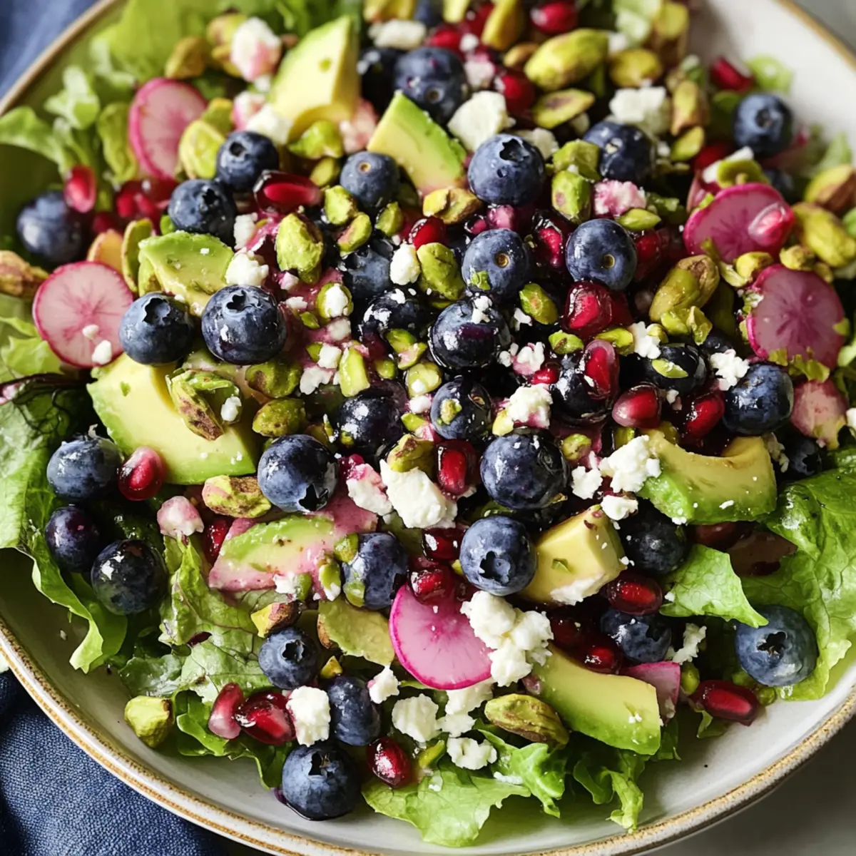 As the sun shines brighter and nature fills with vibrant colors, my kitchen beckons to embrace the fresh and invigorating flavors of spring. This Blueberry Pistachio Spring Salad effortlessly captures the essence of the season, combining juicy blueberries, crunchy pistachios, and creamy avocado, all brought together by a sweet-tart pomegranate dressing. What I love most about this salad is how quick it is to prepare, making it perfect for busy weekdays or delightful spring gatherings. Plus, it’s not just visually stunning; it packs a nutritious punch to fuel your day. Whether you’re looking for a lively lunch or a zesty side dish, this salad will brighten your table. Are you ready to toss together this spring medley and savor the taste of the season? Why is this salad a must-try? Fresh Ingredients: This Blueberry Pistachio Spring Salad is a celebration of seasonal produce, showcasing the vibrant flavors of spring. Quick & Easy: With minimal prep time, it’s perfect for busy days when you crave something healthy without the fuss. Nutrient-Rich: Packed with antioxidants from blueberries and healthy fats from avocado, this salad supports your wellness goals deliciously. Versatile Options: You can easily customize it to suit your tastes—try it with grilled chicken or chickpeas for added protein, or explore variations with different greens. Stunning Presentation: The colorful ingredients provide a visual feast that’s sure to impress guests at your next gathering, making it perfect for spring brunches or picnics. Crowd-Pleasing Flavor: The sweet-tart pomegranate dressing brings all flavors together, creating a refreshing and satisfying combination that complements any meal. Blueberry Pistachio Spring Salad Ingredients For the Salad Spring mix salad greens – A nutritious base that offers mild flavor and a satisfying crunch. Butter lettuce – Adds a tender texture and gentle sweetness to the mix. Blueberries – The star of the salad, delivering juicy sweetness and a pop of color. Pistachios – Their crunchy, nutty flavor enhances the texture; toasting them brings out even more richness. Pomegranate arils – These little gems provide a refreshing, sweet-tart burst of flavor. Avocado – Creamy and rich in healthy fats, it adds a wonderful smoothness. Watermelon radish – Offers a peppery bite and vibrant color for visual appeal. Red onion – Introduces a sharp, savory note that balances out the sweetness of the fruits. Feta cheese – A sprinkle of salty, tangy feta complements the salad beautifully. For the Dressing Creamy pomegranate dressing – A delightful mixture that ties all the flavors together with its sweet-tart profile. Freshly ground black pepper – Adds warmth and enhances the overall flavor profile of the Blueberry Pistachio Spring Salad. Step‑by‑Step Instructions for Blueberry Pistachio Spring Salad Step 1: Prepare the Greens In a large bowl, combine a generous handful of spring mix salad greens and butter lettuce. Rinse the greens under cold water until clean, then gently pat them dry with a kitchen towel or use a salad spinner. This process ensures your salad remains crispy and fresh, ready to complement the vibrant ingredients that will follow. Step 2: Add the Fruit and Nuts Next, toss in a cup of fresh blueberries and half a cup of roughly chopped pistachios, preferably toasted to enhance their nutty flavor. The blue of your blueberries will contrast beautifully against the greens, while the pistachios will introduce a delightful crunch and rich texture. Aim for an even distribution throughout the salad for the best taste experience. Step 3: Incorporate Additional Veggies Now, add in half a cup of pomegranate arils, one diced avocado, and a thinly sliced watermelon radish. The pomegranate arils will burst with flavor in every bite, while the avocado brings creaminess. The radish, with its peppery bite, adds both flavor and a pop of color. Gently fold these ingredients into the salad to maintain the structure of the avocado. Step 4: Add Red Onion and Feta Sprinkle in a quarter cup of thinly sliced red onion and a quarter cup of crumbled feta cheese for that perfect salty tang. The onion will provide sharpness, balancing the sweetness from the fruit, while the feta enhances the salad’s overall flavor profile. Mix lightly to ensure the feta doesn’t crumble excessively and remains a feature piece. Step 5: Prepare the Dressing In a small jar or bowl, whisk together the creamy pomegranate dressing until smooth. This usually takes about 1-2 minutes. Make sure to blend well so that all ingredients meld harmoniously. You’ll want the dressing to be ready to coat your Blueberry Pistachio Spring Salad beautifully when you’re ready to serve. Step 6: Dress the Salad Just before serving, generously drizzle the dressing over the salad, using as much or as little as you prefer. Toss the salad gently to ensure everything is coated evenly, allowing the flavors to marry without bruising the delicate greens. Keep an eye on the appearance, aiming for a glossy finish that invites everyone to dig in. Step 7: Serve Immediately Finally, serve your Blueberry Pistachio Spring Salad right away while the greens are crisp and fresh. Consider presenting it in an attractive serving bowl to showcase the vibrant colors and textures. This salad is not only a feast for the eyes but also a satisfying and nutritious dish that’s perfect for any spring occasion. What to Serve with Blueberry Pistachio Spring Salad Elevate your meal with delightful additions that complement the vibrant flavors of spring. Grilled Chicken: Tender and juicy, grilled chicken adds a satisfying protein boost that pairs perfectly with the salad’s freshness. Quinoa Pilaf: Light and nutty, this whole grain provides a wholesome side dish that harmonizes beautifully with the juicy blueberries and creamy avocado. Fresh Fruit Platter: A colorful assortment of seasonal fruits enhances the fruity notes of the salad, 