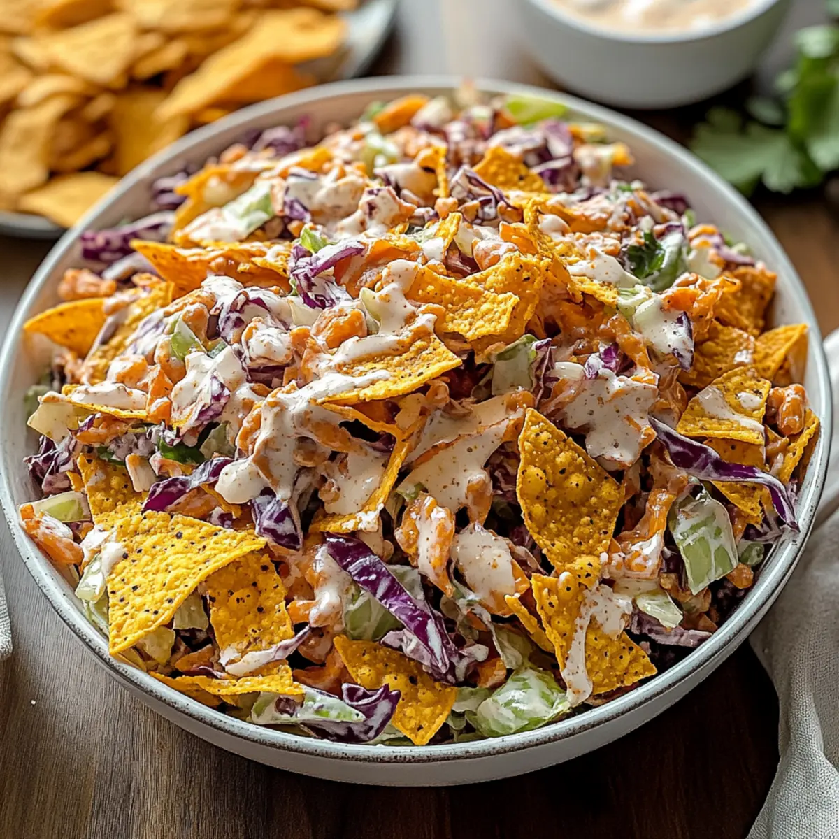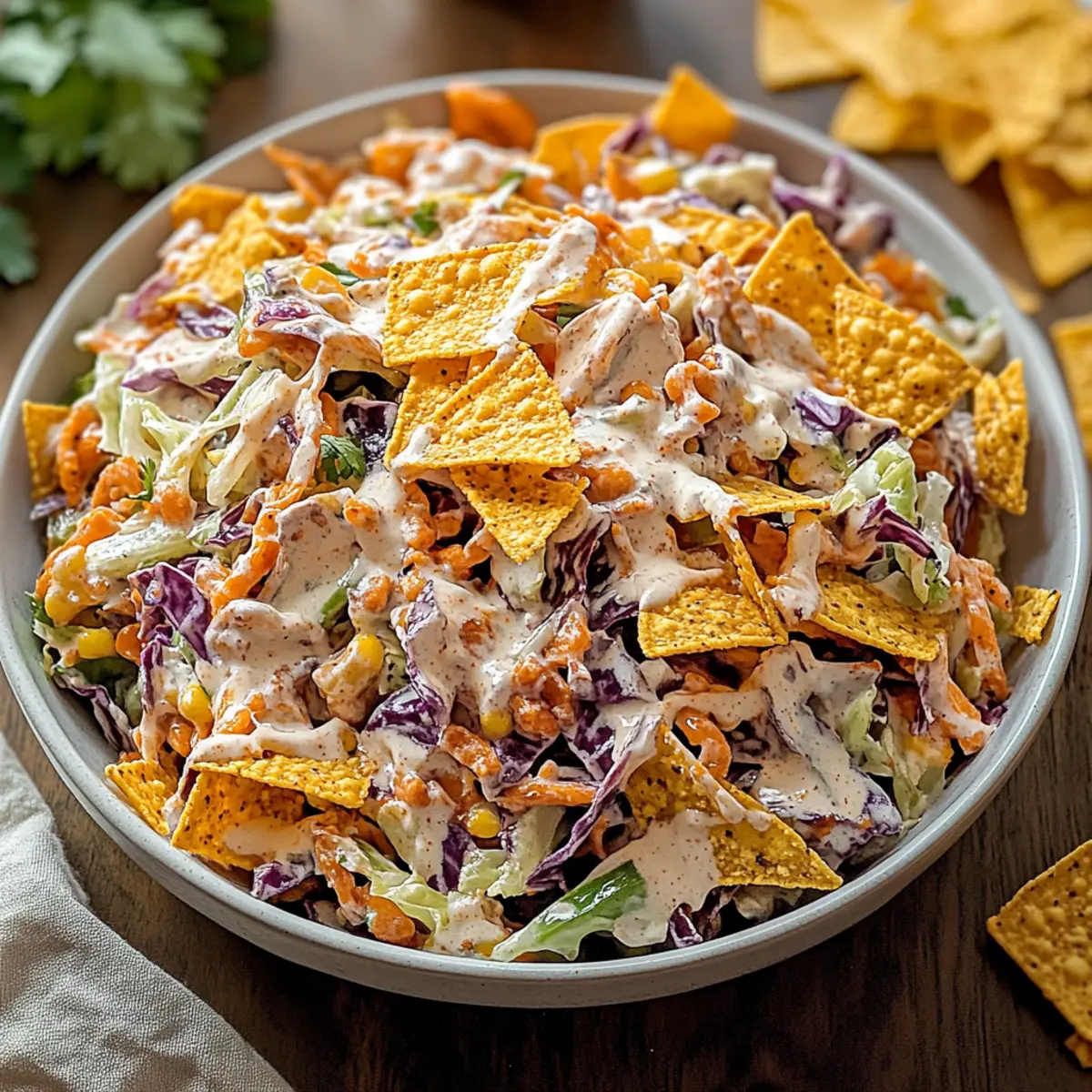 As I tossed the vibrant greens together, a nostalgic childhood memory washed over me—sipping sweet iced tea at summer picnics, the sun warming my back. This inspired me to create a recipe that embodies that carefree essence: the Bold Frito Cowboy Cabbage Salad. Bursting with fresh veggies and a creamy chipotle dressing, this Tex-Mex delight is not just a feast for the eyes, but also a quick-prep dish that’ll have everyone asking for seconds. Perfect for potlucks or as a standout side at BBQs, this salad offers a delightful crunch from chili cheese Fritos, making it both fun and satisfying. Are you ready to dive into a bowl of this robust flavor adventure? Why is Frito Cowboy Cabbage Salad a Must-Try? Bold flavors come together with fresh ingredients—this salad is a delightful explosion of taste! Quick and easy to assemble, it’s perfect for busy weeknights or last-minute potlucks. Veggie-packed goodness ensures you won’t miss the meat; it’s hearty and satisfying! Crunchy texture from the Chili Cheese Fritos elevates every bite, creating a fun experience. For a light lunch, pair it with a refreshing Pesto Pasta Salad or enjoy with grilled favorites like Cowboy Butter Chicken. Your family and friends will love this vibrant twist on a classic salad! Bold Frito Cowboy Cabbage Salad Ingredients For the Salad Coleslaw Mix – Provides a crunchy base with fresh cabbage; saves time on prep. Alternative: Use finely shredded fresh cabbage. Black Beans – Adds protein and heartiness; can substitute with kidney beans for variety. Corn – Contributes sweetness and texture; frozen or canned corn works well. Red Bell Pepper – Offers sweetness and color; can swap with yellow or orange bell peppers. Jalapeño – Adds spice; reduce or omit for a milder salad. Green Onions – Provide a fresh, mild onion flavor; chives can be used instead. Cilantro – Adds a fresh herbal note; optional for those who don’t enjoy its flavor. Chili Cheese Fritos – Gives a unique crunch and savory finish; substitute with other crunchy snacks like tortilla strips or Doritos. For the Chipotle Dressing Sour Cream – Base for creaminess; can use Greek yogurt as a healthier alternative. Mayonnaise – Adds richness; opt for light mayo or a vegan version if desired. Lime Juice – Brightens flavor and balances richness; important for taste, don’t skip it. Chipotle Sauce – Provides smokiness and spice; adjust quantity to taste, or substitute with smoked paprika for less heat. Step‑by‑Step Instructions for Bold Frito Cowboy Cabbage Salad Step 1: Combine the Salad Ingredients In a large mixing bowl, add 4 cups of coleslaw mix, 1 can of drained black beans, 1 cup of corn (frozen or canned), 1 diced red bell pepper, 1 finely chopped jalapeño (if desired), 4 sliced green onions, and fresh cilantro to taste. Gently mix all these vibrant ingredients together using a wooden spoon until evenly incorporated, creating a colorful base for your Bold Frito Cowboy Cabbage Salad. Step 2: Prepare the Chipotle Dressing In a separate medium bowl, whisk together ½ cup of sour cream, ¼ cup of mayonnaise, the juice of 1 lime, and 2 tablespoons of chipotle sauce until smooth and creamy. This flavorful dressing complements the fresh salad ingredients perfectly. Taste the mixture and adjust the seasoning, adding more lime juice or chipotle sauce for extra zing if desired. Step 3: Mix the Salad and Dressing Pour the creamy chipotle dressing over the salad mixture, and using a gentle folding motion, toss everything together until all the ingredients are well coated. Make sure you don’t overmix, as you want to preserve the crunchiness of the vegetables—this harmony creates the delightful crunch and flavor explosion that is the Bold Frito Cowboy Cabbage Salad. Step 4: Add the Fritos Just before serving, sprinkle a generous handful of Chili Cheese Fritos over the top of the salad. This final touch adds a salty crunch that elevates the entire dish. Toss lightly to combine, or keep them on top for a more beautiful presentation and maximum crunch when serving. Step 5: Serve and Enjoy Spoon the Bold Frito Cowboy Cabbage Salad into a large serving bowl or individual plates. It’s best enjoyed fresh, so serve it immediately and let your guests dive into this delightful Tex-Mex-inspired salad. The combination of creamy dressing and crunchy Fritos will have everyone coming back for more! How to Store and Freeze Bold Frito Cowboy Cabbage Salad Airtight Container: Keep leftovers in an airtight container in the fridge for up to 2 days to maintain freshness and flavor. Be sure to store Fritos separately to keep their crunch. Freezer: This salad is best enjoyed fresh, but if necessary, you can freeze the salad without the dressing for up to 1 month. Thaw in the fridge before serving. Reheating: If you’ve added the dressing, this salad is not meant to be reheated. Enjoy it cold for the best experience. Make-Ahead Tip: Prepare the salad ingredients a day in advance and store in the fridge; combine with the chipotle dressing just before serving for the best flavor and texture! Expert Tips for Bold Frito Cowboy Cabbage Salad Keep It Crunchy: Add Fritos at the last moment to retain their crispness; this ensures each bite remains satisfying and festive. Season to Taste: Don’t skip the taste test! Adjust lime juice and chipotle sauce in the dressing to find your perfect flavor balance. Minimize Moisture: Rinse and drain black beans and corn thoroughly to prevent excess liquid, keeping the salad fresh and not soggy. Meal Prep Smart: For easy assembly, store the salad and dressing separately in the fridge; combine just before serving for maximum freshness. Customize Ingredients: Feel free to swap vegetables or adjust spice levels! The Bold Frito Cowboy Cabbage Salad is versatile and can cater to everyone’s palate. What to Serve with Bold Frito Cowboy Cabbage Salad The vibrant flavors and crunchy textures of this fresh salad can create an unf