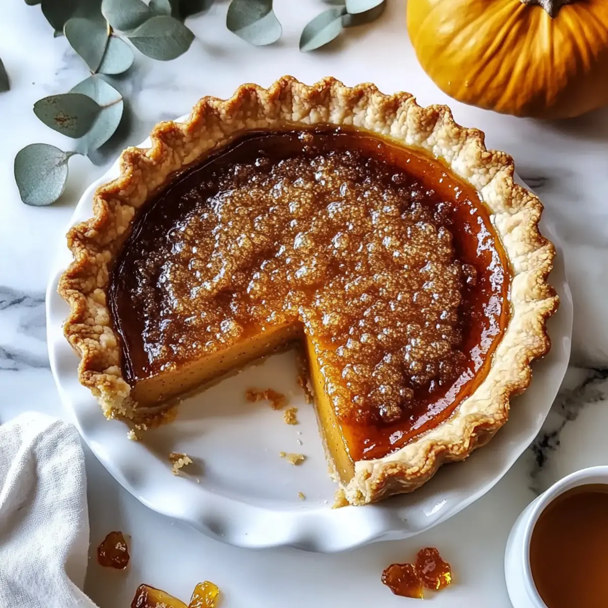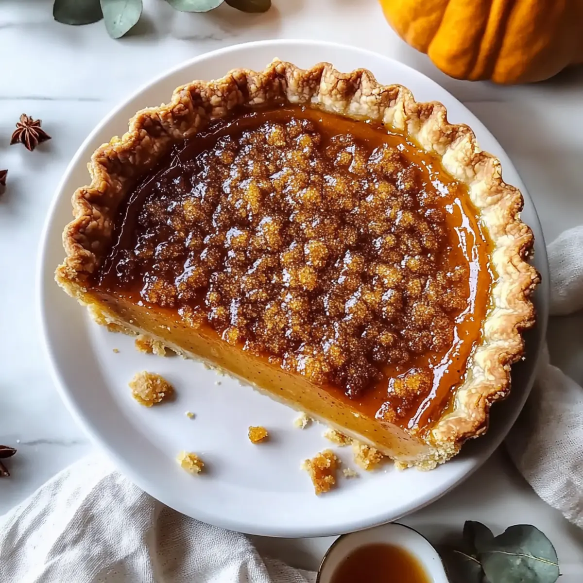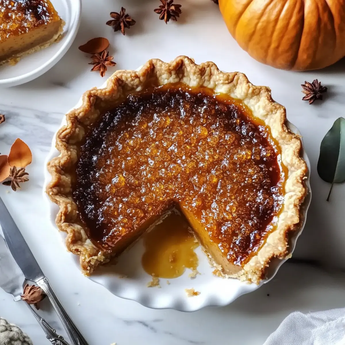 As the leaves turn and a crispness fills the air, I can’t help but crave the comforts of fall baking. Enter my Bourbon Brûlée Pumpkin Pie, a delightful twist on the classic dessert that will elevate your autumn gatherings. This recipe unites a flaky, buttery crust with a luscious pumpkin filling, enriched by warm spices and a hint of bourbon. With its alluring, crunchy brûlée topping, each slice offers an exciting contrast of textures that turns an ordinary pie into a show-stopping centerpiece. Plus, it’s quick to prepare and perfect for impressing your friends and family without spending hours in the kitchen. Who can resist the charm of a homemade dessert that warms the heart and pleases the palate all at once? Ready to discover how to make this seasonal masterpiece? Let’s dive in! Why Is This Pie a Showstopper? Decadent Flavor: The combination of pumpkin, warm spices, and bourbon creates a luxurious taste that’s simply irresistible. Textural Delight: Enjoy the contrast between the smooth, creamy filling and the crunchy, caramelized brûlée top—each bite is a treat for your senses! Quick Preparation: This pie can be whipped up in no time, making it a hassle-free option to impress your guests during the busy fall season. Versatile Options: Feel free to adapt the recipe; substitute pumpkin with sweet potato for a fresh twist, or try making individual tartlets for easier serving at gatherings. Perfect for Celebrations: Whether it’s Thanksgiving or a cozy dinner with friends, this Bourbon Brûlée Pumpkin Pie is sure to be the highlight of your fall desserts and a memorable addition to your dessert table! Bourbon Brûlée Pumpkin Pie Ingredients Let’s gather the essentials to create this spectacular Bourbon Brûlée Pumpkin Pie! For the Crust All-purpose Flour – Structure is key; substitute with a gluten-free blend for a delicious GF option. Granulated Sugar – Sweetness for both the crust and topping; using brown sugar adds a richer flavor. Salt – Enhances all the flavors; no substitute necessary. Egg – Acts as a binding agent; for vegan options, try a flax egg. Vinegar – Helps create a tender crust; lemon juice works as a suitable substitute. Ice Water – Ensures dough hydration; cold water yields the best results. Butter – Provides flakiness and richness; vegan butter can be used for a dairy-free alternative. For the Filling Canned Pumpkin – The heart of this Bourbon Brûlée Pumpkin Pie; fresh pumpkin can be used if you prefer. Sour Cream – Adds a tangy creaminess; you can swap it for plain Greek yogurt. Bourbon – Introduces an amazing depth of flavor; substitute with vanilla extract for a non-alcoholic version. Vanilla Extract – Boosts aroma and flavor; no substitute is necessary. Maple Syrup – Sweetens the filling beautifully; honey or agave syrup can be used instead. Heavy Cream – Offers luscious creaminess; coconut cream is a great dairy-free option. Warm Spice Blend (cinnamon, nutmeg, ginger) – Adds warmth and flavor; feel free to adjust spices to taste. For the Brûlée Topping Granulated Sugar – This is your magic ingredient for creating a delightful caramelized crust; superfine sugar works best! Step‑by‑Step Instructions for Bourbon Brûlée Pumpkin Pie Step 1: Prepare the Crust In a food processor, pulse together the all-purpose flour, granulated sugar, and salt until combined. Add the cold butter and blend until you achieve a coarse texture resembling sand. In a separate bowl, whisk together the egg, vinegar, and ice water, then gradually pour into the flour mixture, mixing until a dough forms. Chill the dough for 30 minutes, allowing it to relax. Step 2: Bake the Crust Preheat your oven to 375°F (190°C). Roll out the chilled dough on a floured surface until it’s about 1/8 inch thick, then fit it into a pie plate. Place parchment paper over the crust and fill with pie weights or dried beans to prevent puffing. Bake for 15 minutes until lightly golden. Remove the weights and brush the baked crust with egg white to seal, then return to the oven for another 5 minutes to set. Step 3: Make the Filling In a large mixing bowl, combine the eggs, canned pumpkin, sour cream, bourbon, and vanilla extract, whisking until smooth. In a saucepan, heat the maple syrup and heavy cream over medium heat until just warmed through. Gradually mix the warm cream mixture into the pumpkin blend, ensuring it’s well combined without lumps. The filling should be creamy and fragrant, ready for pouring. Step 4: Combine and Bake Pour the luscious filling into the prepared crust, smoothing the top with a spatula. Bake the Bourbon Brûlée Pumpkin Pie in your preheated oven at 350°F (175°C) for 55-60 minutes. Look for a filling that is set around the edges but slightly jiggly in the center, an indicator that it will firm up as it cools. Once baked, remove from the oven and let it cool completely, preferably overnight in the refrigerator for best flavor. Step 5: Brûlée the Top Once your pie is completely cooled and flavors are melded, evenly sprinkle granulated sugar over the surface of the pumpkin filling. Using a kitchen torch, carefully caramelize the sugar until it turns a deep golden brown, creating that coveted crispy brûléed top. Move the torch in small circles while keeping it at a safe distance to avoid burning and achieve an even layer of caramelization. Bourbon Brûlée Pumpkin Pie Variations Feel free to mix up your Bourbon Brûlée Pumpkin Pie and make it uniquely yours with these delightful twists! Sweet Potato: Substitute canned pumpkin with sweet potato for a different flavor profile that still offers that comforting fall essence. Dairy-Free: Use coconut cream and vegan butter to create a delicious dairy-free version without sacrificing creaminess. It’s still rich and comforting! Spice It Up: Adjust the warm spice blend to reflect your favorite flavors—more ginger or clove can enhance the kick. Customize it to your heart’s con