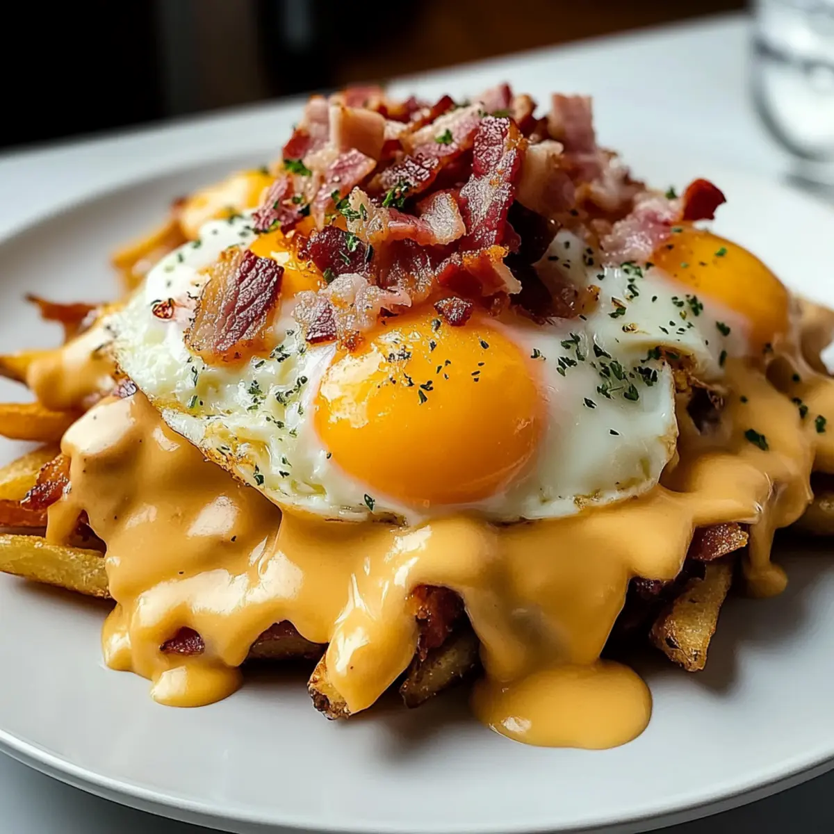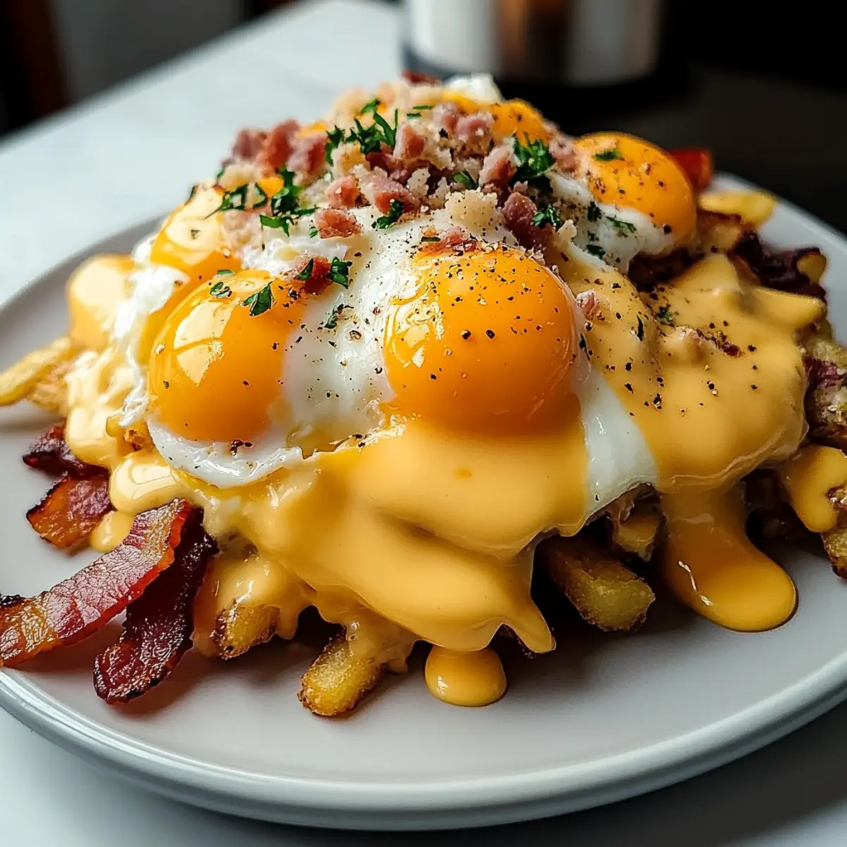 As I sat at my kitchen counter one sunny morning, the tantalizing aroma of freshly crispy hash browns sizzling in the oven filled the air, instantly lifting my spirits. Today, I’m excited to share my recipe for Ultimate Breakfast Poutine with Creamy Hollandaise Sauce—an indulgent twist on a classic dish that promises to elevate your brunch game. Packed with flavor and simplicity, this comfort food masterpiece combines savory beef bacon, gooey melted cheeses, and a rich, velvety Hollandaise sauce, creating a delightful fusion that’s both satisfying and sophisticated. Quick to prepare and perfect for sharing with friends or family, it’s a guaranteed crowd-pleaser for those tired of mundane breakfast routines. Are you ready to transform your mornings? Let’s dive into the delicious details! Why Is This Breakfast Poutine Exceptional? Satisfying Comfort: This Ultimate Breakfast Poutine is the perfect start to your day, blending crispy hash browns, savory beef bacon, and gooey cheeses. Creamy Hollandaise: The rich, velvety sauce elevates the dish, making every bite a luxurious experience. Flexible Ingredients: Feel free to mix and match ingredients, swapping beef bacon for turkey or even adding smoked salmon for a sophisticated twist! Quick Preparation: You can whip this up in about 30 minutes, ideal for any busy morning when you crave something special. Crowd-Pleasing: Serve it during brunch gatherings, and watch it disappear; it’s a dish that delights both family and friends alike! Pair this with a refreshing drink like a mimosa or a berry medley for a complete meal your loved ones will adore. Breakfast Poutine Ingredients For the Hash Browns • Frozen Hash Browns – Essential for that crispy base; substitute with homemade fries for extra freshness. • Olive Oil – Used to crisp up the hash browns; can substitute with canola or vegetable oil if needed. • Salt – Enhances flavors; adjust according to your taste preferences. • Black Pepper – Adds a hint of spice; freshly ground for the best flavor. For the Toppings • Beef Bacon – Provides a smoky, savory flavor; easily swapped for turkey bacon or breakfast sausage. • Shredded Cheddar Cheese – Adds sharpness and creaminess; consider Monterey Jack or pepper jack for variety. • Shredded Mozzarella Cheese – Contributes a lovely stretchy texture; provolone or a cheese blend works if you’re out. • Gravy – Rich base that enhances flavors; opt for homemade or your favorite jarred version. • Large Eggs – Key for poaching; their runny yolks add creaminess; scrambled eggs are a great alternative if you prefer. For the Hollandaise Sauce • Unsalted Butter – Must be melted and warm for the best sauce. • Egg Yolks – The base for a rich Hollandaise; always use the freshest eggs for top-notch flavor. • Dijon Mustard – Imparts a tangy flavor; yellow mustard can substitute in a pinch. • Apple Cider Vinegar – Adds necessary acidity; white vinegar is a suitable alternative. • Lemon Juice – Offers zesty brightness; always go for fresh juice when possible. • Cayenne Pepper – Adds a slight kick to the sauce; omit if you’re sensitive to spice. • Chives or Parsley – Fresh herbs for garnishing; they add a lovely touch of color and flavor. Get ready to build your own delightful Breakfast Poutine with Creamy Hollandaise Sauce that your whole family will love! Step‑by‑Step Instructions for Breakfast Poutine with Creamy Hollandaise Sauce Step 1: Prepare Hash Browns Preheat your oven to 425°F (220°C) to create a crispy base for your Breakfast Poutine. Toss the frozen hash browns in a large bowl with olive oil, salt, and black pepper until evenly coated. Spread them out in a single layer on a baking sheet and bake for 20-30 minutes, flipping halfway to achieve a golden, crunchy texture. Step 2: Cook Beef Bacon While the hash browns are baking, prepare the beef bacon for added savory goodness. Lay the strips on a foil-lined baking sheet and cook in the oven at 400-425°F (200-220°C) for 15-20 minutes, or until they are crispy. Once cooked, crumble the bacon into bite-sized pieces and set aside for later assembly. Step 3: Make Hollandaise Sauce Next, create the rich, velvety Hollandaise sauce that elevates this dish. In a double boiler, whisk together the egg yolks, Dijon mustard, apple cider vinegar, and lemon juice until the mixture becomes thick and pale. Gradually drizzle in warm melted butter while continually whisking until the sauce is glossy. Stir in cayenne pepper, and season with salt to taste, then keep it warm. Step 4: Poach Eggs Prepare to add runny yolks to your Breakfast Poutine by poaching the eggs. Bring a pot of water to a gentle simmer, adding a splash of vinegar to help the eggs hold their shape. Carefully slide in the eggs, one at a time, and poach for 3-4 minutes until the whites are set and the yolks remain soft. Remove them with a slotted spoon, ensuring they’re ready to top your poutine. Step 5: Assemble Poutine Now comes the exciting part—assemble your Ultimate Breakfast Poutine! In serving dishes, pile the crispy hash browns, and generously sprinkle the shredded cheddar and mozzarella cheeses on top. Ladle rich gravy over the crispy base, then drizzle the warm Hollandaise sauce to create a creamy layer. Finally, add the crumbled beef bacon and place a poached egg on each serving, garnishing with fresh chives or parsley for a vibrant touch. Serve immediately to enjoy this glorious breakfast treat! Breakfast Poutine with Creamy Hollandaise Variations Feel free to personalize your Ultimate Breakfast Poutine, adding your favorite flavors and textures for a dish that’s uniquely yours. Meat Swap: Replace beef bacon with crispy turkey bacon or breakfast sausage for a different taste. Sweet Potato Twist: Use sweet potato fries instead of hash browns for a subtly sweet and nutritious alternative. Veggie Boost: Incorporate sautéed mushrooms or caramelized onions to add depth