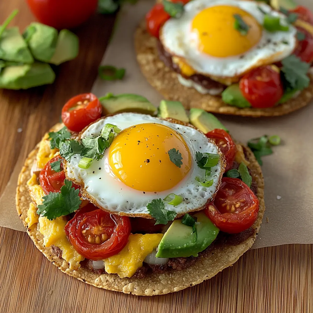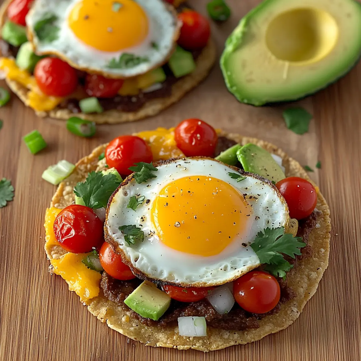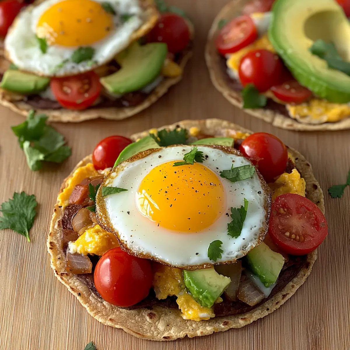 As I laid out the crisp tostada shells on my kitchen counter, a rush of excitement washed over me—these Breakfast Tostadas promised to transform our mornings into something extraordinary. With a delightful crunch and layers of creamy goodness, they’re perfect for both leisurely weekends and hectic weekdays. What I love most about this dish is its remarkable versatility; you can craft each tostada to suit your dietary needs or cravings, whether it’s a hearty protein-packed version or a light, plant-based delight. Quick to prepare and endlessly customizable, these tostadas make breakfast a joyful experience rather than just another chore. Are you ready to elevate your morning routine? Let’s dive in! Why Are These Tostadas a Game Changer? Customization: Easily adapt these breakfast tostadas to fit any diet, be it vegetarian, vegan, or gluten-free. Quick to Assemble: Perfect for busy mornings, you can whip up these tostadas in under 30 minutes! Flavor Explosion: Rich toppings like creamy avocado and zesty tomatoes create a vibrant flavor that delights the palate. Crowd-Pleasing: Ideal for family breakfasts or brunch gatherings, everyone can personalize their tostada just the way they like it. Versatile Base: Experiment with different toppings or substitute ingredients, combining elements from other recipes like my Overnight Croissant Breakfast or Breakfast Grilled Cheese. Satisfying Texture: Enjoy the satisfying crunch of the tostada shell paired with soft, gooey eggs and melty cheese. Breakfast Tostadas Ingredients • Perfect for customizing your morning! For the Tostada Base Tostada Shells – The crunchy foundation that holds all the delicious toppings; substitute with corn, flour, or low-carb wraps for variety. Refried Beans – Creates a creamy texture and adds protein and fiber; you can also swap in black beans or hummus for a different flavor. For the Toppings Reduced-Fat Cheddar Cheese – Melts beautifully and enhances the taste; opt for vegan cheese for a dairy-free option. Large Eggs – Provides essential protein, cooked to perfection for a rich taste; consider scrambled tofu for a vegan alternative. Cherry Tomatoes – Offers juiciness and a touch of sweetness; use fresh salsa or diced bell peppers if tomatoes aren’t handy. Avocado – Delivers healthy fats and a creamy element; feel free to use mashed avocado or guacamole as a substitute. Chopped Green Onions – Adds a mild onion flavor and a splash of color; substitute with chives or shallots for a different touch. Chopped Fresh Cilantro – Infuses freshness into the dish; parsley can be used as a milder herb alternative. Salt and Pepper – Essential seasonings to elevate the flavors. Cooking Essentials Non-stick Cooking Spray – Ensures your eggs don’t stick to the skillet; olive oil can be used as a natural fat alternative. Optional Toppings Hot Sauce or Salsa – Give your tostadas an extra kick with these flavorful additions! Step‑by‑Step Instructions for Breakfast Tostadas Step 1: Preheat and Prepare Begin by preheating your oven to 400°F (200°C). While the oven warms, line a baking sheet with parchment paper to ensure that your tostada shells won’t stick. This preparation step sets you up for crispy, golden tostadas, ready for a delicious assembly of flavors. Step 2: Spread the Refried Beans Take each tostada shell and spread approximately two tablespoons of refried beans evenly across the top. The creamy texture will serve as a delicious base for the toppings. After evenly distributing the beans, sprinkle around two tablespoons of reduced-fat cheddar cheese on each shell, ensuring it covers the beans completely. Step 3: Bake the Tostadas Place the baking sheet with prepared tostadas in the preheated oven. Bake them for 5 to 6 minutes, or until the cheese is perfectly melted and the edges of the tostada shells turn a lovely golden brown. You’ll know they’re ready when you see the cheese bubbling and the shells crisping up nicely. Step 4: Cook the Eggs While the tostadas are baking, heat a skillet over medium heat and coat it lightly with non-stick cooking spray. Crack the large eggs into the skillet, cooking until they reach your desired doneness—sunny side up is highly recommended for that delightful yolky richness. Keep an eye on them to avoid overcooking. Step 5: Assemble the Tostadas Once the tostadas are out of the oven, carefully place one cooked egg on top of each shell. The warm egg will melt the cheese slightly further, enhancing the overall taste. Next, layer fresh cherry tomatoes, creamy avocado slices, chopped green onions, and fresh cilantro on top to create a colorful, appetizing display. Step 6: Season and Serve To finish off your Breakfast Tostadas, lightly season them with salt and pepper to elevate the flavors of each component. If desired, drizzle some hot sauce or salsa over the top for an extra kick. Serve your tostadas immediately while they’re warm, ready to be enjoyed as a hearty and healthy breakfast. What to Serve with Breakfast Tostadas Elevate your breakfast experience by pairing these delightful tostadas with fresh and satisfying sides that will awaken your senses. Fresh Fruit Salad: A colorful mix of seasonal fruits adds sweetness and a refreshing contrast to the savory tostadas, ensuring a well-rounded meal. Zesty Breakfast Potatoes: Crispy roasted or pan-fried potatoes seasoned with herbs bring a hearty element, making every bite feel indulgent and comforting. Creamy Yogurt Parfait: Layer Greek yogurt with granola and berries for a creamy and crunchy delight, perfect for balancing the flavors of your tostadas. Citrus Juice: A glass of freshly squeezed orange juice perfectly complements the savory notes of the tostadas, providing a refreshing burst of flavor. Herbal Tea or Coffee: The warm, soothing flavors of herbal tea or a robust cup of coffee create a cozy atmosphere, enriching your breakfast experience. Avocado Salad: A light avocado and tomato salad wi