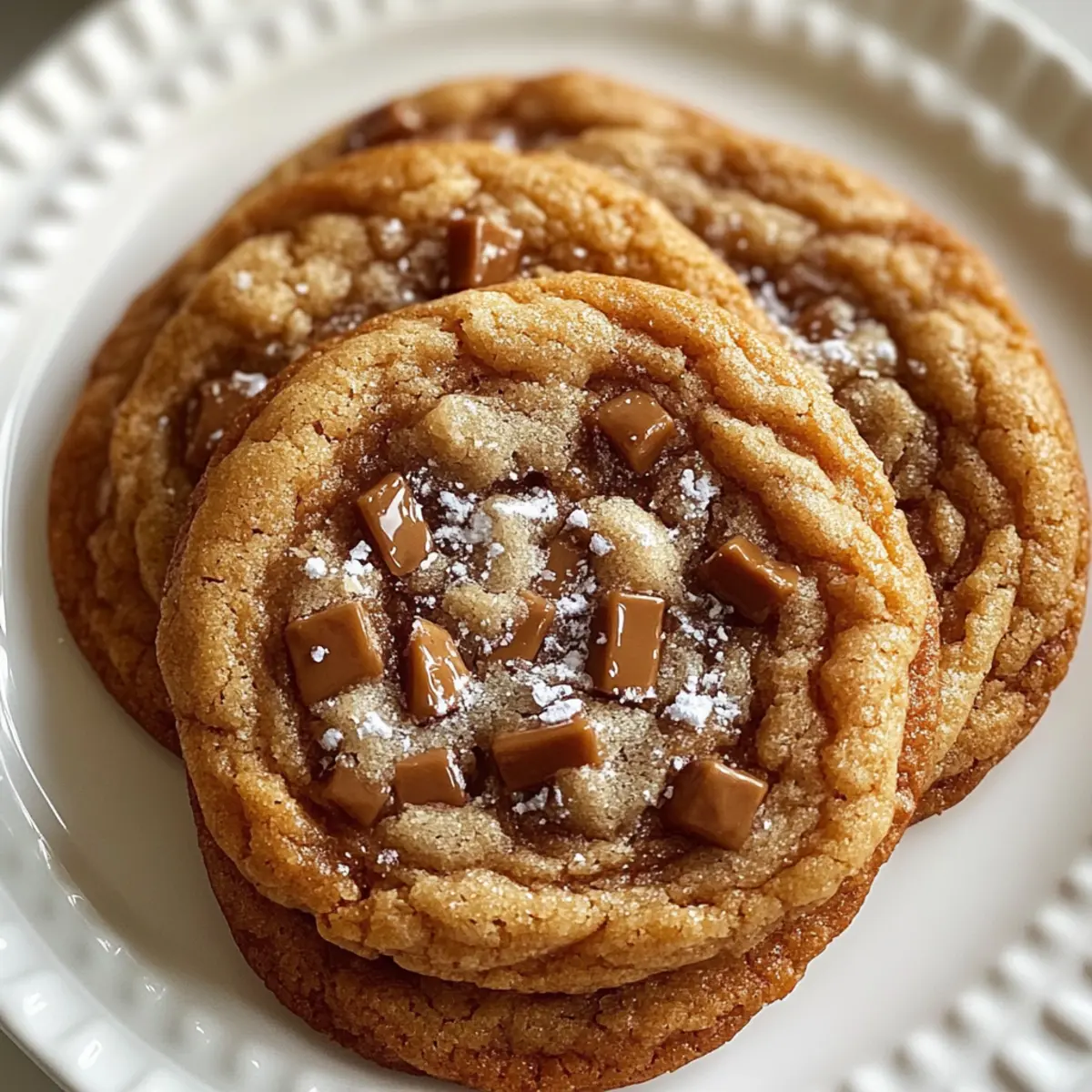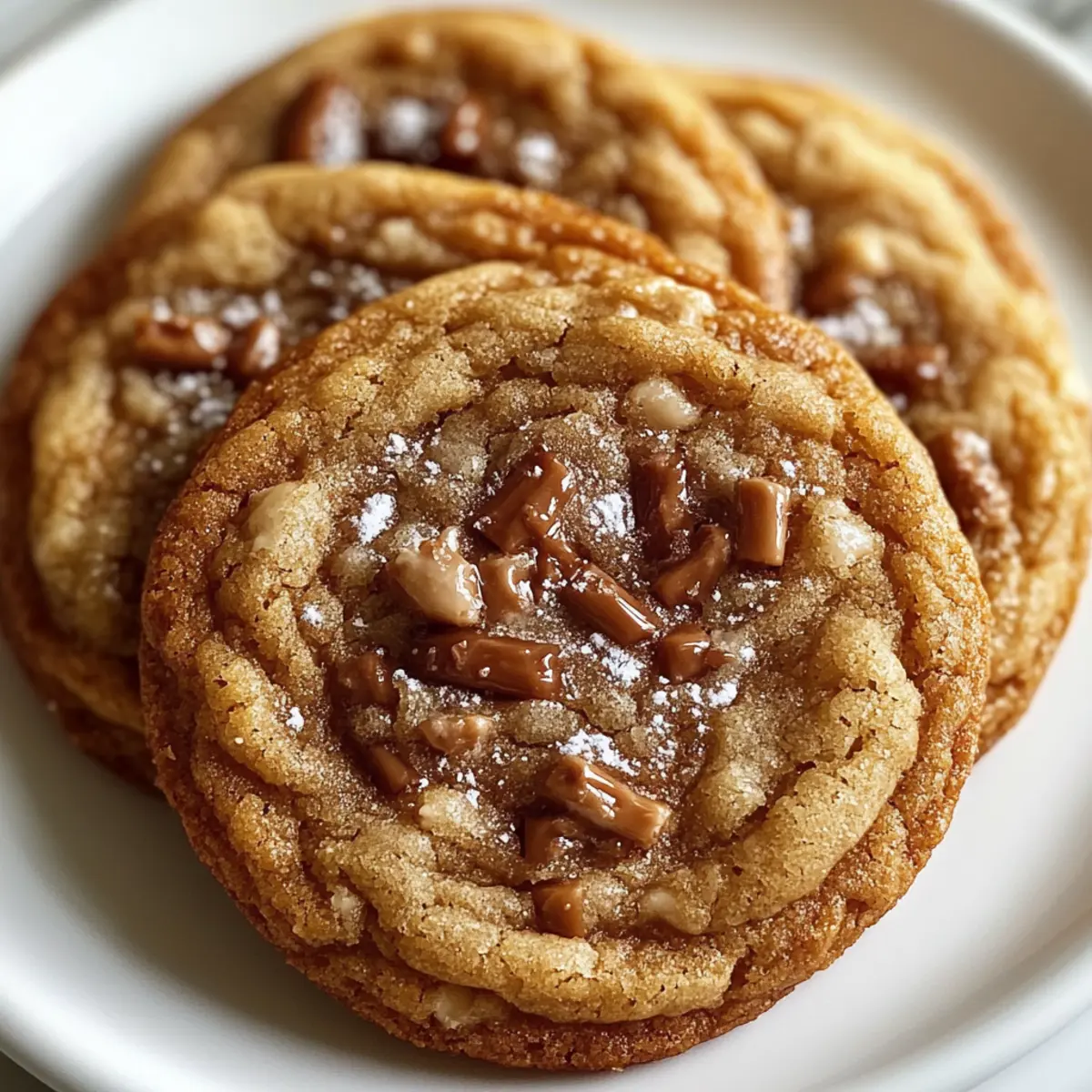 As the aroma of nutty brown butter wafts through my kitchen, I can’t help but feel excitement building for the next batch of my Brown Butter Toffee Cookies. These cookies boast crisp edges and a gloriously chewy center that transforms every bite into a heavenly experience. The secret lies in the browned butter, which elevates humble ingredients into something truly special. Not only are they a crowd-pleaser perfect for sharing, but their intermediate-level preparation makes them an enjoyable project for any home chef ready to try something new. With just a little patience, you’ll create a batch of these irresistible cookies that keep friends and family coming back for more. Curious how to bring this delectable treat to life? Let’s dive into the recipe! Why Are Brown Butter Toffee Cookies Irresistible? Irresistible Flavor: The toasted notes from brown butter meld perfectly with sweet toffee bits, delivering a taste that’s simply unforgettable. Perfectly Chewy: With a glossy, chewy center and a delightful crispiness at the edges, each bite offers a satisfying texture that keeps you reaching for more. Easily Shareable: These cookies are a great companion for gatherings, making them an effortless crowd-pleaser that will impress friends and family alike. Fun to Make: The intermediate level provides a lovely challenge for home chefs, perfect for those looking to expand their baking skills. Store or Freeze: These cookies can be easily stored or frozen for later, ensuring you always have a delectable treat on hand. Pair them with a cold glass of milk, just like with Cookies Cream Ice for a delightful experience! Brown Butter Toffee Cookies Ingredients For the Cookie Dough • Unsalted Butter – Browning it enhances the nutty flavor; consider using salted butter but reduce added salt to 1/4 teaspoon. • Brown Sugar – Adds moisture and a caramel undertone, enhancing chewiness in your Brown Butter Toffee Cookies. • Granulated Sugar – Balances sweetness and contributes to crispy edges. • Eggs (2 large) – Binds the dough for structure and lift. • Vanilla Extract – Boosts flavor complexity, adding warmth and depth. • All-Purpose Flour – Forms the cookie’s base, providing essential structure. • Baking Soda – Acts as a leavening agent, allowing cookies to spread and create that sought-after crinkly top. • Salt – Enhances sweetness and richness, ensuring all flavors are balanced. • Toffee Bits (1 cup) – Provides delightful, crunchy pockets throughout the dough. • Chocolate Chips (optional) – Adds an extra layer of chocolaty richness for chocolate lovers. For Topping • Flaky Sea Salt – Sprinkle this on top before baking to create a beautiful sweet-salty contrast. Step‑by‑Step Instructions for Brown Butter Toffee Cookies Step 1: Brown the Butter In a medium saucepan, melt 1 cup of unsalted butter over medium heat. Stir continuously until it becomes foamy and turns a rich golden brown, about 5-7 minutes; keep a close eye to prevent burning. Once browned, remove from heat and let it cool slightly before using, allowing those nutty aromas to fill your kitchen. Step 2: Mix Sugars In a large mixing bowl, combine the cooled browned butter with 1 cup of brown sugar and 1/2 cup of granulated sugar. Use a whisk or a hand mixer to blend until the mixture becomes smooth and glossy, about 2-3 minutes. This step is crucial for achieving that chewy texture in your Brown Butter Toffee Cookies. Step 3: Add Eggs and Vanilla Crack in the eggs, one at a time, mixing well after each addition until the batter is creamy and well combined. Then, stir in 1 teaspoon of vanilla extract, ensuring it fully incorporates into the dough. The warmth of the vanilla will complement the rich flavor of the browned butter beautifully. Step 4: Combine Dry Ingredients In a separate bowl, whisk together 2 cups of all-purpose flour, 1 teaspoon of baking soda, and 1/2 teaspoon of salt. Gradually add this dry mixture to the wet ingredients, stirring gently just until combined. Take care not to overmix, as this can lead to tougher cookies—aim for a slightly lumpy dough. Step 5: Fold in Toffee Bits Gently fold in 1 cup of toffee bits, and if you’re feeling indulgent, include a cup of chocolate chips for extra richness. Use a rubber spatula to incorporate these goodies without overworking the dough. The toffee bits will add delightful crunch and sweetness to your Brown Butter Toffee Cookies. Step 6: Chill Dough Cover the bowl with plastic wrap and refrigerate the dough for at least 30 minutes. Chilling is essential for helping the cookies maintain their shape and achieve that perfect chewy texture once baked. During this time, you can preheat your oven. Step 7: Preheat Oven While the dough chills, preheat your oven to 350°F (175°C) and line baking sheets with parchment paper. This preparation ensures that your cookies will bake evenly and have wonderful crisp edges when placed in the oven. Step 8: Scoop Dough Once chilled, use a cookie scoop or tablespoon to drop mounds of dough onto the prepared baking sheets, spacing them about 2 inches apart. This allows for spreading while baking, helping to create the ideal shape for your Brown Butter Toffee Cookies. Step 9: Add Sea Salt Before baking, sprinkle a pinch of flaky sea salt atop each cookie mound. This tiny sprinkle enhances the sweet-salty contrast and elevates the flavors in your freshly baked cookies, making each bite even more irresistible. Step 10: Bake Place the baking sheets in the oven and bake for 10-12 minutes. Keep a close eye on them; the cookies should have golden edges while the centers look slightly underbaked. This contrast ensures that they remain chewy and delicious. Step 11: Cool After baking, let the cookies rest on the baking sheet for about 5 minutes to firm up. Then, carefully transfer them to a wire rack to cool completely. This step allows the flavors to settle, giving you the ultimate Brown Butter Toffee Cookies exp