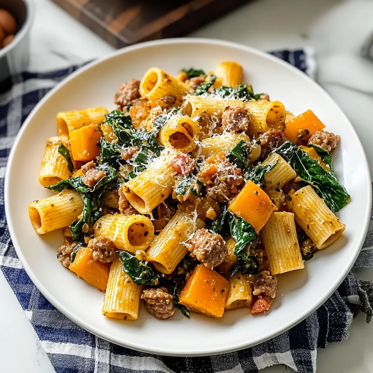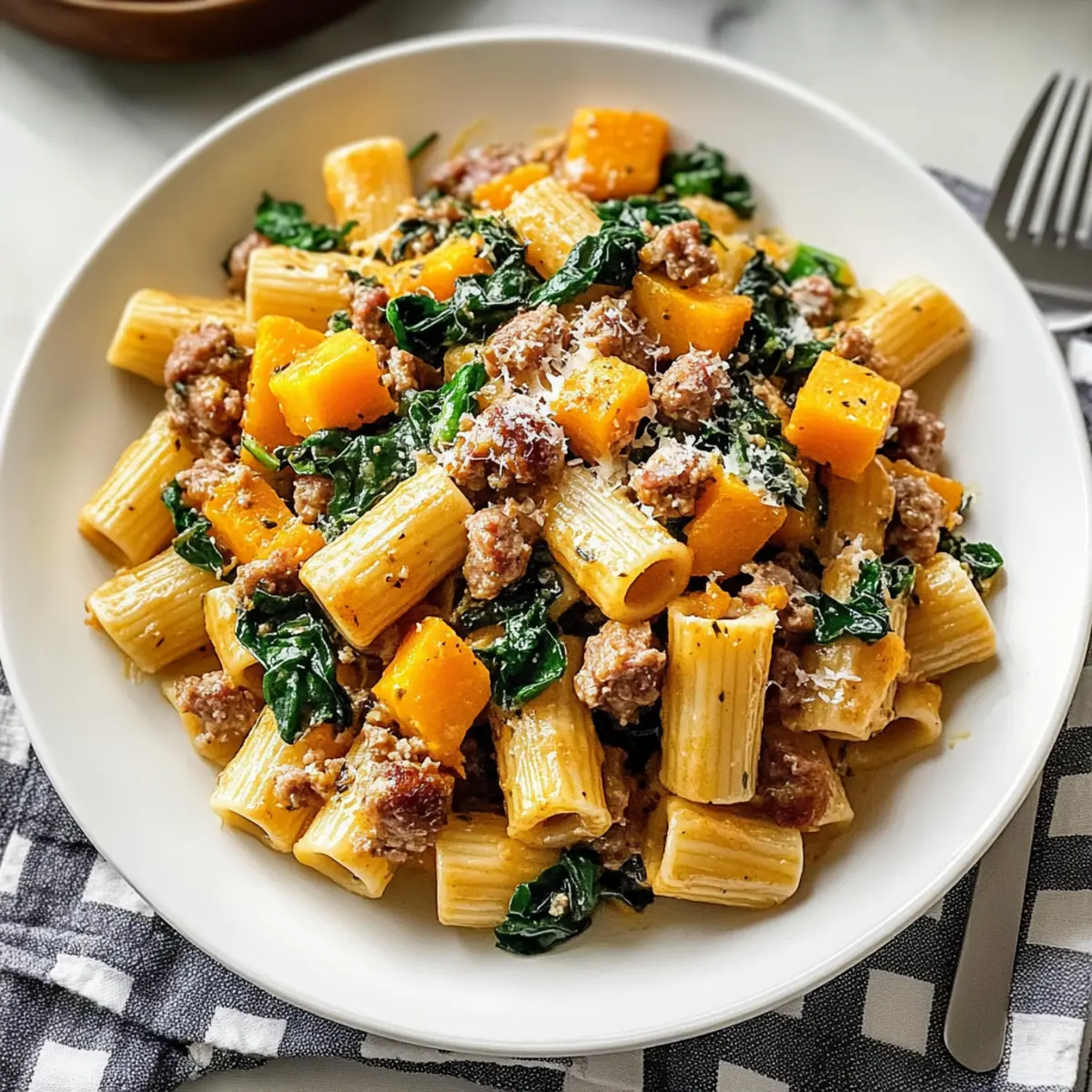 As the leaves begin to turn and the air gets that crisp feel, I crave the warm hug of flavorful comfort food. That’s where my Cozy Butternut Squash Sausage Pasta comes in, perfect for those chilly fall evenings. This dish brings together creamy textures, a hint of spice from the sausage, and the natural sweetness of roasted butternut squash, making it a delightful addition to any family meal. Not only is it incredibly easy to prepare, but it also serves as a crowd-pleaser that will leave everyone asking for seconds. Ready to transform your dinner table into a cozy retreat? Let’s dive into this scrumptious recipe! Why is this dish a fall favorite? Comforting and cozy, this Butternut Squash Sausage Pasta is the ultimate dish for crisp autumn evenings. Creamy textures blend beautifully with the hearty sausage and sweet squash, creating a meal everyone will love. Quick to prepare, it’s an ideal choice for busy weeknights, making it perfect for family gatherings. Flavor-packed yet uncomplicated, you can effortlessly swap in different greens or types of pasta based on your preference. And if you enjoy this savory goodness, don’t miss trying out my Garlic Parmesan Pasta next! Butternut Squash Sausage Pasta Ingredients For the Pasta • Rigatoni Pasta – Offers a sturdy base for the dish; you can use penne or ziti if you prefer something different. For the Sauté • Olive Oil – Used for sautéing the ingredients, lending a rich flavor to the dish. • Butternut Squash – Sweet and creamy, about 3 cups diced; substitute with pumpkin if you like. • Red Onion – Adds natural sweetness; yellow onion works as a good alternative. • Spicy Italian Sausage – Brings a delightful heat; feel free to swap for sweet Italian sausage for a milder flavor. For the Flavors • Garlic – Enhances the overall flavor profile; use 4 minced cloves for a robust base. • Swiss Chard – A nutritious addition with a pop of color; kale or spinach can be used instead. • Red Chili Flakes – Spice things up! Adjust the amount based on your heat preference. For the Sauce • Creme Fraiche – Provides creaminess, about ½ cup; sour cream mixed with lemon juice can be a substitute if needed. • Parmesan Cheese – Adds a delicious cheesy flavor; use ½ cup grated plus more for serving. Pecorino Romano is also a great option. • Salt and Black Pepper – Essential for enhancing the overall taste; season to your liking. This Butternut Squash Sausage Pasta recipe is sure to be a hit at your table, bringing cozy fall flavors in every bite! Step‑by‑Step Instructions for Cozy Butternut Squash Sausage Pasta Step 1: Cook Pasta Bring a large pot of salted water to a boil over high heat. Carefully add 1 pound of rigatoni pasta, cooking for about 10-12 minutes or until al dente. To keep the sauce silky smooth, reserve 1 cup of the starchy pasta water before draining the pasta in a colander. Step 2: Sauté Vegetables In a large skillet, heat 2 tablespoons of olive oil over medium heat. Add 3 cups of diced butternut squash and 1 diced red onion, stirring occasionally for 8-10 minutes, until the squash is tender and the onions are translucent. This will create a sweet and savory base for your Cozy Butternut Squash Sausage Pasta. Step 3: Brown Sausage Push the sautéed vegetables to one side of the skillet. Add 1 pound of spicy Italian sausage to the cleared space, breaking it up with a wooden spoon. Cook for about 5-7 minutes, stirring occasionally, until the sausage is browned and cooked through. The aroma will fill your kitchen and signal that it’s time to add more flavor! Step 4: Add Aromatics Incorporate 4 minced cloves of garlic into the skillet along with 1 bunch of chopped Swiss chard and ½ teaspoon of red chili flakes. Stir everything together and cook for an additional 2 minutes, allowing the garlic to become fragrant and the Swiss chard to wilt. This adds depth to your Cozy Butternut Squash Sausage Pasta. Step 5: Create Sauce Pour the reserved pasta water into the skillet, scraping any browned bits from the bottom. Mix in ½ cup of creme fraiche and ½ cup of grated Parmesan cheese until you achieve a creamy consistency. The sauce will begin to thicken, enveloping the veggies and sausage with rich flavor for your pasta dish. Step 6: Combine and Serve Toss the drained rigatoni into the skillet, carefully mixing it with the sauce until completely coated. Allow it to heat through for about 1-2 minutes. Serve hot, topped with additional grated Parmesan cheese for that extra touch of decadence. Enjoy the delightful flavors of your Cozy Butternut Squash Sausage Pasta! What to Serve with Cozy Butternut Squash Sausage Pasta Transform your dinner into a delightful feast with these comforting side dishes and drinks that easily complement the rich and creamy flavors of your pasta. Garlic Bread: Warm, toasty slices slathered in garlic butter provide a crunchy contrast, perfect for sopping up any creamy sauce. Simple Green Salad: A fresh salad with mixed greens, cherry tomatoes, and a light vinaigrette adds brightness, balancing the dish’s richness beautifully. Roasted Brussels Sprouts: The nuttiness of roasted Brussels sprouts brings an earthy dimension that pairs wonderfully with the sweet squash and spicy sausage. Crusty Bread: Serve with a warm baguette for a comforting, hearty side that invites family and friends to gather around the table. Apple Cider: This sweet and tangy drink echoes the fall season, making it an excellent partner for your cozy pasta while adding a refreshing touch. Pumpkin Spice Dessert: End your meal with a slice of pumpkin pie or a pumpkin spice latte, featuring fall flavors that resonate perfectly with the pasta dish. Cheesy Polenta: Creamy polenta offers an alternative hearty base that mimics the dish’s comforting texture while providing a different taste experience. Chardonnay: A glass of chilled Chardonnay elevates the dinner with its fruity notes, enhancing the overall flavo
