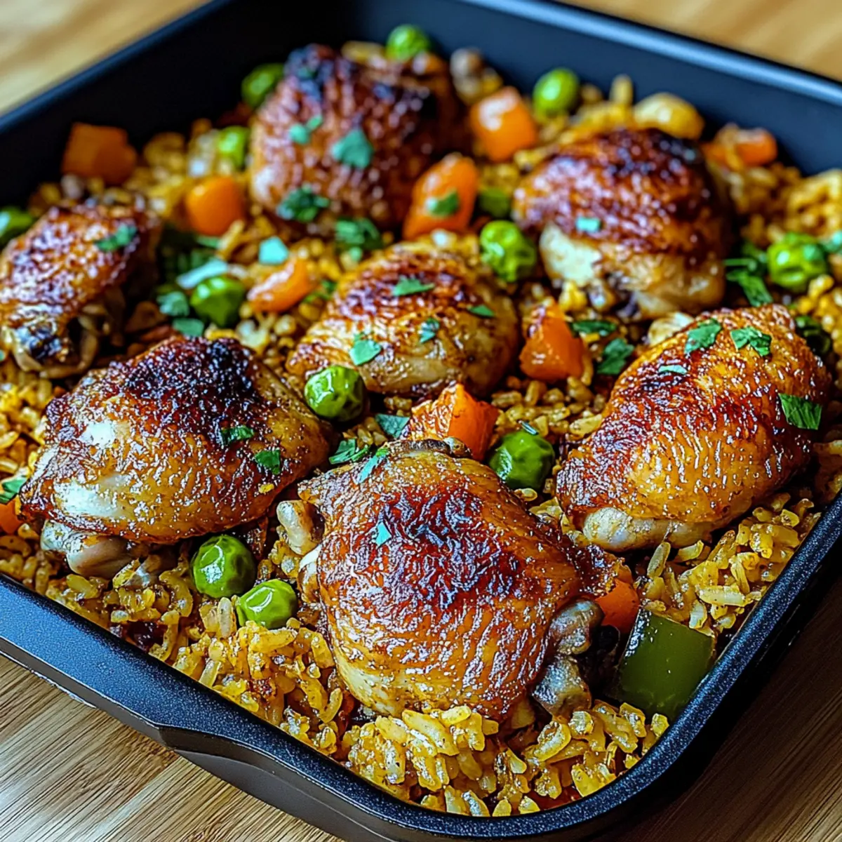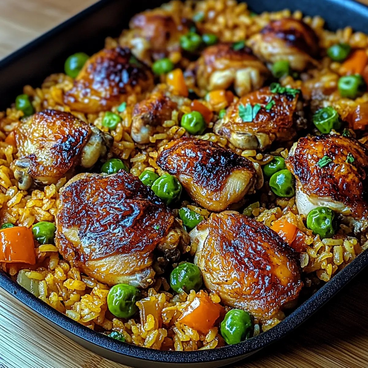 In the midst of a busy week, a delightful aroma can transport you to a sun-soaked Caribbean beach. This One-Pan Caribbean Chicken and Rice is not just a meal; it’s an experience that brings warmth and vibrant flavors right to your home. The beauty of this dish lies in its simplicity—you can create an irresistible, comforting dinner using just one pan in under an hour! Made with juicy chicken thighs and a coconut-infused rice, this recipe is a true crowd-pleaser, making it perfect for family dinners or cozy gatherings. Plus, it’s completely customizable, allowing you to spice things up or keep it mild according to your taste. Are you ready to embark on a culinary adventure that will leave your kitchen—and your heart—feeling satisfied? Why is Caribbean Chicken and Rice a must-try? Simplicity at its Finest: This one-pan wonder not only saves you time but also minimizes cleanup, making it perfect for a busy weeknight. Rich, Tropical Flavors: Infused with aromatic spices and creamy coconut, every bite feels like a mini-vacation. Customizable Options: Whether you prefer a spicy kick or a milder version, this recipe welcomes your personal touch. Crowd-Pleasing Delight: Ideal for family dinners or cozy gatherings, everyone will adore this comforting dish! Quick and Convenient: Ready in under an hour, it’s the ultimate solution for delicious homemade food without the fuss. Why not complement your meal with some fried plantains or a crisp salad? And if you’re looking for more exciting options, check out my delicious Caribbean Chicken Rice or the Smothered Chicken and Rice recipes for more inspiration! Caribbean Chicken and Rice Ingredients For the Chicken • Chicken Thighs – Juicy and full of flavor, bone-in provides extra richness. • Olive Oil – Ideal for searing chicken, can be swapped with your favorite cooking oil. For the Rice • Long-Grain Rice – Jasmine or basmati absorbs flavors beautifully for a delightful texture. • Coconut Milk – Use unsweetened for that creamy texture and subtle sweetness in the rice. • Chicken Broth – Adds moisture and enhances the savory depth of the dish. For the Vegetables • Red and Green Bell Peppers – Brings color, crunch, and sweetness; feel free to mix in others. • Scallions – Offers a fresh, mild onion flavor; you can substitute with regular onions if needed. • Garlic – The aromatic base; garlic powder works in a pinch if fresh isn’t available. For Aromatics and Spices • Fresh Thyme – Provides a fragrant, earthy flavor; substitute with 1 tsp of dried thyme. • Ground Allspice – A key player that offers warm, aromatic notes unique to Caribbean cooking. • Paprika – Adds a subtle smokiness; cayenne can be used for an extra kick if desired. • Salt and Pepper – Essential for balancing flavors throughout the dish. Optional Additives • Cayenne or Hot Sauce – Use to spice things up according to your heat preference. This Caribbean Chicken and Rice makes for an unforgettable meal that’ll transport you straight to the tropics with each bite! Step‑by‑Step Instructions for Caribbean Chicken and Rice Step 1: Prepare the Chicken Begin by patting the chicken thighs dry with paper towels, ensuring a crispy skin. Season generously with salt, pepper, allspice, and paprika. This blend of spices will enhance the flavors of your Caribbean Chicken and Rice. Let the seasoned thighs sit for a few minutes while you heat the oil. Step 2: Sear the Chicken In a large skillet, heat two tablespoons of olive oil over medium-high heat. Once hot, carefully place the chicken thighs skin-side down in the skillet. Sear for 5-6 minutes until the skin is golden brown and crispy. Flip the thighs and cook for another 2-3 minutes until they are just browned. Remove and set aside. Step 3: Sauté the Vegetables In the same skillet, reduce the heat slightly and add minced garlic, chopped scallions, and diced red and green bell peppers. Sauté the mixture for about 2-3 minutes, stirring occasionally, until the vegetables have softened and released their sweet aroma. This vibrant blend creates a flavorful base for your Caribbean Chicken and Rice. Step 4: Cook the Rice Stir in the long-grain rice, coconut milk, chicken broth, thyme, and a pinch of salt. Increase the heat to bring the mixture to a gentle simmer. Once it’s bubbling, it’s time to nestle the chicken back into the skillet so the flavors can blend beautifully. Step 5: Simmer to Perfection Cover the skillet with a lid, reduce the heat to low, and allow it to simmer for 20-25 minutes. You’ll know it’s ready when the rice is tender and has absorbed the liquid, and the chicken reaches an internal temperature of 165°F. The comforting aroma of Caribbean Chicken and Rice will fill your kitchen! Step 6: Crisp the Chicken Skin For the last 5 minutes of cooking, remove the lid to allow the chicken skin to crisp up and any excess liquid to evaporate. Keep an eye on it to ensure the rice doesn’t stick to the bottom of the pan. This step will give your dish a delightful texture. Step 7: Garnish and Serve Once done, remove the skillet from heat and garnish your delicious Caribbean Chicken and Rice with additional sliced scallions for a pop of freshness. Serve hot, and enjoy the medley of flavors and aromas that are sure to please everyone at your table. Expert Tips for Caribbean Chicken and Rice Rinse the Rice: Rinsing your rice before cooking removes excess starch, ensuring fluffy grains in your Caribbean Chicken and Rice. Marinate for Flavor: For a flavor boost, marinate chicken thighs in lime juice and spices overnight for deeper, more vibrant tastes. Adjust Cooking Time: If using boneless chicken, monitor cooking time closely to prevent overcooking and keep the meat juicy. Use a Heavy Skillet: A heavy-bottomed skillet helps prevent burning and ensures even cooking, making your Caribbean Chicken and Rice a delightful success. Don’t Skip the Lid: Keeping the lid on during si