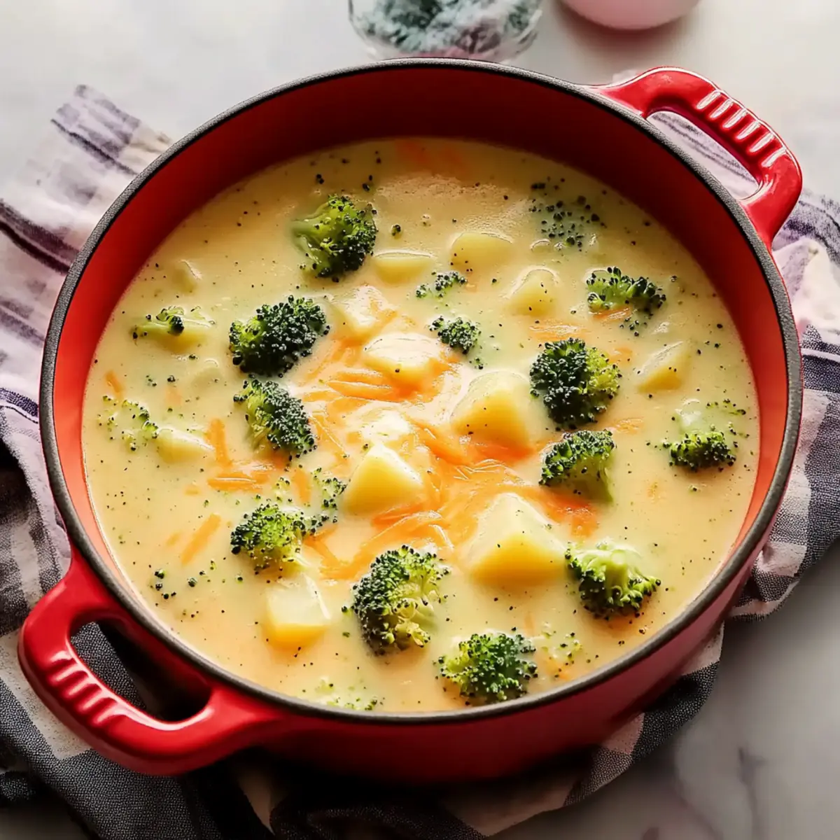 As I blended fresh broccoli and tender potatoes in my kitchen, the aroma transformed my space into a cozy retreat. This Cheesy Broccoli Potato Soup recipe has become a staple for chilly evenings and busy weeknights, providing just the right amount of warmth and satisfaction to our family meals. It’s not merely a delicious comfort food; it’s a delightful escape from fast food that even the pickiest eaters can’t resist. With its creamy texture enriched by sharp cheddar and parmesan, this hearty soup not only nourishes the body but also feeds the soul. Plus, it’s quick to whip up, making it perfect for anyone navigating a hectic schedule. Curious how to make this rich, creamy delight at home? Let’s dive into the details and turn your kitchen into a haven of warmth and flavor! Why Is This Soup a Must-Try? Comforting Warmth: This Cheesy Broccoli Potato Soup is the ultimate hug in a bowl, perfect for chilly evenings. Family Favorite: Even kids who shy away from broccoli can’t resist its rich, cheesy flavors, making family dinners a breeze. Simple and Quick: With just a handful of ingredients and straightforward steps, you can whip up this nourishing meal in no time. Versatile Indulgence: Enjoy it as a standalone meal, or pair with crusty bread or a light salad—options abound! Healthful Satisfaction: Packed with veggies, this soup is a guilt-free comfort food that warms both body and soul. Meal Prep Hero: Perfect for making ahead, it develops even richer flavors overnight, making it ideal for busy weeknights! Cheesy Broccoli Potato Soup Ingredients • For the Soup Base Butter – Adds richness and flavor to the soup base; Preferred: Kerrygold unsalted butter for better taste. Carrots – Provide sweetness and texture; Chop into small pieces for even cooking. Celery – Adds aromatic flavor and crunch; Dice to similar size as carrots for uniform cooking. Onion – Offers foundational flavor and aroma; Use yellow or white onion for sweetness. Garlic – Boosts overall flavor; Freshly minced is best for potency; cook briefly. Chicken Broth – Serves as the savory liquid base; Vegetable broth can replace for a vegetarian version. • For the Creamy Texture Potatoes (Yukon Gold or Russet) – Contributes to the creamy texture; Avoid waxy potatoes for best results. Broccoli – Adds nutrition and color; Cut into small florets for even cooking. Thyme – Enhances the soup with an earthy aroma; Dried thyme works well. Salt and Black Pepper – Essential for seasoning; Adjust to taste. Nutmeg – Adds warmth and depth to the cream sauce; Use a pinch for subtlety. Flour – Thickens the soup and creates a roux for creaminess; King Arthur all-purpose flour recommended for silkiness. Milk (Whole) – Creates a creamy texture; Substitute part with low-fat milk for a lighter option. Cream – Adds richness; Can be reduced or substituted with half-and-half. • For the Cheesy Finish Cheddar Cheese (Sharp) – Provides flavor and creaminess; Sharp for better depth; mild cheddar can be used for a lighter taste. Parmesan Cheese – Adds saltiness and complexity; Skip if unavailable, or use a similar hard cheese. Enjoy crafting this delightful Cheesy Broccoli Potato Soup, perfect for cozy nights in! Step‑by‑Step Instructions for Cheesy Broccoli Potato Soup Step 1: Prep Ingredients Begin by peeling and chopping your potatoes into 1/2-inch cubes, ensuring they’re consistent in size for even cooking. Dice the carrots, celery, and onion, and mince the garlic. Lastly, cut the broccoli into small florets, making sure they are small enough to cook evenly. Set all prepped ingredients aside, ready for a delicious start to your Cheesy Broccoli Potato Soup. Step 2: Cook Vegetables In a large pot over medium heat, melt 2 tablespoons of butter until it shimmers. Add the diced carrots, celery, and onion, sautéing for 3-4 minutes until the vegetables soften and the onion becomes translucent. Stir in the minced garlic and cook for an additional 30 seconds, allowing the garlic’s fragrant aroma to elevate your soup base. Step 3: Simmer Potatoes Drain any excess moisture from the potatoes, then add them into the pot along with the chicken broth, dried thyme, salt, and black pepper. Increase the heat to bring the mixture to a boil, then reduce it to a simmer. Let it cook for about 15 minutes until the potatoes are mostly tender, stirring occasionally to prevent sticking at the bottom. Step 4: Add Broccoli Once the potatoes are nearly cooked, gently stir in the broccoli florets. Continue to simmer uncovered for another 5 minutes, or until the broccoli turns a vibrant green and is tender-crisp. This step ensures your Cheesy Broccoli Potato Soup is packed with nutrition while maintaining the fresh flavors of the vegetables. Step 5: Make Cream Sauce In a separate saucepan, melt 5 tablespoons of butter over medium heat. Once melted, whisk in 7 tablespoons of flour and cook for about 1 minute. Gradually pour in 3 cups of milk while continually whisking to prevent lumps. Cook for 3-4 minutes until the mixture thickens, then remove it from heat and stir in the heavy cream and a pinch of nutmeg for depth. Step 6: Combine and Finish Pour the creamy sauce into the pot with the vegetable mixture and stir gently to combine all the flavors. Remove the pot from the heat and add the shredded cheddar and grated parmesan cheese. Stir until the cheeses are fully melted and the soup is rich and creamy. Taste and adjust the seasoning with more salt or pepper if needed. Step 7: Serve Ladle the warm Cheesy Broccoli Potato Soup into bowls. Serve immediately, enjoying the comforting, creamy goodness of this hearty meal. Pair it with crusty bread or a light salad for a complete dining experience that’s sure to delight your family! What to Serve with Cheesy Broccoli Potato Soup Imagine curling up with a hearty bowl of comfort, paired perfectly with flavors and textures that enhance your experience. Crusty Bread: The perfect duo, cru