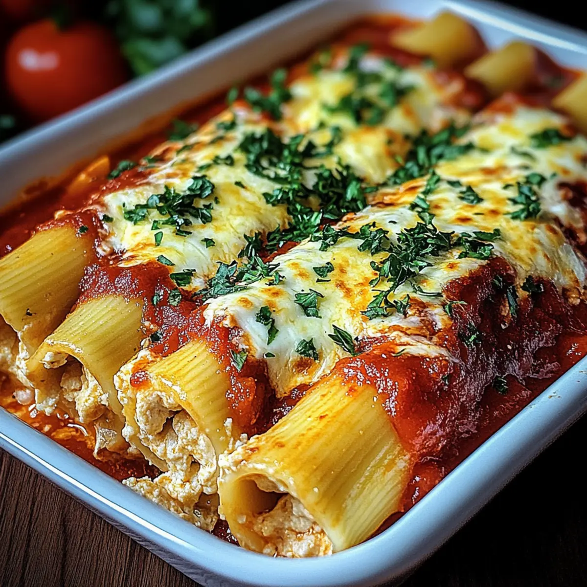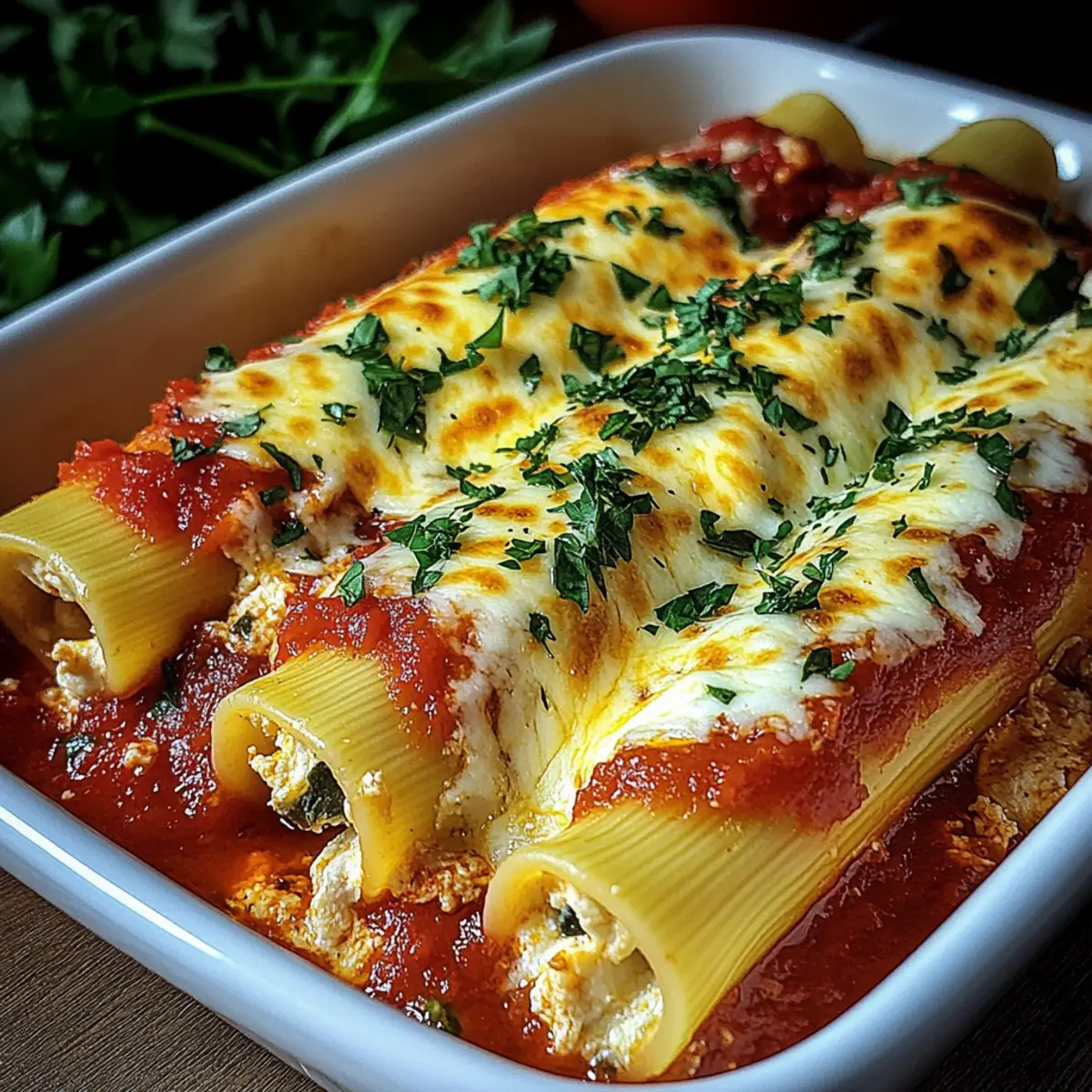 As I stood in my kitchen, the aroma of garlic sizzling in olive oil pulled me back to Sunday dinners at my grandmother’s house. It’s where family gathered around the table, eagerly awaiting her famous Cheesy Chicken Manicotti—a timeless Italian-American classic that has comforted generations. This dish is not just a meal; it’s a cozy embrace of tender pasta stuffed with seasoned chicken and creamy ricotta. With its quick prep time, it’s perfect for those busy weeknights when you need something hearty yet satisfying. Plus, this family-friendly recipe keeps everyone happily coming back for seconds! Ready to whip up a plateful of warmth that will make your loved ones cheer? Let’s dive in! Why is Cheesy Chicken Manicotti a Family Favorite? Deliciously Cheesy: Each bite delivers a heavenly combination of gooey mozzarella and creamy ricotta that melts in your mouth. Super Simple: Perfect for busy weeknights, this dish comes together quickly without compromising on flavor—making it a go-to for last-minute dinners. Crowd-Pleasing Comfort: The savory chicken filling and rich marinara sauce evoke the warmth of family gatherings, ensuring everyone returns for seconds. Customization Options: Easily swap ingredients for a vegetarian version or try different cheese blends, like Pepper Jack for a zesty twist. Easy Leftovers: Store leftovers in an airtight container, allowing the flavors to deepen—making your next meal just as delightful as the first. Memorable Tradition: This dish connects families and creates cherished memories, harkening back to those beloved Sunday dinners. Cheesy Chicken Manicotti Ingredients For the Filling Manicotti Pasta – Provides structure and serves as the vessel for the filling. Use any tubular pasta if manicotti is unavailable. Shredded Cooked Chicken – Adds protein and flavor. Rotisserie chicken is a great shortcut. Ricotta Cheese – Acts as a creamy base for filling, contributing lightness. Substitute with cottage cheese for a different texture. Mozzarella Cheese – Melts beautifully to create a gooey, cheesy top. Use low-fat mozzarella for a healthier option. Parmesan Cheese – Adds a sharp, salty flavor that enhances the dish. Omit for a lactose-free version, or replace with nutritional yeast. For the Sauce & Seasoning Marinara Sauce – Moistens the pasta and adds a rich tomato flavor. Opt for homemade or any favorite brand. Olive Oil – Adds richness and prevents sticking. Can be replaced with cooking spray. Garlic – Provides aromatic flavor. Use garlic powder if fresh is unavailable. Dried Italian Seasoning – Enhances the overall flavor profile with herbal notes. Fresh herbs can be substituted in double the quantity. Black Pepper – Adds a hint of spice. Adjust to taste. Salt – Essential for flavor enhancement. Taste while cooking to avoid over-salting. For Garnish Fresh Parsley – For garnish, offering a pop of color and fresh flavor. Can be omitted or replaced with basil. This Cheesy Chicken Manicotti recipe comes together effortlessly, bringing a comforting, delicious meal that wraps your loved ones in a warm hug of flavor! Step‑by‑Step Instructions for Cheesy Chicken Manicotti Step 1: Preheat the Oven Begin by preheating your oven to 350°F (175°C). This will ensure that your Cheesy Chicken Manicotti cooks evenly. A properly heated oven is essential for achieving that golden, bubbling top that we all love. While the oven warms up, you can prepare the pasta and filling. Step 2: Cook the Manicotti In a large pot, bring salted water to a boil and carefully add the manicotti pasta. Cook according to the package instructions until al dente, which usually takes about 7-9 minutes. Once cooked, drain the pasta and set it aside to cool slightly. It’s important not to overcook it, as the pasta will continue to cook in the oven. Step 3: Prepare the Filling In a mixing bowl, combine the shredded cooked chicken, ricotta cheese, half of the mozzarella, Parmesan cheese, minced garlic, Italian seasoning, salt, and black pepper. Use a fork or spoon to mix until well combined. The filling should be creamy with visible chunks of chicken, creating a delightful contrast when stuffed into the manicotti. Step 4: Stuff the Manicotti Using a spoon or a piping bag, carefully fill each manicotti shell with the chicken mixture, ensuring they are generously packed. Arrange the stuffed manicotti seam-side down in a greased baking dish. This step is crucial for the Cheesy Chicken Manicotti, as it allows the flavors to meld beautifully during baking. Step 5: Assemble the Dish Once all the manicotti are filled, pour your marinara sauce evenly over the pasta, ensuring they are well-covered. Sprinkle the remaining mozzarella cheese on top of the sauce. This will create a deliciously cheesy crust when baked, giving your Cheesy Chicken Manicotti an irresistible finish. Step 6: Bake the Manicotti Cover the baking dish with aluminum foil and place it in the preheated oven. Bake for approximately 30 minutes until heated through. After this time, remove the foil and continue baking for another 10 minutes. You’ll know it’s ready when the cheese is bubbling and has turned a lovely golden brown. Step 7: Let It Rest Once out of the oven, allow your Cheesy Chicken Manicotti to rest for about 5 minutes. This helps the dish set, making it easier to serve. As it cools, the flavors will deepen, and you’ll notice that delightful cheese pull when serving. Garnish with freshly chopped parsley for a touch of color and freshness before diving in! Expert Tips for Cheesy Chicken Manicotti Pasta Perfection: Cook the manicotti al dente to avoid mushiness; it should hold its shape while absorbing flavors during baking. Filling Ease: Use a piping bag for stuffing the shells—it simplifies the process and minimizes mess, making your Cheesy Chicken Manicotti preparation smooth. Marinara Choice: Opt for high-quality marinara sauce for the best flavor; homemade is great if you have