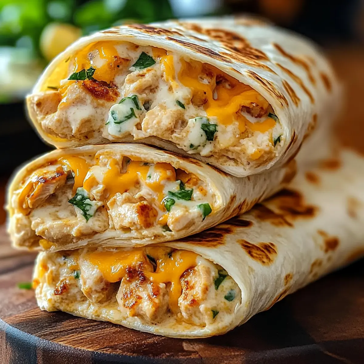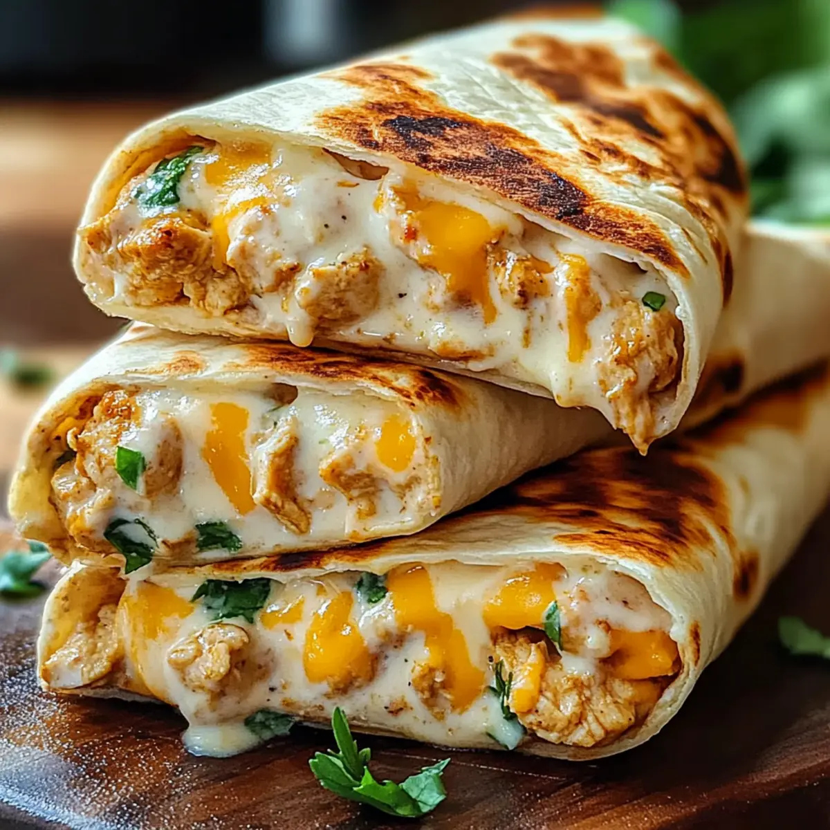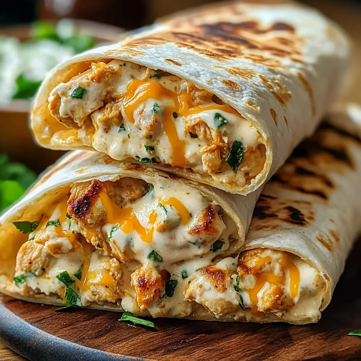 As I rummaged through my pantry one evening, the idea of a cheesy, garlicky meal literally wrapped itself around my mind. That’s how the Cheesy Garlic Chicken Wraps came to life—a quick and easy solution for those chaotic weeknights when time is tight, but deliciousness is non-negotiable. With juicy chicken enveloped in a rich garlic sauce and toasted in warm tortillas, these wraps offer an undeniable comfort, making them a family favorite. Not only are they customizable with different cheeses and toppings, but they’re also a breeze to prepare, creating the perfect option for meal prep. Now, who wouldn’t want a creamy, cheesy delight in every bite? Ready to whip these up for your next dinner adventure? Why Are These Wraps So Irresistible? Quick Preparation: These wraps can be ready in under 30 minutes, making them ideal for busy evenings. Customizable Delight: Choose your favorite cheeses and toppings—think fresh veggies or zesty sauces—to create your perfect wrap. Comforting Flavors: The creamy garlic sauce and melted cheese deliver that cozy, indulgent taste everyone craves. Family-Friendly Appeal: With a delicious blend of textures and flavors, these wraps are sure to please even the pickiest eaters—just like those Garlic Chicken Wraps you love! Meal Prep Ready: Make and store the chicken and sauce ahead of time for an even quicker assembly on hectic nights. Versatile Ingredients: swap chicken for turkey or add extra veggies like spinach for a nutritious twist! Cheesy Garlic Chicken Wraps Ingredients For the Chicken and Sauce • Boneless, Skinless Chicken Breasts – Cut into bite-sized pieces for even cooking. • Olive Oil – Cooking fat for sautéing; feel free to substitute with vegetable oil if needed. • Garlic – Freshly minced for the best flavor; this key component is a must for cheesy garlic chicken wraps! • Chicken Broth – Adds moisture and depth to the sauce; low-sodium options work well too. • Heavy Cream – Ensures a rich and creamy sauce; can be swapped for half-and-half for a lighter version. • Grated Parmesan Cheese – This brings a salty, cheesy flavor to the mix; other hard cheeses can be substituted. • Red Pepper Flakes – Optional for a kick; omit if you prefer a milder taste. • Dried Italian Herbs – Introduces flavor complexity; Italian seasoning can stand in nicely. • Salt & Pepper – Essential seasonings; adjust to your taste preference. For the Wraps • Large Tortillas (Flour or Whole Wheat) – The vessel for all your delicious fillings; opting for whole grain boosts nutrition! • Shredded Cheese (Cheddar, Monterey Jack, or Blend) – Melts beautifully to add creaminess; experiment with mozzarella or pepper jack for variety. Optional Toppings • Chopped Tomatoes – Freshness that contrasts beautifully with the warm wraps. • Shredded Lettuce – Adds a satisfying crunch; perfect for texture! • Sour Cream – Provides a creamy finish when serving; a great complement to the wrap’s flavors. • Guacamole – A creamy and tangy touch to elevate your wraps! Step‑by‑Step Instructions for CHEESY GARLIC CHICKEN WRAPS Step 1: Prepare the Chicken Begin by cutting boneless, skinless chicken breasts into bite-sized pieces and pat them dry with a paper towel. This helps them sear nicely. Heat 1 to 2 tablespoons of olive oil in a large skillet over medium-high heat until it shimmers, ready to embrace the chicken. Step 2: Sauté Garlic Once the oil is hot, add 2 to 3 cloves of freshly minced garlic to the skillet. Sauté for about 30 seconds, stirring frequently until fragrant and golden, ensuring the garlic doesn’t burn, which could make it bitter. Get ready for the delightful aroma to fill your kitchen! Step 3: Cook the Chicken Next, add the chicken pieces to the skillet. Cook them for about 5 to 7 minutes, stirring occasionally, until they’re browned and cooked through with an internal temperature reaching 165°F (75°C). The chicken should have a lovely golden crust, signaling it’s time for the next step. Step 4: Create the Sauce Pour in 1 cup of chicken broth over the cooked chicken, reducing heat to medium, and use a wooden spoon to scrape the bottom of the skillet, deglazing it to mix in all those rich flavors. Let it simmer for about 2 minutes, allowing the broth to meld with the chicken. Step 5: Add Cream and Cheese Lower the heat to medium-low, then slowly whisk in 1/2 cup of heavy cream and 1/2 cup of grated Parmesan cheese. Toss in red pepper flakes and dried Italian herbs for flavor complexity. Stir continuously for about 3 to 5 minutes until the sauce thickens nicely and coats the chicken evenly. Step 6: Warm the Tortillas While the sauce simmers, take a few large tortillas and warm them in a dry skillet over medium heat for about 30 seconds per side, or until they are pliable and slightly toasted. This enhances their flavor and prevents them from tearing when you wrap! Step 7: Assemble the Wraps On each warm tortilla, place a generous scoop of the cheesy garlic chicken mixture in the center. Sprinkle with 1/4 to 1/2 cup of shredded cheese, and add any optional toppings like chopped tomatoes or shredded lettuce to personalize your CHEESY GARLIC CHICKEN WRAPS. Step 8: Roll & Serve Carefully roll each tortilla tightly, starting from one end and tucking in the sides as you go to secure the filling. Cut in half if desired and serve immediately, perhaps with a dollop of sour cream or guacamole on the side for an extra touch of delight! Expert Tips for Cheesy Garlic Chicken Wraps Perfect Portioning: Avoid overcrowding the tortillas; filling them too much can lead to soggy wraps. Stick to about 1/2 cup of filling per tortilla. Toasted Tortillas: Warm the tortillas to enhance their flavor and pliability. Lightly toasting them helps prevent tearing during assembly. Versatile Cheese Choices: Experiment with various cheese types for different flavor profiles. Try adding pepper jack for heat or mozzarella for a mild