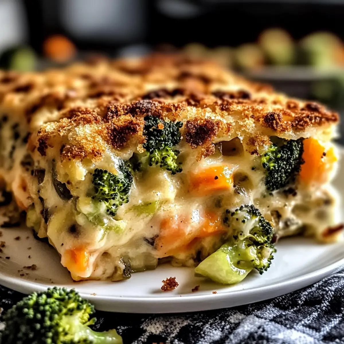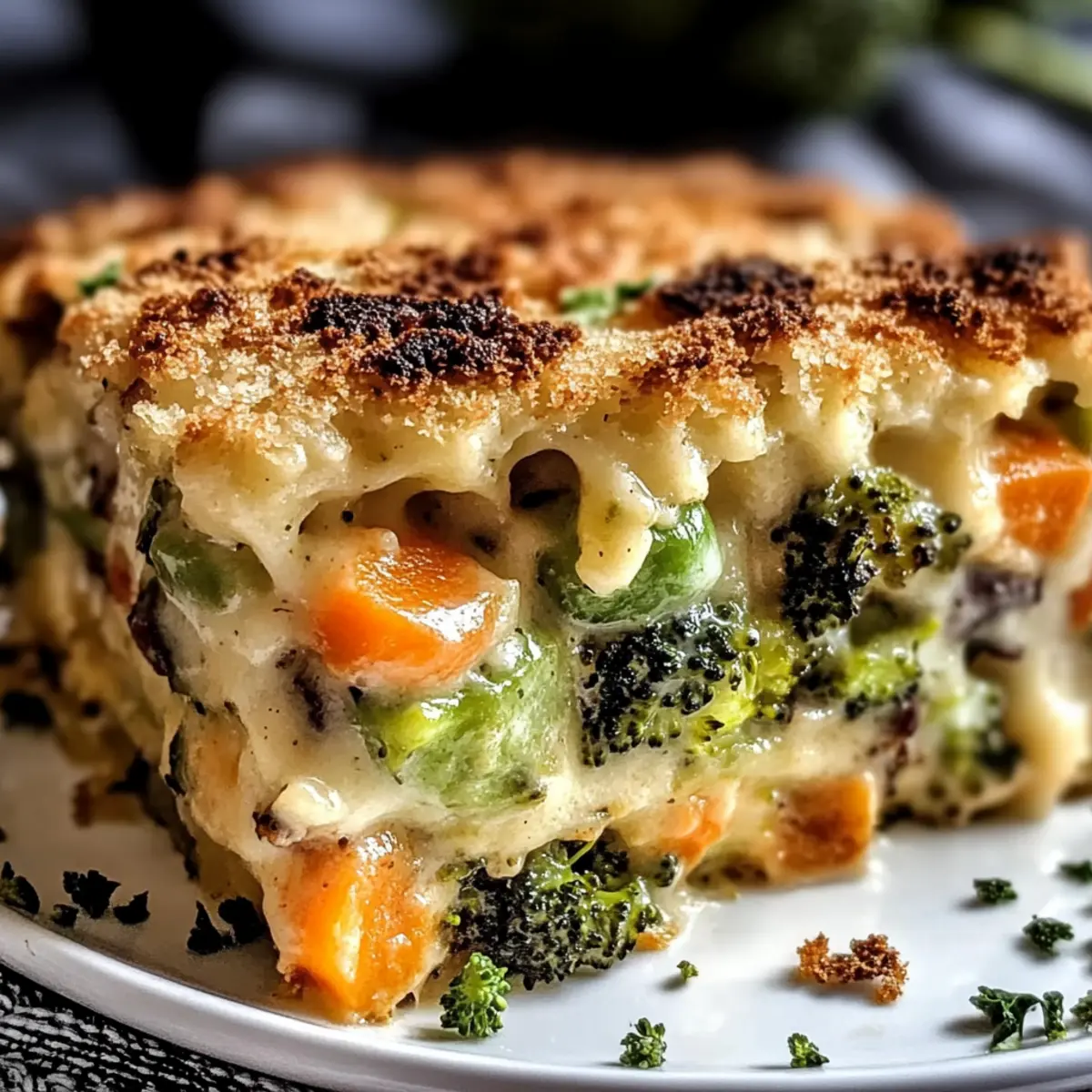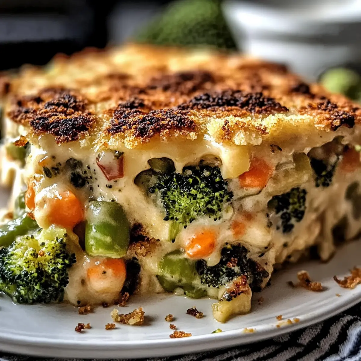 As the aroma of cheese wafts through the kitchen, I find myself transported back to my happiest family dinners. This Cheesy Vegetable Casserole combines the comfort of a warm hug with the joy of a customized meal that can adapt to my pantry’s whims. With its rich, velvety cheese sauce enveloping a colorful medley of fresh vegetables, this dish is perfect for bringing everyone together—whether it’s a hectic weeknight or a cozy Meatless Monday. Plus, it’s a breeze to whip up in under an hour, making weeknight cooking feel effortless. Not to mention, it’s a crowd-pleaser that even the pickiest eaters will devour. Are you ready to dive into a deliciously cheesy experience? Let’s get cooking! Why is this casserole a must-try? Comforting and satisfying, this Cheesy Vegetable Casserole is a warm embrace on your plate, perfect for any family dinner. Customizable to your taste, use whatever veggies you have handy, from broccoli to bell peppers—making it versatile and easy for any season. Quick to prepare, this dish comes together in under an hour, saving you precious time during busy weeknights. Crowd-pleasing, it guarantees smiles around the table, even from picky eaters who usually shy away from vegetables. Pair it with a fresh salad or serve it alongside Cheesy Baked Potatoes for a complete meal that will impress everyone! Cheesy Vegetable Casserole Ingredients For the Vegetables • Broccoli Florets – Adds texture and vibrant color; substitute with cauliflower if desired. • Cauliflower – Provides a sturdy base; optional to replace with additional broccoli. • Carrots – Contributes sweetness; can be swapped with parsnips for variation. • Zucchini – Offers moisture; should be sautéed or salted beforehand to improve texture. • Yellow Squash – Similar to zucchini; also needs pre-cooking. • Bell Peppers – Bring sweetness; all colors work beautifully. • Green Beans or Corn – Adds bite; frozen options can be used after thawing. • Spinach or Kale – Should be wilted and drained to avoid excess moisture. For the Cheese Sauce • Sharp Cheddar – Provides classic cheesy flavor; substitute with pepper jack for added spice. • Mozzarella – Adds creamy texture; essential for the cheese sauce mixture. • Gruyère – Introduces a nutty flavor; optional but enhances the richness. • Parmesan – For a crispy topping; optional but highly recommended. For the Roux • Butter – Essential for making the roux; can be swapped with olive oil if desired. • Flour – Used to thicken the sauce; gluten-free flour can be substituted. • Milk – Incorporates creaminess; almond or oat milk works for dairy-free versions. For the Topping • Breadcrumbs – Create a crispy topping; gluten-free options are available. Step‑by‑Step Instructions for Cheesy Vegetable Casserole Step 1: Preheat the Oven Start by preheating your oven to 375°F (190°C). This ensures it’s hot enough to bake the casserole evenly, giving you that delicious golden-brown topping. While the oven heats up, it’s a great time to gather all your ingredients and equipment, making the process smoother. Step 2: Prepare the Vegetables Chop a selection of vibrant vegetables like broccoli, cauliflower, carrots, zucchini, and bell peppers. Bring a pot of water to a boil and blanch the vegetables for 3-5 minutes until tender yet crisp. Drain them thoroughly to remove excess moisture, setting the stage for your Cheesy Vegetable Casserole to shine. Step 3: Make the Cheese Sauce In a medium saucepan, melt 4 tablespoons of butter over medium heat. Once melted, whisk in 4 tablespoons of flour, cooking for about 1 minute until bubbly. Gradually add 3 cups of warm milk while stirring constantly until the mixture thickens and bubbles, creating the perfect base for your creamy cheese sauce. Step 4: Add the Cheeses Reduce the heat to low and stir in 2 cups of shredded sharp cheddar, 1 cup of mozzarella, and optional gruyère cheese. Mix until the cheeses melt completely and the sauce is smooth. This rich cheese sauce will beautifully coat your vegetables, ensuring every bite of the Cheesy Vegetable Casserole is indulgent and satisfying. Step 5: Combine Vegetables and Cheese Sauce Grease a 9×13-inch baking dish with butter, creating a non-stick surface for your casserole. Fold the blanched vegetables into the cheese sauce, mixing gently until each piece is well-coated. This will create an even distribution of flavors throughout your Cheesy Vegetable Casserole. Step 6: Prepare the Topping In a small bowl, mix additional shredded cheese with breadcrumbs and melted butter for a crispy topping. This mixture will create a delightful contrast to the creamy center of your casserole, adding a layer of texture and flavor that will make your dish truly irresistible. Step 7: Assemble and Bake Pour the cheesy vegetable mixture into the prepared baking dish, smoothing the top for an even bake. Sprinkle the breadcrumb topping generously over the surface. Place the dish in the preheated oven and bake for 25-30 minutes until bubbly and golden brown. If the top browns too quickly, lightly tent it with foil. Step 8: Rest Before Serving Once baked, remove the Cheesy Vegetable Casserole from the oven and let it rest for about 10 minutes. This allows the dish to set, making slicing and serving easier while enhancing the flavors. Serve it warm, and prepare for the smiles around the table! Cheesy Vegetable Casserole: Exciting Variations Await! Invite your taste buds on a delightful journey with these fun twists on the classic dish, allowing you to create your perfect Cheesy Vegetable Casserole! Seasonal Vegetables: Swap out the veggies for whatever is in season, from fresh asparagus in spring to hearty butternut squash in autumn. Seasonal choices can elevate the flavors and nutrition! Grain Boost: Incorporate cooked quinoa or couscous for added heartiness. These grains bring a delightful texture and can turn your casserole into a one-p