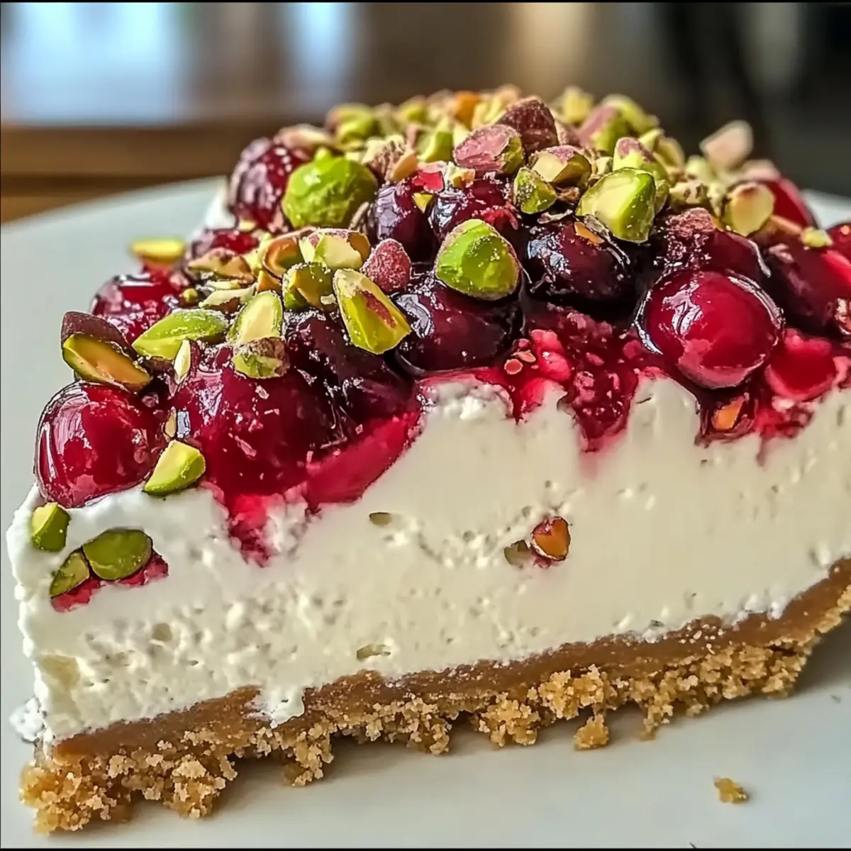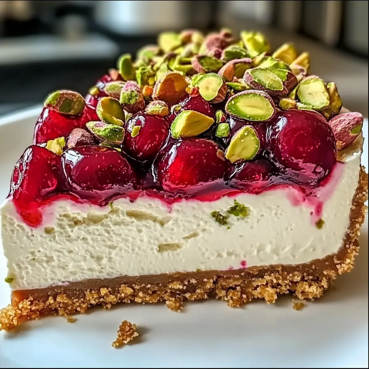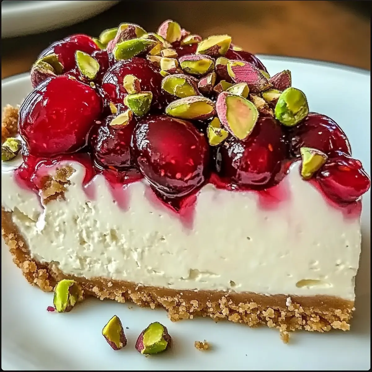 A delightful Cherry Pistachio Cheesecake that combines creamy filling, vibrant cherries, and crunchy pistachios, perfect for any occasion.