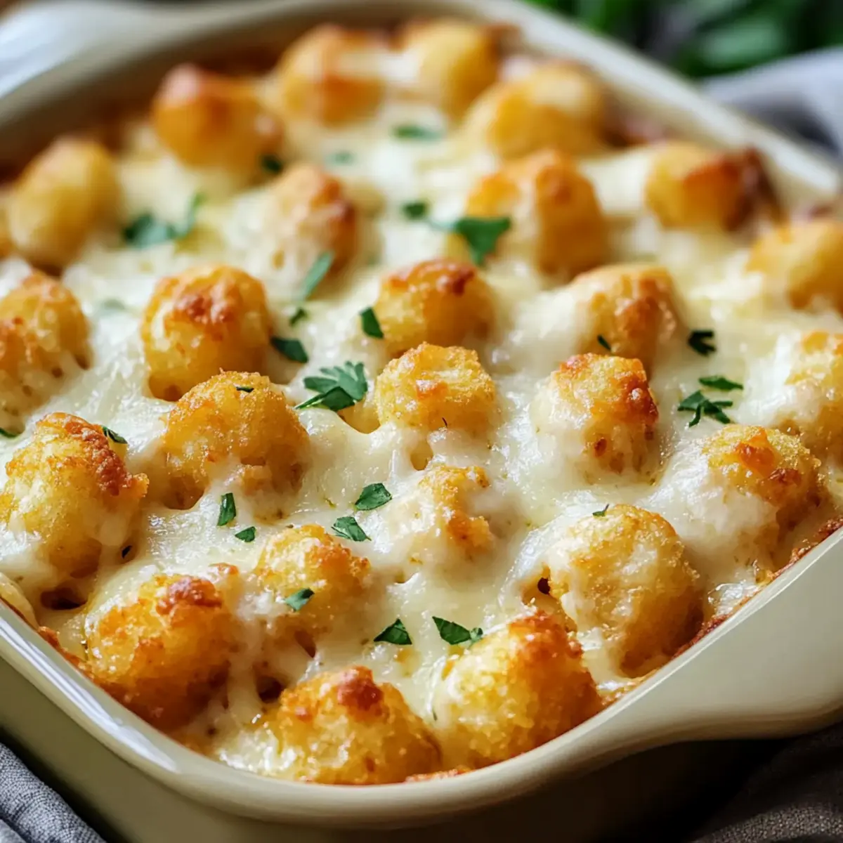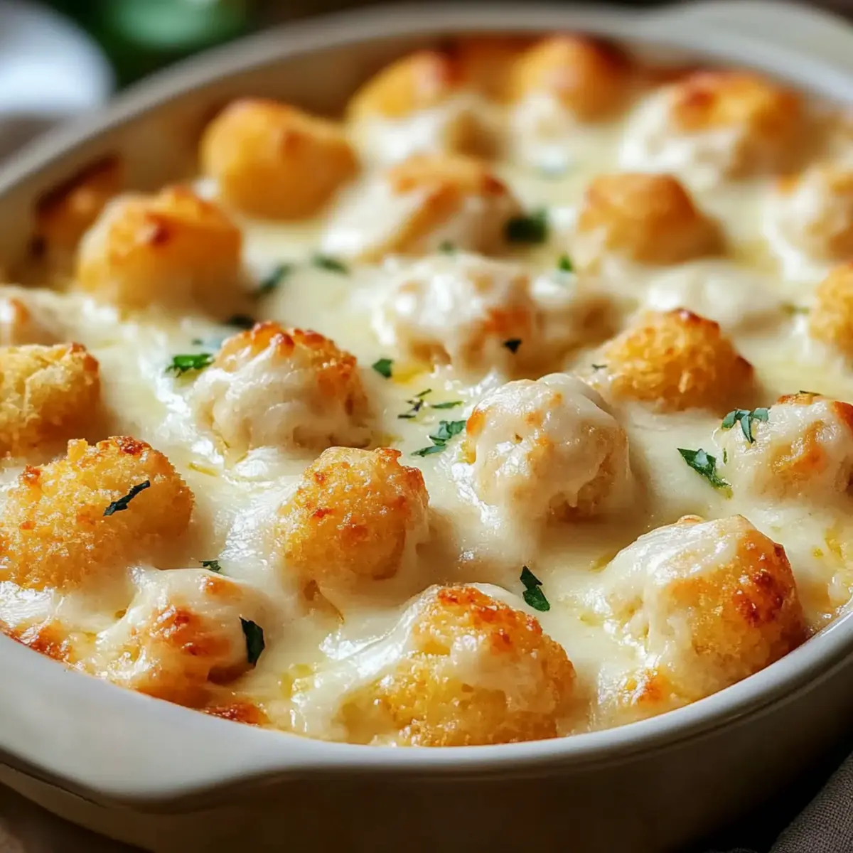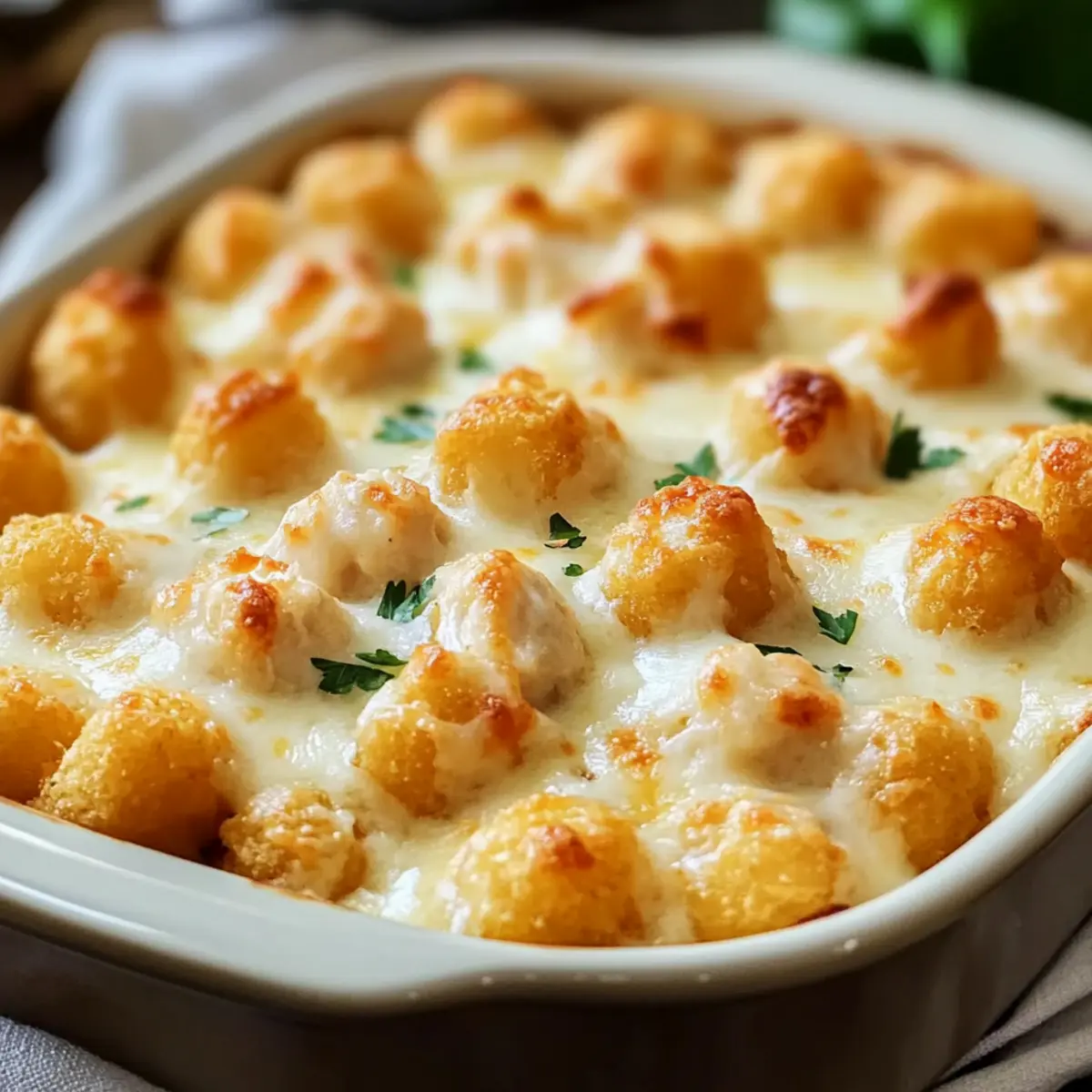 As I rummaged through my pantry one evening, a light bulb went off: why not combine two of my favorite comfort foods into one? That’s how this Chicken Alfredo Tater Tot Casserole was born! Imagine the delightful crunch of golden tater tots creating a contrast with the creamy, rich Alfredo sauce clinging to tender bites of chicken. What I adore about this dish is that it’s not just a quick weeknight wonder but also a flexible canvas for your culinary creativity. Whether you choose to toss in veggies or switch up the proteins, this casserole can easily accommodate different tastes and dietary needs. It promises to warm your heart and fill your belly—perfect for cozy family dinners or casual gatherings with friends. So, are you ready to dive into the ultimate comfort dish? Let’s get cooking! Why is this casserole so irresistible? Decadent, Creamy Goodness: This Chicken Alfredo Tater Tot Casserole delivers a rich, satisfying flavor that makes every bite feel like a warm hug. Quick and Convenient: With just one pan, you can whip up this delicious meal in under an hour, perfect for busy weeknights when time is short. Versatile Ingredients: Feel free to swap in seasonal veggies or your choice of proteins, making this dish adaptable to what you have on hand. Crowd-Pleaser: Whether it’s a family dinner or a gathering with friends, everyone will rave about this delightful combo of tater tots and Alfredo sauce, sparking joy at any table. Health-Conscious Options: You can easily make it gluten-free using certified tater tots, or sneak in some spinach for an extra nutrient boost. Enjoy this dish alongside Cheesy Chicken Enchiladas or a simple green salad for a well-rounded meal! Chicken Alfredo Tater Tot Casserole Ingredients For the Chicken • 1.5 lbs boneless, skinless chicken breasts – This is the main protein; consider substituting with rotisserie chicken or shrimp for convenience. • 1 tbsp olive oil – Essential for cooking the chicken; you can also use canola or avocado oil if preferred. For the Sauces • 1 medium onion, chopped – Adds flavor and sweetness; shallots work well if you’re looking for a milder taste. • 2 cloves garlic, minced – Enhances aroma and flavor; garlic powder can be a convenient substitute in a pinch. • 1 (10.75 ounce) can condensed cream of mushroom soup – Forms the creamy base of the sauce; substitute with cream of celery for a different flavor profile. • 1 (10 ounce) can condensed cream of chicken soup – Adds richness; if going vegetarian, more cream of mushroom can replace this. • 1 cup milk – Loosens the sauce; opt for almond or oat milk for a dairy-free twist. • 1/2 cup grated Parmesan cheese – Imparts a rich, cheesy flavor; for vegan options, use nutritional yeast. • 1/2 cup heavy cream – Creates a decadent sauce; use coconut cream for a dairy-free alternative. For the Assembly • 1/4 cup chopped fresh parsley – Brings freshness to the dish; dry parsley can be used in a pinch. • 1/4 tsp black pepper – Essential for seasoning; adjust based on your taste preferences. • 1/4 tsp salt – Vital for enhancing flavor; feel free to adjust according to dietary needs. • 1/2 cup shredded mozzarella cheese – Melts beautifully on top; mixing in cheddar adds an extra flavor dimension. • 4 cups cooked tater tots – The delightful crunchy topping; ensure they are certified gluten-free for a gluten-free version. • 1/2 cup shredded cheddar cheese (optional) – Adds extra richness; can be omitted if you’re avoiding dairy. Enjoy whipping up this Chicken Alfredo Tater Tot Casserole, a comforting dish that’s sure to become a family favorite! Step‑by‑Step Instructions for Chicken Alfredo Tater Tot Casserole Step 1: Preheat the Oven Start by preheating your oven to 375°F (190°C). This ensures the Chicken Alfredo Tater Tot Casserole cooks evenly and reaches that perfect golden finish. While the oven heats, you can prepare your chicken for cooking, allowing for a seamless transition into the next steps. Step 2: Cook the Chicken In a large skillet, heat 1 tablespoon of olive oil over medium heat. Cut 1.5 lbs of boneless, skinless chicken breasts into bite-sized pieces and add them to the skillet. Sauté the chicken for about 6-8 minutes, or until it is nicely browned and cooked through. Remove the chicken from the skillet and set it aside. Step 3: Sauté the Onions and Garlic Using the same skillet, add the chopped onion and sauté for 3-5 minutes until softened and translucent. Stir in 2 minced cloves of garlic and cook for an additional minute, until fragrant. This step infuses your Chicken Alfredo Tater Tot Casserole with delicious aromatic flavors. Step 4: Prepare the Sauce Next, stir in one 10.75-ounce can of condensed cream of mushroom soup and one 10-ounce can of condensed cream of chicken soup into the skillet with the onions and garlic. Pour in 1 cup of milk and add ½ cup of grated Parmesan cheese, along with ¼ cup of chopped fresh parsley, ¼ teaspoon of black pepper, and ¼ teaspoon of salt. Let it simmer for 5-7 minutes until the sauce thickens slightly. Step 5: Add Cream and Cheese Once your sauce mixture has thickened, blend in ½ cup of heavy cream and ½ cup of shredded mozzarella cheese. Stir until the cheese melts fully, creating a rich, creamy sauce. This will serve as the heart of your Chicken Alfredo Tater Tot Casserole. Step 6: Layer the Casserole Lightly grease a 9×13 inch baking dish to prevent sticking. Begin layering by pouring in half of the Alfredo sauce as the first layer, followed by the cooked chicken and then the remaining sauce. This layering system is key to flavor and ensures every bite is delicious! Step 7: Add the Tater Tots Now it’s time to top your Chicken Alfredo Tater Tot Casserole! Place 4 cups of cooked tater tots evenly across the top of the casserole. If desired, sprinkle ½ cup of shredded cheddar cheese over the tater tots for an extra cheesy finish. This crunchy toppi