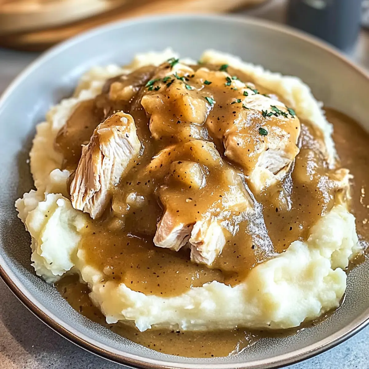 As I stood in my kitchen, the savory aroma of chicken sizzling in the skillet washed over me, transporting me back to cherished family dinners. This Comforting Chicken and Gravy over Fluffy Mashed Potatoes is the epitome of home-cooked love, perfect for satisfying those cozy, nostalgic cravings. With just a few simple ingredients and minimal prep time, you can create an irresistible dish that’s sure to become a weekly favorite. Not only is it a hit with friends and family, but its versatility allows you to serve it over rice or egg noodles for a fun twist. Whether you’re looking for an easy weeknight meal or a heartwarming dish to share, this recipe has you covered. Want to discover how to whip up this comforting classic? Let’s dive in! Why is Chicken and Gravy a Must-Try? Comforting, Homemade Goodness: There’s nothing quite like this creamy dish to bring warmth to your table. Simple Ingredients: Made with everyday staples, you can quickly whip it up without spending hours in the kitchen. Versatile Serving Options: Whether it’s over fluffy mashed potatoes, rice, or egg noodles, each bite is deliciously satisfying. Family-Friendly Appeal: This dish pleases even the pickiest eaters, making it perfect for gatherings. Need more ideas? Consider pairing it with Garlic Butter Chicken or try the Cheesy Chicken Enchiladas for a different flavor twist! Chicken and Gravy Ingredients • Get ready to make a comforting classic! For the Chicken Chicken Breasts – Main protein for this Chicken and Gravy dish; boneless and skinless works best for quick cooking. Kosher Salt – Enhances flavor; substitute with sea salt or table salt, but use less quantity. Black Pepper – Adds a delightful spice; use freshly ground for the best taste. Olive Oil – Ideal for cooking chicken; vegetable or canola oil can also be used. For the Gravy Chicken Stock – Forms the base of your rich gravy; homemade is preferred, but low-sodium canned stock is a great alternative. Water – Thins out the gravy; adjust the amount based on your desired consistency. Heavy Cream – Adds luxurious richness; you can substitute it with half-and-half or omit it for a lighter option. For Serving Mashed Potatoes – The perfect base for this chicken and gravy; you can choose between instant or homemade for convenience! Step‑by‑Step Instructions for Chicken and Gravy Step 1: Season the Chicken Begin by seasoning each boneless, skinless chicken breast with kosher salt and freshly ground black pepper on both sides. Make sure you cover them generously to enhance the flavor. This step is crucial for your Chicken and Gravy, as it sets the foundation for a deliciously savory dish. Step 2: Heat the Oil In a large skillet, heat about 2 tablespoons of olive oil over medium heat for approximately 2 minutes until shimmering. This temperature is ideal for sautéing, allowing the chicken to brown nicely. You’ll know the skillet is ready when the oil glistens—perfect for achieving that golden color on the chicken. Step 3: Cook the Chicken Carefully add the seasoned chicken breasts to the hot skillet and cook for about 5 minutes on each side, or until they reach an internal temperature of 165℉. The outside should be golden brown and the juices running clear. Avoid overcrowding the pan to ensure even cooking; you might need to do this in batches. Step 4: Create the Gravy Base Once the chicken is cooked, remove it from the skillet and set it aside on a plate. In the same skillet, gradually pour in 2 cups of chicken stock, scraping up any tasty browned bits from the bottom with a wooden spoon. This will enrich your gravy. Let it simmer for a few minutes to meld the flavors. Step 5: Thicken the Gravy To your gravy, whisk in enough water to achieve your desired consistency, typically about 1 cup, making sure to eliminate any lumps. Continue to cook over medium heat, stirring occasionally, for about 5–7 minutes until the gravy thickens slightly. You’ll want it to coat the back of a spoon for that perfect chicken and gravy texture. Step 6: Add Cream for Richness If you’re looking for an extra touch of luxury in your Chicken and Gravy, stir in 1/2 cup of heavy cream at this stage. This is optional, but it adds a wonderful richness to the gravy. Allow it to bubble gently for another 2–3 minutes, adjusting thickness with additional water if necessary. Step 7: Combine Chicken and Gravy Shred the cooked chicken if desired, then return it to the gravy in the skillet. Allow it to simmer together for an additional 2–3 minutes, ensuring the chicken is heated through and coated in that delicious sauce. This step transforms your meal into a heartwarming dish filled with comfort. Step 8: Serve with Mashed Potatoes Finally, serve the luscious Chicken and Gravy generously over a bed of warm, fluffy mashed potatoes. Each bite will meld the savory richness with the creamy texture of the potatoes. For an elevated meal, you can add peas or serve it alongside some crispy garlic bread for a complete comfort food experience. Make Ahead Options These Chicken and Gravy over Fluffy Mashed Potatoes are perfect for meal prep, allowing you to savor comfort food even on the busiest nights! You can season and cook the chicken up to 24 hours in advance; simply store it in an airtight container in the refrigerator. The gravy can also be prepared ahead and refrigerated for up to 3 days; just reheat gently over low heat, adding a splash of water to restore its silky texture. When ready to serve, combine the chicken with the gravy, heat through, and serve over freshly made mashed potatoes for a comforting meal that feels just as good as when you made it fresh! What to Serve with Comforting Chicken and Gravy over Fluffy Mashed Potatoes Cozy up your dining experience with delightful pairings that elevate this delicious comfort food classic. Garlic Bread: Perfect for mopping up that luxurious gravy, adding crunch alongside a soft interior. A warm, buttery touch comp