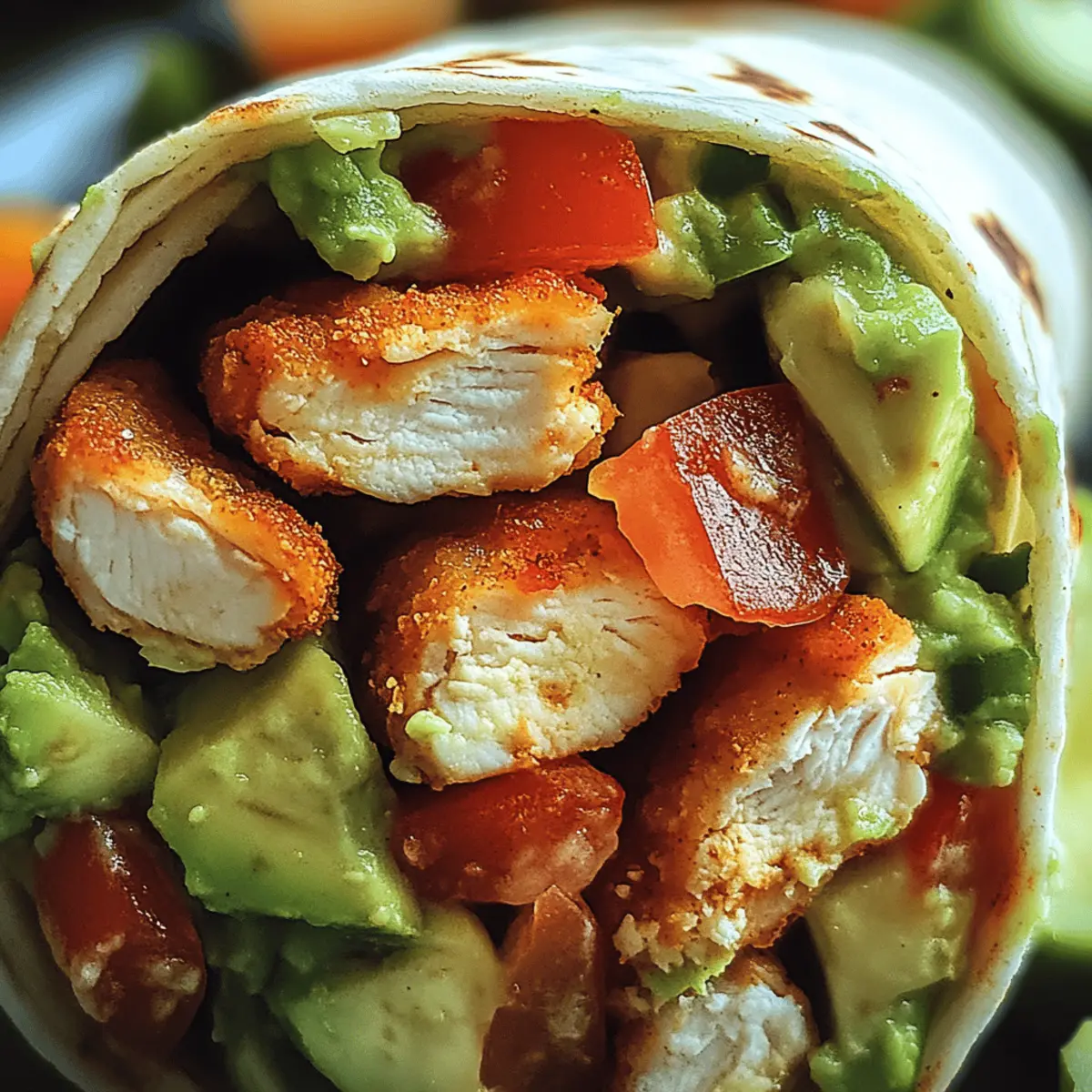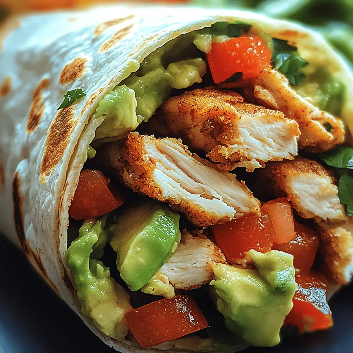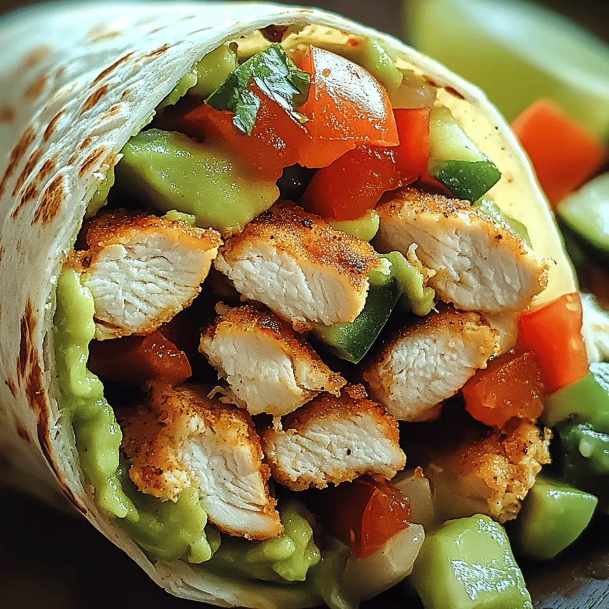 As I stood in my kitchen, the vibrant colors of fresh ingredients quickly drew me in—a vision of health and flavor dancing before my eyes. Today, I’m excited to share my go-to recipe for a Chicken Avocado Wrap that’s not just nutritious but also incredibly easy to customize. This delightful wrap blends tender, juicy chicken with creamy avocado, all cozied up in a soft tortilla. Perfect for those bustling weekdays or a light dinner, this meal is both satisfying and a fantastic way to sneak in some healthy components without feeling weighed down. Plus, because the Chicken Avocado Wrap can be tailored to your personal taste, you’ll never have a boring meal! Ready to explore how you can make it your own? Let’s dive in! Why Will You Love This Wrap? Flavorful, Each bite bursts with the deliciousness of tender chicken and creamy avocado, creating a flavor experience you’ll crave! Customizable, Whether you prefer a spicy kick with chipotle ranch or a refreshing zest with lemon tahini, this wrap allows you to mix and match ingredients. Nutrient-Packed, With lean protein and healthy fats, it’s a satisfying choice that keeps you energized throughout your busy day. Pair it with some sweet potato fries for the perfect balance! Quick and Easy, Whip it up in under 30 minutes—ideal for anyone looking for a light meal without sacrificing taste. Enjoy a Twist, Don’t hesitate to explore variations, like switching chicken for grilled tofu or adding crunchy bell peppers for extra texture. For more ideas, you may also enjoy my Cheesy Chicken Enchiladas to add variety to your dining routine! Chicken Avocado Wrap Ingredients For the Wrap • Chicken Breast – Provides a savory protein base; grilling or roasting will enhance the flavor. • Avocado – Adds creamy texture and healthy fats; substitute with hummus for a vegan version. • Tortilla – Serves as the wrap; opt for whole wheat or gluten-free options for dietary needs. • Lettuce – Adds crunch and freshness; spinach or arugula can be used for a different twist. • Tomato – Contributes juiciness and acidity; cherry tomatoes are great for a sweet touch. • Cucumber – Offers a refreshing crunch; swap it for bell peppers to mix things up. • Lime Juice – Brightens flavors with a zesty kick; lemon juice works as a good alternative. For the Dressing (Optional) • Light Vinaigrette or Yogurt Dressing – Ties all flavors together; choose a light option to keep it healthy. Whether you’re looking to enjoy a delicious Chicken Avocado Wrap or want to experiment with your own flavors, these ingredients make it all possible! Step‑by‑Step Instructions for Chicken Avocado Wrap Step 1: Prepare Chicken Start by seasoning your chicken breast with salt, pepper, and any preferred spices. Heat a grill or skillet over medium heat and cook the chicken for about 6-7 minutes per side, or until the internal temperature reaches 165°F (75°C). Let the chicken rest for a few minutes before slicing it into thin strips for your Chicken Avocado Wrap. Step 2: Prep Veggies While the chicken is resting, wash and chop your fresh vegetables. Slice the lettuce into bite-sized pieces, halve the tomatoes if using cherry tomatoes, and chop the cucumber into thin slices. This vibrant medley will add texture and flavor to your wrap, making it loaded with freshness. Step 3: Mash Avocado In a small bowl, scoop out the ripe avocado and mash it with a fork until creamy. Squeeze in fresh lime juice to taste, mixing well until smooth. This flavorful avocado spread will lend a creamy richness to your Chicken Avocado Wrap, balancing the other ingredients beautifully. Step 4: Assemble Wrap Lay your tortilla flat on a clean surface. Start by spreading a generous layer of the mashed avocado in the center, then layer the sliced chicken, lettuce, tomatoes, and cucumber on top. Make sure to leave room at the edges so the wrap can be rolled easily—this is key to a tidy Chicken Avocado Wrap! Step 5: Roll Up Wrap Begin rolling the tortilla tightly from one end, tucking in the sides as you go to enclose the filling. Once rolled, slice the Chicken Avocado Wrap in half diagonally using a sharp knife. If necessary, secure the halves with toothpicks to keep everything perfectly nestled inside for serving. What to Serve with Chicken Avocado Wrap Imagine a light meal that invites vibrant flavors and enticing textures to your table, perfectly complementing this dish’s wholesome goodness. Sweet Potato Fries: Crispy on the outside and soft inside, they add a satisfying crunch that balances the wrap’s creamy avocado. Garden Salad: A medley of fresh greens and colorful veggies fill this light option with a refreshing crunch, creating a lovely contrast with each bite. Toss in a zesty vinaigrette for extra brightness. Quinoa Salad: Nutty and nutritious, quinoa offers a delightful texture and can be paired with lemon, herbs, and veggies, elevating your meal’s overall freshness. Fruit Salad: A bowl of mixed seasonal fruits brings sweetness and a splash of color, cleansing your palate wonderfully between savory bites. Chips and Guacamole: Add some crispy tortilla chips to the mix! The crunchiness contrasts beautifully with the wrap’s tender contents, while guacamole echoes your main dish’s creamy theme. Herbal Iced Tea: A refreshing drink infused with mint or lemon complements the light flavors of the wrap, enhancing the overall experience. Opt for any of these pairings to create a fulfilling and delightful meal alongside your Chicken Avocado Wrap that everyone will love! Expert Tips for Chicken Avocado Wrap Juicy Chicken: Ensure your chicken is cooked through and juicy; a meat thermometer is your best friend for accurate cooking! Don’t Overfill: Avoid a mess by not overstuffing your wrap. Aim for a balanced amount of ingredients for a tidy roll. Freshness Matters: Use fresh ingredients for vibrant flavors; stale tortillas or overripe veggies can ruin your Chicken Avocado Wr
