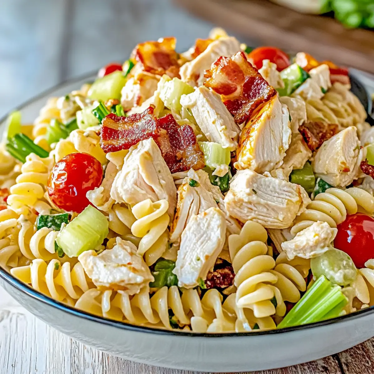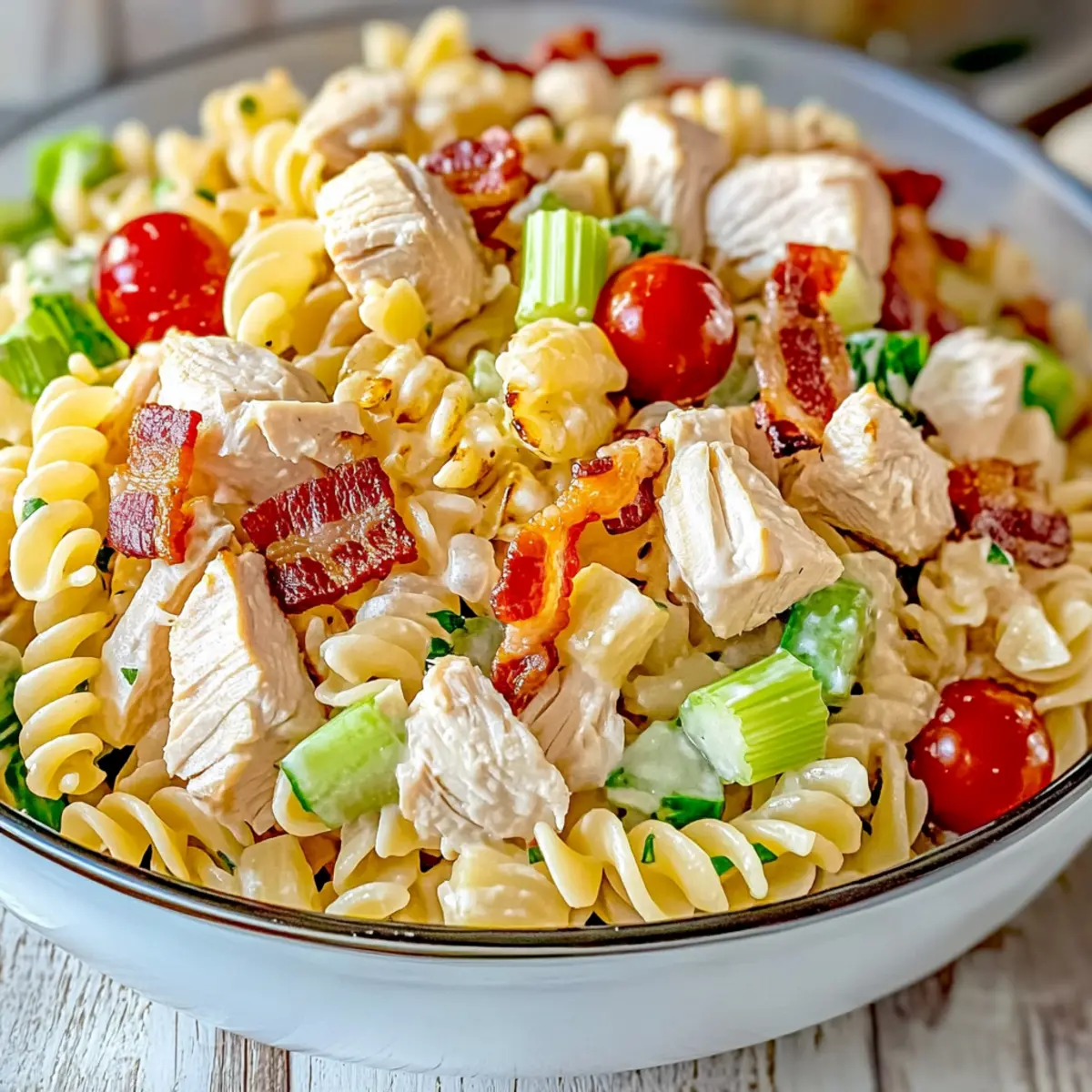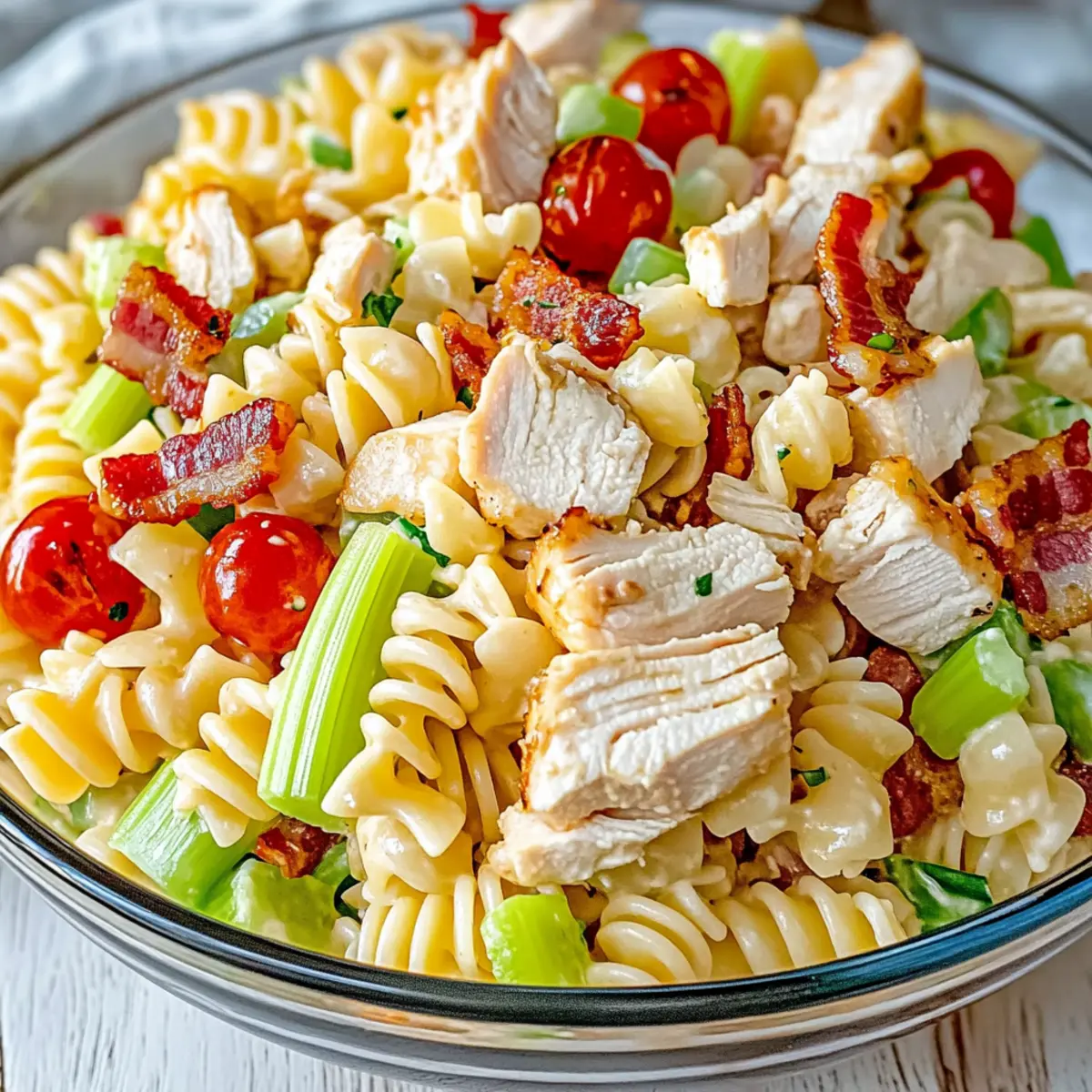 As I stood in my kitchen, a colorful bounty of fresh ingredients caught my eye, promising something delightful—a Chicken Club Pasta Salad! This dish sings of summer with its tender chicken, crispy bacon, and vibrant vegetables. It’s the perfect crowd-pleaser for potlucks or a light lunch that keeps you feeling satisfied without the heaviness. The beauty of this recipe lies in its versatility; you can easily customize it to suit your taste or dietary needs. Whether you choose to swap ingredients for a fun twist or stick to classic flavors, it’s a real gem for meal prep. So, what are you waiting for? Let’s dive into a salad that celebrates fresh tastes and simple joy! Why is Chicken Club Pasta Salad a Must-Try? Versatile and Customizable: This Chicken Club Pasta Salad adapts beautifully to your taste preferences; swap in grilled shrimp, chickpeas, or your favorite veggies. Crowd-Pleaser: Perfect for gatherings, it’s a dish that everyone loves—guaranteed to impress at BBQs or potlucks! Quick Prep: With only a few steps and minimal cooking time, you’ll have a delightful meal ready in no time. Healthy and Satisfying: Featuring lean protein and colorful veggies, this salad is not only delicious but also light, allowing for guilt-free indulgence. Make-Ahead Friendly: Prep this salad in advance for effortless meal planning. Try pairing it with warm garlic bread or a refreshing fruit salad for a complete meal! Chicken Club Pasta Salad Ingredients For the Pasta • Corkscrew-shaped pasta – Perfect for holding all the delicious dressings and ingredients, but feel free to substitute with any pasta shape you prefer! For the Dressing • Italian-style salad dressing – Adds that zesty kick; consider making it homemade for a flavor boost. • Mayonnaise – Brings creaminess to the salad; swap for low-fat mayo or Greek yogurt for a lighter touch. For the Salad • Chopped rotisserie chicken – A tasty protein source; leftover grilled chicken or turkey is a fantastic alternative. • Crispy cooked bacon – Delivers a savory crunch; turkey bacon is an excellent lighter option, or omit it for a vegetarian twist. • Cubed Muenster cheese – Contributes rich flavor; cheddar or mozzarella work well as substitutes. • Chopped celery – Offers crunch; consider bell peppers for a different texture and taste. • Chopped green bell pepper – Adds sweetness; mix with other colorful peppers or omit if you prefer. • Cherry tomatoes – Provide juiciness and color; use grape or diced tomatoes as mild alternatives. • Avocado – Offers healthy fats and creaminess; add just before serving for freshness and to avoid browning. Step‑by‑Step Instructions for Chicken Club Pasta Salad Step 1: Cook Pasta Bring a large pot of salted water to a rolling boil. Add the corkscrew-shaped pasta and cook for 8-10 minutes, or until al dente. You’ll know it’s ready when it’s firm yet tender to the bite. Once cooked, drain the pasta and rinse it under cold water to stop the cooking process and cool it down for the Chicken Club Pasta Salad. Step 2: Make Dressing In a spacious mixing bowl, combine the Italian-style salad dressing and mayonnaise. Whisk them together until the mixture is smooth and creamy, ensuring an even distribution of flavors. This homemade dressing will coat the Chicken Club Pasta Salad perfectly, contributing to its delightful taste and texture. Step 3: Combine Ingredients Once the pasta has cooled, add it to the bowl with the dressing. Next, mix in the chopped rotisserie chicken, crispy bacon, cubed Muenster cheese, and chopped celery. Then, toss in the green bell pepper, cherry tomatoes, and avocado. Gently stir all the ingredients together until everything is evenly coated in the dressing, creating a colorful and enticing Chicken Club Pasta Salad. Step 4: Chill Cover the bowl with plastic wrap or transfer the Chicken Club Pasta Salad to an airtight container. Refrigerate for at least 30 minutes. Chilling the salad allows the flavors to meld beautifully, enhancing the overall taste. When ready to serve, give it a gentle stir to re-coat before enjoying this fresh and tasty dish. Step 5: Serve and Enjoy Once chilled, serve your Chicken Club Pasta Salad in bowls or on plates. For an appealing presentation, garnish with extra cherry tomatoes or avocado slices if desired. Pair it with warm garlic bread, grilled veggies, or a refreshing fruit salad for a complete and satisfying meal that will please a crowd. Expert Tips for Chicken Club Pasta Salad • Choose the Right Pasta: Use corkscrew-shaped pasta to hold onto dressing and ingredients better. Remember to rinse it after cooking to avoid sticking. • Mix Dressings Separately: Whisk together the Italian dressing and mayonnaise individually to ensure an even distribution of flavors throughout the Chicken Club Pasta Salad. • Add Avocado Last: To keep the avocado fresh and vibrant, add it just before serving. This prevents browning and maintains the salad’s colorful appeal. • Use Fresh Ingredients: Fresh vegetables not only provide superior crunch but also enhance the overall flavor of the dish, keeping your Chicken Club Pasta Salad appealing and light. • Storage Savvy: Store in an airtight container for 3-4 days. If the avocado browns, it’s best to discard that portion, maintaining the salad’s fresh look and taste. How to Store and Freeze Chicken Club Pasta Salad Fridge: Store your Chicken Club Pasta Salad in an airtight container for up to 3-4 days. This helps maintain freshness and flavor. Prepping Ahead: You can prepare the pasta and dressing up to 24 hours in advance. Just keep them separate until you’re ready to combine for the best taste. Avocado Tip: Always add avocado just before serving to prevent browning. If stored already mixed, check for any browning and discard that portion before serving. Freezer: Freezing is not recommended due to potential texture changes, particularly with the creamy avocado and fresh 