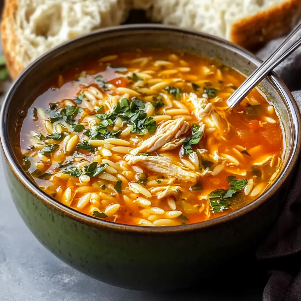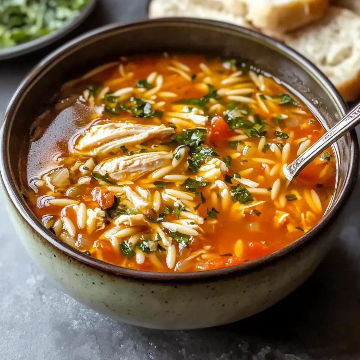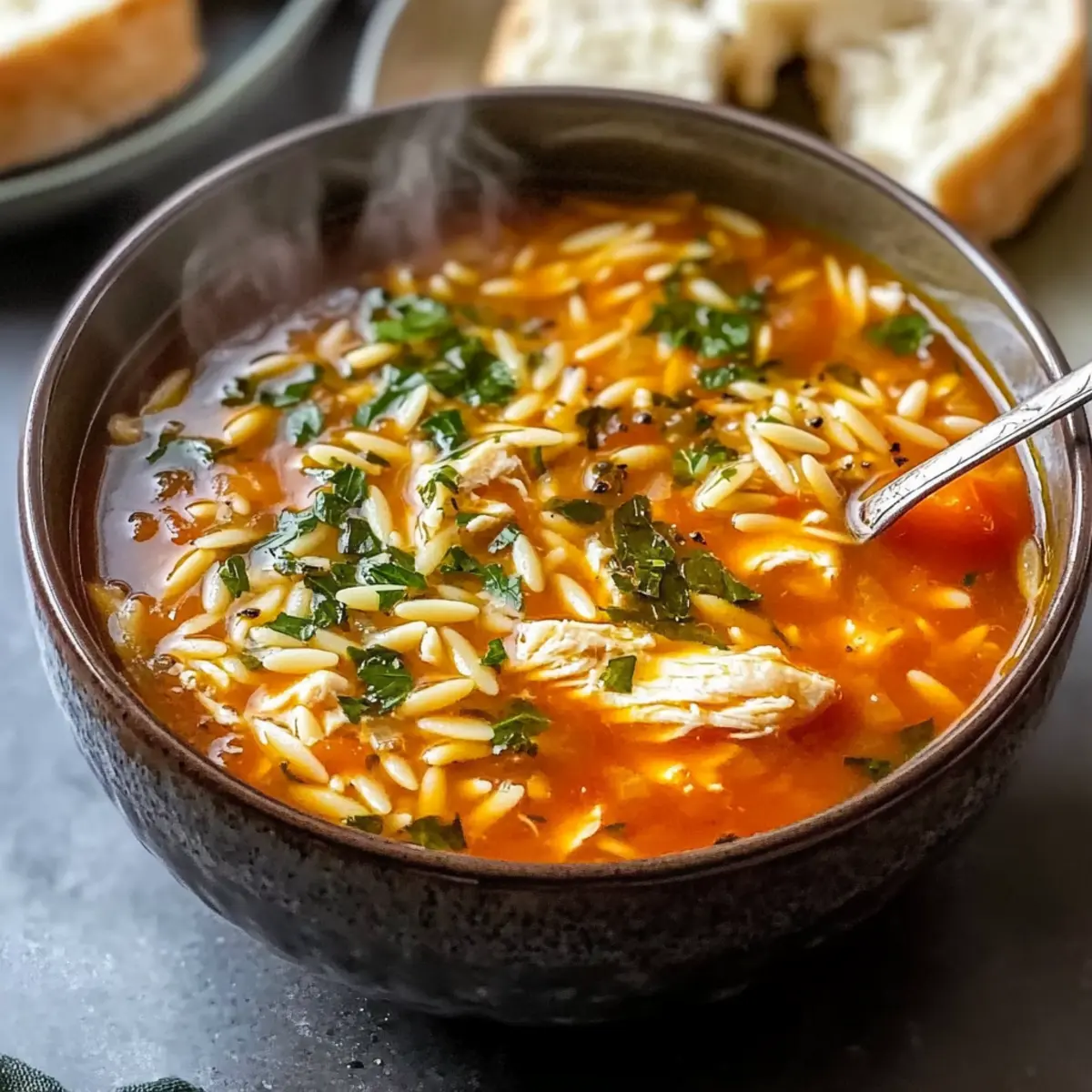A warm, inviting aroma wafts through my kitchen as I prepare my go-to comfort dish: Chicken Orzo Tomato Soup. This heartwarming bowl is more than just soup; it’s a soothing escape from the hustle and bustle of everyday life. Packed with tender shredded chicken, delightful orzo pasta, and a rich tomato base seasoned with garlic and Italian herbs, it’s the perfect answer for those busy weeknights or a cozy weekend meal. Plus, this recipe is wonderfully low in calories without sacrificing any of the warmth and flavor you crave. Trust me, it’s a comfort food that can be whipped up in a flash! Are you ready to fill your bowl with this simple, yet satisfying delight? Why Is This Soup a Must-Try? Comforting, this Chicken Orzo Tomato Soup wraps you in warmth, making it the perfect antidote to a long day. Quick to prepare, you’ll have this satisfying meal on the table in just 30 minutes, making it ideal for busy weeknights. Low-calorie goodness means you can indulge without guilt, while still enjoying a hearty bowl of flavor. Versatile options allow you to easily customize it—swap out chicken for beans or use different pasta shapes! Plus, this recipe’s vibrant colors and rich aromas ensure it’s a crowd-pleaser, perfect for family dinners or casual gatherings. Get ready to cozy up with a bowl that feels like a hug! Chicken Orzo Tomato Soup Ingredients For the Soup Base Olive Oil – Adds richness and helps sauté garlic; can use vegetable oil if preferred. Garlic – Provides aroma and flavor base; fresh garlic is recommended for the best flavor. Tomato Paste – Enhances tomato flavor and adds richness; consider using crushed tomatoes for a chunkier soup. Italian Seasoning – Delivers a blend of herbs that enhance the dish’s aroma; substitute with fresh herbs like basil or oregano for freshness. Chicken Broth – Forms the soup base, adding depth; substitute with vegetable broth for a vegetarian version. For the Pasta and Chicken Orzo Pasta – Primary carb that absorbs the soup’s flavors; note that other small pasta shapes, like ditalini, can be used. Shredded Chicken – Essential protein source; rotisserie chicken works great for convenience, just shred or cube it. For the Creamy Finish Heavy Cream – Adds a luscious texture and richness; coconut milk is an excellent dairy-free substitute. Lemon Juice – Brightens flavors and balances richness; freshly squeezed lemon provides the best taste. Toppings (Optional) Parmesan Cheese – Adds savory depth; sprinkle on just before serving for a rich finish. Fresh Herbs (such as parsley or basil) – Enhance flavor, color, and freshness—add just before serving for maximum impact. Red Pepper Flakes – Optional for a kick of heat; adjust to taste for a spicy finish. Gather these ingredients for the ultimate Chicken Orzo Tomato Soup experience, and you’ll understand why it’s a comforting classic! Step‑by‑Step Instructions for Chicken Orzo Tomato Soup Step 1: Sauté Garlic In a large pot, heat 2 tablespoons of olive oil over medium-high heat. Once shimmering, add 4 minced garlic cloves, stirring frequently for about 2 minutes until the garlic is fragrant and softened, but not browned. This step builds the delicious flavor base for your Chicken Orzo Tomato Soup. Step 2: Add Tomato Paste & Seasoning Stir in 3 tablespoons of tomato paste and 1 tablespoon of Italian seasoning, allowing the mixture to cook for 5 minutes. As the tomato paste caramelizes, it will deepen in color and aroma, creating a rich backdrop for your soup. Keep stirring to ensure it doesn’t stick to the bottom of the pot. Step 3: Incorporate Broth Gradually pour in 6 cups of chicken broth while stirring continuously to mix. Bring the mixture to a gentle boil, then season with salt to taste. The broth should enrich the soup, creating a robust and savory foundation for your Chicken Orzo Tomato Soup. Lower the heat to a simmer. Step 4: Cook Orzo Add 1 cup of orzo pasta to the simmering soup and gently stir. Let it cook uncovered for about 10 minutes or until the orzo is al dente and tender, stirring occasionally to prevent sticking. You’ll notice the pasta absorbing the delicious flavors, creating a heartwarming texture in the soup. Step 5: Finish Soup After the orzo is cooked, lower the heat and add 2 cups of shredded chicken and 1/2 cup of heavy cream. Stir to combine everything well, letting the chicken warm through and the cream create a silky finish. Finally, squeeze in the juice of half a lemon to brighten the soup’s rich flavors. Step 6: Serve Ladle the Chicken Orzo Tomato Soup into bowls, and optionally garnish with freshly grated Parmesan cheese, chopped herbs, and a sprinkle of red pepper flakes for added flavor. This comforting bowl is best served warm, and pairing it with crusty bread makes for a delightful meal. Storage Tips for Chicken Orzo Tomato Soup Fridge: Store Chicken Orzo Tomato Soup in an airtight container for up to 3 days. Let the soup cool completely before sealing to preserve freshness. Freezer: For longer storage, portion the soup into freezer-safe containers or bags. It can be frozen for up to 2 months. Be sure to leave some space for expansion as it freezes. Thawing: To enjoy, thaw overnight in the fridge or use the microwave for quicker defrosting. Always stir well after thawing to ensure an even texture. Reheating: When reheating, do so gently on the stove over low heat while stirring, adding a splash of broth or water if needed to maintain creaminess in your Chicken Orzo Tomato Soup. Chicken Orzo Tomato Soup Variations Feel free to play with this recipe and take it to new heights of deliciousness! Vegetarian Swap: Substitute shredded chicken with a mix of beans or diced vegetables like zucchini and bell peppers for a hearty vegetarian soup. This allows for a beautiful burst of colors and textures while keeping it comforting. Pasta Twist: Use small-shaped pasta such as ditalini or even rice for a fun texture difference. Each 