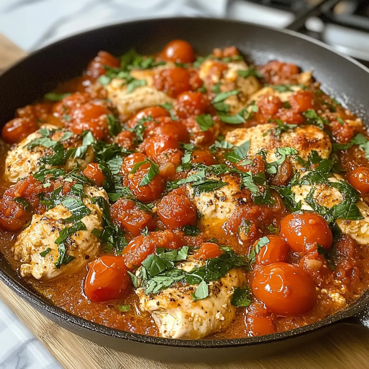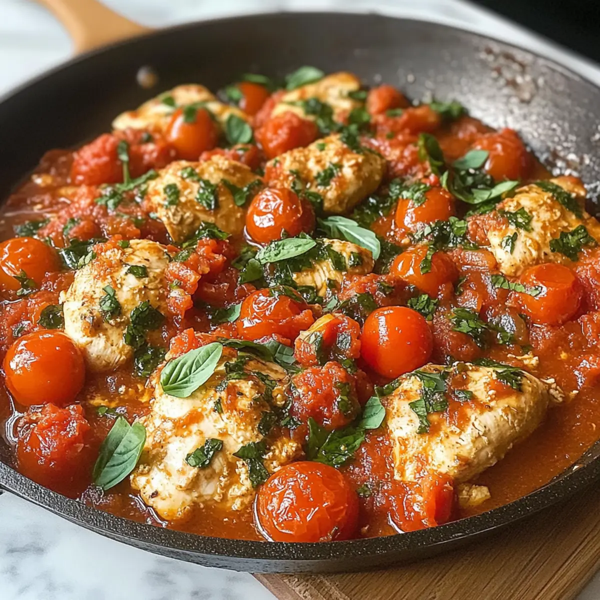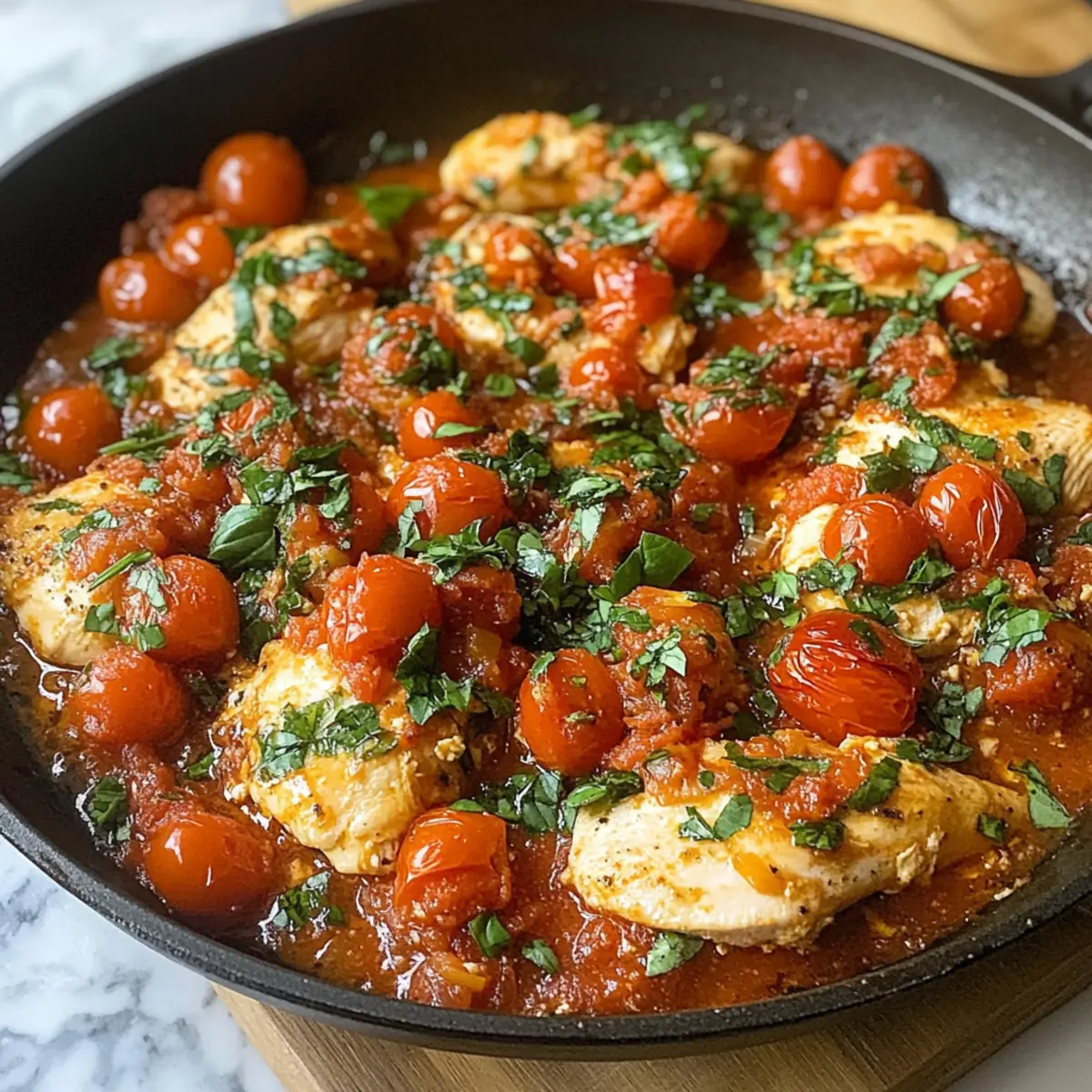 The aroma of sizzling chicken mingling with ripe tomatoes and fragrant herbs can transform any kitchen into an Italian trattoria, don’t you think? That’s exactly the experience you’ll find with my Healthy Chicken Pomodoro Skillet. This vibrant, one-pan meal combines juicy chicken with fresh tomatoes, Italian herbs, and of course, that hint of garlic that makes everything better. Not only is it a quick dinner solution for those bustling weeknights, but it also requires minimal cleanup—who doesn’t love that? Plus, you can easily serve it over your favorite pasta or alongside some crusty bread, making it the perfect option to please the whole family. Are you ready to dive into a delightful dinner that transports you to the heart of Italy? Why Is Chicken Pomodoro Skillet A Must-Try? Quick and Easy: This dish is ready in just 30 minutes, making it the perfect choice for busy weeknights. One-Pan Wonder: Enjoy minimal cleanup while receiving all the flavors and nutrients you crave. Vibrant Flavors: Fresh tomatoes, Italian herbs, and garlic create a deliciously aromatic sauce that pairs beautifully with chicken. Customizable: Easily adjust ingredients to suit your taste or dietary needs—think vegetarian or lighter alternatives! If you love quick meals, you might also enjoy Garlic Butter Chicken or Caribbean Chicken Rice. Crowd-Pleaser: Perfect for family dinners and entertaining friends, everyone will enjoy this tasty Italian classic! Chicken Pomodoro Skillet Ingredients For the Chicken • Chicken Breasts – Juicy protein source that cooks quickly; substitute with chicken thighs for a richer flavor or firm tofu/tempeh for a vegetarian option. For the Sauce • Cherry Tomatoes – Adds sweetness and color; substitute with canned diced tomatoes or halved grape tomatoes if fresh aren’t available. • Olive Oil – Adds flavor and is a healthy fat; avocado oil or canola oil could be used as substitutes, avoiding oils with strong flavors. • Italian Herbs – Essential for flavor depth; can be substituted with fresh herbs like basil or oregano if available. • Onion – Provides a flavor base; can be swapped for shallots or leeks. • Garlic – Enhances flavor; no substitute recommended. • Crushed Tomatoes – Forms the sauce base; canned diced tomatoes can be used if crushed isn’t available. • Red Pepper Flakes – Adds heat; omit if you prefer a milder dish. • Chicken Broth – Adds depth to the sauce; can substitute with vegetable broth for a vegetarian version. For Garnish • Parmesan Cheese – Optional for garnish; can substitute with nutritional yeast for a dairy-free option. • Fresh Basil – For garnish; omitted if unavailable. Indulge in your very own Chicken Pomodoro Skillet and watch as it takes center stage on your dinner table! Step‑by‑Step Instructions for Chicken Pomodoro Skillet Step 1: Prep the Chicken Begin by seasoning your boneless chicken breasts with a generous sprinkle of salt, pepper, and half of the dried Italian herbs on both sides. This will enhance the flavor and ensure the Chicken Pomodoro Skillet is a hit at the dinner table. Allow the seasoned chicken to sit for about 10 minutes while you heat up the skillet. Step 2: Sear the Chicken Heat a large skillet over medium-high heat and add a couple of tablespoons of olive oil. Once the oil shimmers, carefully place the seasoned chicken breasts in the skillet. Sear for about 4-5 minutes on each side until golden brown and cooked through. The chicken should have an internal temperature of 165°F (74°C). Remove the chicken from the skillet and set it aside. Step 3: Cook the Onions and Garlic Lower the heat to medium and add a little more olive oil if necessary. Toss in the chopped onion and sauté for around 3-4 minutes, or until it becomes translucent and fragrant. Next, add the minced garlic to the skillet and cook for an additional 30 seconds, stirring constantly to prevent burning. The aroma will hit just right for your Chicken Pomodoro Skillet! Step 4: Add Tomatoes Once the garlic is aromatic, incorporate the halved cherry tomatoes into the skillet. Cook them for about 4-5 minutes, gently stirring until they begin to soften and release their sweet juices. This will create a lovely base for the sauce, infusing your Chicken Pomodoro Skillet with vibrant flavor. Step 5: Prepare the Sauce Now, pour in the crushed tomatoes along with the remaining dried Italian herbs, red pepper flakes (for a touch of heat), and chicken broth. Stir well and allow the mixture to come to a gentle simmer. Taste and adjust the seasoning if necessary; this is where the flavors of the Chicken Pomodoro Skillet can really shine! Step 6: Combine & Simmer Return the seared chicken to the skillet, nestling it into the rich sauce. Cover the skillet and reduce the heat to low, allowing everything to simmer for about 12-15 minutes. This will ensure the chicken absorbs the exquisite flavors while thoroughly cooking, reaching that perfect doneness. Step 7: Serve After simmering, check the chicken for doneness and adjust seasoning to your taste. Finally, garnish the Chicken Pomodoro Skillet with freshly chopped basil and a sprinkle of Parmesan cheese if desired. Serve hot over your choice of pasta or with crusty bread for a complete meal that everyone will love! Chicken Pomodoro Skillet Variations & Substitutions Feel free to get creative with your Chicken Pomodoro Skillet; let your taste buds lead the way! Turkey Twist: Substitute chicken with turkey cutlets for a leaner protein option, while still keeping the delicious flavors intact. Vegetarian Delight: Omit the chicken entirely and load up on extra veggies like bell peppers or zucchini for a lovely vegetarian dish. This twist makes it vibrant and hearty! Whole Grain Boost: Serve over whole-grain pasta or quinoa for a nutritional upgrade that adds fiber and flavor depth. Herb Explosion: Experiment with fresh herbs like basil or oregano to elevate the dish’s aroma and flav