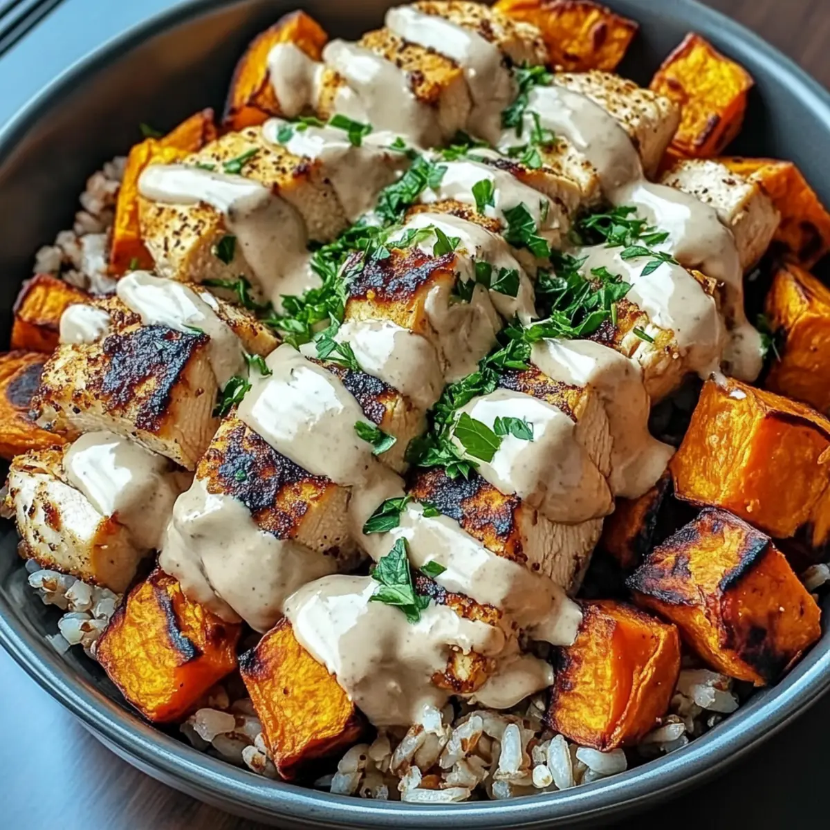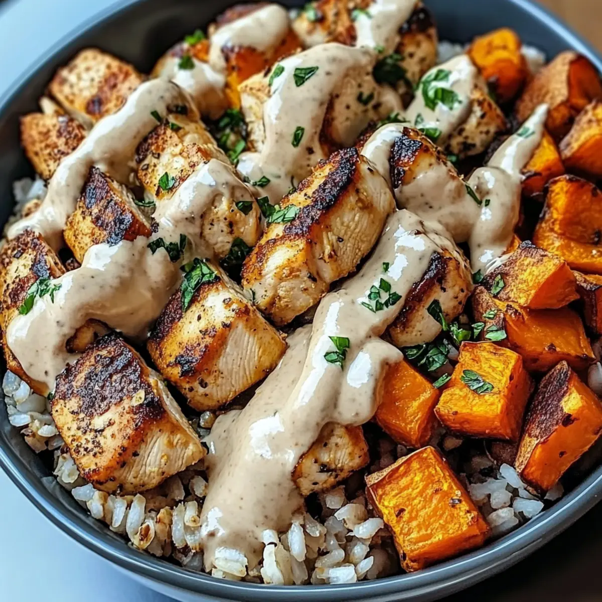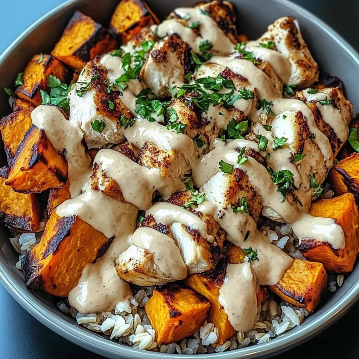 There’s something uniquely comforting about a bowl that warms you from the inside out, and that’s exactly what you get with this Chicken & Sweet Potato Rice Bowl. Tender chicken pairs beautifully with sweet, caramelized sweet potatoes, sitting atop a hearty bed of nutty brown rice. And just when you think it couldn’t get any better, a creamy tahini drizzle ties everything together, offering a touch of brightness to this wholesome dish. Not only is this recipe a crowd-pleaser that celebrates nutritious ingredients, but it also comes together quickly, making it perfect for busy weeknights or relaxed family dinners. Are you ready to explore the flavor-packed goodness of this delightful bowl that feels like a warm hug? Why is this recipe a must-try? Comforting flavors unite in this Chicken & Sweet Potato Rice Bowl, combining tender chicken and caramelized sweet potatoes for pure deliciousness. Nutritious and wholesome, each ingredient works together to create a meal that’s both satisfying and guilt-free. Quick and easy, dinner can be ready in no time, allowing you more time to relax. Customizable as you like, swap ingredients to suit your taste—try quinoa in place of rice or add a sprinkle of nuts for crunch! Crowd-pleaser guaranteed, it’s perfect for cozy nights or gatherings with family and friends. For additional flavors, consider serving it alongside a refreshing cucumber salad or some crispy roasted Brussels sprouts. Chicken & Sweet Potato Rice Bowl Ingredients • Dive into the heart of comfort food with these nourishing ingredients. For the Bowl Chicken Breast – The primary protein source that can be swapped with turkey or tofu for a vegetarian option. Sweet Potatoes – Adds natural sweetness and vibrant color; you can substitute with butternut squash if desired. Brown Rice – Provides a fibrous base; quinoa works beautifully for a gluten-free alternative. For Roasting & Flavoring Olive Oil – Enhances flavor during roasting and sautéing; avocado oil is a great alternative too. Paprika – Adds warmth and depth of flavor; try smoked paprika for a different taste dimension. Salt & Pepper – Essential for seasoning; adjust according to personal preference. For the Creamy Drizzle Tahini – Creates a creamy drizzle that ties the Chicken & Sweet Potato Rice Bowl together; nut butters can serve as a substitute if unavailable. Lemon Juice – Brightens the tahini sauce; fresh lime juice works wonderfully as an alternative. Step‑by‑Step Instructions for Chicken & Sweet Potato Rice Bowl Step 1: Preheat the Oven Begin by preheating your oven to 400°F (200°C). This temperature is perfect for roasting sweet potatoes, ensuring they become tender with a slight crispiness. While the oven heats, you can prepare the sweet potatoes for roasting, which will enhance their natural sweetness. Step 2: Prepare Sweet Potatoes Wash and peel the sweet potatoes, then dice them into bite-sized cubes. In a mixing bowl, toss the cubes with olive oil, paprika, salt, and pepper until evenly coated. Spread the seasoned sweet potatoes in a single layer on a baking sheet, and roast in the preheated oven for about 20 minutes. Stir halfway through to promote even roasting until they are tender and slightly caramelized. Step 3: Cook Chicken While your sweet potatoes are roasting, heat a skillet over medium-high heat. Add a splash of olive oil and once hot, add diced chicken breast seasoned with salt and pepper. Cook the chicken for 6-8 minutes, stirring occasionally, until it’s no longer pink in the center and juices run clear. Remove the skillet from heat and let the chicken rest while you prepare the tahini sauce. Step 4: Make Tahini Sauce In a small bowl, whisk together tahini, freshly squeezed lemon juice, and a few tablespoons of water. Stir until the mixture is smooth and creamy, adjusting the consistency by adding more water if needed. The tahini sauce should be drizzle-ready, providing a bright contrast to the savory elements of the Chicken & Sweet Potato Rice Bowl. Step 5: Assemble Bowls Now, it’s time to assemble your delicious Chicken & Sweet Potato Rice Bowl! Start with a generous scoop of cooked brown rice as the base. Top it with the sautéed chicken and roasted sweet potatoes. Finally, drizzle the creamy tahini sauce over the entire dish, allowing its richness to tie all the flavors together. Serve warm and enjoy this wholesome meal! Make Ahead Options These Chicken & Sweet Potato Rice Bowls are perfect for meal prep enthusiasts looking to save time during busy weeknights! You can prepare the roasted sweet potatoes and sautéed chicken up to 3 days in advance, and store them separately in airtight containers in the refrigerator. To maintain the best quality, be sure to allow them to cool completely before sealing. When you’re ready to enjoy this wholesome bowl, simply reheat the chicken and sweet potatoes in a skillet or microwave until warmed through, then assemble over cooked brown rice and drizzle with tahini sauce just before serving. This way, you can have a nutritious, homemade meal ready in minutes, ensuring your Chicken & Sweet Potato Rice Bowl is just as delightful as when freshly made! What to Serve with Chicken & Sweet Potato Rice Bowl Create a delightful meal experience by complementing your nourishing bowl with these enticing sides and drinks. Cucumber Salad: A refreshing salad tossed with lemon and herbs adds a crisp crunch that brightens the overall dish. Crispy Brussels Sprouts: Roasted to perfection with a balsamic glaze, these bring a rich, savory flavor that contrasts beautifully with the sweetness of the bowl. Quinoa Tabouli: This herby salad offers vibrant freshness and texture, enhancing the wholesome ingredients in your Chicken & Sweet Potato Rice Bowl. Garlic Bread: Soft, buttery garlic bread creates a comforting combination, perfect for soaking up the creamy tahini drizzle. Roasted Asparagus: The earthy flavors of roasted asparagus provide a lovely bal