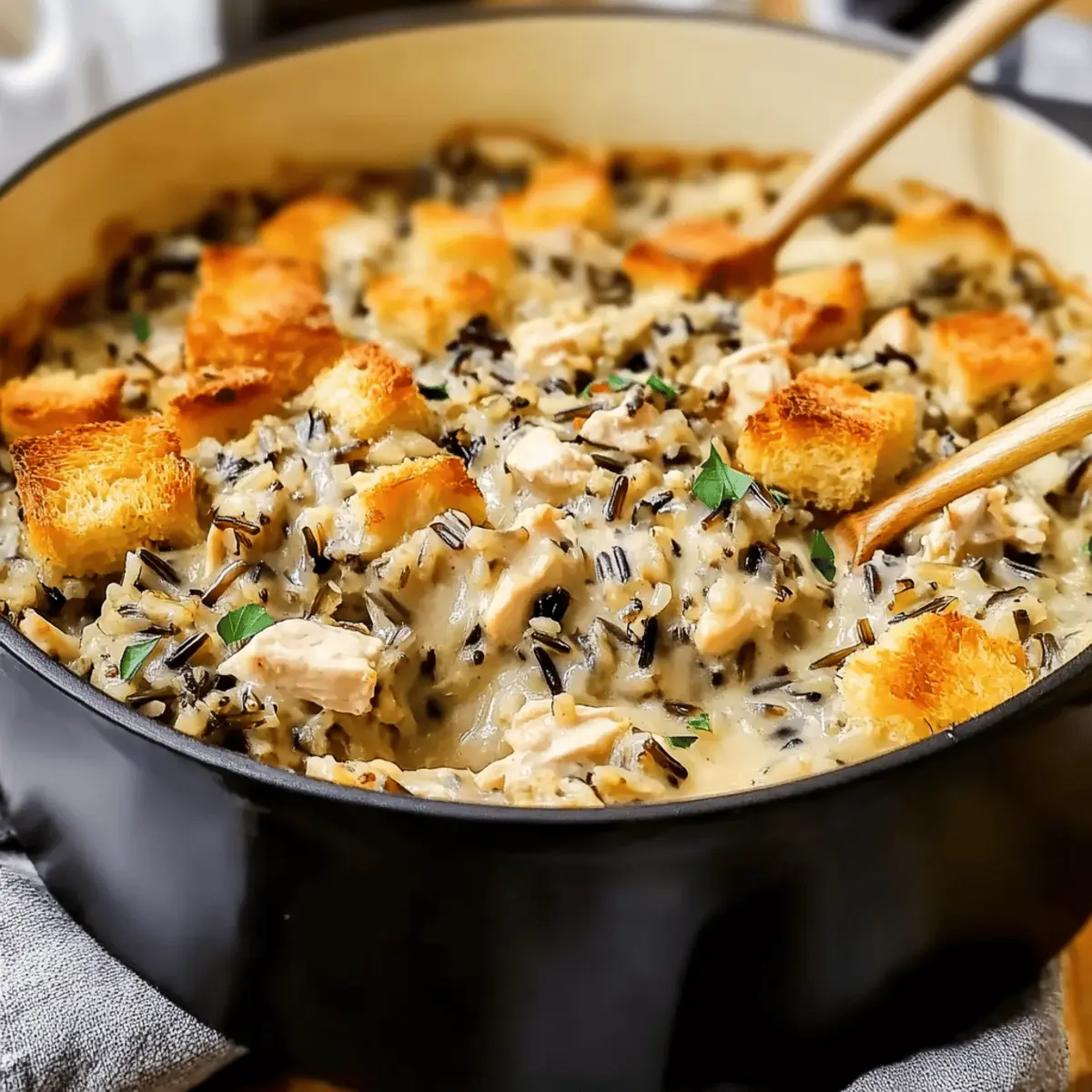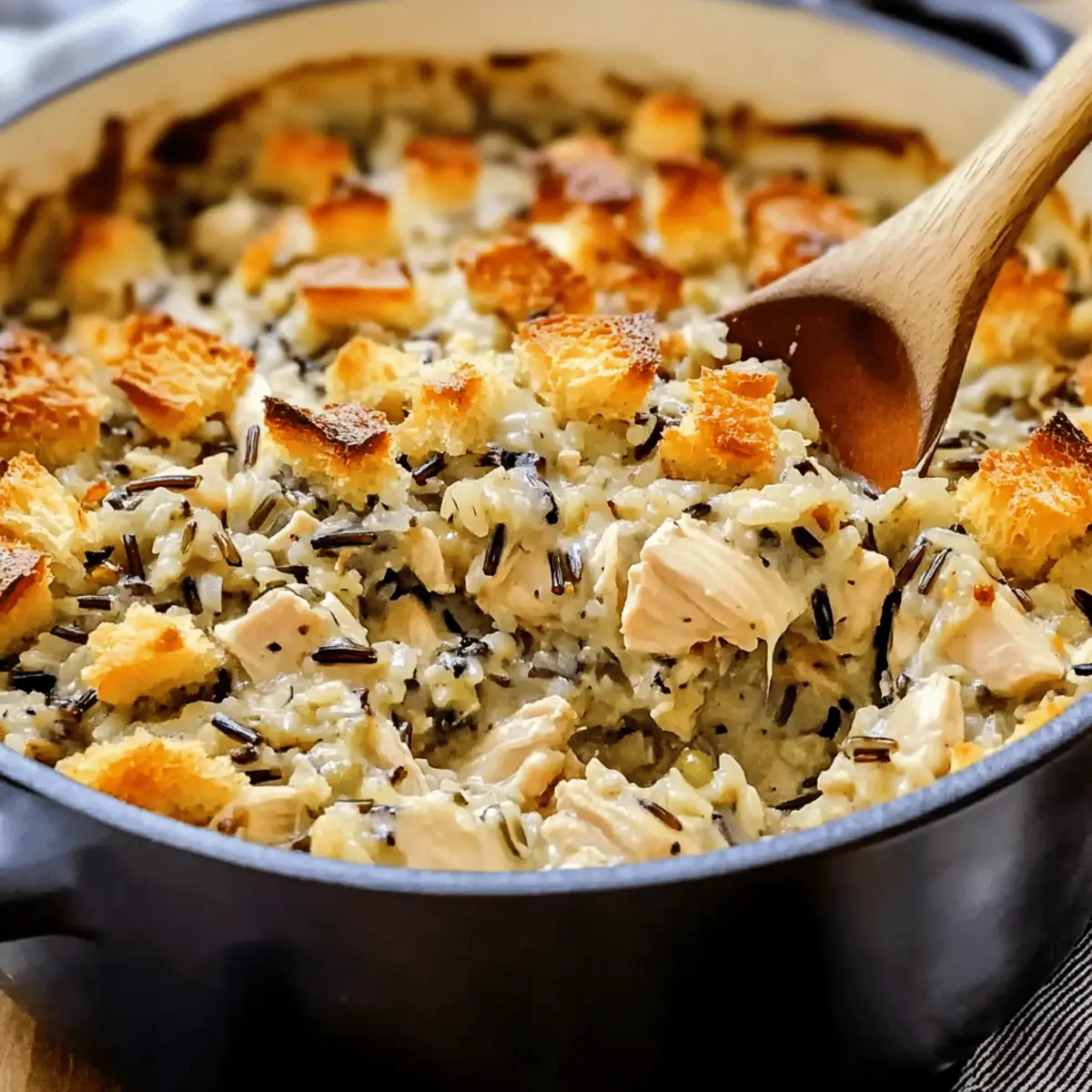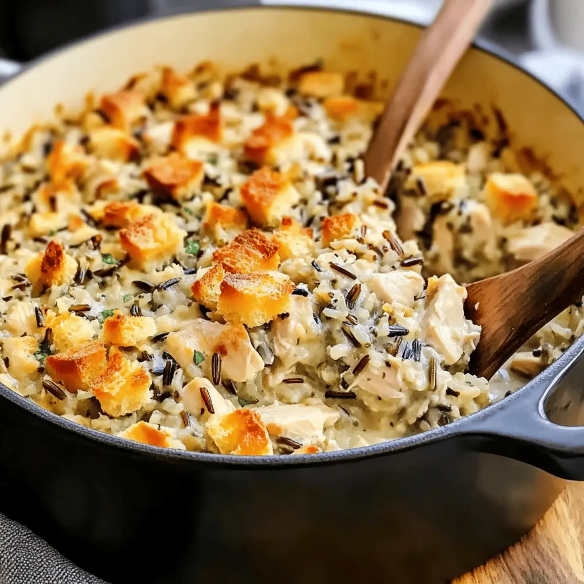 On cold evenings, there’s nothing quite like the warm embrace of a home-cooked meal, especially when it comes to this Chicken Wild Rice Casserole. This dish brings together tender chicken, hearty wild rice, and a creamy sauce that feels like a cozy blanket for your taste buds. With simple prep steps and no-fuss ingredients, it’s perfect for those busy weeknights or family gatherings when you want to impress without the stress. Plus, the option of crispy bread cubes on top adds a delightful crunch that elevates this comfort food classic. Ready to discover how this creamy casserole can become a staple in your kitchen? Let’s dive in! Why is this casserole a must-try? Comforting, the Chicken Wild Rice Casserole wraps you in a delicious hug, making it the ultimate feel-good meal. Effortless preparation means you can easily whip this up, even on busy weeknights. Flavorful and satisfying, the creamy sauce combined with hearty wild rice creates a dish that will delight your taste buds. Crowd-pleasing versatility allows for easy adaptations—try adding peas for a pop of color or substitute turkey for a different protein. Served alongside a fresh salad, this casserole is perfect for family gatherings or cozy nights in. Whether you’re a kitchen novice or a culinary pro, you’ll find this dish as enjoyable to make as it is to eat! Chicken Wild Rice Casserole Ingredients • Get ready to create a comforting masterpiece! For the Casserole Onion – Adds depth and savory base flavor to the dish. Carrots – Provides subtle sweetness and texture to enhance the casserole’s heartiness. Celery – Contributes crunch and a fresh flavor profile; don’t skip this for extra freshness! Wild Rice – The star ingredient that offers a nutty flavor and hearty texture crucial for a Chicken Wild Rice Casserole. Chicken Broth – Infuses extra flavor while cooking the wild rice, making each bite savory and satisfying. Chicken Breasts – The main protein source; feel free to substitute with thighs for a richer flavor. Butter – Adds richness to the sauce and enhances overall flavor. Salt – Essential for seasoning and elevating the flavors in your casserole. Poultry Seasoning – A warm blend of spices that harmonizes perfectly with chicken and rice. Flour – Thickens the creamy sauce, giving it that delightful texture. Milk – Creates a smooth, creamy base for the sauce, enriching each bite. For the Topping Cubed Bread (sturdy, dry or day-old) – Optional for a crispy finish; elevates texture and taste! This Chicken Wild Rice Casserole is sure to become a beloved dish in your family dinner rotation. Let’s get cooking! Step‑by‑Step Instructions for Chicken Wild Rice Casserole Step 1: Preheat the Oven Begin by preheating your oven to 350°F (175°C). This will ensure your Chicken Wild Rice Casserole cooks evenly and thoroughly. While the oven is heating, gather your ingredients and a large baking dish, readying yourself for a delightful cooking experience. Step 2: Bake the Wild Rice Mixture In a large baking dish, combine the chopped onion, carrots, celery, wild rice, and chicken broth. Stir the mixture well to distribute the ingredients evenly. Cover the dish tightly with aluminum foil and bake it in the preheated oven for 1 hour and 15 minutes. You’ll know it’s ready when the rice is tender and the broth is absorbed. Step 3: Make the Creamy Sauce While the rice bakes, melt 4 tablespoons of butter in a medium saucepan over medium heat. Once melted, whisk in the flour, salt, and poultry seasoning, cooking for about 1 minute until bubbly. Gradually add the milk, whisking continuously until the sauce thickens and becomes smooth. This creamy sauce will bring richness to your Chicken Wild Rice Casserole. Step 4: Prepare the Bread Topping (Optional) In a separate small bowl, melt the remaining 6 tablespoons of butter. Add the cubed bread and toss until all pieces are well-coated. This will create a deliciously crispy topping for your casserole, elevating the texture and flavor to something truly special. Step 5: Assemble the Casserole Once the wild rice mixture has finished baking, carefully remove it from the oven and uncover it. Add the raw chicken pieces to the dish, followed by pouring in your creamy sauce. Mix everything together until well combined, ensuring the chicken is nestled throughout the rice. Finally, top the mixture evenly with the buttered bread cubes for extra crunch. Step 6: Bake Again for Perfection Increase the oven temperature to 450°F (232°C) and return the casserole, uncovering it for this step. Bake for an additional 20-30 minutes or until the chicken is cooked through and the bread cubes are golden brown and crispy. You’ll know it’s done when the chicken reaches an internal temperature of 165°F (74°C). Step 7: Serve With Love Once your Chicken Wild Rice Casserole is out of the oven, let it cool for a few minutes. Garnish with a sprinkle of salt, pepper, or fresh parsley for a touch of color and flavor. This comforting dish is now ready to be served and enjoyed by your family and friends! Expert Tips for Chicken Wild Rice Casserole Cooked Chicken Hack: Use rotisserie chicken for a quick prep! This saves time and still delivers great flavor in your Chicken Wild Rice Casserole. Make-Ahead Delight: Assemble your casserole up to 24 hours in advance. Just refrigerate it tightly covered, making dinner a breeze the next day! Rice Variability: Avoid standard long-grain rice as a substitute if you can, as it alters the flavor and cooking time needed for the best chicken wild rice casserole experience. Topping Options: Feel free to skip the bread topping for a lower-carb dish. This way, you can still enjoy all the creamy goodness without the extra carbs! Freezing Tip: This casserole freezes beautifully for up to 3 months. Just thaw it overnight in the fridge before baking as directed, ensuring deliciousness at every meal! Chicken Wild Rice Casserole Variations Feel free to