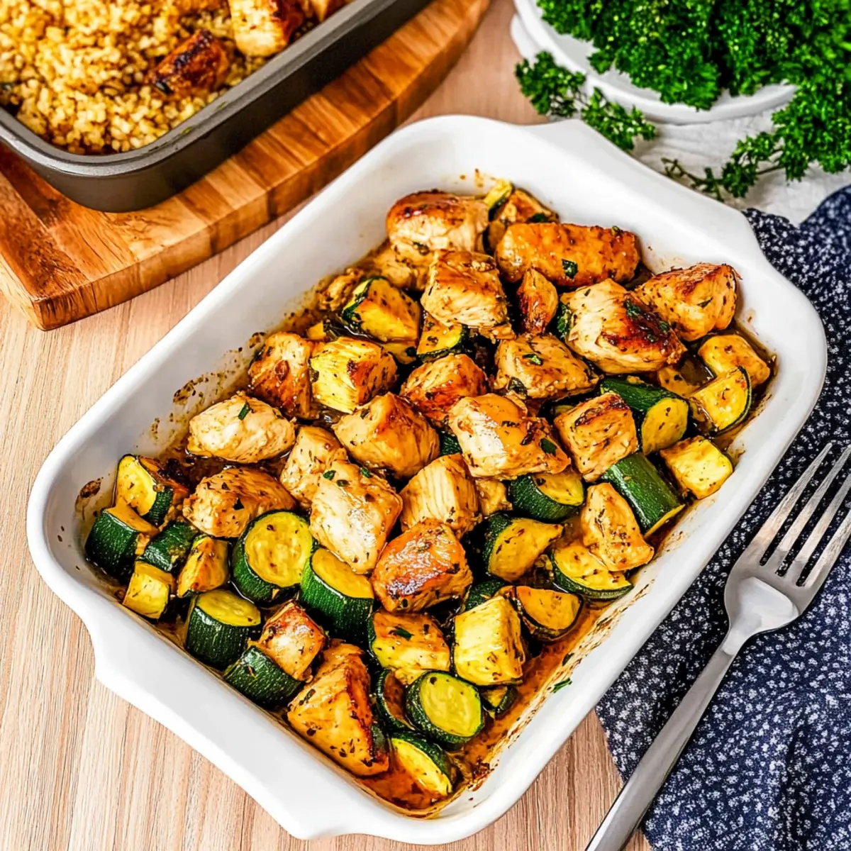 Once marinated, spread the mixture evenly in the prepared baking dish, ensuring that the chicken and veggies are arranged in a single layer. This helps them cook evenly and allows the chicken to achieve that lovely golden-brown color while lending a tender texture to the zucchini.