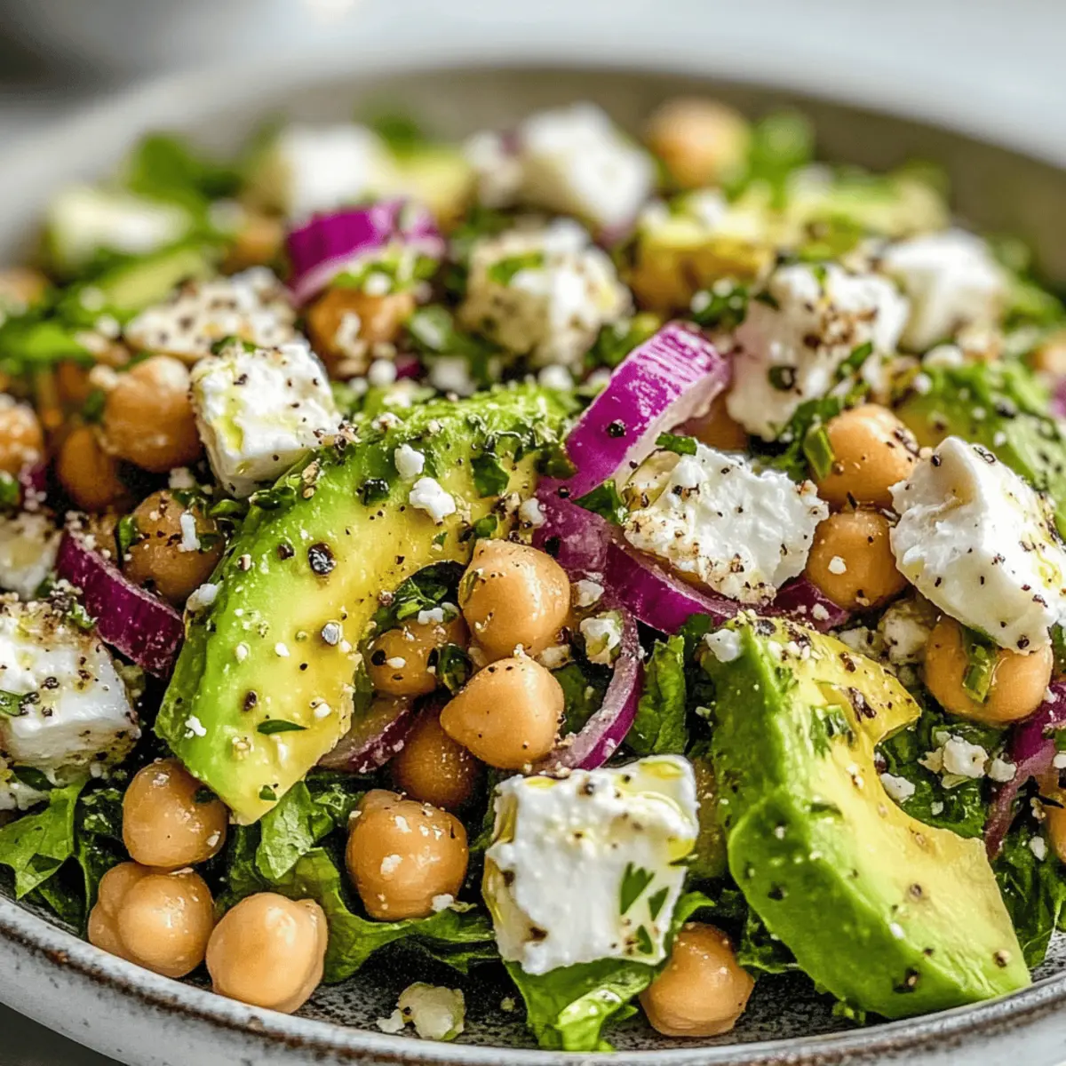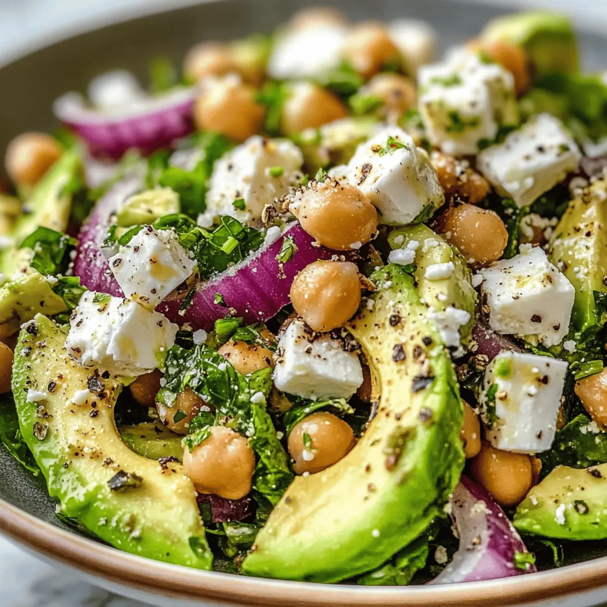 As I stood in my kitchen, the fragrant aroma of fresh herbs and zesty lemon filled the air, instantly lifting my spirits. That’s when I knew it was time to whip up a Chickpea Feta Avocado Salad, where vibrant colors come together for a Mediterranean delight. In just 15 minutes, this easy and wholesome salad brings together creamy avocado, tangy feta, and hearty chickpeas, transforming simple ingredients into a nutritious masterpiece. Perfect as a light lunch, a quick dinner, or a dazzling side dish for gatherings, it appeals to both the health-conscious and anyone yearning for a break from fast food. Topped with a bright dressing, this salad not only delivers a refreshing crunch but is also gluten-free and high in nutrients. So, are you ready to embark on a delicious journey that will satisfy your taste buds and leave you feeling vibrant? Let’s dive in! Why is this salad a game-changer? Simplicity at Its Best: Whipping up this Chickpea Feta Avocado Salad takes only 15 minutes, making it a perfect quick meal for any busy lifestyle. Flavor Explosion: Combining creamy avocado, tangy feta, and hearty chickpeas creates a delightful burst of flavors that will leave your taste buds dancing. Nutritious and Wholesome: Packed with fiber, healthy fats, and protein, this salad caters to those looking for a nutritious and gluten-free meal option. Versatility for All Occasions: Whether you’re serving it as a light lunch or a vibrant side at your next gathering, it’s bound to impress everyone at the table. For added inspiration, check out my Pesto Pasta Salad for a delicious twist on quick meals! Refreshingly Light: This salad offers a refreshing crunch that is ideal for warming days, giving you a healthy alternative to the mundane fast food routine. Chickpea Feta Avocado Salad Ingredients • Get ready to gather fresh, wholesome ingredients for your delightful Chickpea Feta Avocado Salad! For the Salad Chickpeas – A great source of plant-based protein; canned for convenience, but dried chickpeas work too if you soak them. Avocado – Adds creaminess and healthy fats; choose a ripe avocado for the best texture. Feta Cheese – Provides a tangy and salty flavor; opt for a good-quality feta that crumbles nicely. Red Onion – Offers sharpness and a crunchy bite; slice thinly for better balance in flavor. Fresh Parsley – Enhances the salad’s vibrancy; if unavailable, use half the amount of dried parsley. Fresh Mint – Adds an aromatic freshness; dried mint can substitute but use in smaller amounts. For the Dressing Olive Oil – Acts as the base of your dressing; the extra virgin version gives the best flavor profile. Fresh Lemon Juice – Brightens the flavors of your salad; always go for freshly squeezed for optimal taste. Garlic – Introduces depth and aroma; feel free to adjust the amount based on your love for garlic! Dried Oregano – Imparts a Mediterranean flair; switch to fresh if you have some, adjusting the quantity to suit your palate. Salt and Pepper – Essential for seasoning; personalize to your taste, enhancing the overall profile of the dish. Now that you have everything you need, let’s create this culinary masterpiece that’s both healthy and satisfying! Step‑by‑Step Instructions for Chickpea Feta Avocado Salad Step 1: Prepare Ingredients Begin by rinsing and draining one can of chickpeas, then set them aside in a large mixing bowl. Next, dice a ripe avocado, ensuring you retain its creamy texture, and immediately toss it with some fresh lemon juice to prevent browning. Thinly slice a small red onion, and chop a handful each of fresh parsley and mint, welcoming the vibrant colors and enticing aromas. Step 2: Combine Ingredients Now, gently fold the chickpeas, diced avocado, crumbled feta cheese, sliced red onion, chopped parsley, and mint together in the large bowl. Use a spatula for gentle mixing to ensure even distribution without mashing the delicate avocado. Aim for a beautiful medley of colors and textures, showcasing the wholesome ingredients in your Chickpea Feta Avocado Salad. Step 3: Make Dressing In a separate small bowl, whisk together 3 tablespoons of extra virgin olive oil with the juice of one freshly squeezed lemon, minced garlic, and a sprinkle of dried oregano. Season the dressing with salt and pepper to taste, allowing the flavors to meld together. This vibrant dressing will brighten your Chickpea Feta Avocado Salad and enhance its lively flavors. Step 4: Toss Salad Carefully pour the dressing over the salad mixture, making sure to cover all the ingredients evenly. Using your spatula, gently toss the salad to coat the ingredients in the dressing without bruising the avocado. This step infuses the Chickpea Feta Avocado Salad with zesty flavor, making it a deliciously refreshing dish. Serve immediately or chill for a short while before enjoying. Chickpea Feta Avocado Salad Variations Feel free to explore exciting twists on this delightful Chickpea Feta Avocado Salad to suit your taste buds! Vegan Version: Replace feta cheese with crumbled tofu or a dairy-free cheese alternative for a satisfying plant-based option. Spicy Kick: Add diced jalapeños or a sprinkle of red pepper flakes for a zesty kick that brings the heat to your salad. Texture Boost: Incorporate toasted nuts or seeds, like almonds or sunflower seeds, for an irresistible crunch in every bite. Herb Medley: Swap out parsley and mint for fresh basil or cilantro, adding a new aromatic twist to the salad. Creamy Addition: Enhance creaminess by folding in a dollop of Greek yogurt or hummus, perfect for those who enjoy a rich texture. Grain Power: Mix in cooked quinoa or bulgur for added fiber and a heartier salad, making it a filling meal! Flavorful Dressing: Experiment with flavored olive oils, like chili-infused or lemon-infused oil, to give your dressing a deliciously unique twist. Fruity Flair: Toss in diced mango or pomegranate seeds for a sweet and tangy contrast, perfect for a refresh