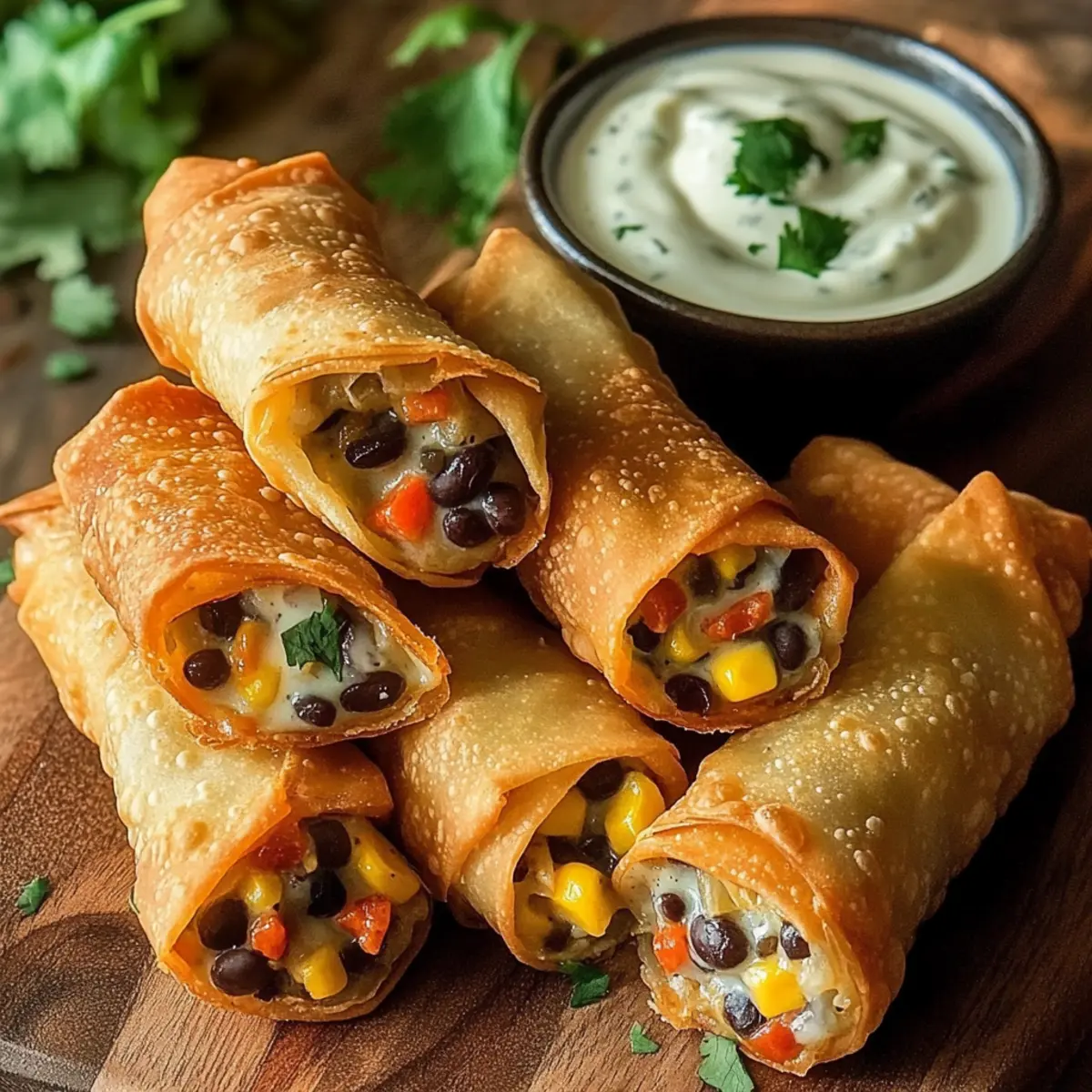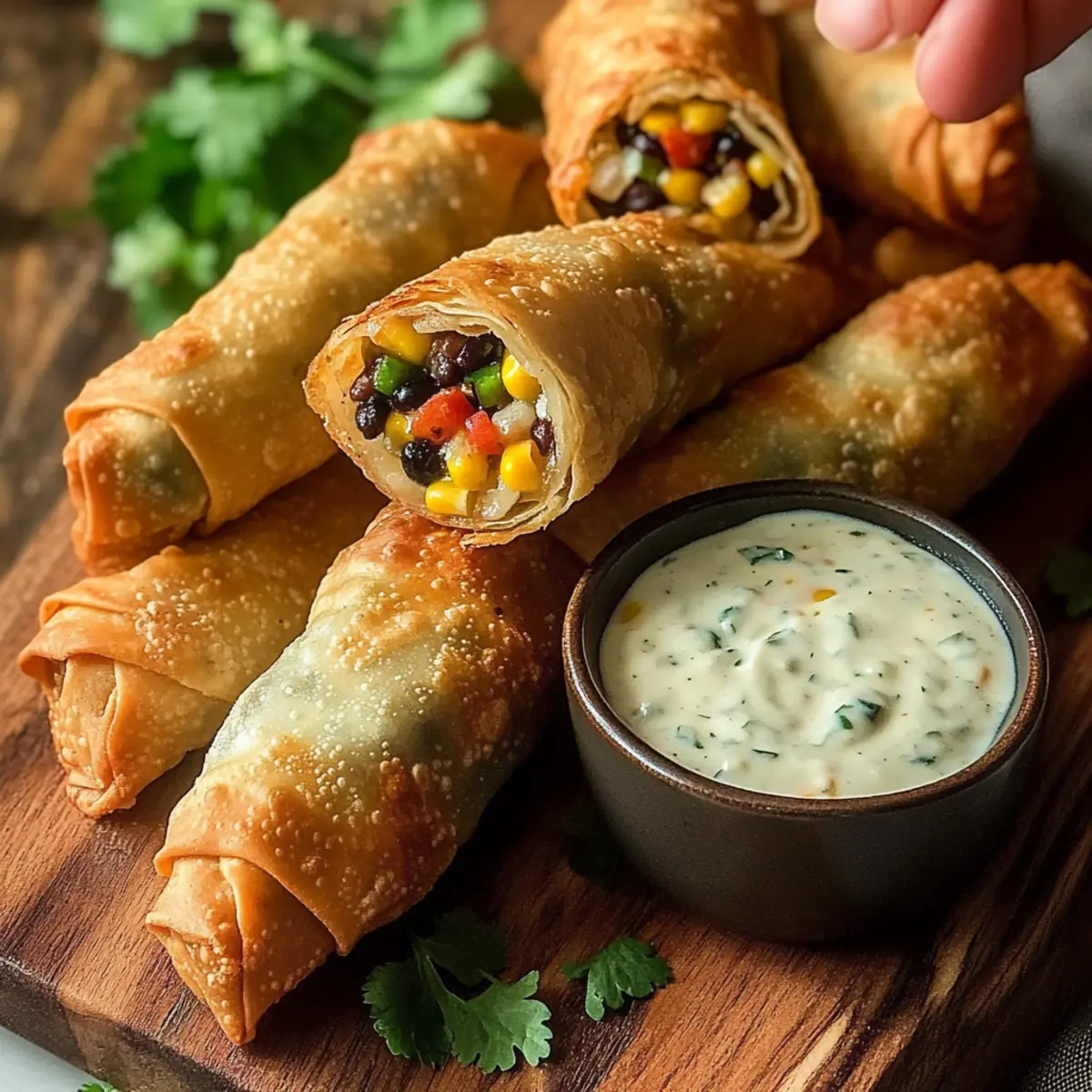 In a mixing bowl, combine half a cup of mayonnaise, half a cup of sour cream, a tablespoon of buttermilk, chopped fresh cilantro, lime juice, and a pinch of garlic powder. Whisk the mixture until smooth and creamy, then refrigerate for about 30 minutes to allow the flavors to meld, creating a perfect complement for your crispy eggrolls.