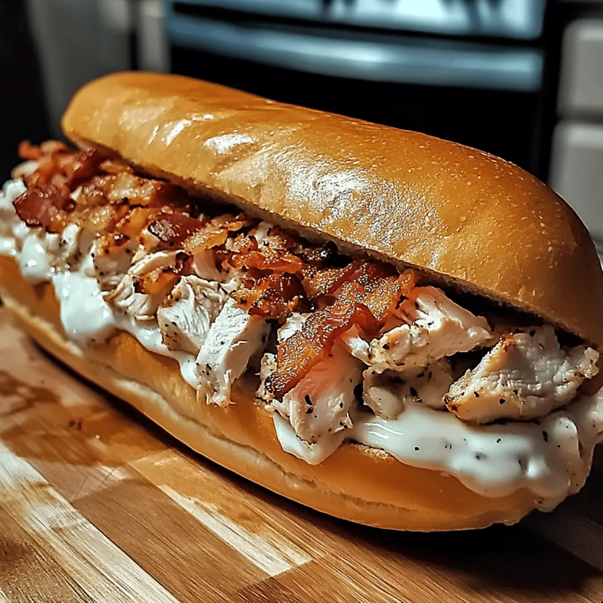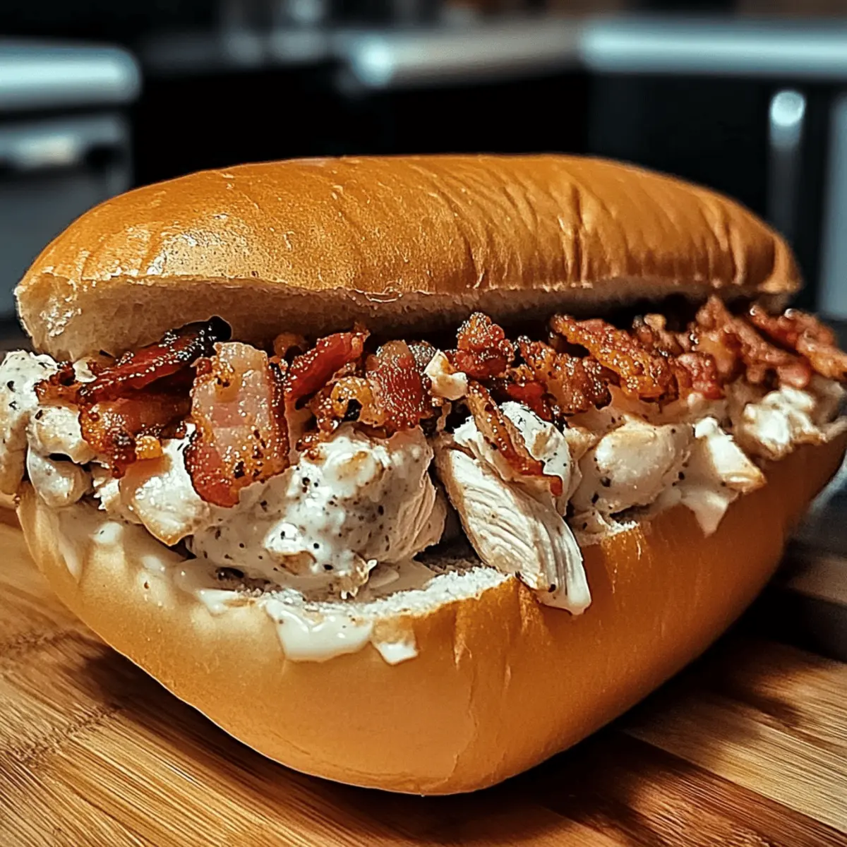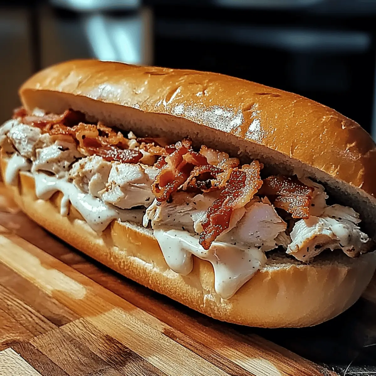As I stood in my kitchen, a quick glance at the clock revealed I was racing against time once again. That’s when the idea of a Delicious Chopped Chicken Bacon Ranch Sub struck me—a perfect solution for busy days when you crave something hearty yet effortless. This mouthwatering sandwich is the ideal marriage of juicy, chopped chicken, crispy bacon, and creamy ranch dressing, all packed into a toasty sub roll. In just 20 minutes, you can whip up a satisfying meal that’s easily customizable, making it perfect for every palate. Plus, it’s low-calorie, ensuring you can indulge without guilt. So, what toppings are you excited to add to your sub today? Why is this sub a must-try? Quick, Easy Prep: In just 20 minutes, you can have a delicious meal ready, making it perfect for busy weeknights. Flavor Burst: The harmonious mix of chopped chicken, crispy bacon, and creamy ranch dressing brings a burst of flavor in every bite. Customizable Goodness: Add your favorite toppings, whether it’s avocado for creaminess or jalapeños for a spicy kick, making each sub uniquely yours. Low-Calorie Delight: Enjoy a satisfying meal without the guilt, thanks to its low-calorie ingredients. This sub is not just a meal; it’s a flavor-packed experience that’ll impress your family and friends. Pair it with a refreshing salad or some chips for a complete feast! For more mouthwatering ideas, check out our Cheesy Chicken Enchiladas or Mango Chicken Stir. Ingredients for Chopped Chicken Bacon Ranch Sub For the Filling Chopped Chicken – Use rotisserie chicken for a quick and easy preparation. Crispy Bacon – Adds a delicious crunch; substitute with turkey bacon for a leaner option. Ranch Dressing – Provides creaminess and flavor; feel free to try blue cheese or vinaigrette for a twist. For the Sub Roll Sub Roll – The sandwich base; whole grain rolls offer a healthier alternative. For the Fresh Toppings Shredded Lettuce – Brings a fresh crunch to each bite. Diced Tomatoes – Adds juiciness; avocados or jalapeños are great alternatives for variation. Shredded Cheddar Cheese – Melts wonderfully, but consider a lower-fat version to keep it light. Feel free to mix and match toppings to make your Chopped Chicken Bacon Ranch Sub a personal favorite! Step‑by‑Step Instructions for Chopped Chicken Bacon Ranch Sub Step 1: Mix the Filling In a large mixing bowl, combine chopped chicken, crumbled bacon, and ranch dressing. Use a spatula to mix them until all ingredients are well-coated and evenly distributed. This should take about 2-3 minutes. The filling should be creamy and cohesive, with the smokiness of the bacon melding with the rich ranch flavor and tender chicken. Step 2: Prepare the Sub Roll Slice the sub roll in half lengthwise using a serrated knife. For an extra layer of crunch, preheat your oven to 375°F (190°C) and toast the sub roll for about 5 minutes until golden brown. Keep an eye on it to ensure it doesn’t burn. The toasted roll will add a delightful texture to your Chopped Chicken Bacon Ranch Sub. Step 3: Layer the Vegetables Once the roll is toasted, lay a generous handful of shredded lettuce onto the bottom half of the roll. Follow this with an even layer of diced tomatoes, allowing their juicy brightness to complement the rich filling. This step adds freshness to your sub, balancing the savory flavors of the chicken and bacon mix. Step 4: Assemble the Sub Spoon the chicken and bacon mixture generously over the lettuce and tomatoes. Use a fork to spread the filling evenly across the roll, ensuring the ingredients are well-distributed. This will help every bite of your Chopped Chicken Bacon Ranch Sub burst with flavor. You’ll want the filling to be heaped for a satisfying sandwich experience. Step 5: Add Cheese and Broil Top your sub with a handful of shredded cheddar cheese, covering the chicken mixture generously. For a melty twist, place the assembled sub under the broiler on high for 1-2 minutes. Keep a close watch as it melts; the cheese should turn bubbly and lightly golden, adding a delicious finish to your sandwich. Step 6: Serve and Enjoy Carefully remove the sub from the oven, allowing it to cool for a moment. Close the sandwich by placing the top half of the roll over the filling. Serve immediately, preferably alongside a side of crispy chips or a fresh salad to complete your meal. Each bite of your Chopped Chicken Bacon Ranch Sub will be a delightful combination of textures and flavors! Expert Tips for Chopped Chicken Bacon Ranch Sub Use Fresh Ingredients: Always opt for fresh veggies and quality rotisserie chicken to enhance the flavor of your Chopped Chicken Bacon Ranch Sub. Don’t Overload: While toppings are fun, avoid piling too much filling onto the sub. This helps keep your sandwich intact for easier eating. Broiling Caution: Keep an eye on the sub when broiling; it can go from perfectly melted to burnt in seconds. Patience is key for a perfect finish! Rest Before Serving: Allow the sub to rest for a minute after broiling. This helps the cheese set slightly, making it easier to cut and eat without spilling. Customize Wisely: While substitutions like blue cheese are great, stick to complementary flavors. Experiment, but keep the balance of the Chopped Chicken Bacon Ranch Sub in mind! How to Store and Freeze Chopped Chicken Bacon Ranch Sub Fridge: Store any leftovers wrapped tightly in foil or in an airtight container for up to 2 days. This helps maintain freshness while keeping the chicken and bacon flavorful. Freezer: If you want to freeze your assembled sub, wrap it tightly in plastic wrap followed by aluminum foil. It can be frozen for up to 1 month, but for optimal taste, consider freezing the filling separately. Thawing: To enjoy your frozen sub, transfer it to the fridge overnight to thaw. Reheat in the oven at 375°F (190°C) for about 10-15 minutes until warmed through. Reheating: If stored in the fridge, reheat your Chopped Chicken Bacon Ranch Sub i