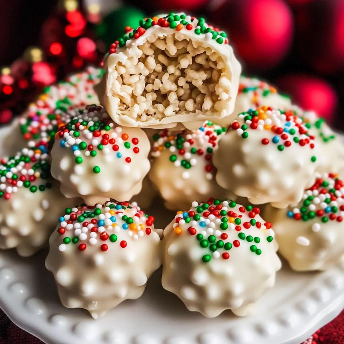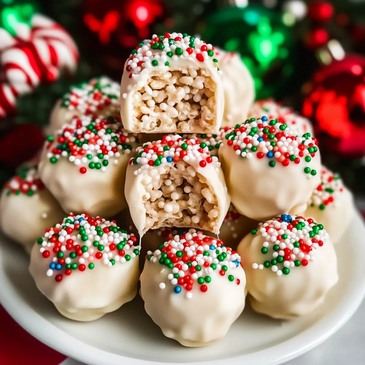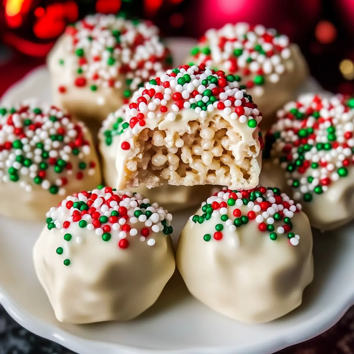 As I stood in my kitchen, the scent of melting marshmallows filled the air, instantly transporting me back to the magic of childhood holiday gatherings. This year, I’m excited to share my take on a festive favorite: Christmas Rice Crispy Treats. These delightful no-bake bites blend the satisfying crunch of puffed rice with velvety white chocolate and a sprinkle of holiday cheer, making them the perfect quick and easy dessert for any celebration. Not only are these treats a great way to involve the little ones in holiday baking, but they also make adorable homemade gifts for friends and family. Curious how to bring this nostalgic delight to your holiday table? Let’s dive into the recipe! Why Are These Christmas Rice Crispy Treats Special? Simplicity at Its Best: These treats combine just a few ingredients—puffed rice, marshmallows, and white chocolate—for a quick and easy no-bake dessert. Nostalgic Flavor: Each bite provides a delightful crunch and sweetness that brings back fond childhood memories, perfect for holiday gatherings. Festive Presentation: Coated in rich white chocolate and topped with colorful sprinkles, they look as good as they taste. These treats are wonderful for gift-giving or as a centerpiece at any holiday party! Fun for Everyone: Involve the kids in shaping the balls or decorating with sprinkles, creating cherished family moments while you bake. Versatile Treats: Mix in fun add-ins like dried cranberries or nuts to customize each batch for your loved ones, making these treats uniquely yours. Perfect Storage: They are easy to store, remaining delightful for up to a week, so you can prepare them ahead of time for last-minute gatherings or celebrations. Christmas Rice Crispy Treats Ingredients For the Treats Puffed Rice Cereal – Provides the classic crunchy texture; feel free to substitute with gluten-free cereal if needed. Marshmallows – The sweet binding agent that gives these treats their delightful chewiness; mini marshmallows can be used for quicker melting. Unsalted Butter – Adds richness and helps achieve a smooth melted marshmallow mix; use margarine for a dairy-free option. For the Coating White Chocolate – Envelops the treats in creamy sweetness; dark chocolate can be used for a different twist on your Christmas Rice Crispy Treats. Holiday Sprinkles – Add festive flair and fun; other colorful sprinkles or edible glitter can enhance visual appeal. Remember, these ingredients come together to create a whimsical and festive treat that captures the spirit of the season! Step‑by‑Step Instructions for White Chocolate Christmas Rice Crispy Treats Step 1: Melt Butter and Marshmallows In a large saucepan, melt 4 tablespoons of unsalted butter over low heat, stirring continuously to prevent burning. Once the butter is completely melted, add in 10 ounces of marshmallows and continue stirring until they are fully melted and the mixture is smooth, about 3-5 minutes. Step 2: Combine Cereal Remove the saucepan from heat, and immediately add 6 cups of puffed rice cereal to the melted marshmallow mixture. Using a rubber spatula, fold the cereal into the marshmallows until each piece is evenly coated and the mixture is combined. This should take about 1-2 minutes; be careful not to crush the cereal. Step 3: Shape Balls Let the mixture cool for about 5 minutes, just until it’s safe to handle. Grease your hands with a little butter or cooking spray to prevent sticking, then scoop out portions of the mixture and roll them into 1-inch balls. Place the formed balls on a parchment-lined tray as you work, ensuring they maintain their shape. Step 4: Coat If desired, melt 8 ounces of white chocolate in a microwave-safe bowl in 30-second bursts, stirring until smooth. Once melted, dip each rice crispy ball into the white chocolate, allowing excess to drip off. For extra festive cheer, immediately roll the balls in colorful holiday sprinkles before the chocolate hardens. Step 5: Set After coating the treats, place the chocolate-covered balls back on the parchment-lined tray. Allow them to set at room temperature for about 30 minutes, or until the chocolate coating is firm. Alternatively, you can refrigerate them for quicker setting if you’re in a hurry to enjoy your Christmas Rice Crispy Treats! What to Serve with White Chocolate Christmas Rice Crispy Treats? These delightful no-bake treats are sure to bring sweetness and cheer to your holiday table, complementing a variety of festive delights. Festive Hot Chocolate: A creamy, rich hot chocolate pairs perfectly, warming you up while balancing the sweetness of the treats. Sugar Cookies: These classic cookies add a soft, buttery texture that complements the crunchy bites, creating a delightful dessert spread. Peppermint Bark: The minty freshness of peppermint bark contrasts beautifully with the sweetness of the treats, offering a refreshing aftertaste. Fruit Salad: Bright, fresh fruits provide a burst of color and a refreshing lightness to your dessert table, balancing the richer flavors. Cheesecake: A slice of creamy cheesecake echoes the treat’s sweetness while adding a smooth texture and decadent richness—perfect for dessert lovers. Holiday Punch: A light, fruity punch can elevate your dessert experience, offering a zesty note that cuts the sweetness of the treats just right. The White Chocolate Christmas Rice Crispy Treats will shine as the star, but don’t forget these complementary delights, all working together to create a celebrate-worthy feast! Christmas Rice Crispy Treats Variations Feel free to get creative and make these treats uniquely yours with a few fun twists and substitutions! Gluten-Free: Use gluten-free puffed rice cereal to ensure everyone can enjoy the treats without worry. The same delightful crunch awaits! Dairy-Free: Substitute unsalted butter with margarine or coconut oil and use dairy-free chocolate for a deliciously inclusive dessert option. Your guests won’t even miss the dairy! 
