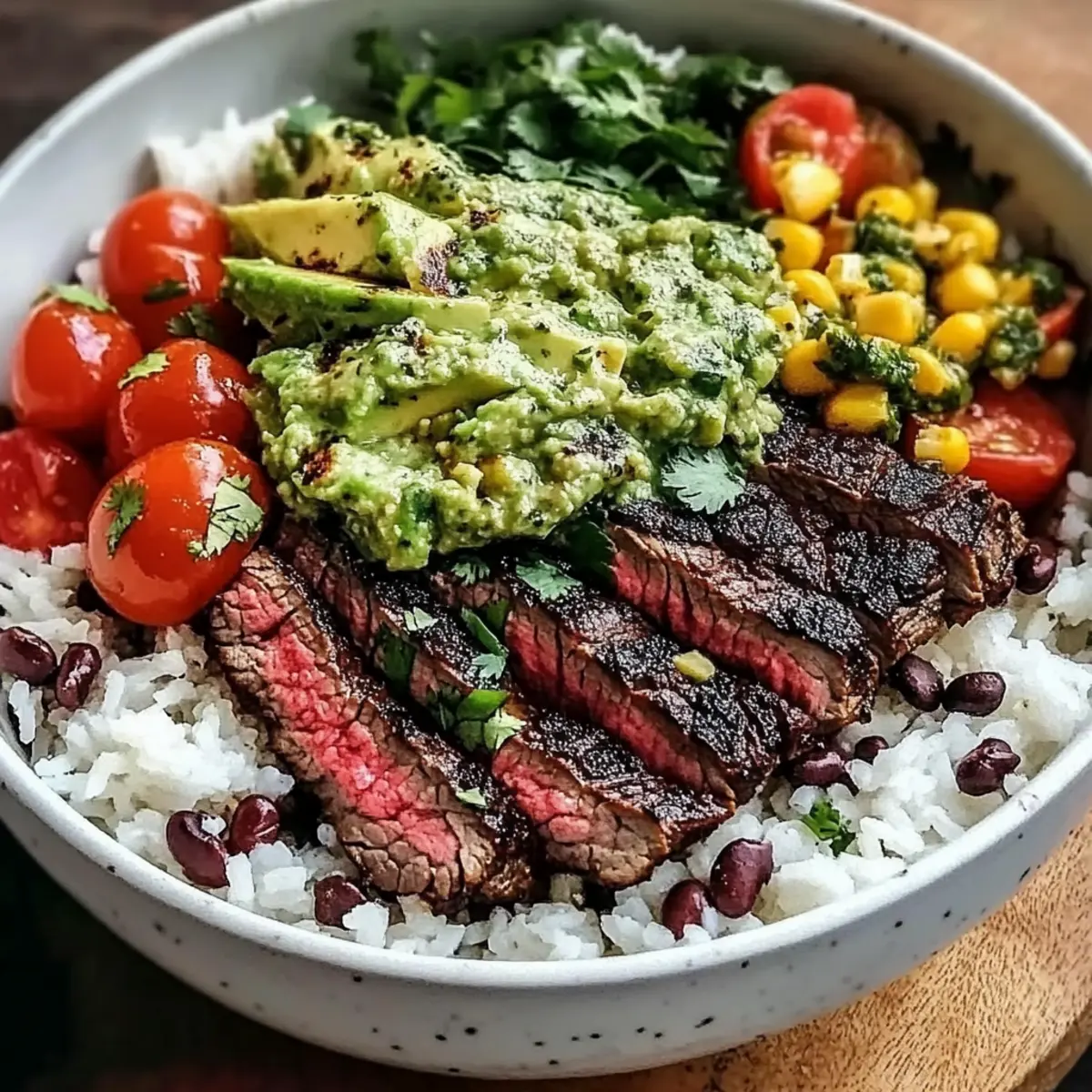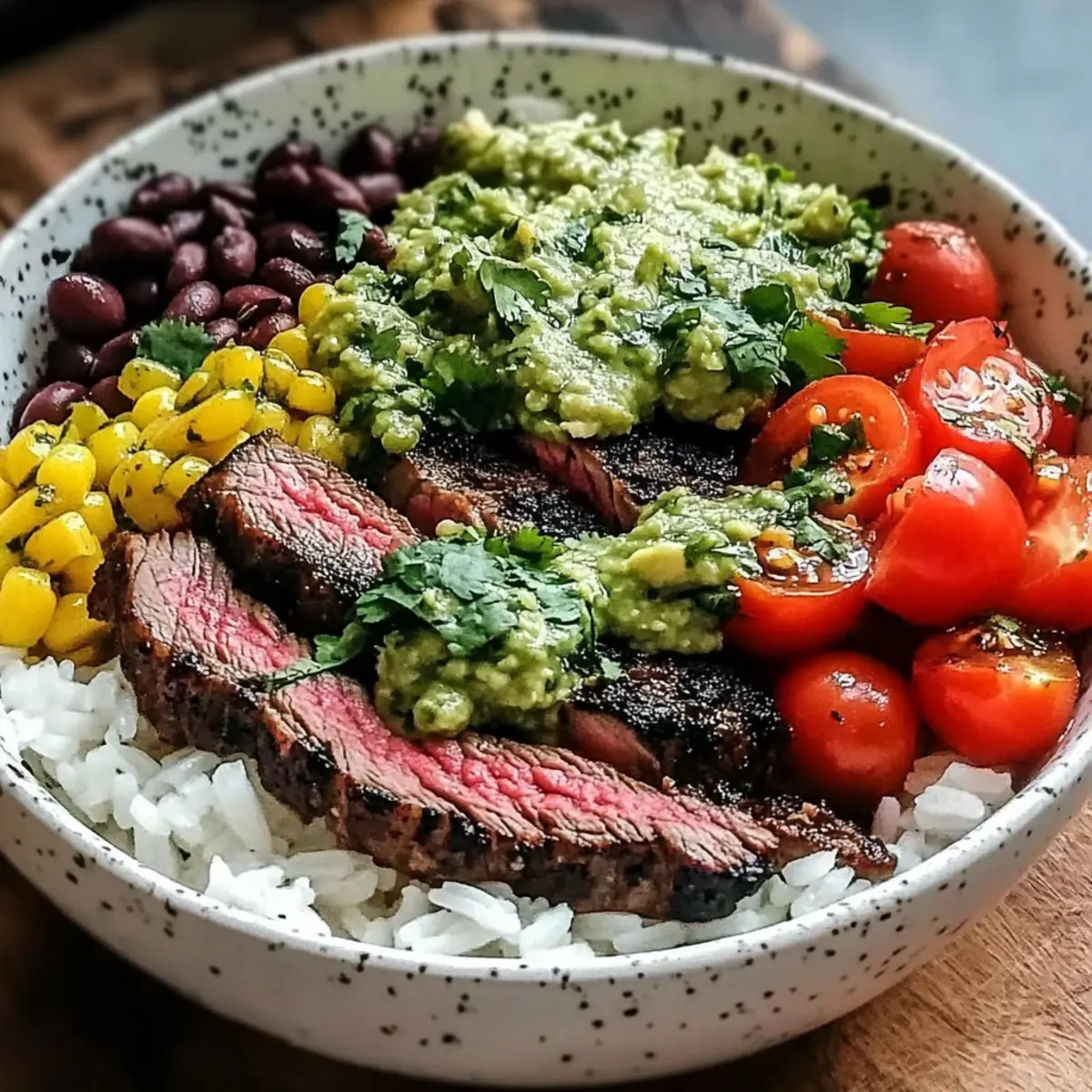 The sizzle of a grill and the tangy aroma of limes bring back sun-soaked summer evenings when the warmth of good food and laughter filled the air. This is exactly the vibe I aim for with my Cilantro Lime Steak Bowls. A perfect blend of freshness and heartiness, these customizable bowls not only make for a delightful weeknight meal but also shine when prepped ahead for busy days. With just over an hour for their delightful flavor to come alive, you’ll find this dish wonderfully versatile, allowing you to swap in your favorite toppings or even make a gluten-free version. So, whether you’re enjoying a cozy dinner or prepping for a week of yummy lunches, I can’t wait for you to dive into this delicious journey. What toppings will you add to make these bowls your own? Why are these steak bowls a must-try? Customization: You can easily adapt the Cilantro Lime Steak Bowls to suit your taste preferences or dietary needs—try quinoa for a gluten-free option! Flavor Explosion: The zesty lime and aromatic cilantro create a vibrant flavor profile that dances on your palate with every bite. Meal Prep Ready: Perfect for busy weekdays, these bowls can be prepped ahead of time and stored for quick access—ideal for those who want fresh, homemade meals without the fuss. Crowd-Pleaser: Serving a group? Everyone will love the colorful presentation and the ability to pick their favorite toppings, making it a hit at family dinners or gatherings. Balanced Nutrition: Packed with protein, healthy fats, and fresh veggies, each bowl provides a satisfying and nutritious meal ideal for health-conscious eaters—give this recipe a try and consider pairing it with my Salisbury Steak Comfort for more comforting ideas! Cilantro Lime Steak Bowls Ingredients For the Steak Marinade Flank Steak – This main protein source can be substituted with ribeye or sirloin; adjust cooking time accordingly. Fresh Lime Juice – Adds acidity and brightness to the marinade; about 2 limes yield the necessary amount. Olive Oil – Provides fat for the marinade and keeps the steak moist during cooking; can substitute with avocado oil. Fresh Cilantro – Brings herbal flavor; parsley makes a pleasant substitute if you prefer. Garlic (minced) – Enhances flavor depth; fresh is preferred, but garlic powder can work in a pinch. Ground Cumin – Adds warmth to the marinade; this spice has no direct substitutes, but you can omit it if needed. Chili Powder – Contributes complexity to the flavor; omit if unavailable, but try to include for best results. Salt & Black Pepper – Essential for seasoning; adjust to taste while considering dietary needs. For the Bowls Cooked Rice (white or brown) – Serves as the base; quinoa is a great high-protein gluten-free alternative. Black Beans – Provides protein and fiber; ensure they’re rinsed and drained, or swap with chickpeas for a twist. Corn – Adds texture and sweetness; use fresh, frozen, or canned based on your preference. Cherry Tomatoes – Brightens the dish with color and freshness; any small tomatoes can be used; just halve for serving. Avocado – Provides creaminess and healthy fats; squeeze lime juice on avocado slices to prevent browning. Red Onion – Adds crunch and sharpness; green onions can be a milder substitute if desired. Feta Cheese (optional) – Adds tang and creaminess; feel free to omit for a dairy-free bowl. Extra Cilantro for Garnish & Lime Wedges – Essential for freshness and that extra zing with your Cilantro Lime Steak Bowls. Let’s embark on this culinary adventure together, one delicious bite at a time! Step‑by‑Step Instructions for Cilantro Lime Steak Bowls Step 1: Marinate the Steak In a medium bowl, whisk together the fresh lime juice, olive oil, chopped cilantro, minced garlic, ground cumin, chili powder, salt, and black pepper until well combined. Place the flank steak into the marinade, ensuring it is fully coated. Cover the bowl with plastic wrap and refrigerate for 30 minutes to 4 hours for the best flavor absorption. Step 2: Prepare Rice and Beans While the steak marinates, cook the rice according to the package instructions, usually about 15–20 minutes, until fluffy. In a small saucepan, heat the rinsed and drained black beans on medium heat for about 5 minutes, stirring occasionally to warm through. If using fresh corn, cook briefly for 2–3 minutes, or heat frozen corn as necessary for a touch of sweetness. Step 3: Cook the Steak Preheat your grill or grill pan to medium-high heat, about 400°F. Remove the steak from the marinade, discarding the excess marinade. Grill the steak for 4-5 minutes per side, or until it reaches a medium-rare doneness (about 130°F). Once cooked, let the steak rest on a cutting board for 5-10 minutes to lock in the juices before slicing against the grain. Step 4: Assemble Bowls Start assembling your Cilantro Lime Steak Bowls by dividing the warm rice among serving bowls as the base. Then, layer with the warmed black beans, corn, halved cherry tomatoes, and sliced avocado. Arrange the sliced steak on top, adding red onion for a crunchy bite. If desired, sprinkle optional feta cheese over the top and finish with extra cilantro and lime wedges for a fresh presentation. Expert Tips for Cilantro Lime Steak Bowls Marinate Wisely: Marinate the steak for at least 2 hours to reach optimal flavor and tenderness. Don’t skimp on this step for the best result! Slice Against the Grain: Always cut the steak against the grain after cooking. This ensures tender, juicy bites that will elevate your Cilantro Lime Steak Bowls. Store Separately: If preparing ahead, store cooked rice, beans, and steak separately in airtight containers. This helps maintain freshness and texture! Prevent Avocado Browning: To keep your avocado slices fresh and green, squeeze a little lime juice on them just before serving—this will give you that vibrant appeal! Use a Thermometer: For perfect steak, use a meat thermometer! Aim for 130°F for me