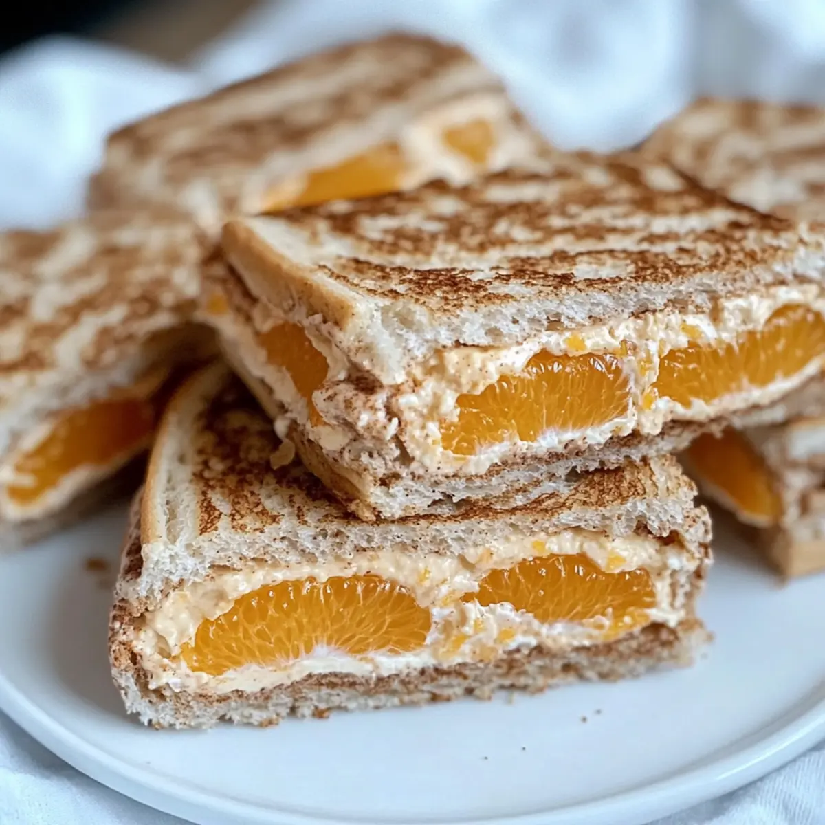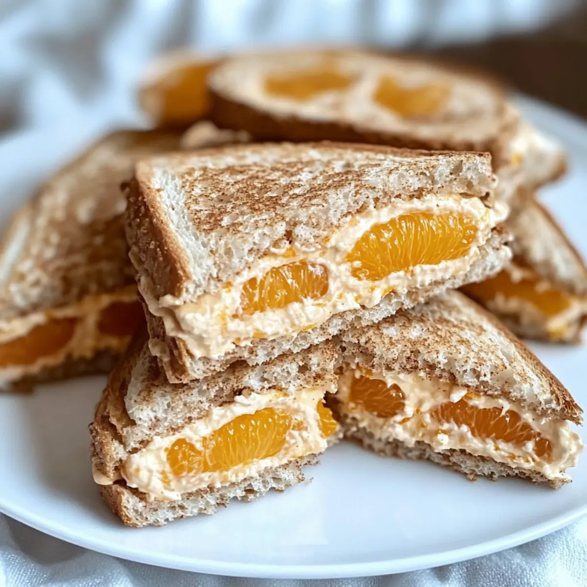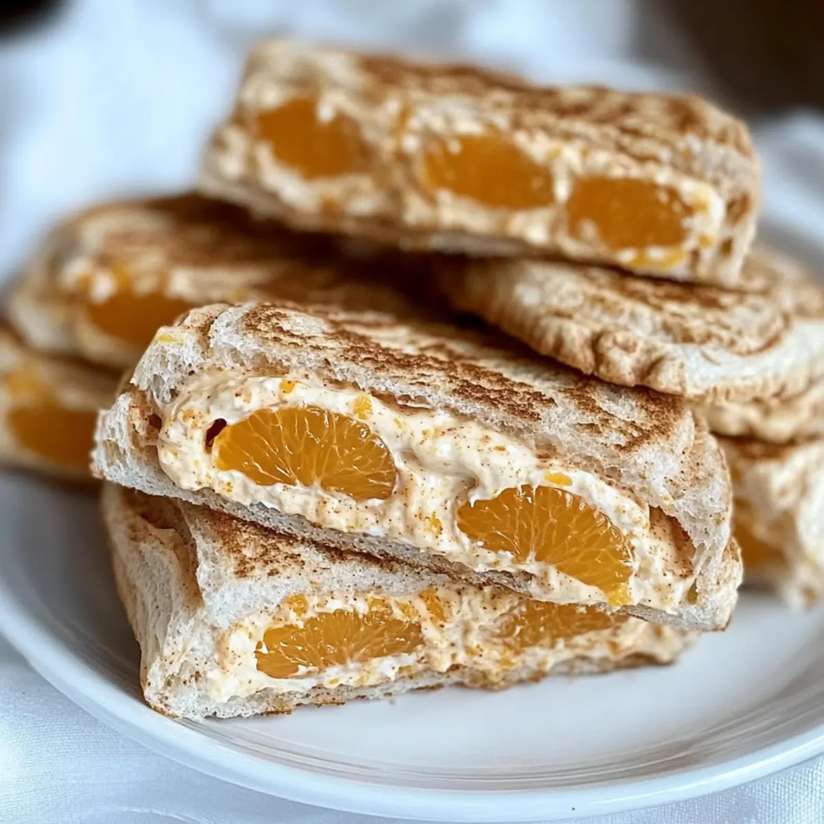 As I sipped my afternoon tea, I overheard whispers of delight resonating from the kitchen. The table was adorned with a vibrant platter of creamy cinnamon orange tea sandwiches, effortlessly captivating everyone’s attention. This recipe combines the lusciousness of cream cheese with the sweet burst of mandarin oranges, all nestled between the comforting embrace of cinnamon swirl bread. Not only are these sandwiches a breeze to whip up, but they also make for an elegant snack that’s perfect for brunches, tea parties, or any gathering that calls for a touch of sophistication. With their stunning presentation and delightful flavors, you’ll find they’re a crowd-pleaser that elevates any occasion. Ready to impress your guests and add a dash of flair to your next gathering? Let’s dive into this deliciously simple recipe! Why are these sandwiches a must-try? Elegant Twist: These Creamy Cinnamon Orange Tea Sandwiches elevate your snack game with their sophisticated blend of flavors. Quick Preparation: You can whip these up in no time, making them perfect for last-minute gatherings or brunches. Crowd-Pleaser: Their unique taste and beautiful presentation will have your guests raving—ideal for impressing at any occasion! Versatile Pairing: Enjoy them with your favorite herbal tea or sparkling beverage for an exquisite afternoon treat. If you’re in the mood for something sweet, try pairing them with Cinnamon Roll Sugar or enjoy some robust flavors with Croissant Breakfast Sandwiches. Light Yet Satisfying: These sandwiches strike the perfect balance of creamy and light, ensuring you’ll feel satisfied without the heaviness. Cinnamon Orange Tea Sandwich Ingredients For the Filling Cream Cheese – Provides richness and texture; ensure it’s at room temperature for a smooth mix. Mandarin Oranges – Adds a sweet, juicy brightness; can be substituted with fresh oranges for a delightful twist. Brown Sugar – Enhances sweetness; adjust according to your taste preference. Chopped Pecans – Offers a pleasant crunch; almonds or walnuts work well as alternatives, or omit for a nut-free option. For the Bread Cinnamon Swirl Bread – Gives a warm flavor and unique texture; plain white or whole wheat bread are great substitutes if needed. Step‑by‑Step Instructions for Cinnamon Orange Tea Sandwiches Step 1: Prepare the Filling In a medium mixing bowl, combine room temperature cream cheese, drained mandarin orange segments, brown sugar, and chopped pecans. Using a fork, gently crush the mandarin oranges as you mix, aiming for a textured filling that remains creamy. This step should take about 5 minutes, ensuring that the ingredients blend well without becoming overly smooth. Step 2: Assemble Sandwiches Grab the cinnamon swirl bread, laying out half of the slices on a clean cutting board. Spread an even layer of the creamy orange filling on each slice, covering every corner. Place the remaining slices on top, forming sandwiches. This assembly should be done promptly, ideally within 10 minutes, to maintain the freshness of the bread. Step 3: Cut and Present To create an appealing display of your cinnamon orange tea sandwiches, use a serrated knife to trim off the crusts if desired. Slice each sandwich into triangles or your preferred shapes, aiming for uniformity for a professional touch. Arrange them neatly on a decorative platter, which enhances the visual appeal, captivating your guests right away. Step 4: Garnish and Serve For a finishing touch, consider garnishing the sandwiches with additional mandarin orange segments or a light dusting of powdered sugar. This not only adds an elegant flair but also hints at the delightful flavors within. Serve alongside your favorite herbal tea or sparkling beverage to elevate the experience, making these cinnamon orange tea sandwiches a stunning centerpiece for any gathering. Make Ahead Options These Creamy Cinnamon Orange Tea Sandwiches are ideal for meal prep, saving you valuable time for your busy gatherings! You can prepare the cream cheese filling and refrigerate it for up to 3 days in advance—just ensure your mandarin oranges are well-drained to prevent a watery mix. Assemble the sandwiches no more than 4 hours before serving to maintain the perfect texture, keeping the bread fresh and delightful. When you’re ready to serve, simply spread the filling on the bread slices, cut, and garnish with extra mandarin segments or powdered sugar. This way, you’ll impress your guests with a delicious treat, all with minimal effort! Cinnamon Orange Tea Sandwiches Variations Feel free to add your unique spin to these delightful sandwiches, creating a moment of joy with every bite! Fresh Oranges: Substitute canned mandarin oranges with freshly segmented oranges for a zesty twist. The freshness uplifts the overall flavor. Vegan Delight: Swap cream cheese with a plant-based alternative like dairy-free cream cheese for a vegan-friendly option. Just a heads-up, the texture and flavor may vary a bit. Nut-Free: Omit the pecans for a nut-free version, and consider adding sunflower or pumpkin seeds for a delightful crunch. Seeds provide a similar texture with added nutrition. Sweet Spice: Enhance the filling with a pinch of nutmeg or ginger for a warm spice experience. This little touch creates an exciting flavor depth, warming the heart! Herb Infusion: Mix in fresh herbs like mint or basil into the filling for a refreshing twist. This unexpected combination will surprise and delight your guests. Honey Drizzle: Add a teaspoon of honey to the filling for a naturally sweeter touch. The honey’s floral notes beautifully complement the citrusy oranges. Texture Variation: Use brioche or challah bread for a richer and sweeter base. The airy texture elevates the classic tea sandwich experience, feeling almost like dessert! Warmly Toasted: Lightly toast the cinnamon swirl bread before assembly to add a delightful crunch. The warmth adds a new layer of cozy flavors, perfe