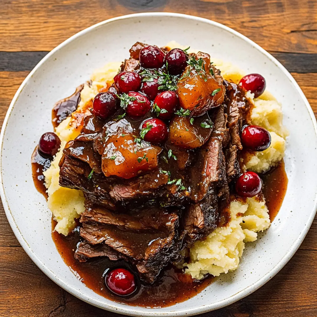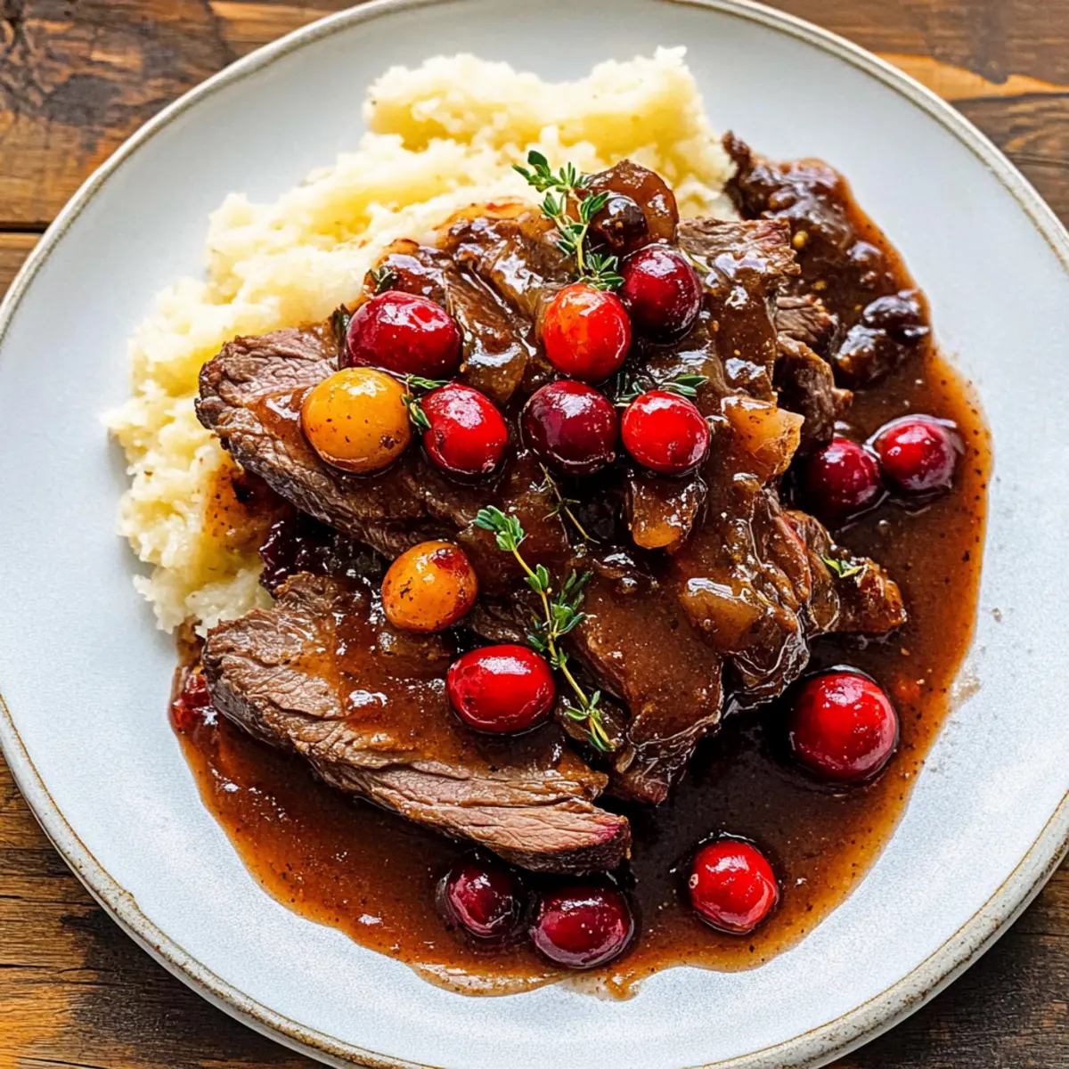 The aroma of slow-cooked beef wafts through the kitchen like a warm hug on a chilly winter evening. That’s the magic of my Cranberry Balsamic Roast Beef—a comforting dish that perfectly blends the tartness of cranberries with the richness of balsamic vinegar. This hearty pot roast not only brings satisfying flavors to your table but is also incredibly easy to prepare, whether you choose the oven, stovetop, or slow cooker method. Imagine cozy family dinners where everyone gathers around to relish the tender beef and luscious sauce, making it a surefire crowd-pleaser. Plus, this one-pan meal means less cleanup for you! Are you ready to dive into this delightful winter dining experience? Why is this roast beef unforgettable? Tender, Slow-Cooked Goodness: The magic of this dish lies in the hours spent gently cooking the beef until it’s fork-tender, allowing flavors to meld beautifully. Fruity & Tangy Burst: The combination of balsamic vinegar and cranberries brings a unique sweetness that elevates this classic roast. Easy Cooking Methods: Whether you opt for the oven, stovetop, or slow cooker, this recipe fits seamlessly into your lifestyle, making meal prep a breeze! One-Pan Wonder: With minimal extra dishes to wash, you’ll love how this hearty meal simplifies your dinner routine. Check out my other favorite one-pan meals like Ground Beef Lettuce for quick and delicious options! Crowd-Pleasing Comfort: Perfect for family gatherings or cozy dinners, this roast will have everyone asking for seconds! Every bite delivers warmth and satisfaction, turning a simple evening into a memorable feast. Cranberry Balsamic Roast Beef Ingredients For the Roast • Olive Oil – Adds moisture and richness; substitute with any neutral oil if desired. • Beef Roast (2-3 pounds, chuck/round/brisket) – The heart of this dish, ensuring it’s well-marbled for maximum tenderness. • Onion (1 large, sliced) – Enhances flavor through caramelization; shallots can be used for a milder taste. • Tomato Paste (2 tablespoons) – Provides depth and umami; can be replaced with crushed tomatoes in a pinch. • Garlic (4 cloves, chopped) – Infuses aromatic flavor; garlic powder can be a substitute if fresh isn’t available. • Thyme (1 teaspoon, chopped) – Offers an earthy note; dried thyme can be used as a substitution. • Rosemary (1 teaspoon, chopped) – Accentuates herbal notes; opt for dried rosemary if fresh isn’t handy. • Red Pepper Flakes (1/2 teaspoon, optional) – Introduces a hint of heat; swap with black pepper for a milder flavor. • Beef Broth (2 cups) – Creates a savory base; chicken or vegetable broth can lighten the flavor. For the Sauce • Balsamic Vinegar (1/4 cup) – Key to the sauce’s tangy depth; apple cider vinegar can give a unique twist. • Cranberry Sauce (1/2 cup, optional) – Adds sweetness and texture; try barbecue sauce or hoisin for a different flavor. • Soy Sauce (2 tablespoons) – Boosts savoriness; Tamari is a gluten-free alternative you can use. • Maple Syrup (4 tablespoons, or brown sugar) – Balances flavors with sweetness; honey or agave syrup can replace it. • Worcestershire Sauce (1 tablespoon, optional) – Deepens flavor complexity; soy sauce works as a substitute. • Cranberries (1 cup, fresh or frozen) – Provides a tart boost; substitute with dried cranberries while adjusting sweetness. For the Vegetables • Carrots (1 pound, peeled and sliced) – Contributes natural sweetness and texture; parsnips or potatoes can replace if desired. • Cornstarch (2 tablespoons + 2 tablespoons water, optional) – Thickens the sauce; arrowroot or flour can also be used. Dive into the warmth of this wonderful Cranberry Balsamic Roast Beef and enjoy the comforting flavors that await you! Step‑by‑Step Instructions for Cranberry Balsamic Roast Beef Step 1: Sear the Beef In a large Dutch oven, heat 2 tablespoons of olive oil over medium-high heat. Once shimmering, add a 2-3 pound beef roast and sear it until browned on all sides, approximately 3-4 minutes each side. This step is crucial for developing rich flavor, so don’t rush! Remove the beef and set it aside on a plate. Step 2: Sauté Aromatics In the same Dutch oven, add the sliced onion and sauté for about 5 minutes, stirring frequently, until softened and translucent. This process enhances the flavor base of your Cranberry Balsamic Roast Beef. You want those onions to caramelize slightly, creating a rich aroma that fills your kitchen with warmth. Step 3: Incorporate Flavors Stir in 2 tablespoons of tomato paste, 4 cloves of chopped garlic, and 1 teaspoon each of chopped thyme and rosemary. If you like a bit of heat, add 1/2 teaspoon of red pepper flakes. Cook this mixture until it becomes fragrant, about 1 minute, allowing the herbs and spices to infuse deeply into the aromatics. Step 4: Build Sauce Pour in 2 cups of beef broth and 1/4 cup of balsamic vinegar, scraping up any browned bits from the bottom of the pot for added flavor. Add 1/2 cup of cranberry sauce, 2 tablespoons of soy sauce, 4 tablespoons of maple syrup, and the prepared roast. Toss in 1 pound of sliced carrots and 1 cup of cranberries to complete the rich sauce that envelops your roast. Step 5: Braise the Roast Cover the Dutch oven and transfer it to a preheated oven at 275°F (140°C). Let your Cranberry Balsamic Roast Beef cook for 3-4 hours, or until the meat is fork-tender. If you prefer, simmer this on the stovetop over low heat, or use a slow cooker set on low for 8-10 hours for a comforting, hands-free meal that performs wonders. Step 6: Finish Sauce (Optional) Once cooked, carefully remove the beef roast and set it aside to rest for a few minutes. Skim any excess fat from the sauce, then bring the remaining juices to a simmer. If you prefer a thicker sauce, mix 2 tablespoons of cornstarch with 2 tablespoons of water, stirring into the sauce until it reaches your desired consistency. What to Serve with Balsamic C