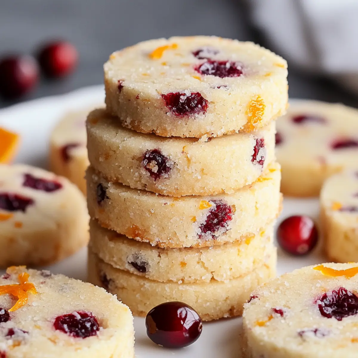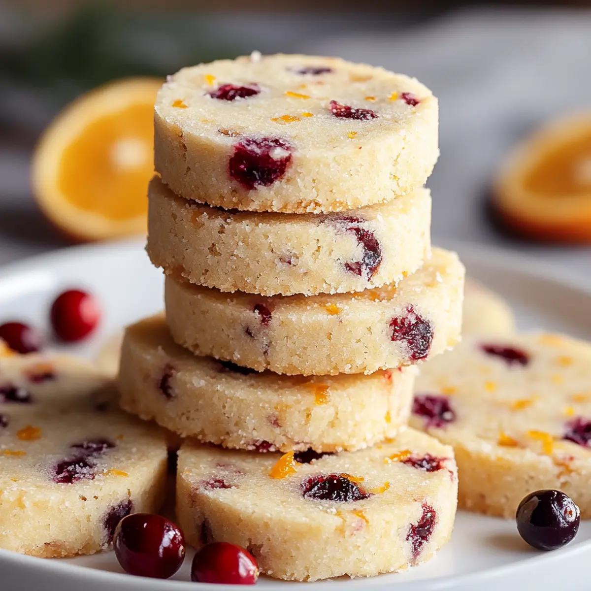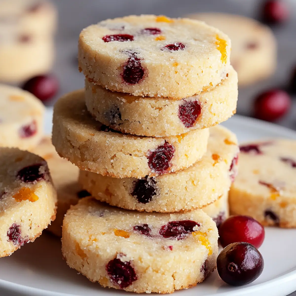 As I pulled a tray of cookies from the oven, the warm scent of orange zest and tart cranberries wafted through my kitchen, instantly transporting me to holiday gatherings of my childhood. These Cranberry Orange Shortbread Cookies capture the essence of festive baking with their buttery crumb and cheerful pop of flavor. Composed with simple ingredients, they are not only a delightful project for those cozy afternoons but also a perfect treat for gifting or serving at your seasonal gatherings. Plus, they’re vegetarian-friendly, making them inclusive for any holiday celebration. Ready to share some joy and warmth with your loved ones? Let’s dive into this simple yet enchanting recipe together! Why are Cranberry Orange Cookies a Must-Bake? Festive Cheer: The combination of tart cranberries and bright orange creates a cookie that’s bursting with holiday spirit, making them perfect for seasonal celebrations. Effortless Preparation: With just a handful of simple ingredients, you can whip up these delightful treats without fuss, perfect for both beginner bakers and seasoned chefs. Versatile Delight: Not only are they perfect for cookie platters, but they also make fantastic gifts, bringing joy to friends and family alike during the festive season. Culinary Twist: By swapping in different nuts or adding chocolate chips, you can easily customize these cookies to suit your taste, giving variety to your holiday baking repertoire. Quick & Convenient: These Cranberry Orange Shortbread Cookies can be made ahead and frozen, so you can enjoy them fresh whenever the occasion arises. Need more ideas? You might also love making Banana Oatmeal Cookies for a healthier treat or indulge in some luscious Cookies Cream Ice for dessert! Cranberry Orange Shortbread Cookies Ingredients • For the Cookie Dough Dried Cranberries – Adds tartness and chewiness, perfect for infusing flavor into the cookies; fresh cranberries can work as a substitute if finely chopped and blotted of excess moisture. Granulated Sugar – Sweetens the dough and promotes caramelization, an essential ingredient for the right flavor balance. All-Purpose Flour – Provides structure and a crumbly texture; feel free to use a gluten-free flour blend for a delectable gluten-free version. Cold Butter – A must for creating a flaky and tender cookie; using cold butter is key to achieving the desired texture. Almond Extract – Boosts the flavor profile of the cookies; if you’re out, vanilla extract makes a lovely alternative. Orange Zest – Imbues a lively citrus note; choose fresh zest for the best flavor enhancement. Fresh Orange Juice – Contributes moisture and amplifies the orange flavor; use only if the dough feels too crumbly. Your Cranberry Orange Shortbread Cookies are just a blend away! Step‑by‑Step Instructions for Cranberry Orange Shortbread Cookies Step 1: Prepare Your Baking Sheet Begin by lining a baking sheet with parchment paper. This step ensures even baking and makes cleanup a breeze. Set the lined sheet aside while you prepare the cookie dough. Having your tools ready establishes a smooth workflow for your Cranberry Orange Shortbread Cookies. Step 2: Chop the Cranberries In a food processor, pulse the dried cranberries with 1/4 cup of granulated sugar until they’re roughly chopped. This should take about 10-15 seconds. The chopped cranberries will add delightful bursts of tartness and chewiness in your cookies. Once done, set this mixture aside to infuse flavor into the dough. Step 3: Mix Dry Ingredients In a large mixing bowl, combine the all-purpose flour and the remaining granulated sugar. Use a whisk to blend them well, ensuring there are no lumps. This process is crucial as it establishes the base for the texture of your Cranberry Orange Shortbread Cookies. Step 4: Cut in the Butter Take your cold butter and cut it into cubes, then add it to the bowl with the flour and sugar mixture. Using a pastry cutter or your fingertips, mix until the mixture resembles fine crumbs, about 4-5 minutes. The cold butter is fundamental for achieving that tender, flaky texture in your cookies. Step 5: Combine Flavor Ingredients Next, fold in the almond extract, the previously sweetened chopped cranberries, and the freshly grated orange zest. If your dough feels too crumbly, gently mix in a little fresh orange juice. This mixture brings the essence of the season; each addition enhances the flavor profile and aroma of your Cranberry Orange Shortbread Cookies. Step 6: Form the Dough Shape the dough into a log, approximately 2 inches in diameter. Wrap the log tightly in plastic wrap to prevent drying out and refrigerate for at least 2 hours or overnight. Chilling the dough is essential for achieving the perfect consistency for slicing later on. Step 7: Preheat the Oven When you’re ready to bake, preheat your oven to 325°F (163°C). This allows the oven to reach the ideal temperature for baking your cookies evenly. While it heats, remove the chilled dough from the fridge and slice it into 1/4-inch rounds, ensuring each piece is uniform for even baking. Step 8: Sugar Coating and Baking Coat each cookie slice in granulated sugar before placing it on the prepared baking sheet. Bake the cookies in the preheated oven for 12-15 minutes, or until they are set but not browned. Keep an eye on them to achieve that delicate texture; a light touch indicates they are ready. Step 9: Cooling Process Once baked, allow the cookies to cool on the baking sheet for a few minutes, as they will firm up slightly. Carefully transfer them to a wire rack to cool completely. This step prevents sogginess and helps preserve the crumbly goodness of your Cranberry Orange Shortbread Cookies, making them perfect for enjoying or gifting. Storage Tips for Cranberry Orange Shortbread Cookies Room Temperature: Store cookies in an airtight container at room temperature for up to 3 days to keep them fresh and flavorful. Fridge: If you prefer a firmer texture, you 