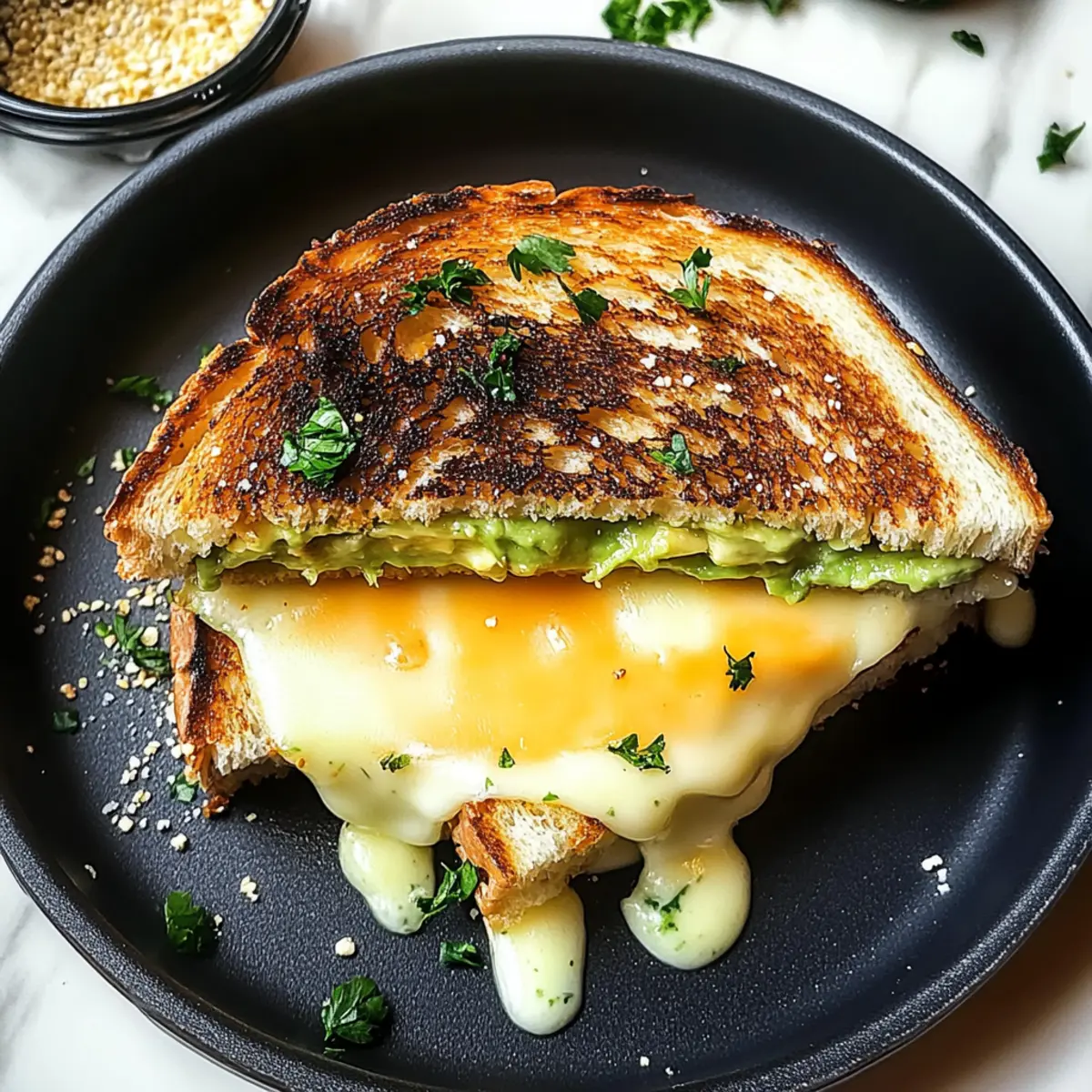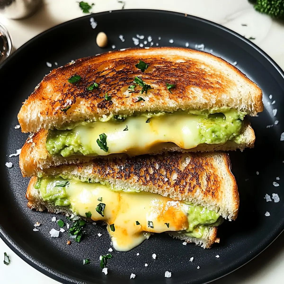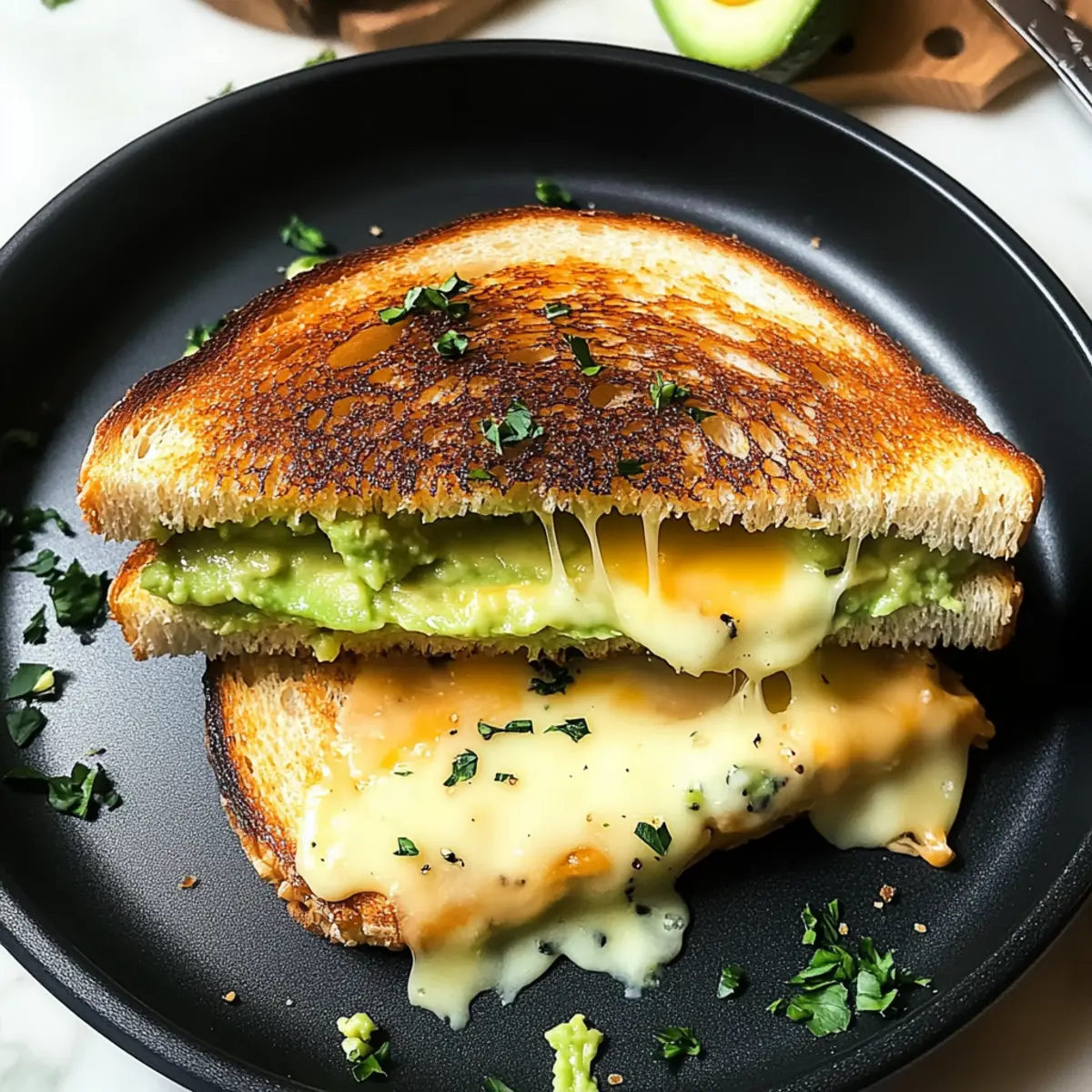 There’s something magical about the first crispy bite of a grilled cheese, isn’t there? As I stood at the stove, my stomach grumbling and a craving for comfort food overtaking me, I decided to elevate this classic with a twist: the Creamy Avocado Grilled Cheese. This delightful sandwich brings together the rich creaminess of ripe avocado and the boldness of sharp cheddar, creating an easy sandwich that is as satisfying as it is quick to prepare. Not only does it turn a simple meal into a gourmet experience, but it also offers a smooth texture that feels like a warm hug on a plate. Curious how a little avocado can transform your next grilled cheese? Let’s dive in! Why is Avocado a Game-Changer? Elevated Flavor: The rich, creamy avocado adds a whole new dimension to your classic grilled cheese, taking it from ordinary to extraordinary. Quick and Easy: With just a few simple steps, you can whip up this delicious sandwich in no time, perfect for those busy weeknights. Crowd-Pleaser: Whether it’s family or friends, everyone will love this savory twist, making it a fantastic option for gatherings. Versatile Base: Try swapping out cheddar for mozzarella or Swiss cheese to cater to different tastes, as well as various breads for unique flavor profiles. Nostalgic Comfort: This dish is reminiscent of childhood favorites while introducing a modern, healthful element that keeps the comfort food vibe alive. Adding a side of crispy sweet potato fries or a warm bowl of tomato soup can really elevate your meal experience—perfect for a cozy night in! Creamy Avocado Grilled Cheese Ingredients For the Sandwich • Bread – Choose sourdough or whole wheat for a crispy exterior and soft center; gluten-free options work well too. • Ripe Avocado – The star of the show, it adds a creamy richness that elevates the flavor—make sure it’s perfectly ripe! • Butter – Helps achieve that golden, crispy crust; unsalted butter is best for balanced flavor. • Cheddar Cheese – Offers a sharp contrast to the avocado; opt for a good melting cheddar for that gooey texture. For the Avocado Mixture • Lemon Juice – Brightens the avocado flavor and prevents browning—essential for keeping it fresh. • Garlic Powder – Provides a subtle savory note to enhance flavor without overpowering the sandwich. • Salt – Enhances all the flavors, making each bite deliciously satisfying. • Black Pepper – Adds just the right amount of warmth to balance the creamy avocado and cheesy goodness. Elevate your next meal with this creamy avocado grilled cheese that’s quick to make and endlessly customizable! Step‑by‑Step Instructions for Creamy Avocado Grilled Cheese Step 1: Gather Ingredients Begin by assembling all necessary ingredients for your creamy avocado grilled cheese. You’ll need bread, ripe avocado, butter, cheddar cheese, lemon juice, garlic powder, salt, and black pepper. Having everything ready will make the cooking process smoother and more enjoyable, so set aside a comfortable workspace and gather your favorite knife and mixing bowl. Step 2: Prepare the Avocado Halve the ripe avocado, carefully remove the pit, and scoop the soft flesh into a mixing bowl. Using a fork, mash the avocado until it’s smooth, with just a few small chunks for texture. This creamy base is essential for your grilled cheese, so take a moment to achieve your desired consistency, which should look luxuriously creamy. Step 3: Season the Avocado Mixture To enhance the flavor of your mashed avocado, stir in a splash of lemon juice, a dash of garlic powder, a pinch of salt, and a sprinkle of black pepper. These seasonings will brighten the creamy avocado and create a delightful balance of flavors. Set the mixture aside, as this will be the crowning touch on your grilled cheese sandwich. Step 4: Heat the Pan Place a non-stick frying pan or a griddle on the stove over medium heat. Allow it to warm up for about 2 minutes, ensuring it reaches a steady temperature that will toast the bread perfectly. A well-heated pan is key to achieving that beautifully golden-brown crust on your creamy avocado grilled cheese. Step 5: Butter the Bread While the pan heats, generously butter one side of each slice of bread. Use unsalted butter for optimal flavor control and spread it evenly, ensuring a rich taste and crispy exterior. Remember, the buttered side will be the one that faces the pan, creating that perfect golden crust as you cook your sandwich. Step 6: Assemble the Sandwich Place one slice of bread, buttered side down, onto the hot pan. Immediately layer on slices of cheddar cheese, ensuring the cheese covers the bread evenly. Next, butter the second slice of bread and place it on top of the cheese, aligning the buttered side up. This creates a delightful contrast of textures as the cheese melts and the bread crisps. Step 7: Cook Until Golden Cook your sandwich for about 3-4 minutes, or until the bottom slice is golden brown and crispy. Don’t rush this step; keep an eye on the color, flipping only when it meets that perfect shade. The sizzling sounds and enticing aroma indicate that the cheese is beginning to melt inside, creating that gooey goodness. Step 8: Flip and Finish Cooking Carefully flip the sandwich using a spatula, ensuring that it remains intact. Allow the other side to cook for another 3-4 minutes until it is also golden brown and the cheese has fully melted. If needed, press gently with the spatula for an even crispier finish while simmering on low heat, enhancing those delicious layers of flavors. Step 9: Add the Avocado Once both sides are perfectly toasted and the cheese is gooey, remove the sandwich from the pan and let it cool for a minute. Carefully spread your seasoned mashed avocado over one half of the sandwich for a burst of creamy richness. This step truly transforms your creamy avocado grilled cheese into something extraordinary. Step 10: Complete and Serve Top the avocado half with the other plated