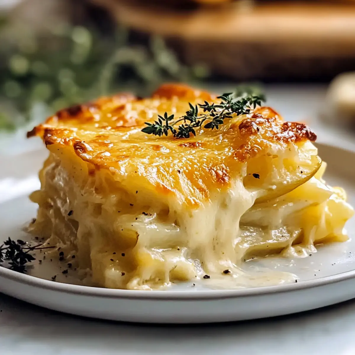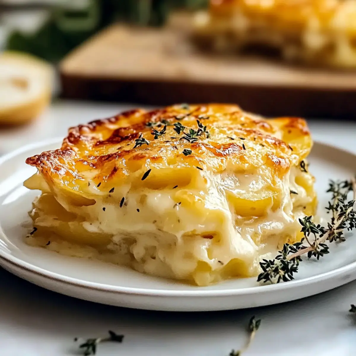 As I stood in my kitchen, the comforting aroma of melting cheese wafted through the air, I knew I had stumbled upon something truly special. Creamy Cheesy Scalloped Potatoes have a way of bringing everyone together, transforming a simple meal into a cozy gathering. This family-friendly side dish features layers of tender, thinly sliced potatoes bathed in a rich and velvety cheddar cheese sauce. Not only does it scream comfort food, but it also requires just a few ingredients and minimal prep time—making it a perfect addition to any weeknight dinner or festive feast. Trust me, once you serve this crowd-pleaser, your loved ones will be asking for seconds. So, are you ready to dive into the world of creamy goodness and elevate your cooking game? Why Are Scalloped Potatoes So Irresistible? Comforting, Cozy Vibes: There’s something about creamy, cheesy flavors that wraps you in warmth and nostalgia, perfect for family meals or gatherings. Easy to Prepare: This dish requires minimal effort for maximum satisfaction—easy for beginners and impressive for seasoned cooks alike! Endless Variations: Whether you’re adding sautéed garlic or swapping in Gruyère cheese, you can customize it to suit every palate. Perfect Pairing: These scalloped potatoes complement a range of mains, from roasted chicken to grilled steak. Lasting Memories: Serving this dish turns an ordinary dinner into a memorable occasion that everyone will cherish. Don’t forget to check out other comforting sides like Garlic Mashed Potatoes for your next feast! Creamy Cheesy Scalloped Potatoes Ingredients For the Potatoes • Potatoes – Use starchy varieties like Russets or Yukon Golds for the ultimate creaminess. • Onion – Yellow or white onions add a subtle depth of flavor to your layers. For the Cheese Sauce • Salt – A crucial ingredient to enhance the flavors in the potatoes and cheese sauce. • Black Pepper – Adjust to your taste for a gentle warmth. • Butter – Unsalted works best as a fat base for the roux, giving you better control over seasoning. • Flour – All-purpose flour is ideal for creating a roux that thickens the cheese sauce beautifully. • Garlic Powder – Adds an extra layer of flavor to the creamy sauce. • Milk – Room temperature milk is key to preventing curdling when making the sauce. • Cheddar Cheese – Freshly shredded is best, ensuring a smooth texture and rich flavor in the sauce. Feel the comfort of home cooking and let each ingredient of these Creamy Cheesy Scalloped Potatoes come together to create a dish your family will adore! Step‑by‑Step Instructions for Creamy Cheesy Scalloped Potatoes Step 1: Prep the Ingredients Begin by peeling and thinly slicing your potatoes into 1/8-inch rounds, ensuring they are uniform for even cooking. Next, thinly slice the onion. Preheat your oven to 400°F (200°C) and grease a 9×13 inch baking dish with butter or cooking spray, preparing a cozy home for the creamy cheesy scalloped potatoes. Step 2: Layer the Potatoes and Onions Arrange a layer of potato slices in the greased baking dish, slightly overlapping them to create an appealing pattern. Sprinkle a pinch of salt and some black pepper over this first layer. Continue layering with sliced onions, more potatoes, and seasoning until all ingredients are used, creating a beautiful, hearty foundation for your scalloped potatoes. Step 3: Make the Cheese Sauce In a medium saucepan over medium heat, melt 4 tablespoons of unsalted butter. Once melted, whisk in 4 tablespoons of all-purpose flour and a pinch of salt to form a roux; cook for about 1 minute until slightly bubbly. Gradually pour in 3 cups of room-temperature milk, whisking continuously for 5-7 minutes until the mixture thickens into a smooth sauce. Step 4: Add the Cheddar Cheese Remove the saucepan from heat and stir in 2 cups of freshly shredded cheddar cheese until it fully melts and combines with the sauce, creating a rich and velvety texture. The comforting aroma of the cheese will fill your kitchen, enhancing the anticipation for those creamy cheesy scalloped potatoes. Step 5: Combine the Layers and Sauce Pour the cheese sauce evenly over the layered potatoes and onions, ensuring every slice is well-coated in creamy goodness. To keep everything moist during baking, cover the dish tightly with aluminum foil, locking in warmth and flavor as it cooks perfectly. Step 6: Bake to Perfection Place the covered baking dish in the preheated oven and bake at 400°F (200°C) for 85-90 minutes. Keep an eye on the edges of the dish where the sauce begins to bubble, indicating the potatoes are becoming tender and flavorful. This time allows the potatoes to soak up all the luscious cheese sauce. Step 7: Broil for a Crispy Finish Once the baking time is complete, carefully remove the foil. Switch your oven to broil and return the dish to the oven for 2-4 minutes. Watch closely as the top transforms into a glorious golden brown crust, adding that final touch of crispiness for your creamy cheesy scalloped potatoes. Step 8: Rest and Serve After broiling, allow the creamy cheesy scalloped potatoes to rest for about 5 minutes before serving. This resting period helps the sauce settle and enhances every delicious bite, making your comforting side dish ready to impress your family and friends at the dinner table. Storage Tips for Creamy Cheesy Scalloped Potatoes Room Temperature: Allow any leftovers to cool completely before placing them in the fridge. Avoid leaving out for more than 2 hours to ensure food safety. Fridge: Store leftovers in an airtight container for up to 4 days. Make sure the dish is completely cooled before sealing to prevent condensation. Freezer: For longer storage, freeze slightly undercooked scalloped potatoes in an airtight container for up to 2 months. This helps retain flavor and texture. Reheating: Reheat in the oven at 350°F (175°C) until warmed through, roughly 20-30 minutes. This will help maintain the creami