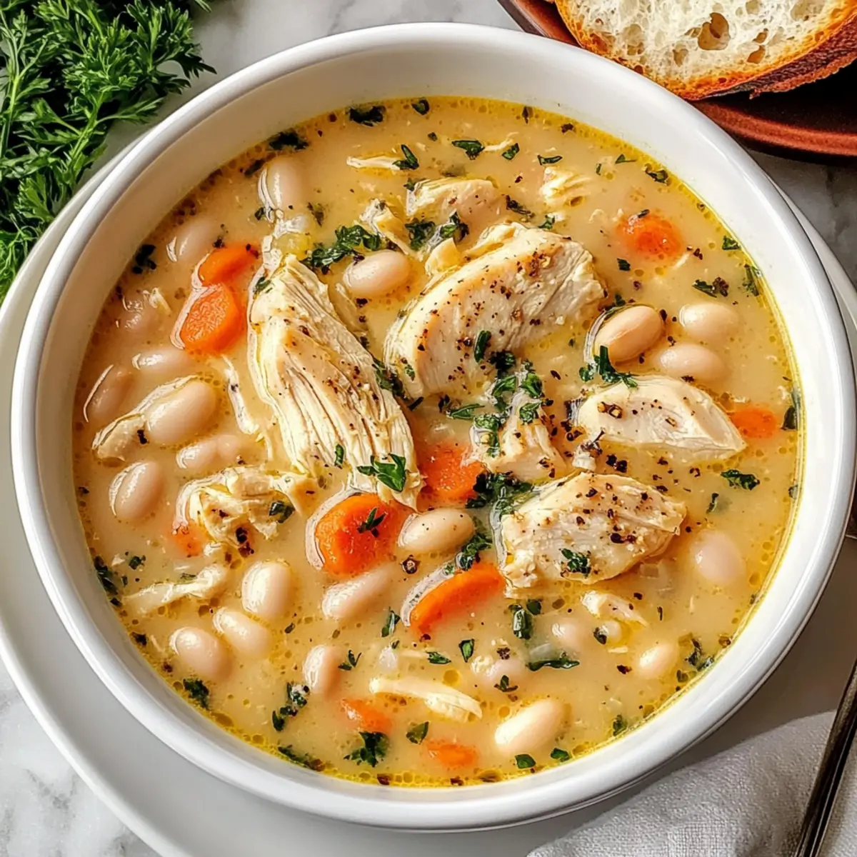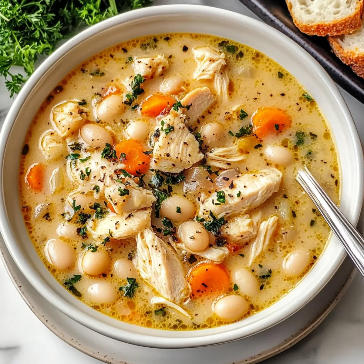 As I ladled up the last of my Creamy Chicken White Bean Soup, the inviting aroma filled the kitchen, wrapping me in a warm hug. This delicious, hearty soup is everything you could want on a chilly evening—comforting yet nourishing, with tender chicken, creamy white beans, and sweet carrots mingling in a savory broth. The best part? It’s an utterly easy dinner solution that makes meal prep a breeze, ensuring you can enjoy a homemade masterpiece without any fuss. Plus, for those seeking dairy-free options, I’ve got you covered. Why take another chance on fast food when you can create this wholesome dish right at home? Let’s dive into this recipe that promises to keep your family coming back for more. Are you ready to simmer up some soul-soothing goodness? Why is This Soup a Must-Try? Comforting Flavors: This Creamy Chicken White Bean Soup wraps you in a cozy embrace with its delightful combination of tender chicken and smooth, creamy beans. Quick and Simple: With just a handful of easy-to-find ingredients, you can whip up this delicious soup in no time, perfect for busy weeknights! Versatile Ingredients: Feel free to customize it! Substitute in chickpeas or add leafy greens like spinach or kale for an extra nutritional boost. Crowd-Pleasing Appeal: Whether it’s a family dinner or a gathering with friends, this soup stays a favorite, leaving everyone asking for seconds! Pair it with some crusty bread or a fresh salad for a complete meal. Nourishing Goodness: Packed with protein and fiber, it’s a hearty, healthy option that makes you feel good with every bite—definitely worth ditching fast food for! Creamy Chicken White Bean Soup Ingredients For the Base • Olive oil or butter – Adds richness and helps sauté vegetables; vegetable oil can be a lighter alternative. • Yellow onion – Provides a sweet and flavorful base; shallots or leeks work well as substitutes. • Garlic cloves – Enhances the soup’s flavor profile; fresh garlic is best, but garlic powder can do in a pinch. For the Vegetables • Carrots – Adds natural sweetness and texture; try using parsnips for a different flavor. For the Seasoning • Italian seasoning – Brings in a delightful mix of herbs; fresh or dried herbs can be used depending on your preference. • Salt – Enhances the flavors; adjust to your taste based on the saltiness of your broth. • Black pepper – Provides a gentle heat; white pepper can be substituted for a milder taste. For the Soup • Chicken broth – Forms the flavorful base; swap for vegetable broth for a vegetarian creamy chicken white bean soup. • White beans (Great Northern or cannellini) – Offers protein and a creamy texture; chickpeas can be used for a different bite. • Cooked chicken – Adds depth and substance; rotisserie chicken is a great time-saver, or shredded turkey works too. • Heavy cream – Brings richness and creaminess; replace with full-fat coconut milk for a dairy-free option. • Parmesan cheese – Provides a savory finish; nutritional yeast can be a great vegan substitute. Step‑by‑Step Instructions for Creamy Chicken White Bean Soup Step 1: Sauté the Base Flavors In a large pot, heat 2 tablespoons of olive oil or butter over medium heat until shimmering. Add one chopped yellow onion, sautéing until translucent, about 5 minutes. The onions should be soft and fragrant, forming a tasty foundation for your Creamy Chicken White Bean Soup. Step 2: Add Garlic and Seasonings Stir in 3 minced garlic cloves and cook for another 1-2 minutes, just until fragrant. The garlic should be lightly golden but not browned. Next, sprinkle in 1 tablespoon of Italian seasoning along with salt and black pepper to taste, mixing everything well to coat the onions and garlic. Step 3: Introduce the Vegetables Add 2 sliced carrots to the pot and sauté for about 5 minutes, stirring occasionally. The carrots will soften slightly and take on the beautiful flavors of the sautéed base. This step enhances the depth of flavor of your Creamy Chicken White Bean Soup and adds a lovely sweetness. Step 4: Pour in the Broth Carefully pour in 4 cups of chicken broth and bring the mixture to a gentle simmer over medium-high heat. Look for small bubbles rising around the edges, which indicates it’s ready. Once simmering, add 2 cans of drained white beans, allowing them to warm through and blend their creamy texture with the broth for 10-15 minutes until the carrots are tender. Step 5: Combine Chicken and Cream Stir in 2 cups of shredded cooked chicken and 1 cup of heavy cream, letting the soup simmer for an additional 5-10 minutes. This step melds the chicken’s protein-rich goodness into the Creamy Chicken White Bean Soup while the cream adds a luscious richness that brings the soup together beautifully. Step 6: Final Touches As you finish cooking, stir in ½ cup of grated Parmesan cheese and adjust the seasoning with more salt and pepper as needed. Allow the cheese to melt completely, creating a smooth, creamy consistency in your soup. Everything should be beautifully combined and ready to serve. Step 7: Serve and Enjoy Ladle the warm Creamy Chicken White Bean Soup into bowls and serve immediately with crusty bread or a fresh salad. The inviting aroma and rich texture will surely make this dish a cozy favorite for you and your loved ones, perfect for chilly nights. Expert Tips for Creamy Chicken White Bean Soup Use Fresh Ingredients: Start with fresh garlic and onion for the best flavor. Don’t be tempted to use old herbs or powders; they can dull the soup’s vibrant taste. Perfect Creaminess: For a balanced texture, avoid adding the heavy cream too early. Stir it in during the last few minutes to prevent it from curdling. Season Gradually: When making your Creamy Chicken White Bean Soup, taste as you go! Add seasoning gradually to avoid over-salting, especially with broth that may already contain salt. Customizable Flavor: Feel free to throw in extra veggies—spina