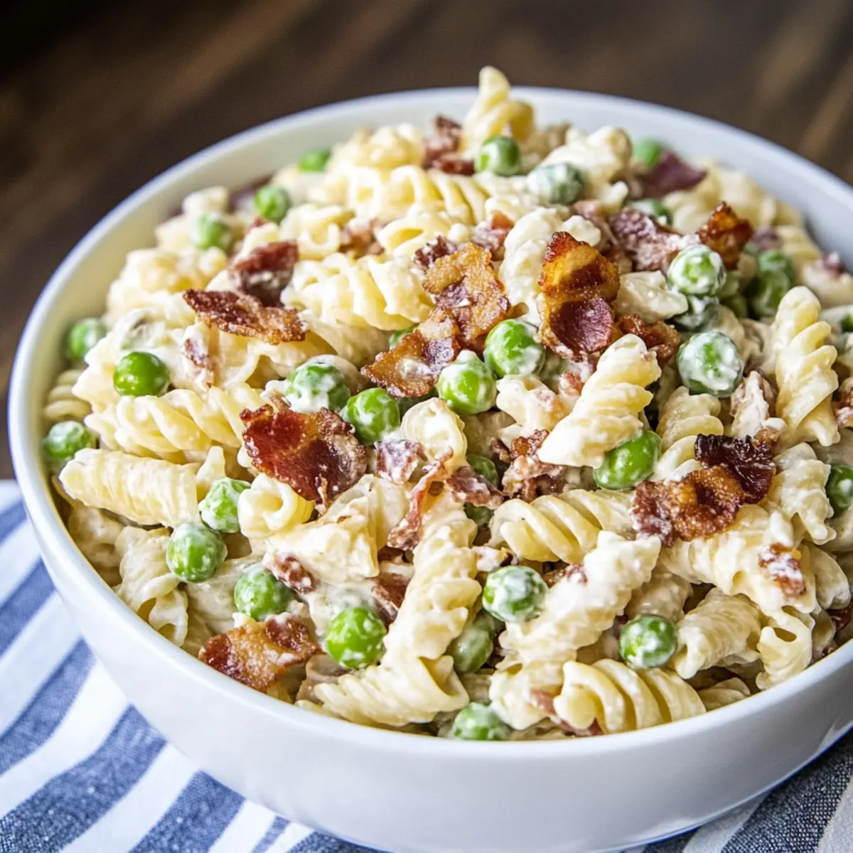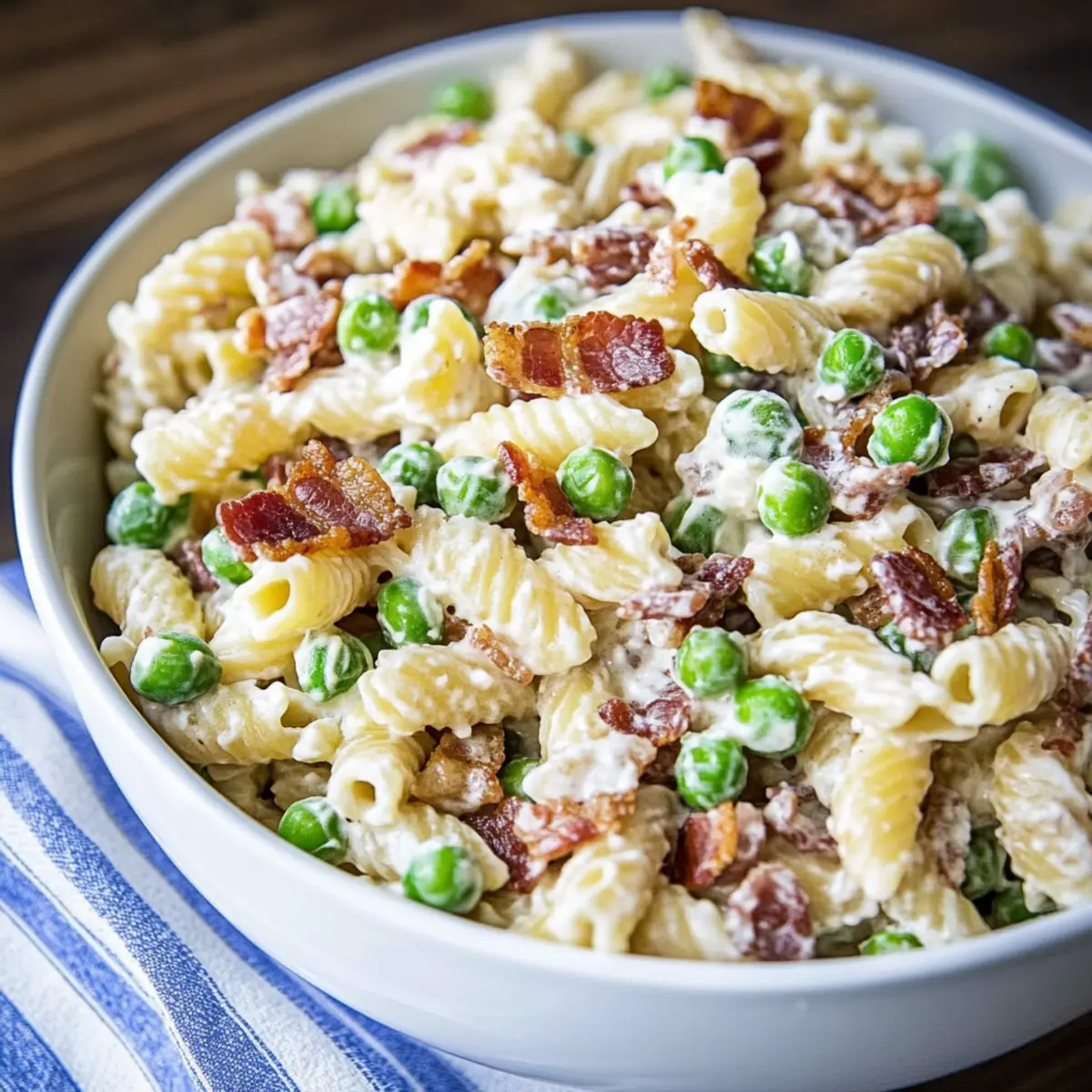 A creamy pasta salad that combines fresh peas and crispy bacon for a delightful crowd-pleaser at any potluck. Perfectly customizable and quick to prepare.