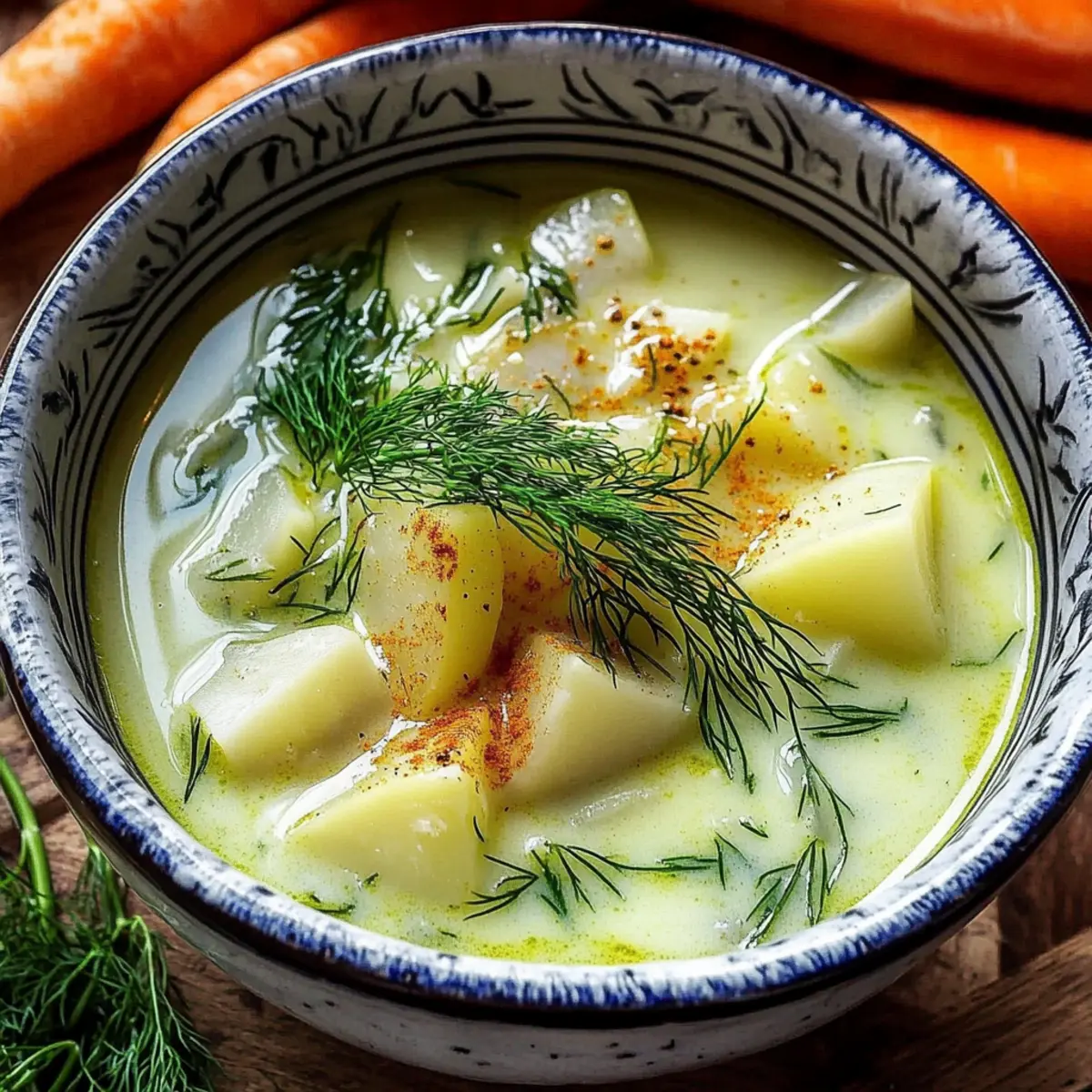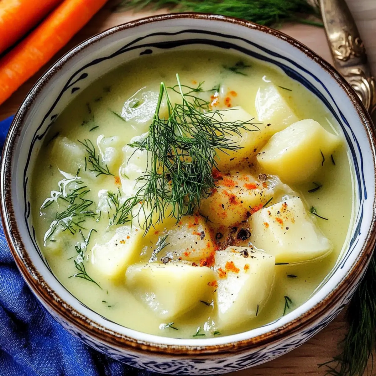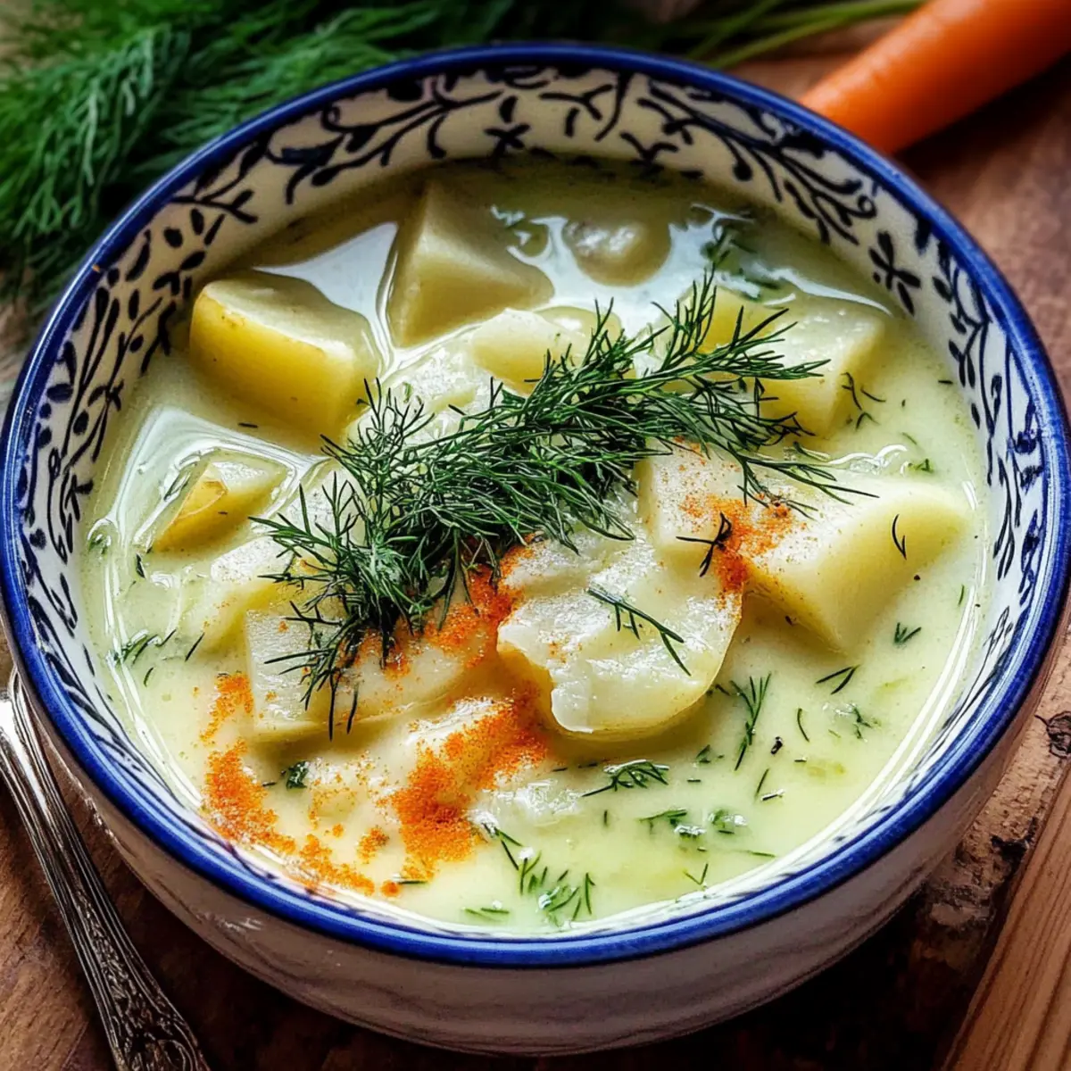 The aroma of simmering potatoes mingled with fresh dill brings back memories of cozy family gatherings and the laughter that filled the air. This Creamy Potato & Dill Soup, or Zupa Koperkowa, embodies the heart of Polish cuisine—a hearty yet simple dish that warms both the body and soul. Not only is this comforting soup a breeze to prepare, but it’s also a crowd-pleaser that caters to all tastes, making it ideal for a filling lunch or a light dinner. With options for a vegetarian twist using vegetable stock, this gluten-free delight can easily fit a variety of dietary needs. Whether you’re looking to impress guests or simply craving a taste of home, are you ready to dive into a bowl of pure comfort? Why Is This Soup So Special? Creamy texture: The blend of perfectly cooked potatoes and rich cream creates a soup that’s velvety and smooth, ensuring each spoonful is a delight. Fresh dill flavor: This key herb infuses the soup with a bright, grassy essence that perfectly balances its richness. Versatility: Enjoy it as a hearty lunch or a light dinner; it pairs beautifully with crusty bread or a light salad. Quick to prepare: Ready in just under 30 minutes, this soup is perfect for busy weeknights when you crave comfort without delay. Diet-friendly: Easily adaptable, this recipe can be made vegetarian by using vegetable stock, making it suitable for various dietary preferences. Whether you’re a fan of Chicken Noodle Soup or craving something different like Broccoli Cheddar Soup, this Creamy Potato & Dill Soup stands out as a cozy favorite. Creamy Potato & Dill Soup Ingredients • From the heart of Polish cuisine, this soup embodies comfort in each ingredient. For the Soup Base Fresh Dill – essential for that vibrant, grassy flavor; aim for around 3.5 ounces (100 g). Potatoes – the key to creaminess, with starchy varieties recommended for the best texture. Stock (Meat or Vegetable) – enriches the broth; homemade is ideal, but store-bought works too. Cream – adds a silky finish; use heavy cream or half-and-half for varying richness. Cooking Oil or Butter – perfect for sautéing base ingredients, enhancing the soup’s flavor. Optional Additions Onions – when sautéed, they create a sweet, aromatic base for the soup. Carrots or Leeks – boost flavor and nutrition; feel free to customize your Creamy Potato & Dill Soup! Step‑by‑Step Instructions for Creamy Potato & Dill Soup Step 1: Prepare Potatoes and Dill Begin by peeling and dicing about 2 pounds of starchy potatoes into small cubes, ensuring even cooking. As you prep the potatoes, rinse and chop roughly 3.5 ounces of fresh dill, setting aside a bit for garnishing. This step sets the foundation for your Creamy Potato & Dill Soup, filling your kitchen with delightful aromas. Step 2: Sauté Base In a large, heavy-bottomed pot, heat 2 tablespoons of cooking oil or butter over medium heat. If you’re using onions, add one finely chopped onion and sauté for about 3-4 minutes until they become translucent and fragrant. This will create a delicious flavor base for your soup, making the final taste even richer. Step 3: Cook Potatoes Now, introduce the chopped potatoes to the pot, stirring them gently to coat in the aromatic mixture. Pour in about 6 cups of meat or vegetable stock, bringing the contents to a rolling boil over high heat. Once boiling, reduce the heat to low and let simmer uncovered for about 20-25 minutes, or until the potatoes are fork-tender. Step 4: Blend Using an immersion blender, blend the soup directly in the pot until it reaches a creamy consistency. If you prefer a chunkier texture, you can blend just half of the soup or use a regular stand blender in batches. Make sure everything is well combined for a smooth finish to your Creamy Potato & Dill Soup. Step 5: Add Dill and Cream Stir in the chopped fresh dill and approximately 1 cup of heavy cream. Allow the soup to heat through on low for another 5 minutes, stirring occasionally. This step not only adds a lovely creaminess but also infuses the soup with that fresh dill flavor—key to making this soup special. Step 6: Serve Hot Ladle the warm soup into bowls, garnishing each serving with a sprinkle of the reserved dill for that extra pop of color and flavor. Best enjoyed immediately, this Creamy Potato & Dill Soup pairs beautifully with crusty bread or a light salad, making it a cozy meal to savor. How to Store and Freeze Creamy Potato & Dill Soup Fridge: Store in an airtight container for up to 3 days. Reheat gently on the stove or in the microwave, avoiding boiling to preserve the creamy texture. Freezer: For longer storage, cool the soup completely and transfer to freezer-safe containers, leaving some space for expansion. It can be stored for up to 3 months. Thawing: To thaw frozen soup, place it in the refrigerator overnight or use the defrost setting on your microwave, then reheat thoroughly before serving. Reheating: Reheat on low heat in a pot, stirring occasionally to keep the creamy consistency smooth. Add a splash of cream or stock if the soup thickens too much during storage. Creamy Potato & Dill Soup Variations Customize your Creamy Potato & Dill Soup to fit your taste buds and dietary needs with these delightful suggestions. Vegetarian Option: Swap out meat stock for vegetable stock to make this soup entirely plant-based. The flavors will still shine! Add More Veggies: Incorporate diced carrots or leeks for additional layers of flavor and nutrition. They’ll bring extra sweetness and texture. Herb Twist: If fresh dill isn’t available, try using parsley or thyme instead. Each herb offers its unique fragrance, making your soup special in a new way. Spice it Up: For a little kick, sprinkle in some red pepper flakes or fresh cracked black pepper. The heat will elevate the flavor profile beautifully. Creamy Alternatives: Use coconut milk instead of heavy cream for a dairy-free and subtly sweet twist. It’ll still keep that richness you 